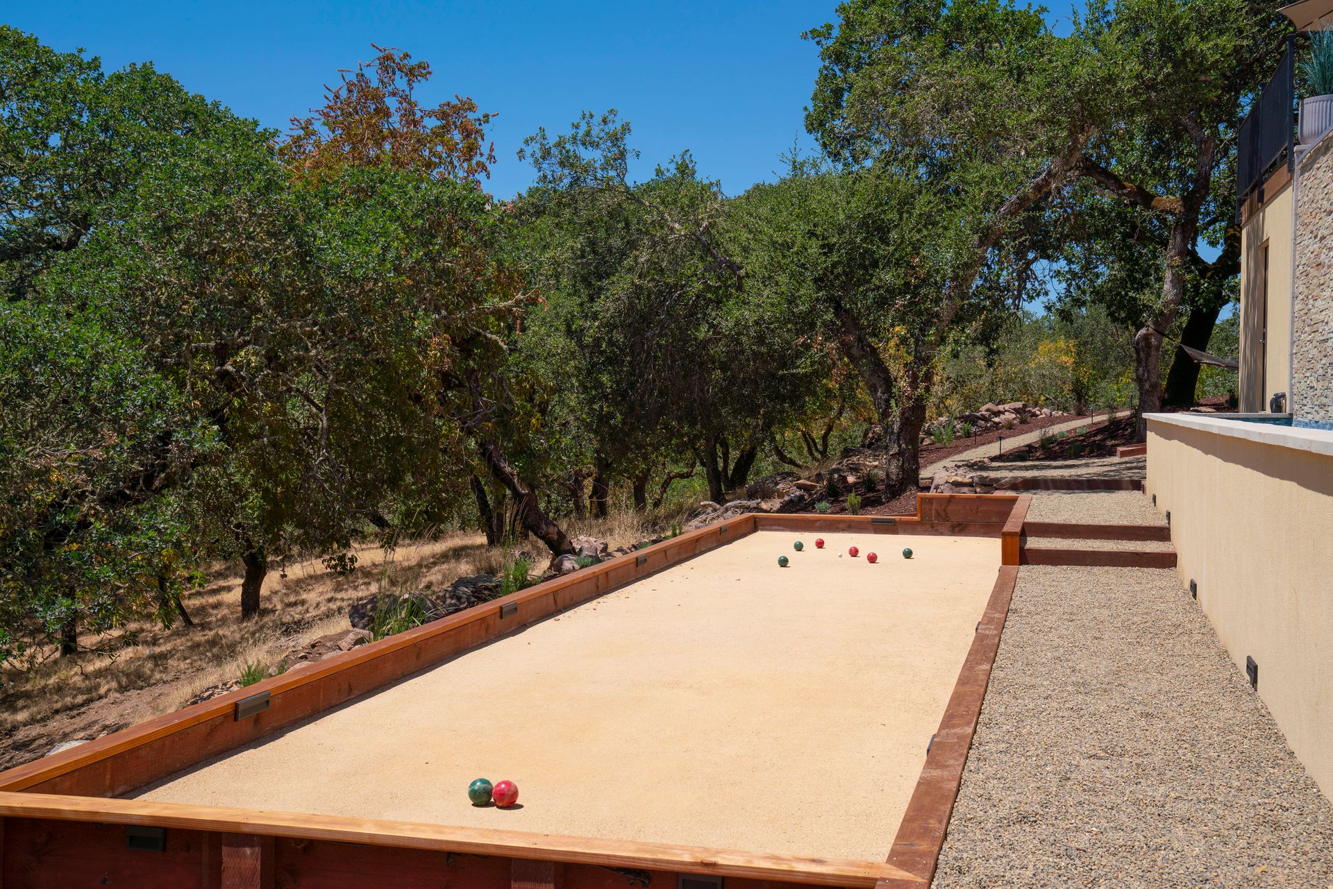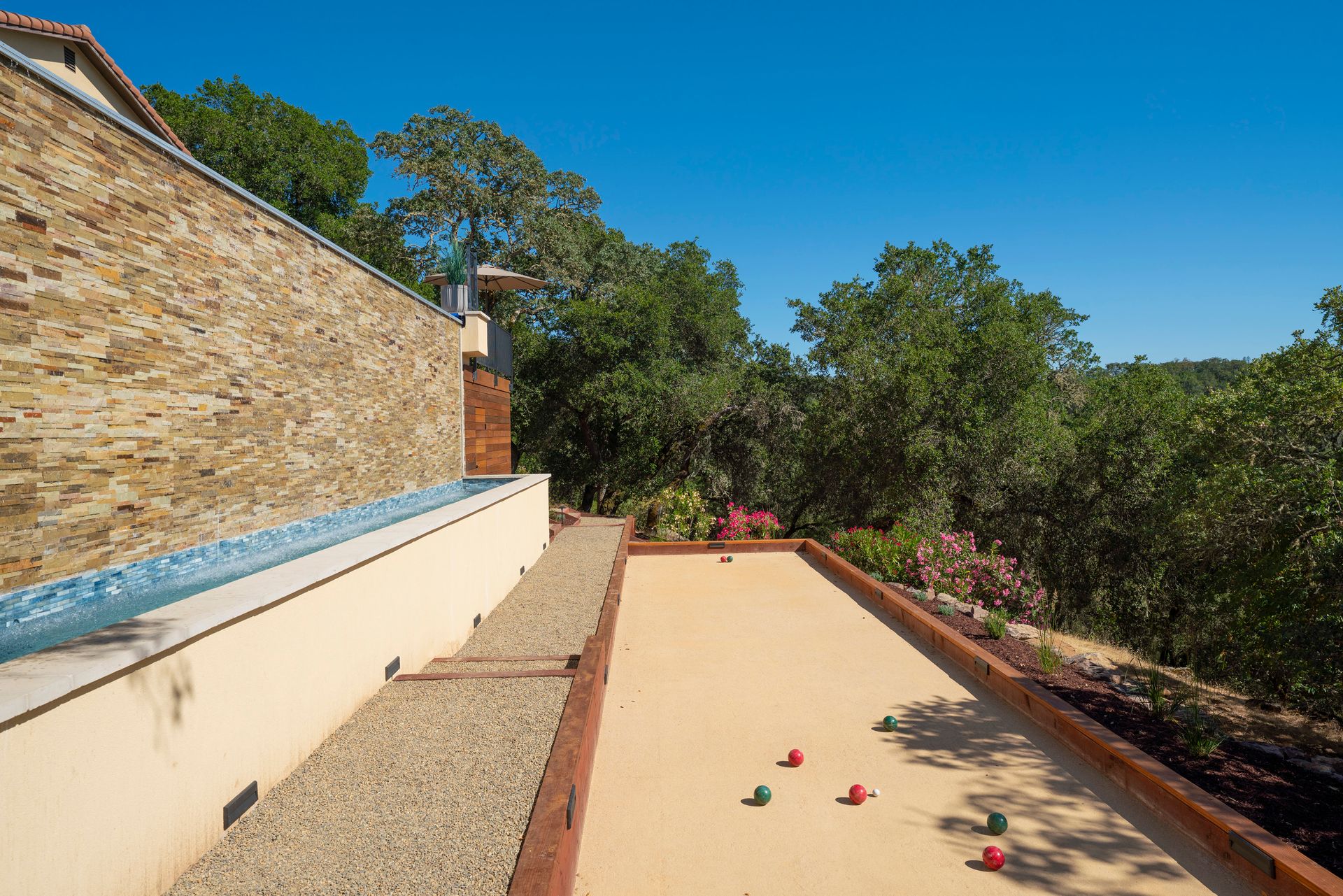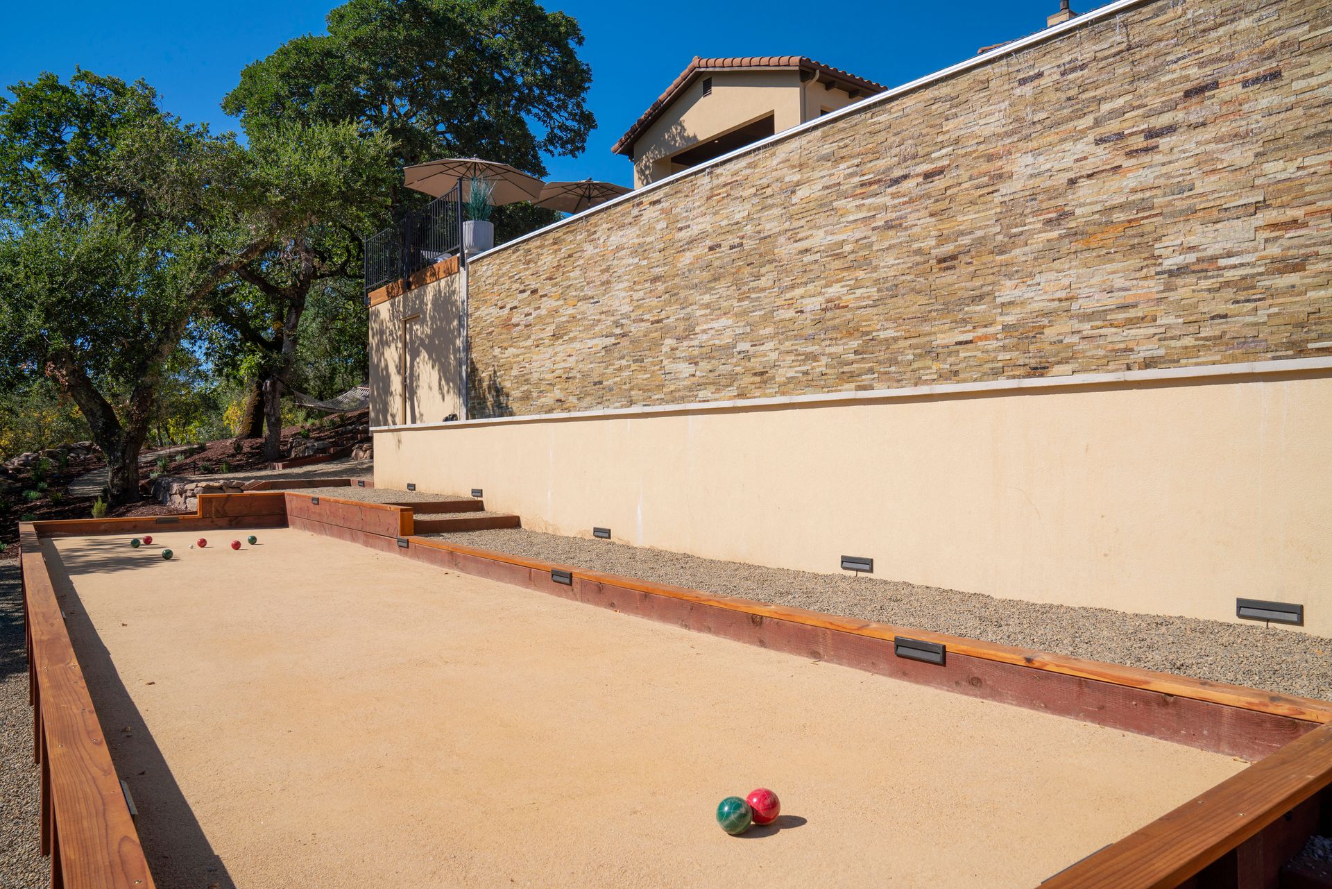 Outdoor entertaining includes a newly completed infinity edge pool and spa with a waterfall, bocce court, fire pit, iron wood deck and an outdoor kitchen including Alfresco grill and burners, Liebherr refrigerator, sink and ceiling fan over the dining table