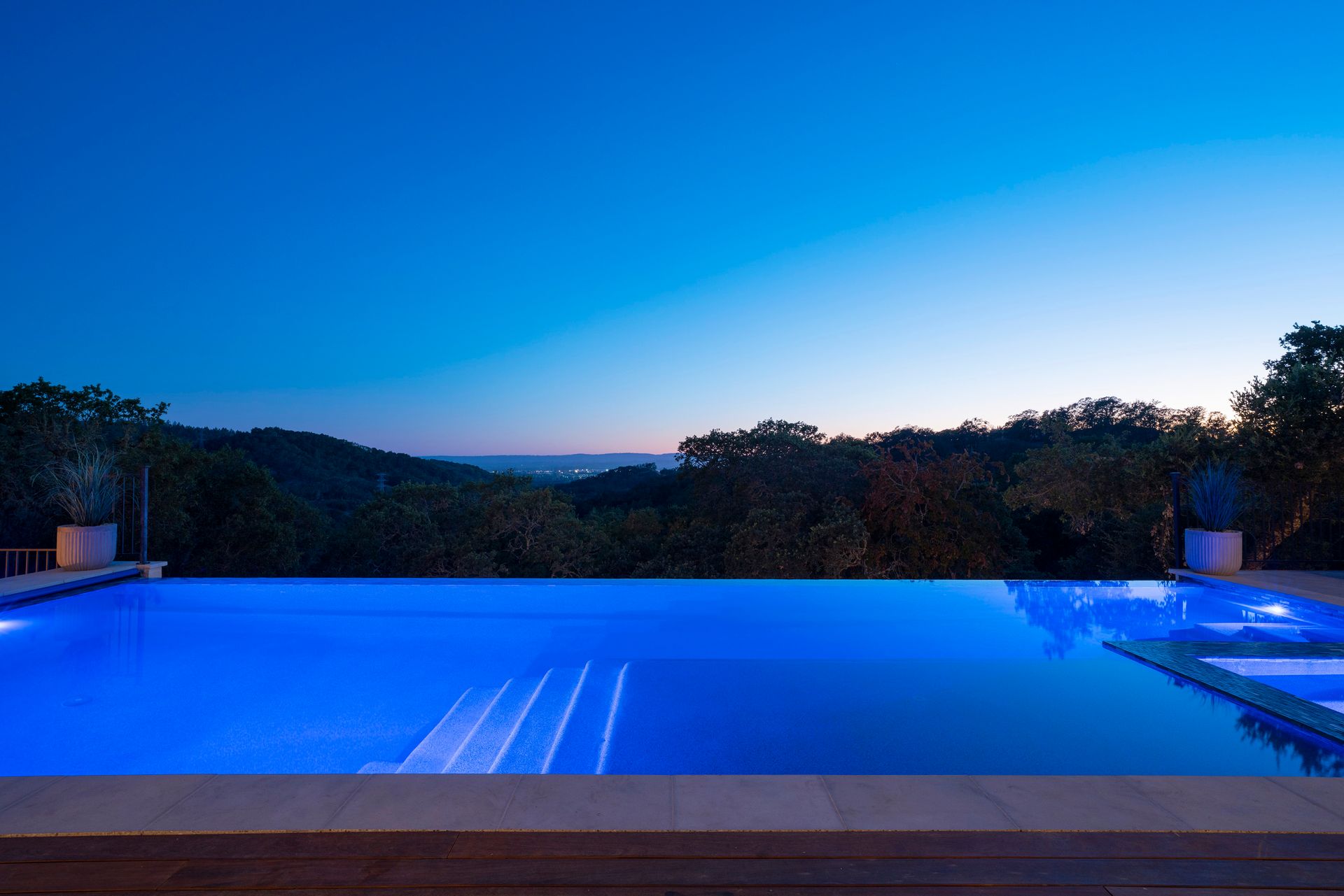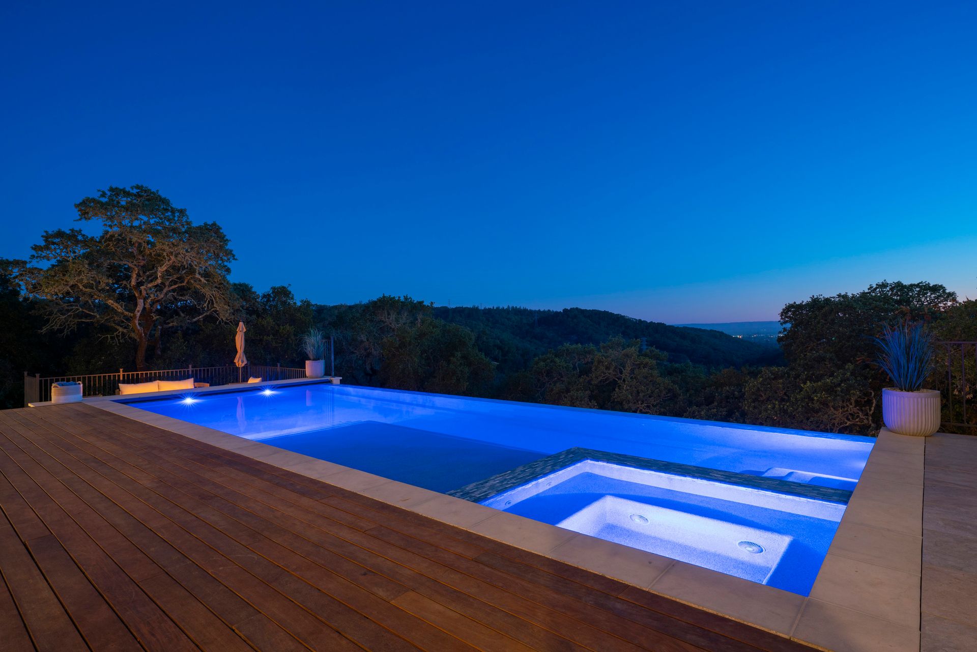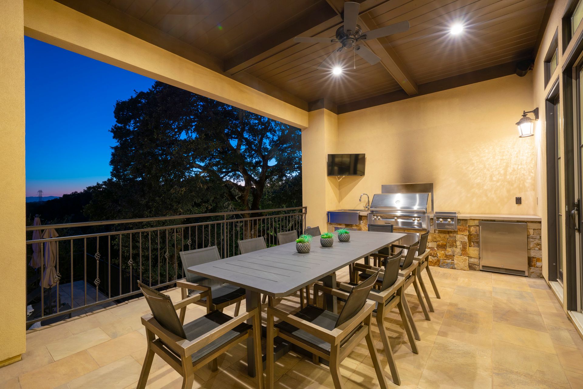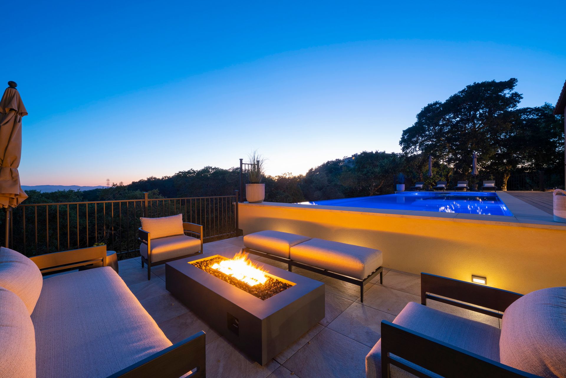 Outdoor entertaining includes a newly completed infinity edge pool and spa with a waterfall, bocce court, fire pit, iron wood deck and an outdoor kitchen including Alfresco grill and burners, Liebherr refrigerator, sink and ceiling fan over the dining table