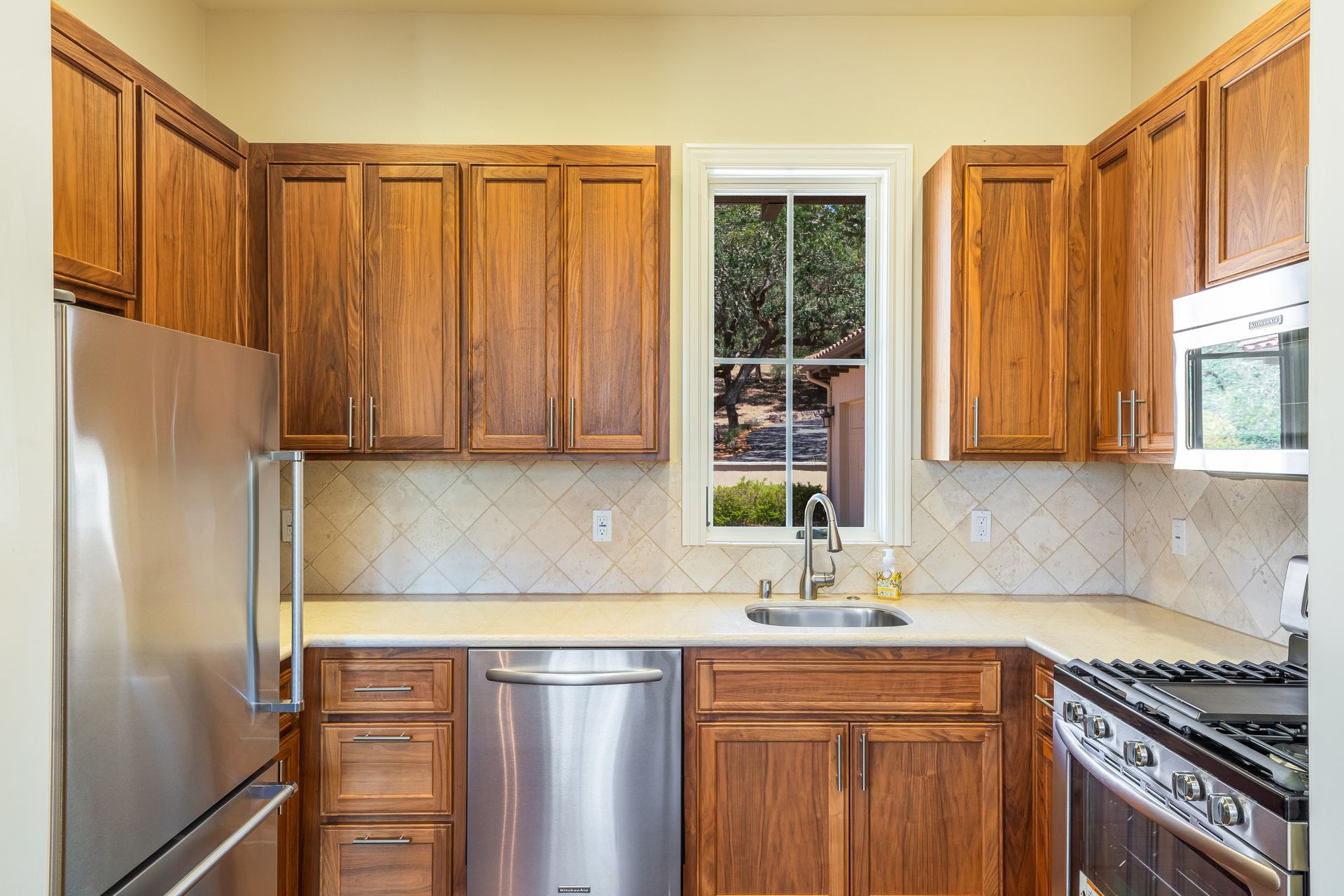 Guest house of 640 sq.ft. includes a living/dining room, wood floors, slider to deck, kitchen with gas range, hood with microwave oven, refrigerator and dishwasher, bedroom with carpet, full bath
