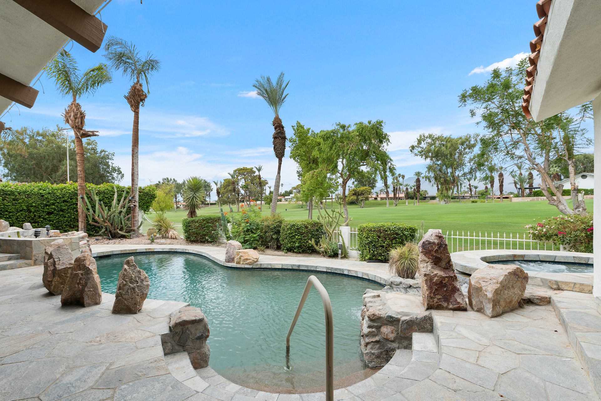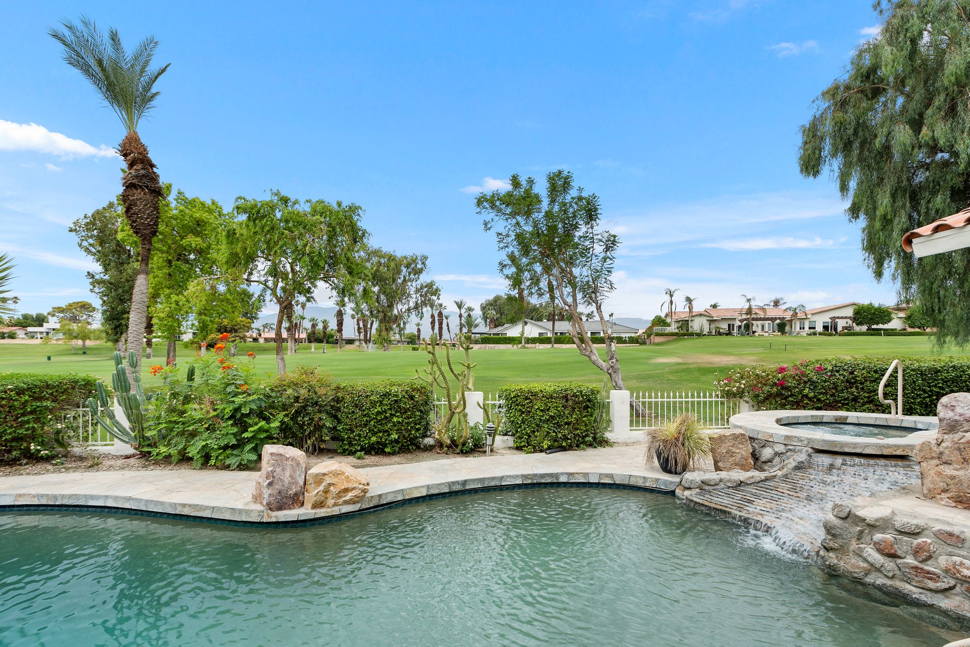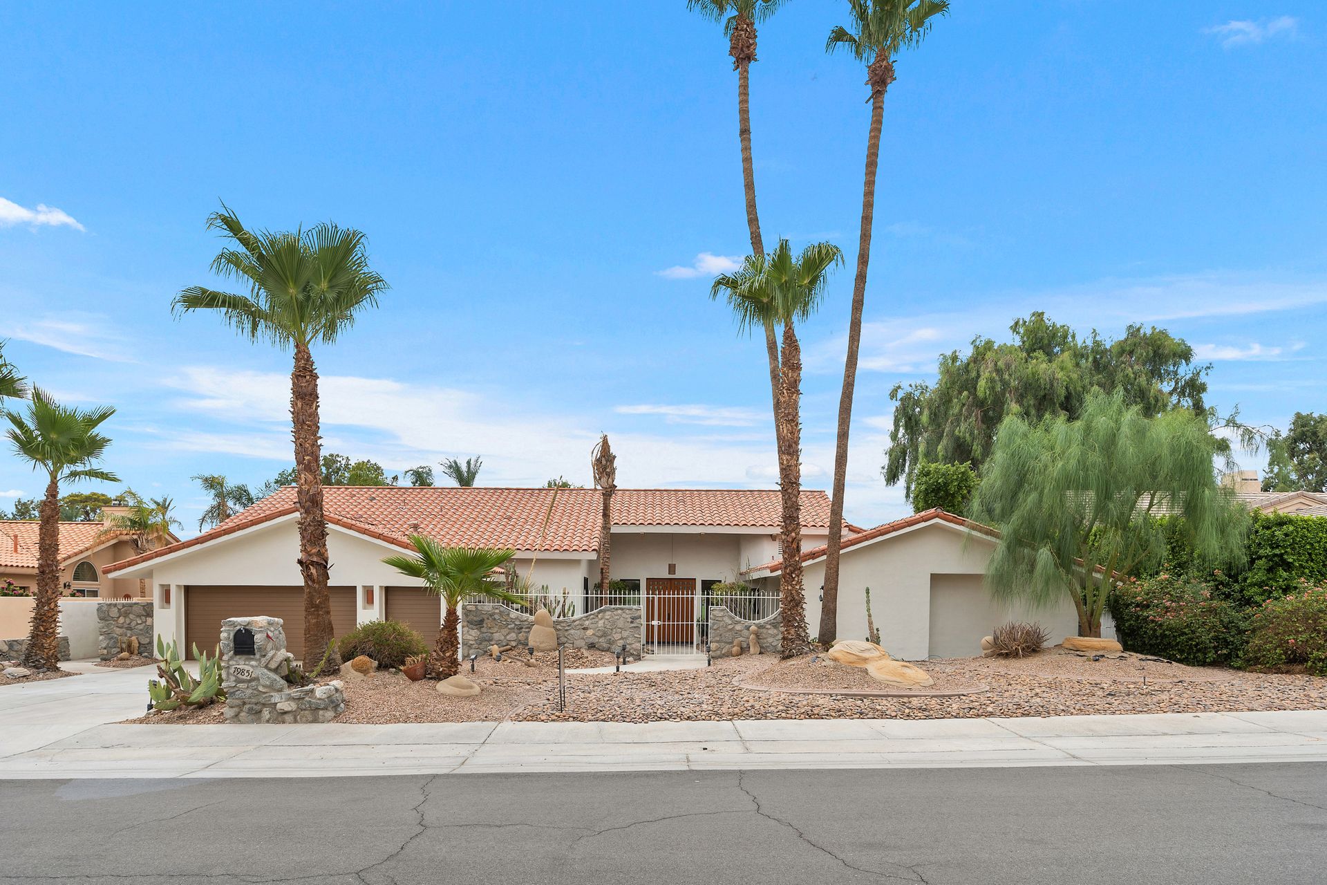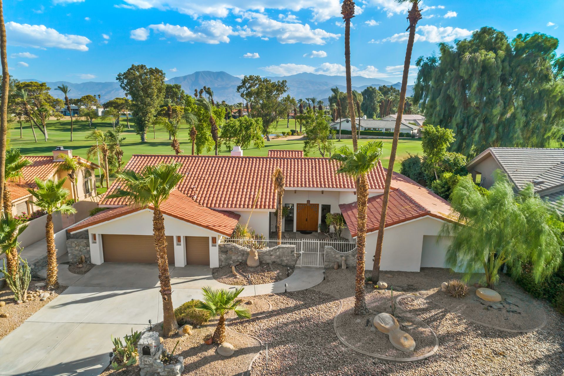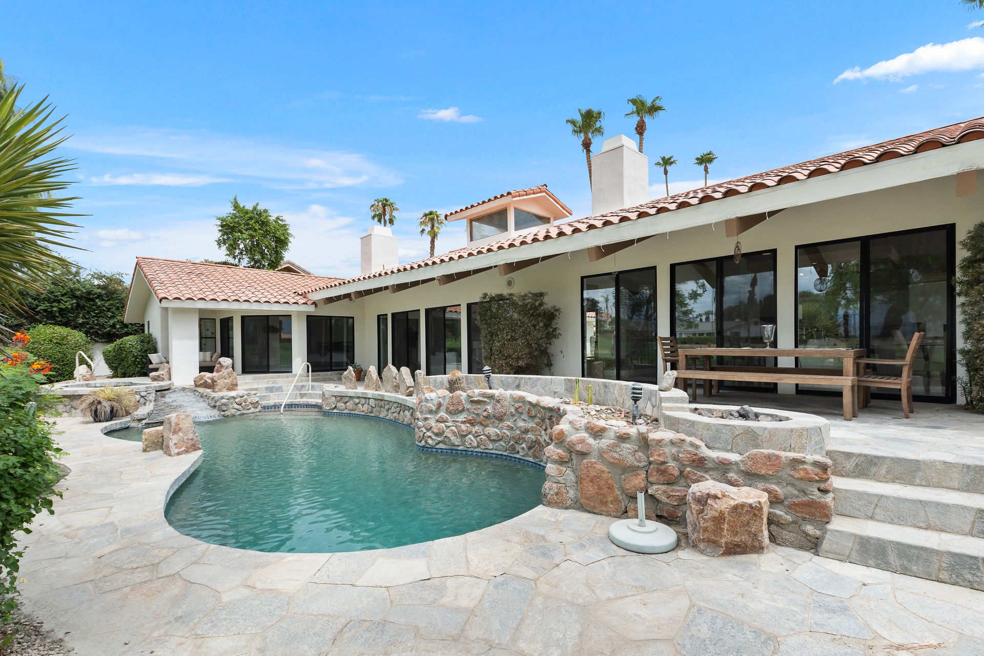 Your dream home awaits you in Bermuda Dunes Country Club. This contemporary approximately 3,588 square foot home is located on the #5 fairway of the classic one course at the club that hosted the Bob Hope Chrysler Classic for 50 years! You will love the South Facing backyard with a double fairway, Lake and Santa Rosa Mountain views. Walk through the courtyard and enjoy the serene waterfall pond. Continue through the double door entry and be amazed by the soaring wood-beamed ceilings and grand open floor plan. This home is an entertainer's delight with a step-down living room with a marble fireplace and a martini bar. The formal dining room is just off of the kitchen as well as the fabulous great room with an inviting granite gas fireplace. The kitchen is also surrounded with granite slab countertops, freshly painted cabinets, a huge breakfast bar and updated stainless steel double ovens and microwave. Outside, enjoy the beautifully landscaped backyard highlighted by a pebble tech pool and spa and misters to keep you cool. The primary suite is a welcome retreat with a built-in office. There is a huge walk-in closet, a granite shower, jacuzzi tub and marble countertops with dual sinks. The two guest bedrooms are both ensuite. This home has been recently painted inside and out! Travertine floors have been cleaned and polished. One air conditioner was replaced in 2023 and the other in 2019. There is also a generator for peace of mind. The spacious two-car garage also has a golf cart garage or storage area. Low HOA of only $214 per month includes internet and cable television with two boxes with Showtime and HBO through Spectrum, as well as 24-hour guard gated security. IID for lower electric. Come and see this spectacular home today!