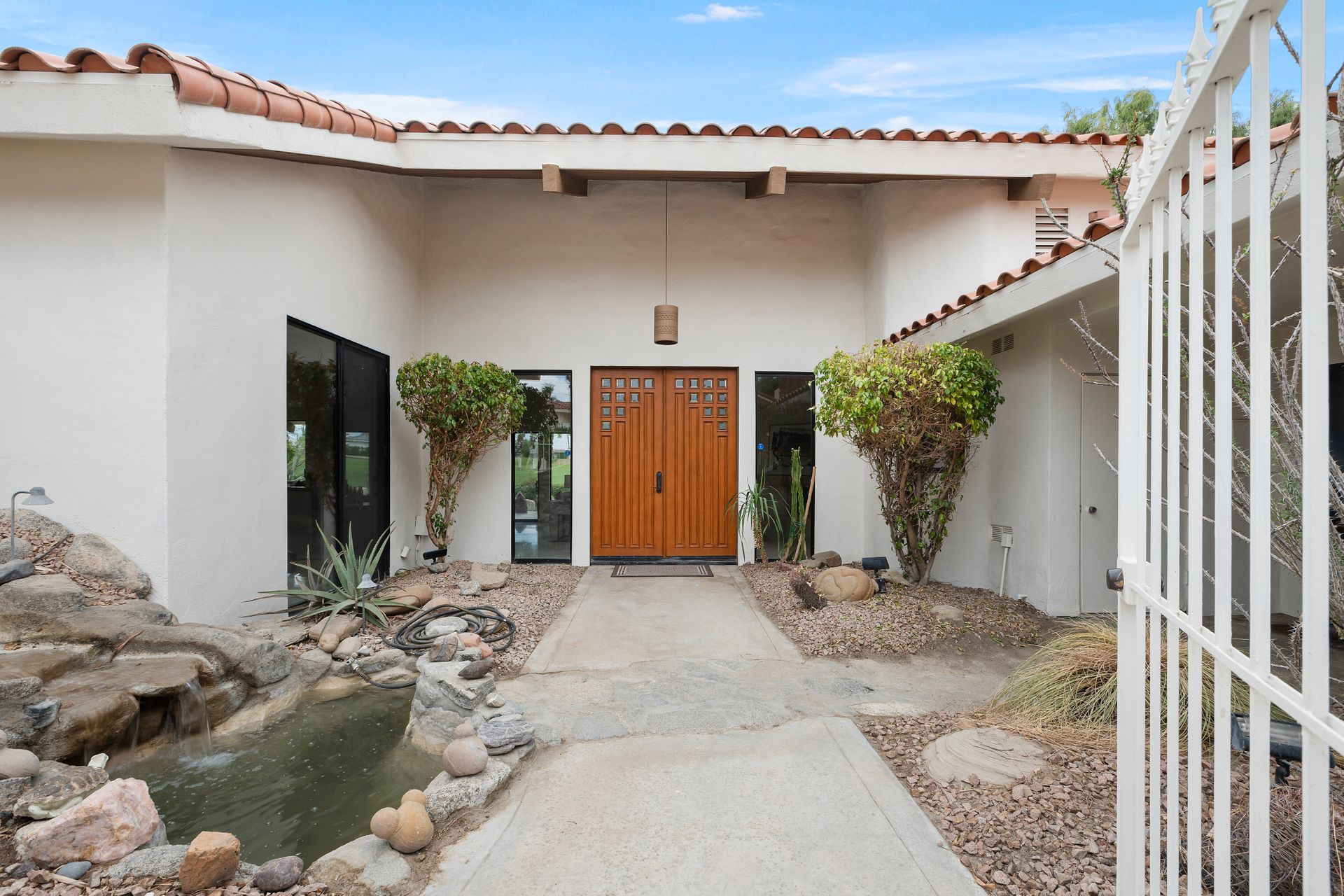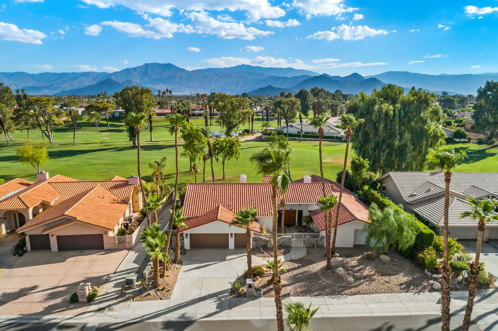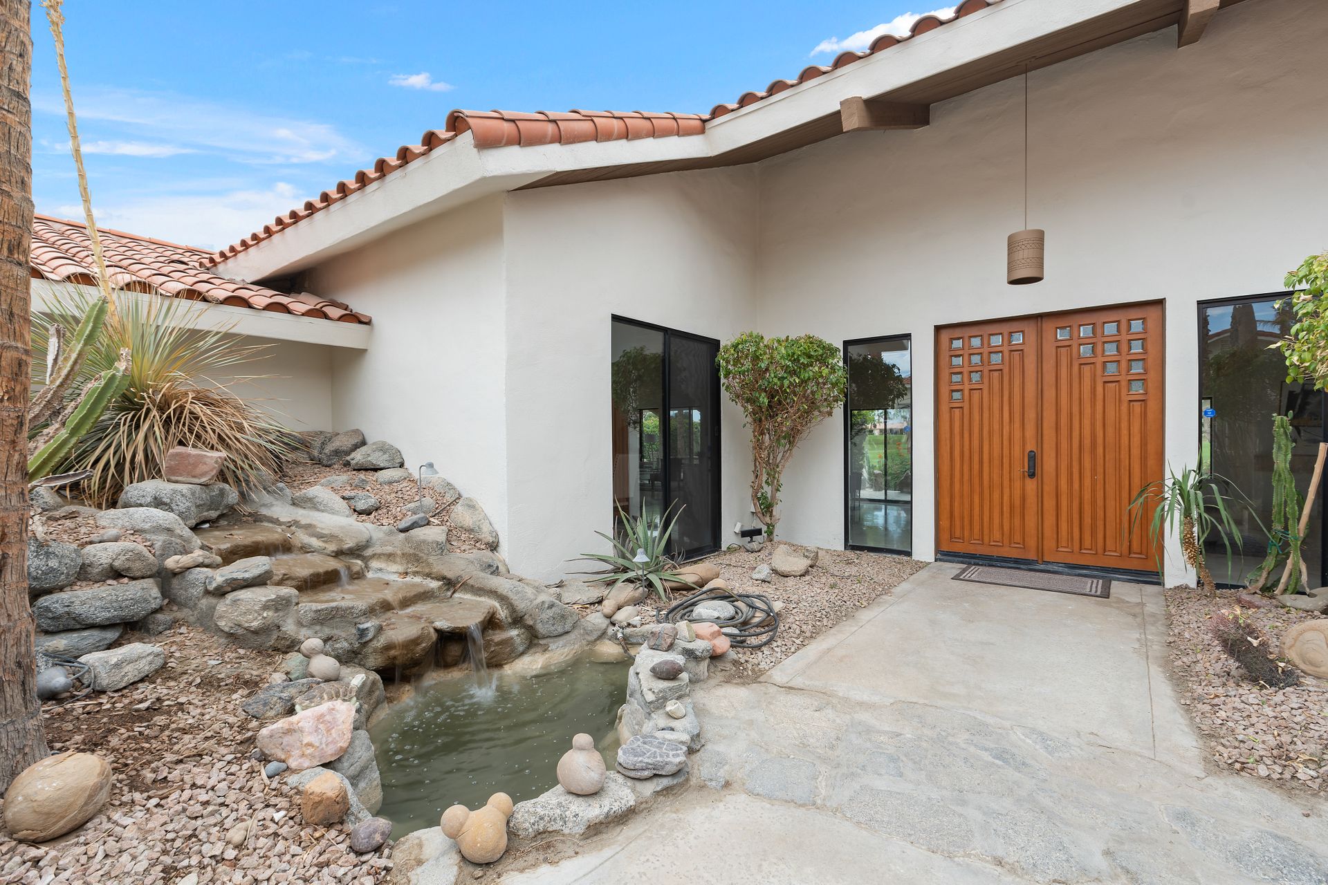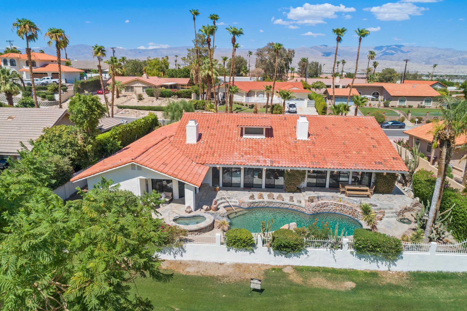 Your dream home awaits you in Bermuda Dunes Country Club. This contemporary approximately 3,588 square foot home is located on the #5 fairway of the classic one course at the club that hosted the Bob Hope Chrysler Classic for 50 years! You will love the South Facing backyard with a double fairway, Lake and Santa Rosa Mountain views. Walk through the courtyard and enjoy the serene waterfall pond. Continue through the double door entry and be amazed by the soaring wood-beamed ceilings and grand open floor plan. This home is an entertainer's delight with a step-down living room with a marble fireplace and a martini bar. The formal dining room is just off of the kitchen as well as the fabulous great room with an inviting granite gas fireplace. The kitchen is also surrounded with granite slab countertops, freshly painted cabinets, a huge breakfast bar and updated stainless steel double ovens and microwave. Outside, enjoy the beautifully landscaped backyard highlighted by a pebble tech pool and spa and misters to keep you cool. The primary suite is a welcome retreat with a built-in office. There is a huge walk-in closet, a granite shower, jacuzzi tub and marble countertops with dual sinks. The two guest bedrooms are both ensuite. This home has been recently painted inside and out! Travertine floors have been cleaned and polished. One air conditioner was replaced in 2023 and the other in 2019. There is also a generator for peace of mind. The spacious two-car garage also has a golf cart garage or storage area. Low HOA of only $214 per month includes internet and cable television with two boxes with Showtime and HBO through Spectrum, as well as 24-hour guard gated security. IID for lower electric. Come and see this spectacular home today!