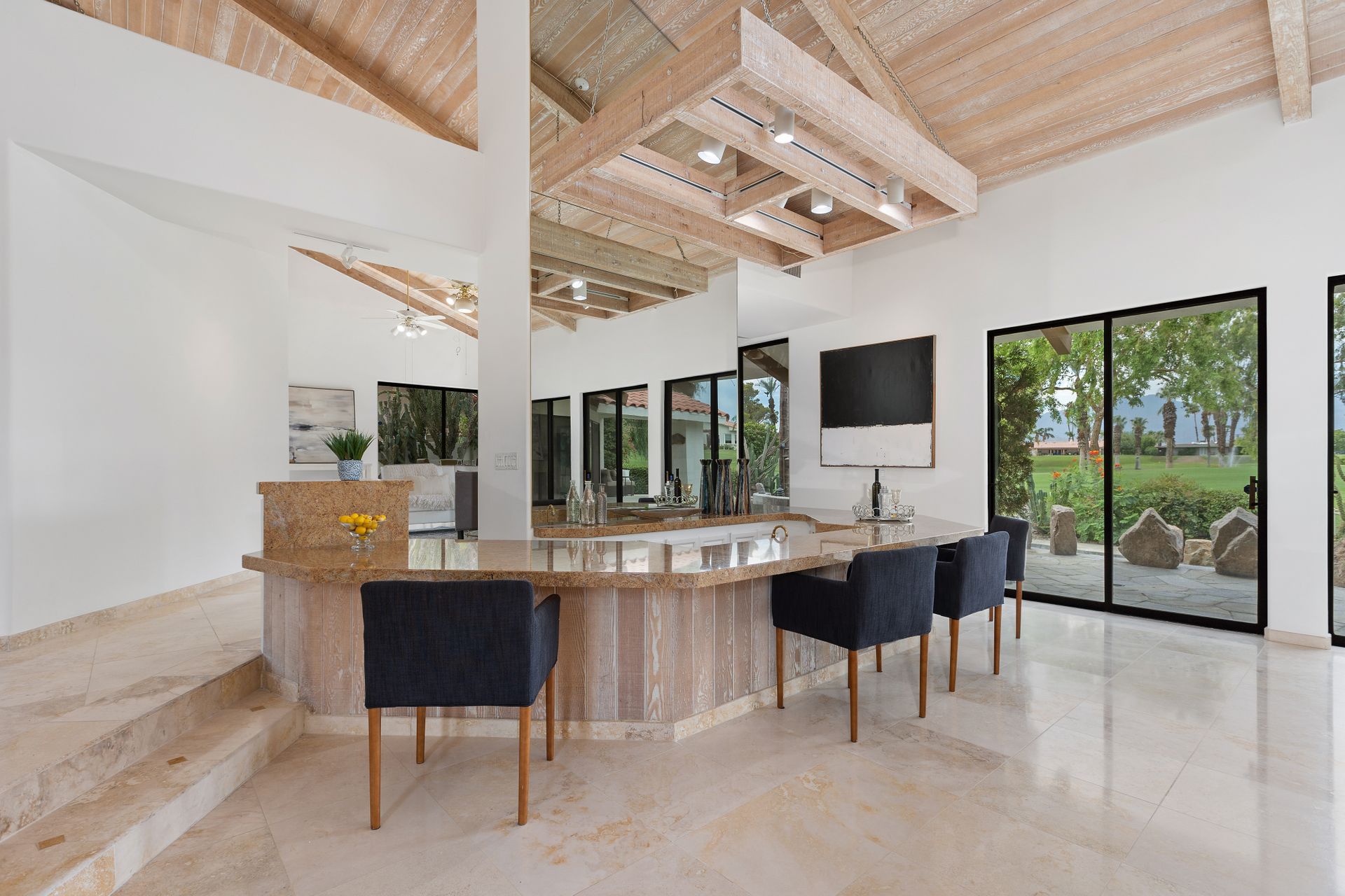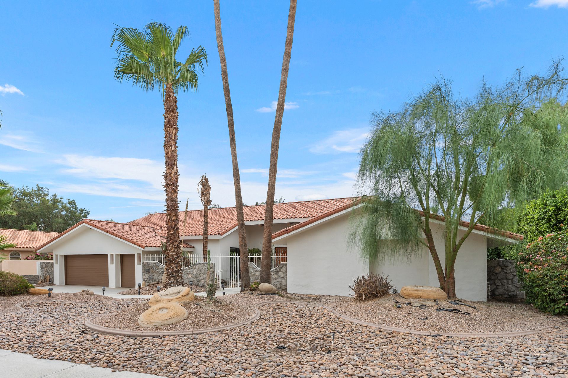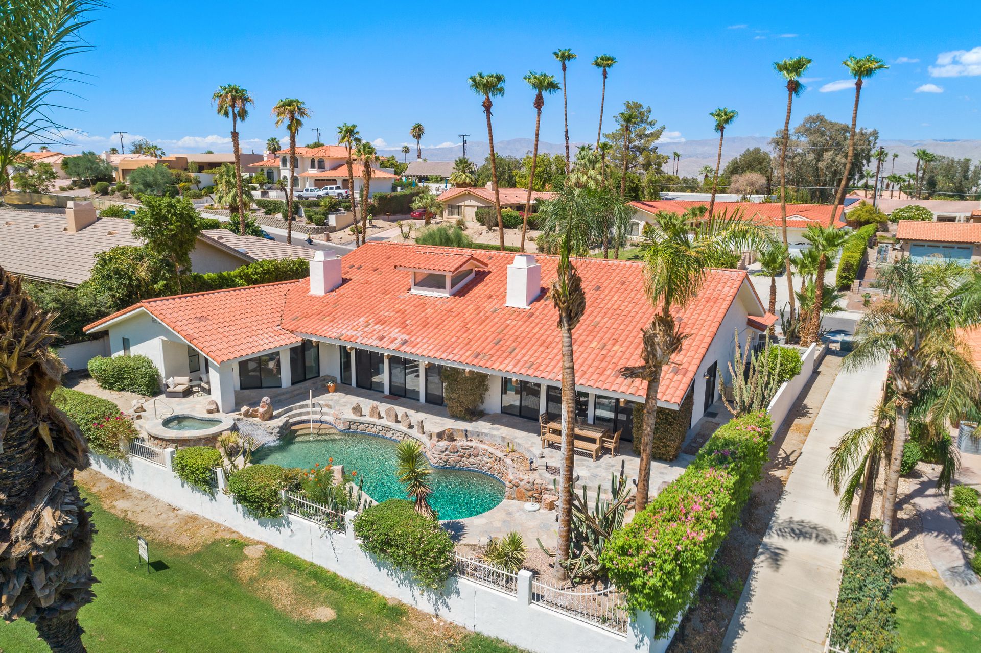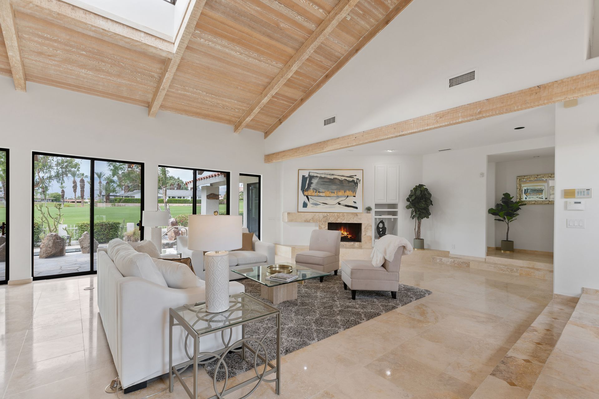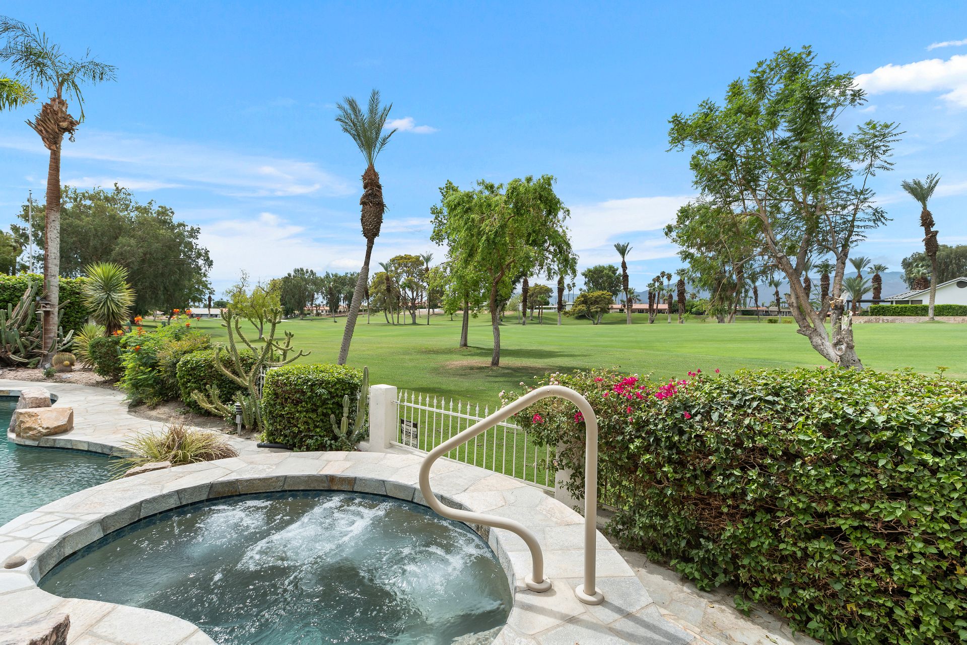 Your dream home awaits you in Bermuda Dunes Country Club. This contemporary approximately 3,588 square foot home is located on the #5 fairway of the classic one course at the club that hosted the Bob Hope Chrysler Classic for 50 years! You will love the South Facing backyard with a double fairway, Lake and Santa Rosa Mountain views. Walk through the courtyard and enjoy the serene waterfall pond. Continue through the double door entry and be amazed by the soaring wood-beamed ceilings and grand open floor plan. This home is an entertainer's delight with a step-down living room with a marble fireplace and a martini bar. The formal dining room is just off of the kitchen as well as the fabulous great room with an inviting granite gas fireplace. The kitchen is also surrounded with granite slab countertops, freshly painted cabinets, a huge breakfast bar and updated stainless steel double ovens and microwave. Outside, enjoy the beautifully landscaped backyard highlighted by a pebble tech pool and spa and misters to keep you cool. The primary suite is a welcome retreat with a built-in office. There is a huge walk-in closet, a granite shower, jacuzzi tub and marble countertops with dual sinks. The two guest bedrooms are both ensuite. This home has been recently painted inside and out! Travertine floors have been cleaned and polished. One air conditioner was replaced in 2023 and the other in 2019. There is also a generator for peace of mind. The spacious two-car garage also has a golf cart garage or storage area. Low HOA of only $214 per month includes internet and cable television with two boxes with Showtime and HBO through Spectrum, as well as 24-hour guard gated security. IID for lower electric. Come and see this spectacular home today!