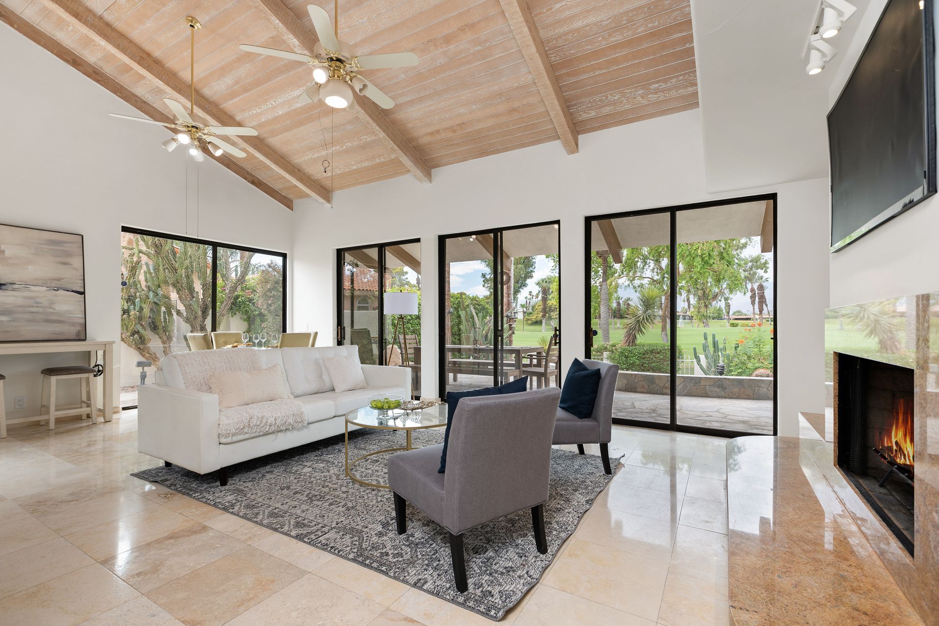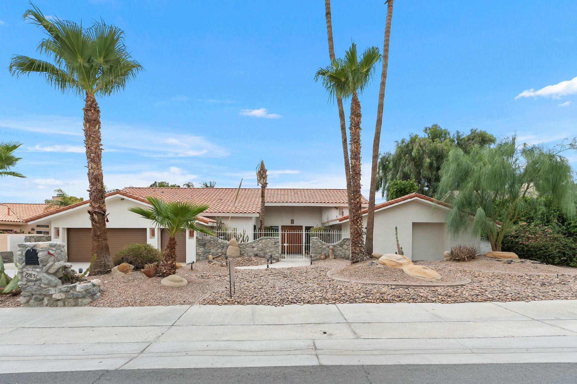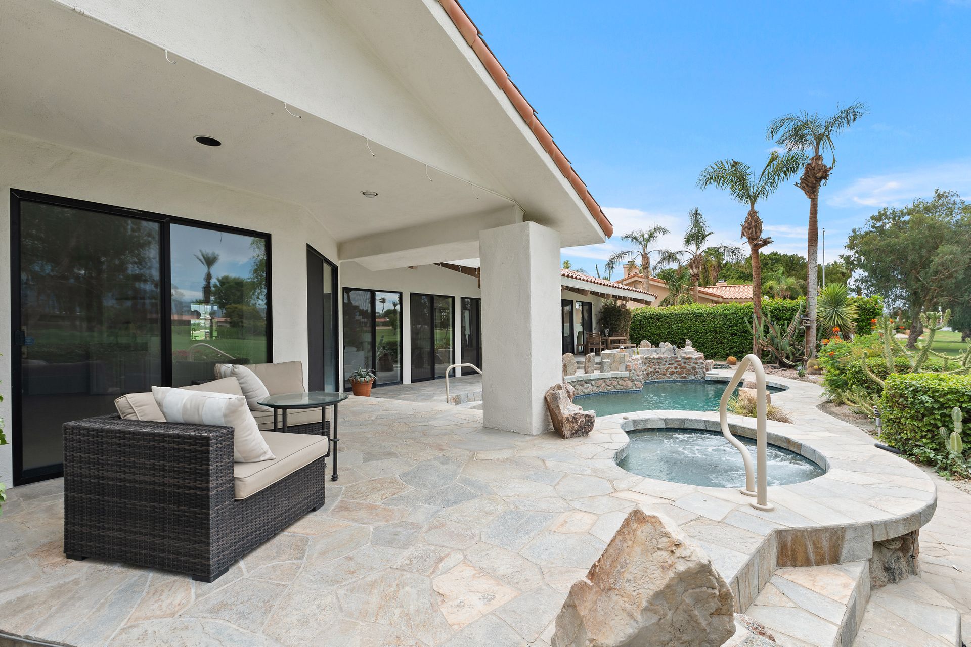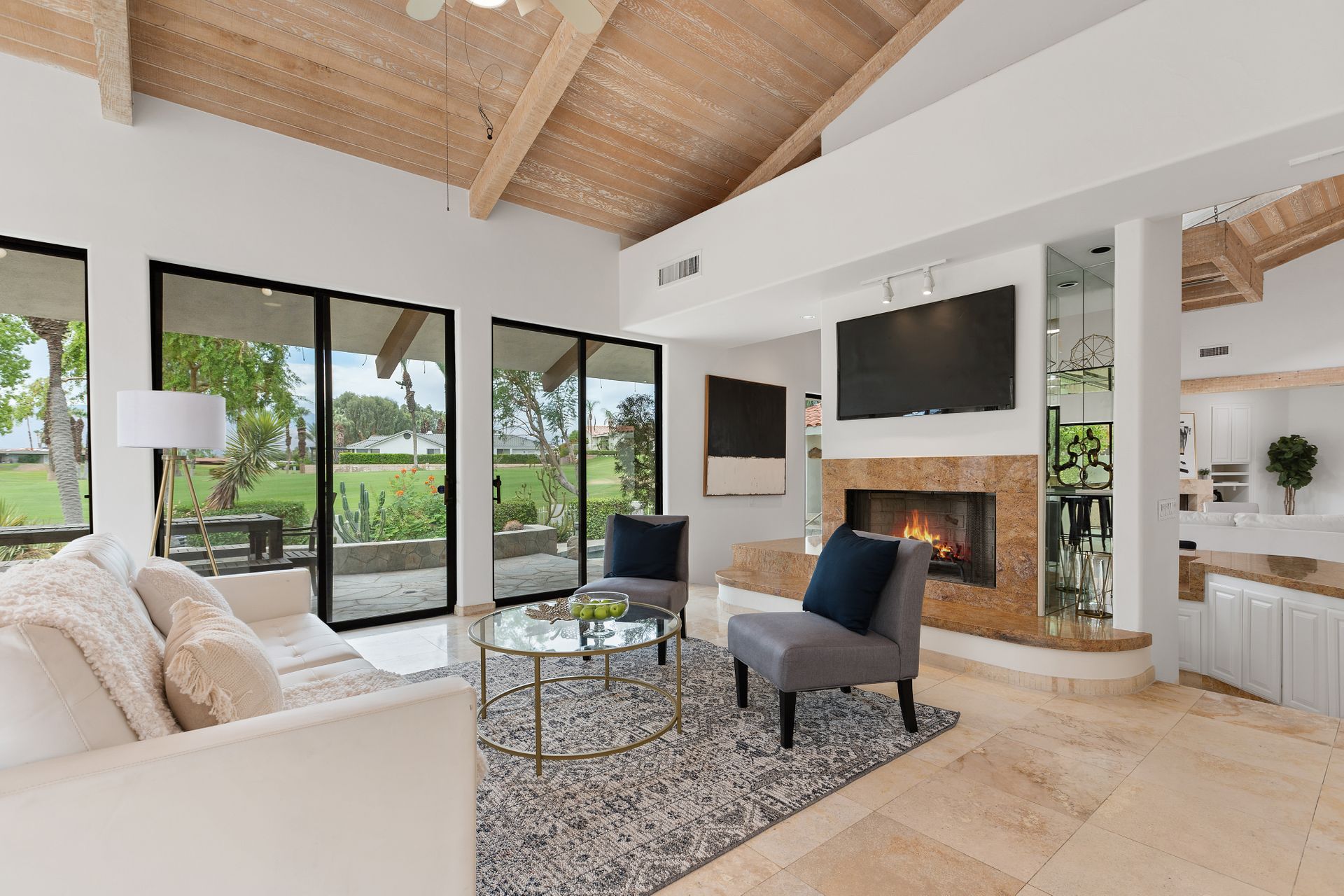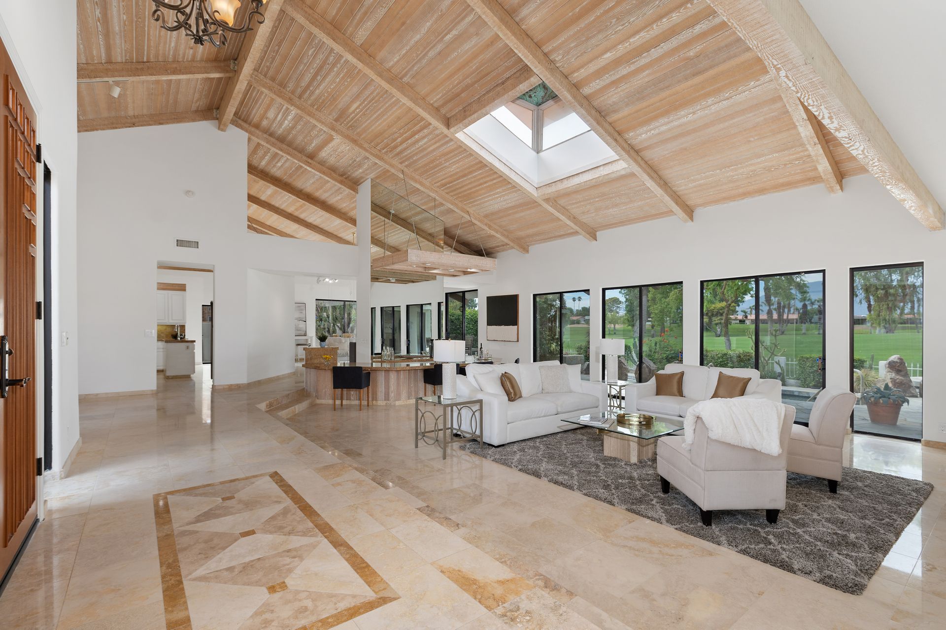 Your dream home awaits you in Bermuda Dunes Country Club. This contemporary approximately 3,588 square foot home is located on the #5 fairway of the classic one course at the club that hosted the Bob Hope Chrysler Classic for 50 years! You will love the South Facing backyard with a double fairway, Lake and Santa Rosa Mountain views. Walk through the courtyard and enjoy the serene waterfall pond. Continue through the double door entry and be amazed by the soaring wood-beamed ceilings and grand open floor plan. This home is an entertainer's delight with a step-down living room with a marble fireplace and a martini bar. The formal dining room is just off of the kitchen as well as the fabulous great room with an inviting granite gas fireplace. The kitchen is also surrounded with granite slab countertops, freshly painted cabinets, a huge breakfast bar and updated stainless steel double ovens and microwave. Outside, enjoy the beautifully landscaped backyard highlighted by a pebble tech pool and spa and misters to keep you cool. The primary suite is a welcome retreat with a built-in office. There is a huge walk-in closet, a granite shower, jacuzzi tub and marble countertops with dual sinks. The two guest bedrooms are both ensuite. This home has been recently painted inside and out! Travertine floors have been cleaned and polished. One air conditioner was replaced in 2023 and the other in 2019. There is also a generator for peace of mind. The spacious two-car garage also has a golf cart garage or storage area. Low HOA of only $214 per month includes internet and cable television with two boxes with Showtime and HBO through Spectrum, as well as 24-hour guard gated security. IID for lower electric. Come and see this spectacular home today!