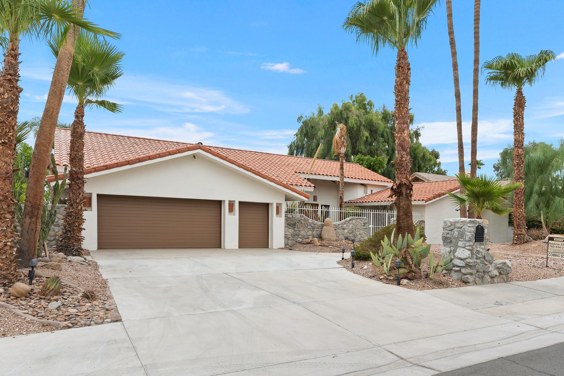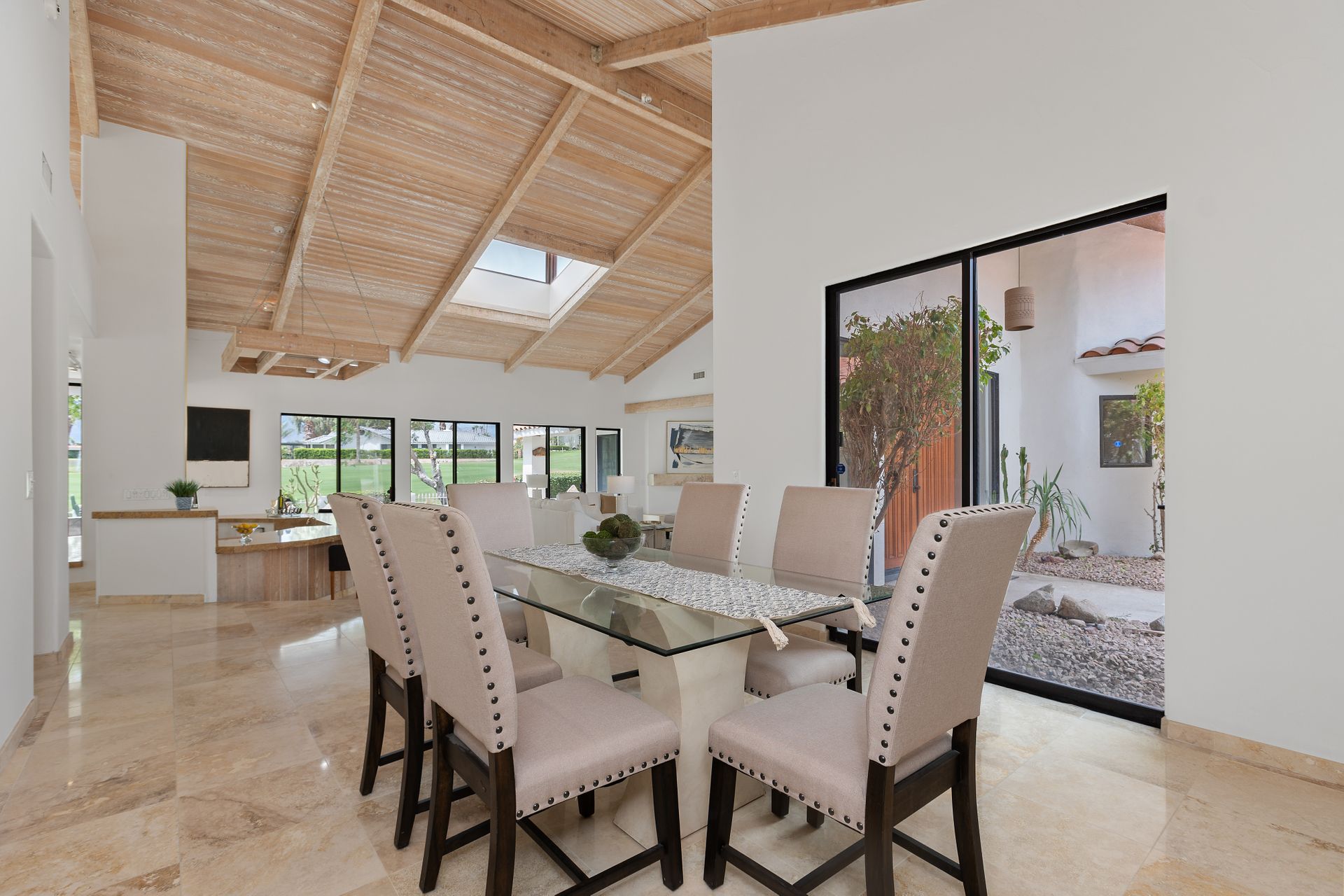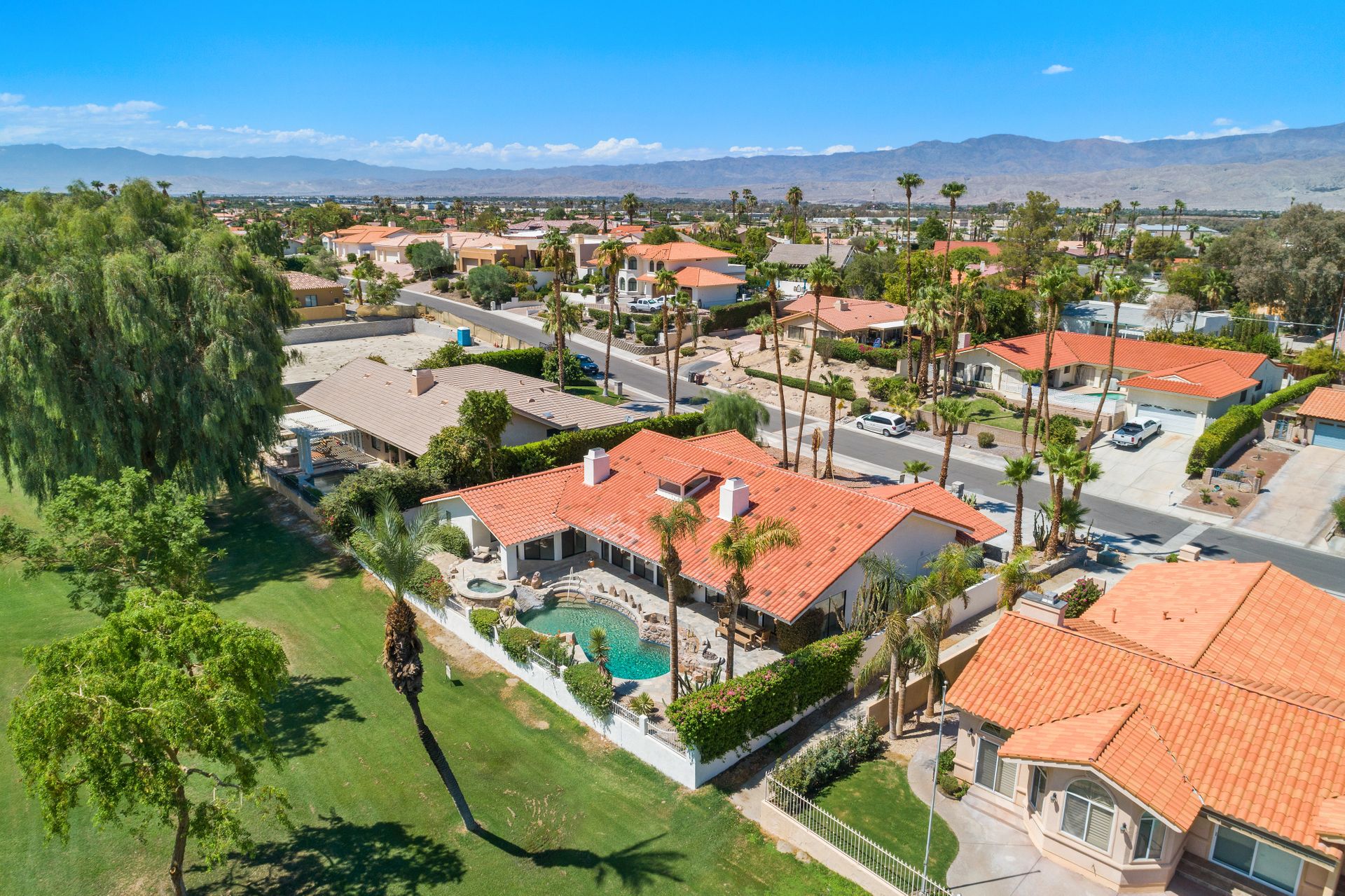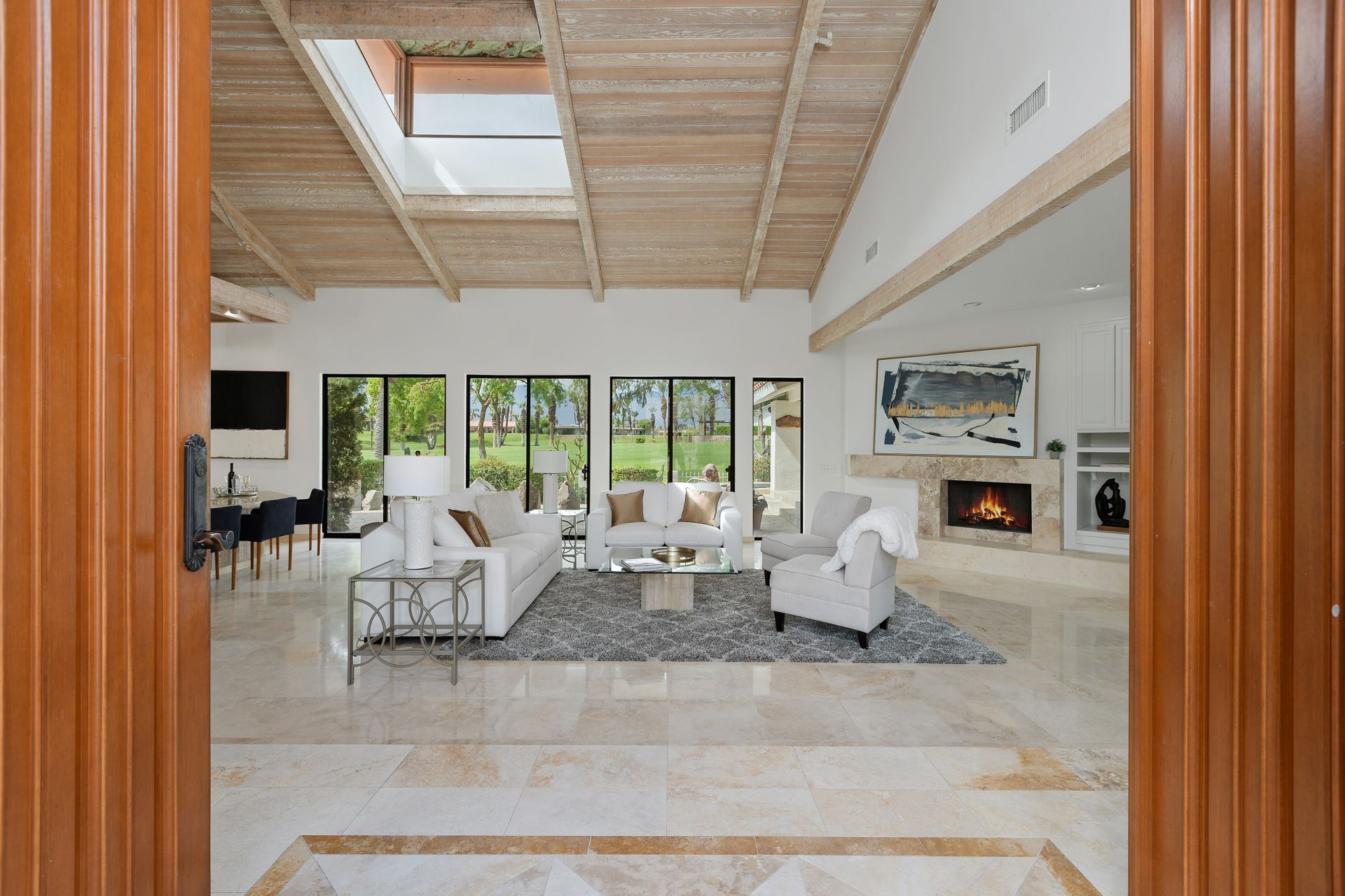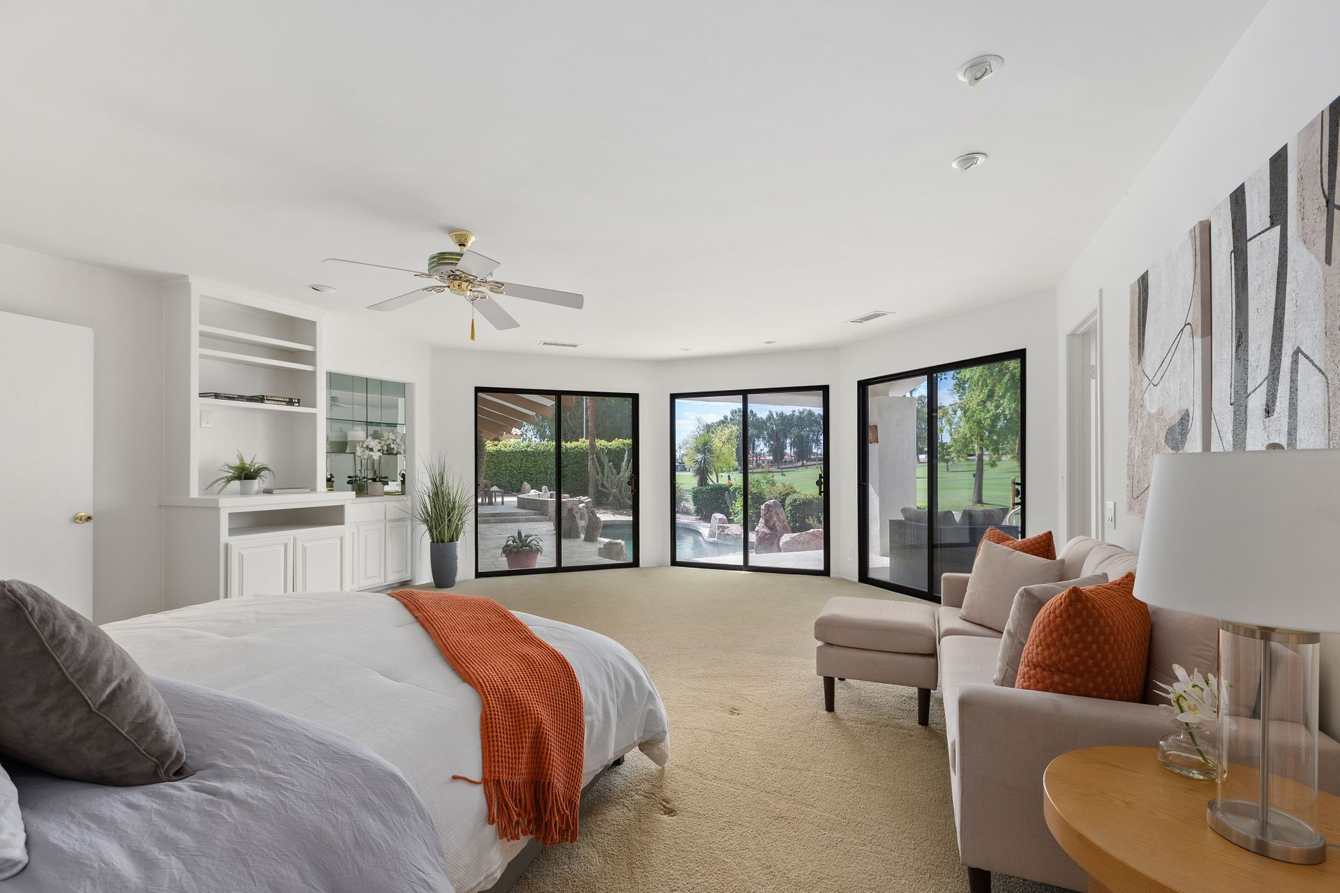Your dream home awaits you in Bermuda Dunes Country Club. This contemporary approximately 3,588 square foot home is located on the #5 fairway of the classic one course at the club that hosted the Bob Hope Chrysler Classic for 50 years! You will love the South Facing backyard with a double fairway, Lake and Santa Rosa Mountain views. Walk through the courtyard and enjoy the serene waterfall pond. Continue through the double door entry and be amazed by the soaring wood-beamed ceilings and grand open floor plan. This home is an entertainer's delight with a step-down living room with a marble fireplace and a martini bar. The formal dining room is just off of the kitchen as well as the fabulous great room with an inviting granite gas fireplace. The kitchen is also surrounded with granite slab countertops, freshly painted cabinets, a huge breakfast bar and updated stainless steel double ovens and microwave. Outside, enjoy the beautifully landscaped backyard highlighted by a pebble tech pool and spa and misters to keep you cool. The primary suite is a welcome retreat with a built-in office. There is a huge walk-in closet, a granite shower, jacuzzi tub and marble countertops with dual sinks. The two guest bedrooms are both ensuite. This home has been recently painted inside and out! Travertine floors have been cleaned and polished. One air conditioner was replaced in 2023 and the other in 2019. There is also a generator for peace of mind. The spacious two-car garage also has a golf cart garage or storage area. Low HOA of only $214 per month includes internet and cable television with two boxes with Showtime and HBO through Spectrum, as well as 24-hour guard gated security. IID for lower electric. Come and see this spectacular home today!