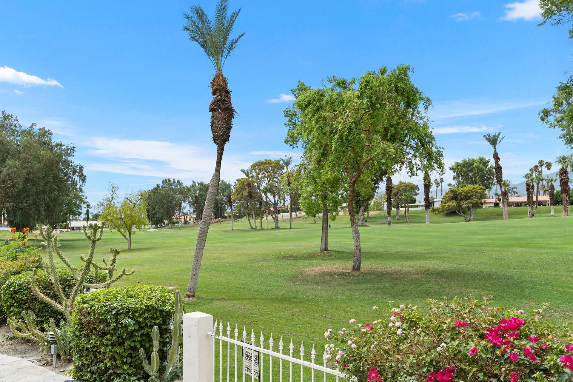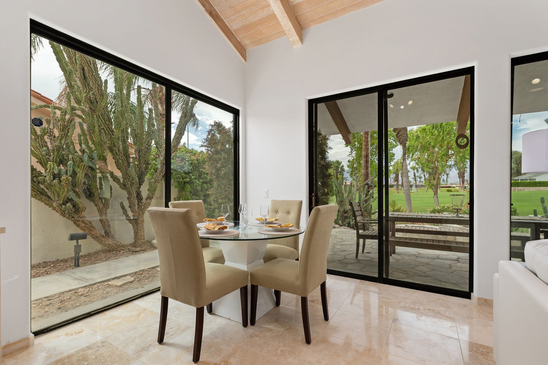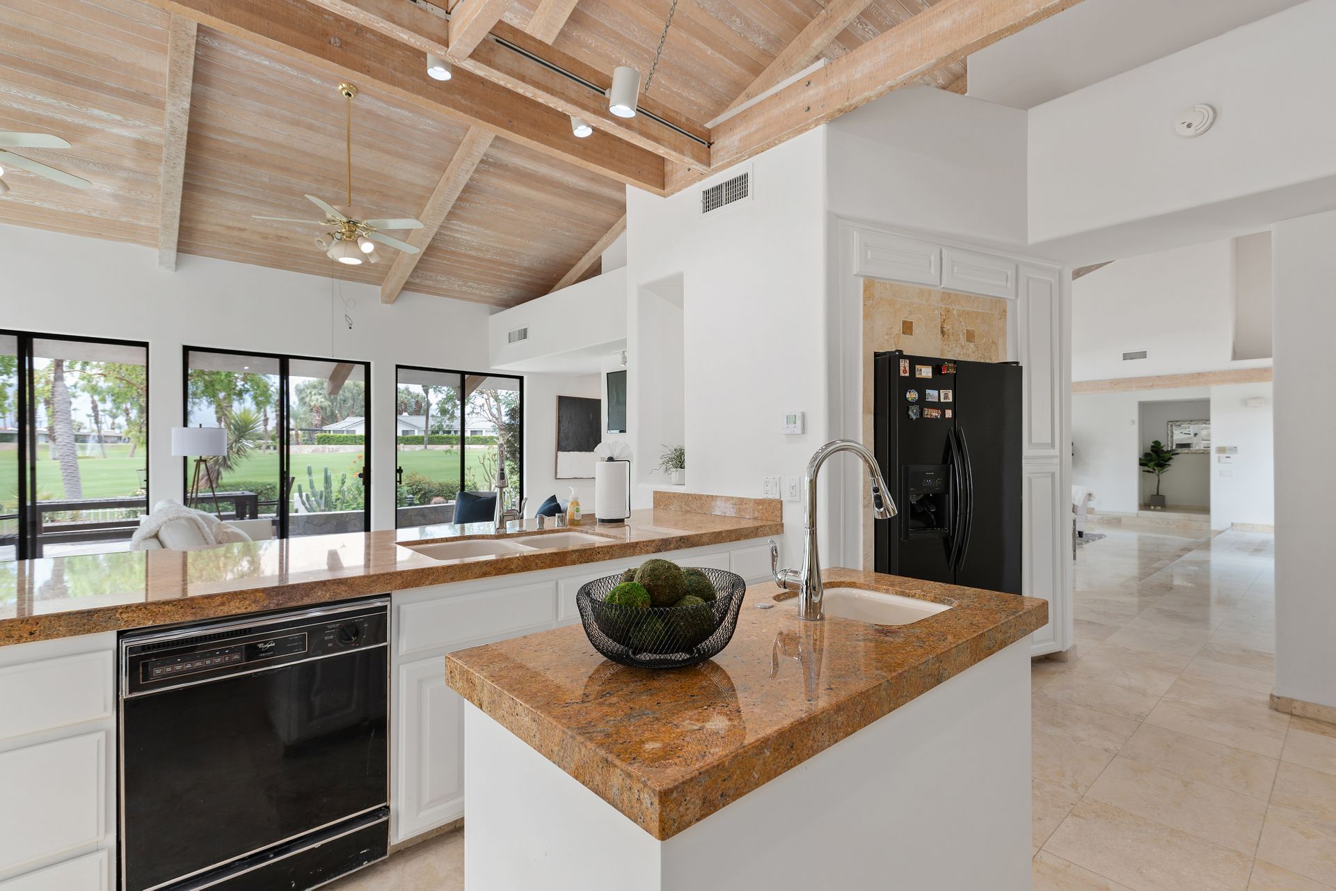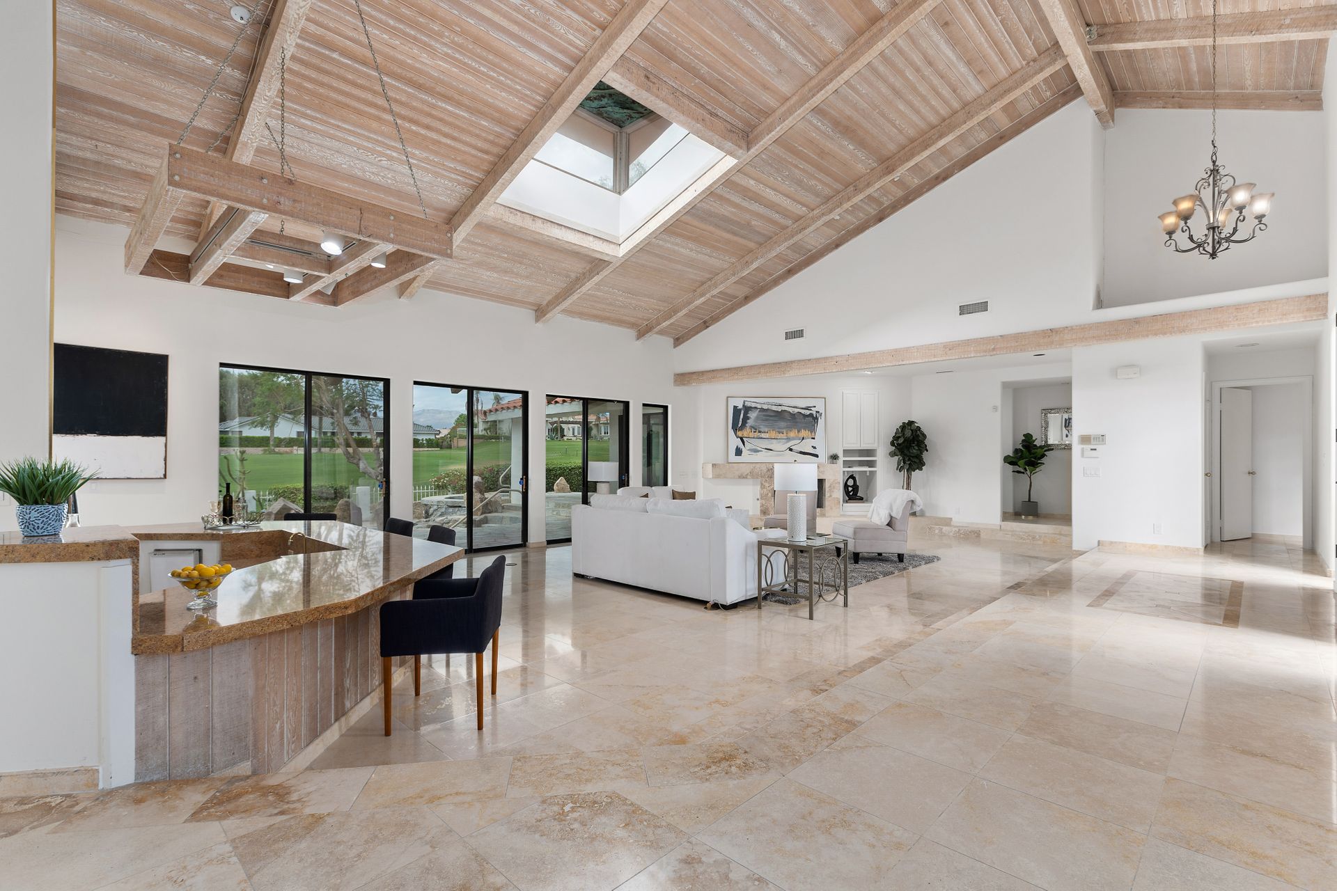 Your dream home awaits you in Bermuda Dunes Country Club. This contemporary approximately 3,588 square foot home is located on the #5 fairway of the classic one course at the club that hosted the Bob Hope Chrysler Classic for 50 years! You will love the South Facing backyard with a double fairway, Lake and Santa Rosa Mountain views. Walk through the courtyard and enjoy the serene waterfall pond. Continue through the double door entry and be amazed by the soaring wood-beamed ceilings and grand open floor plan. This home is an entertainer's delight with a step-down living room with a marble fireplace and a martini bar. The formal dining room is just off of the kitchen as well as the fabulous great room with an inviting granite gas fireplace. The kitchen is also surrounded with granite slab countertops, freshly painted cabinets, a huge breakfast bar and updated stainless steel double ovens and microwave. Outside, enjoy the beautifully landscaped backyard highlighted by a pebble tech pool and spa and misters to keep you cool. The primary suite is a welcome retreat with a built-in office. There is a huge walk-in closet, a granite shower, jacuzzi tub and marble countertops with dual sinks. The two guest bedrooms are both ensuite. This home has been recently painted inside and out! Travertine floors have been cleaned and polished. One air conditioner was replaced in 2023 and the other in 2019. There is also a generator for peace of mind. The spacious two-car garage also has a golf cart garage or storage area. Low HOA of only $214 per month includes internet and cable television with two boxes with Showtime and HBO through Spectrum, as well as 24-hour guard gated security. IID for lower electric. Come and see this spectacular home today!