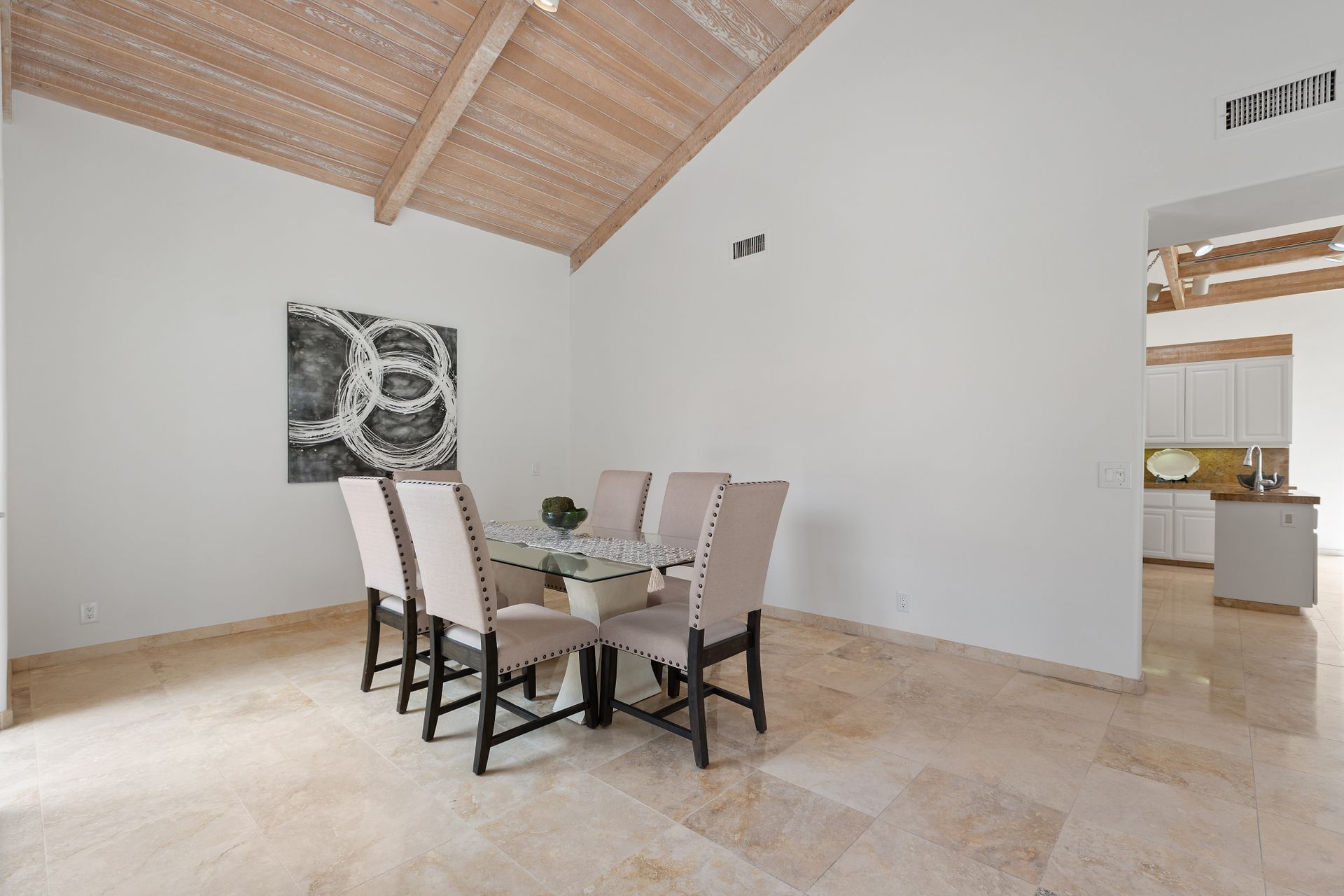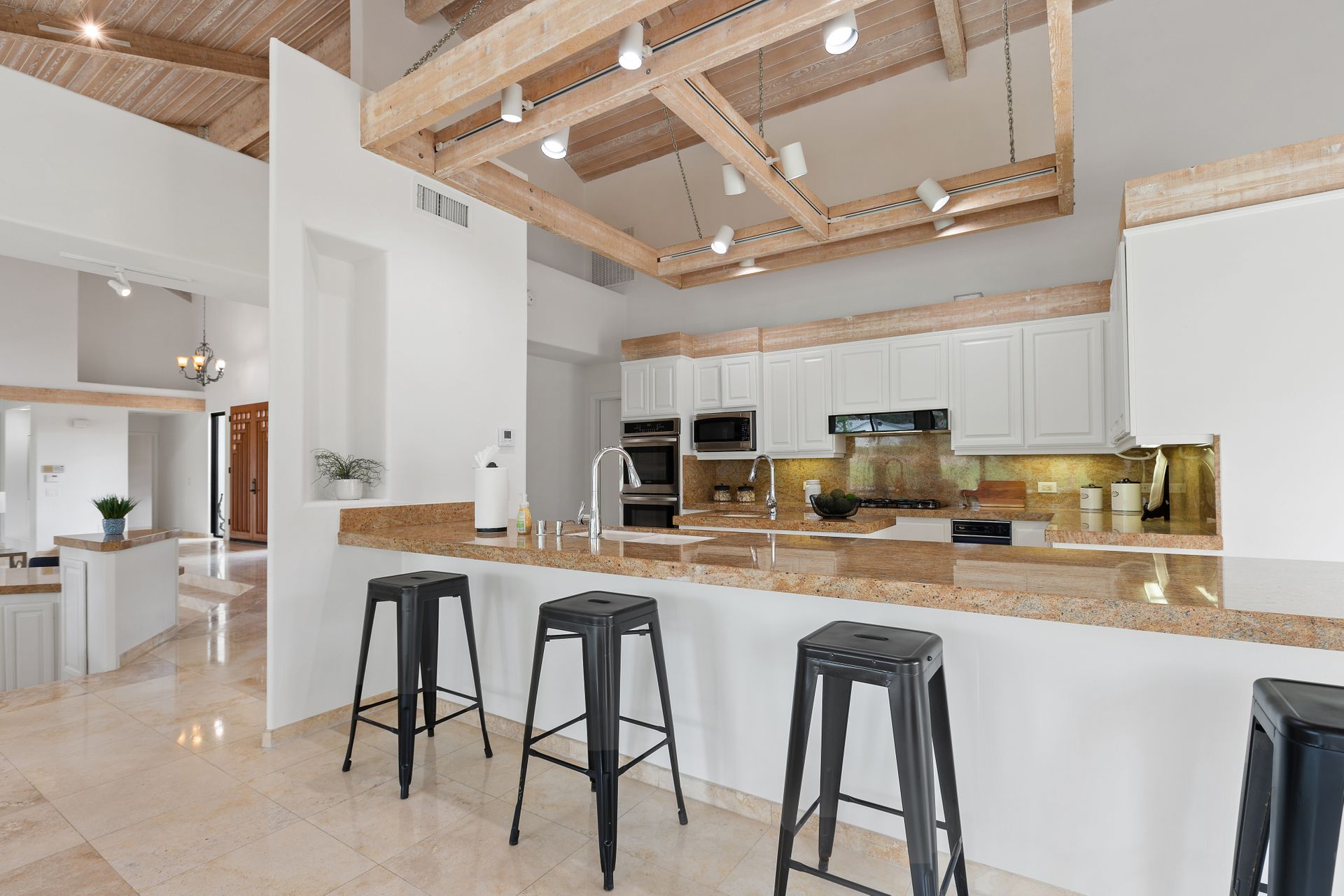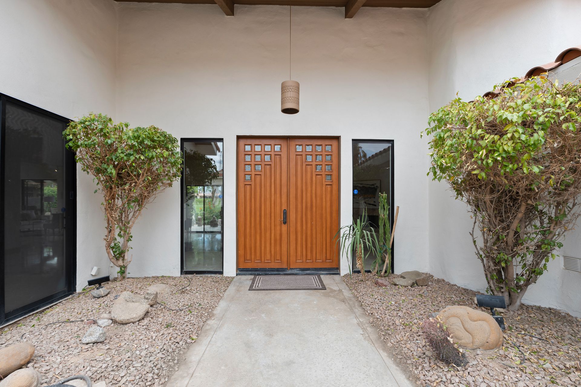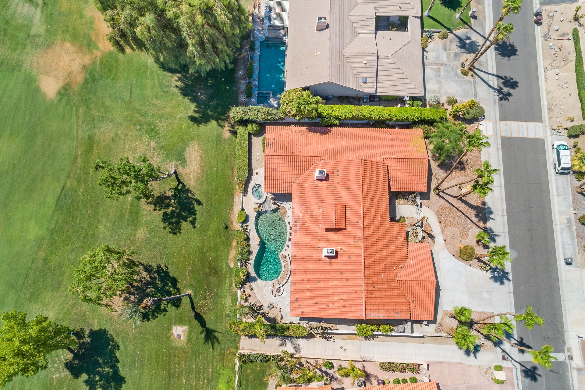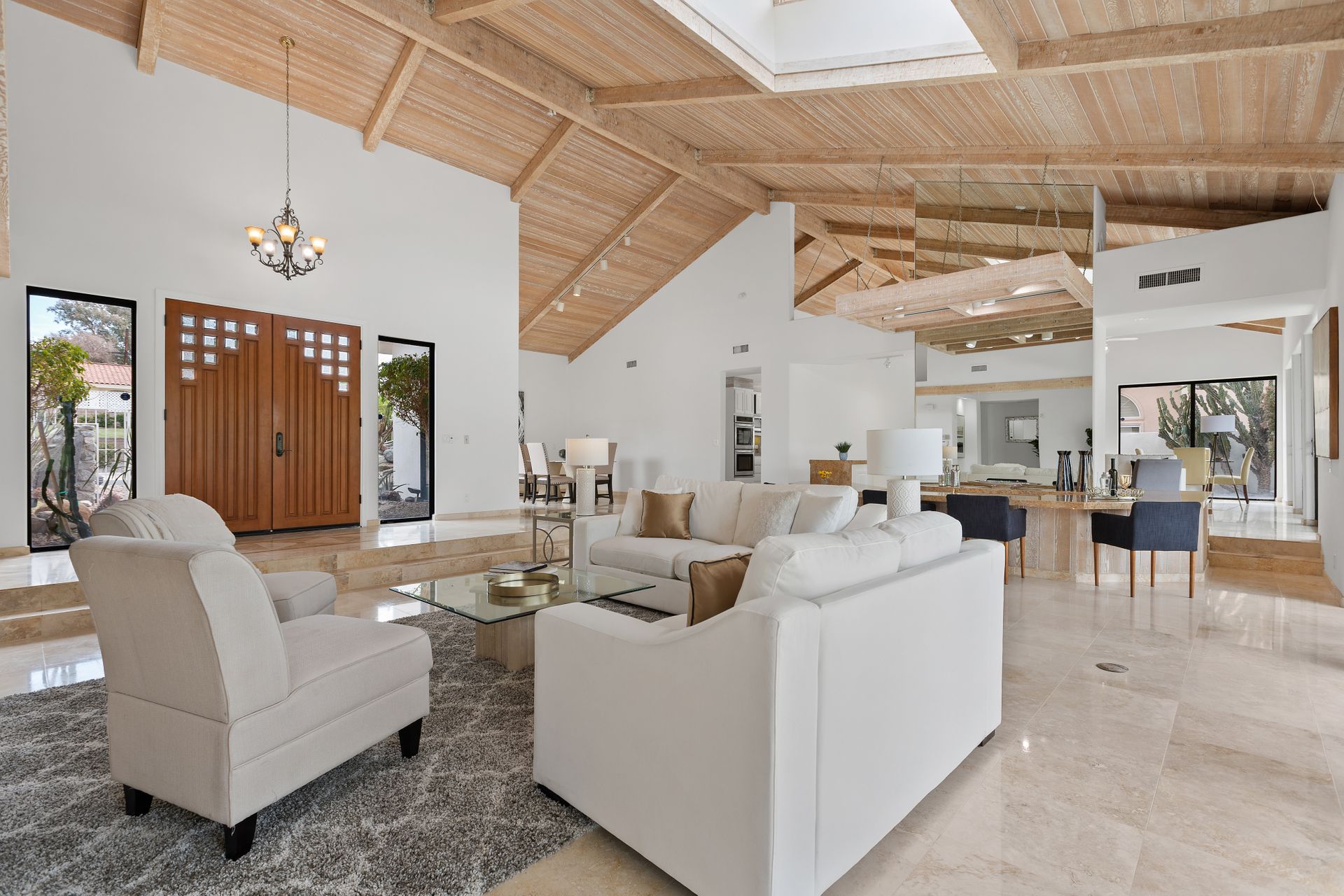Your dream home awaits you in Bermuda Dunes Country Club. This contemporary approximately 3,588 square foot home is located on the #5 fairway of the classic one course at the club that hosted the Bob Hope Chrysler Classic for 50 years! You will love the South Facing backyard with a double fairway, Lake and Santa Rosa Mountain views. Walk through the courtyard and enjoy the serene waterfall pond. Continue through the double door entry and be amazed by the soaring wood-beamed ceilings and grand open floor plan. This home is an entertainer's delight with a step-down living room with a marble fireplace and a martini bar. The formal dining room is just off of the kitchen as well as the fabulous great room with an inviting granite gas fireplace. The kitchen is also surrounded with granite slab countertops, freshly painted cabinets, a huge breakfast bar and updated stainless steel double ovens and microwave. Outside, enjoy the beautifully landscaped backyard highlighted by a pebble tech pool and spa and misters to keep you cool. The primary suite is a welcome retreat with a built-in office. There is a huge walk-in closet, a granite shower, jacuzzi tub and marble countertops with dual sinks. The two guest bedrooms are both ensuite. This home has been recently painted inside and out! Travertine floors have been cleaned and polished. One air conditioner was replaced in 2023 and the other in 2019. There is also a generator for peace of mind. The spacious two-car garage also has a golf cart garage or storage area. Low HOA of only $214 per month includes internet and cable television with two boxes with Showtime and HBO through Spectrum, as well as 24-hour guard gated security. IID for lower electric. Come and see this spectacular home today!