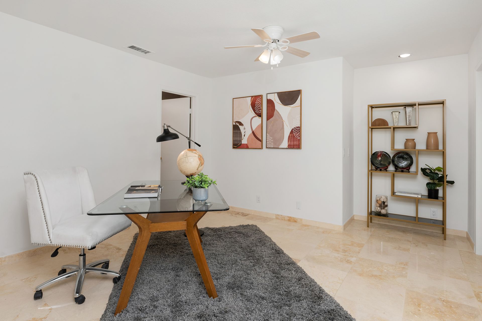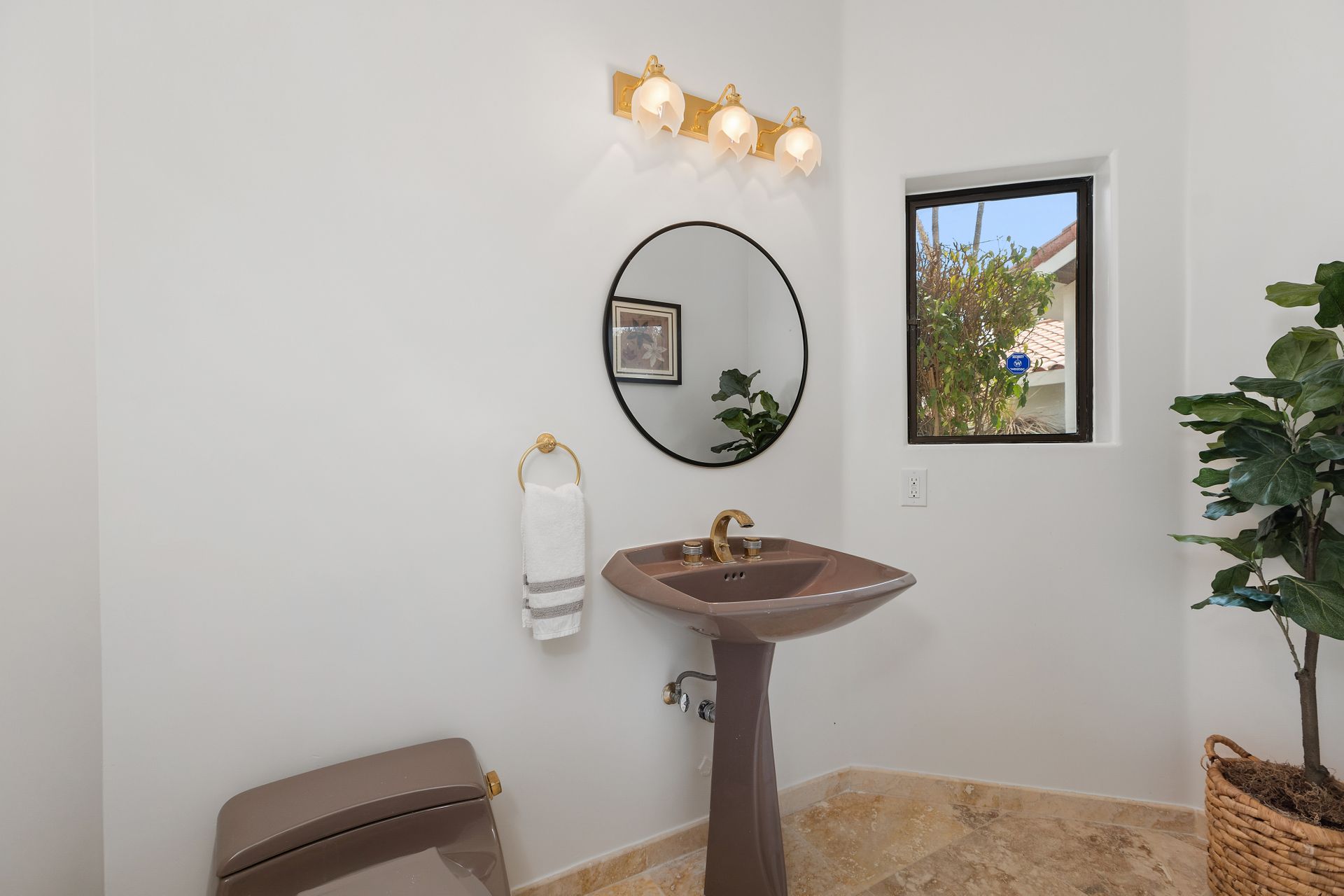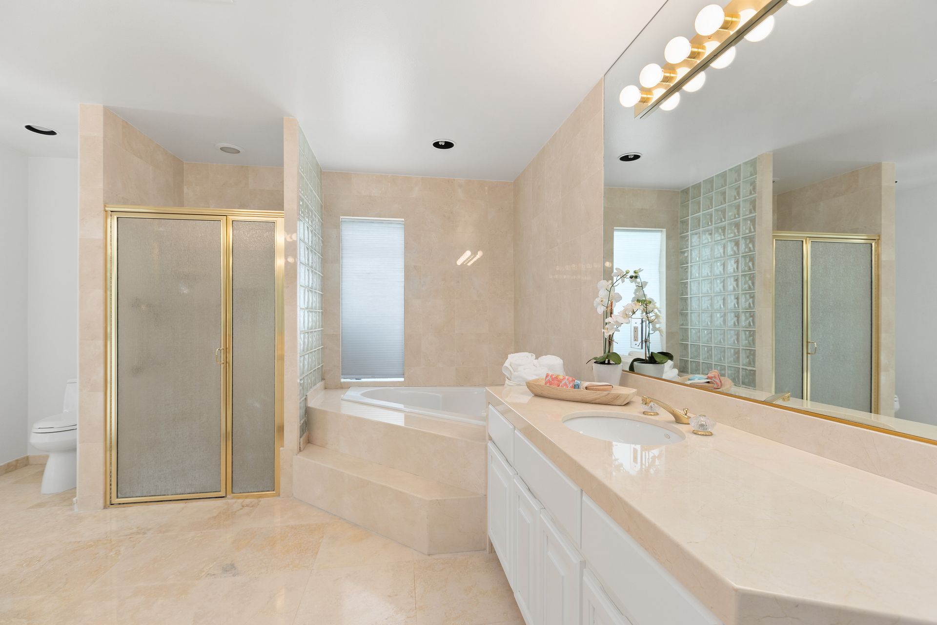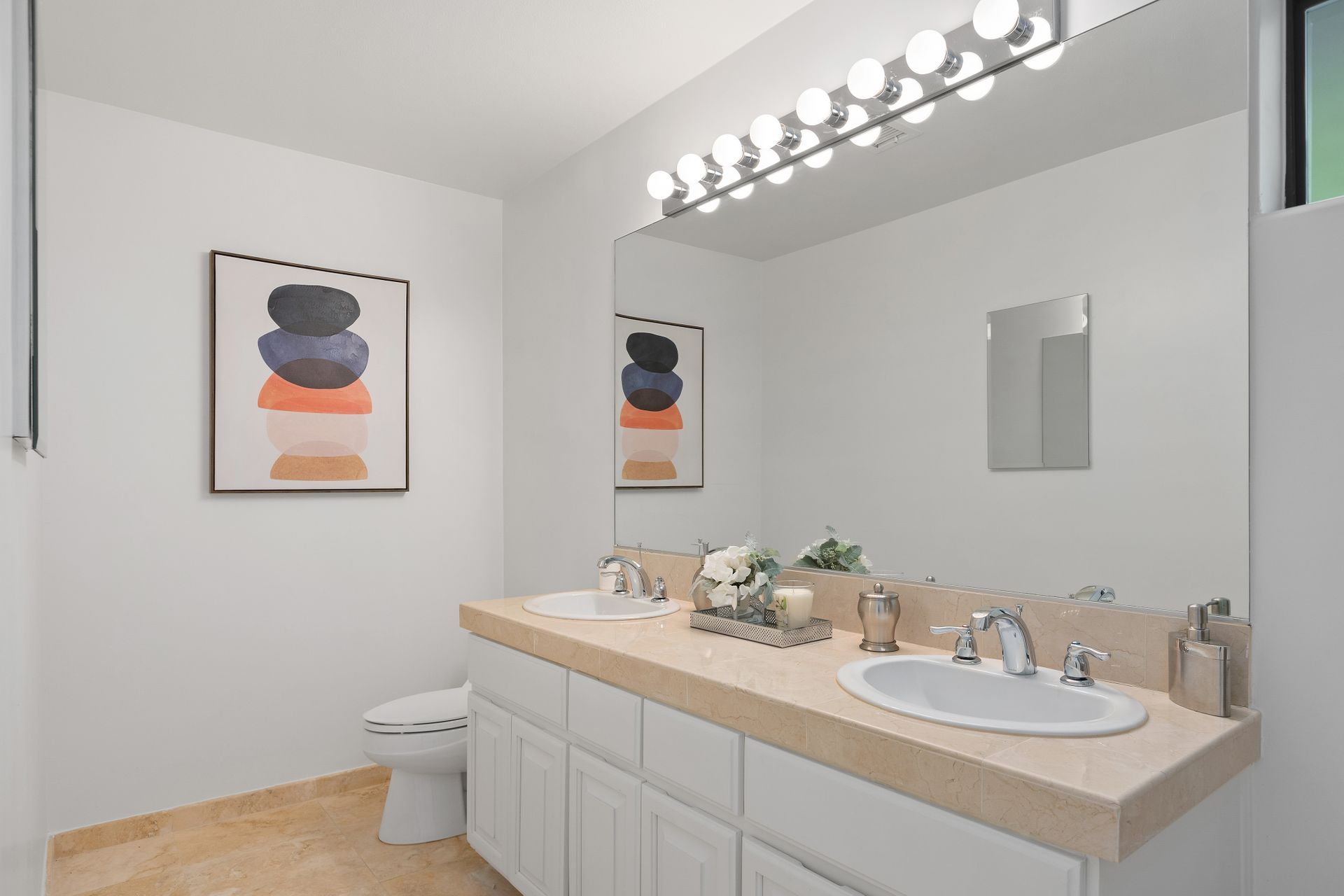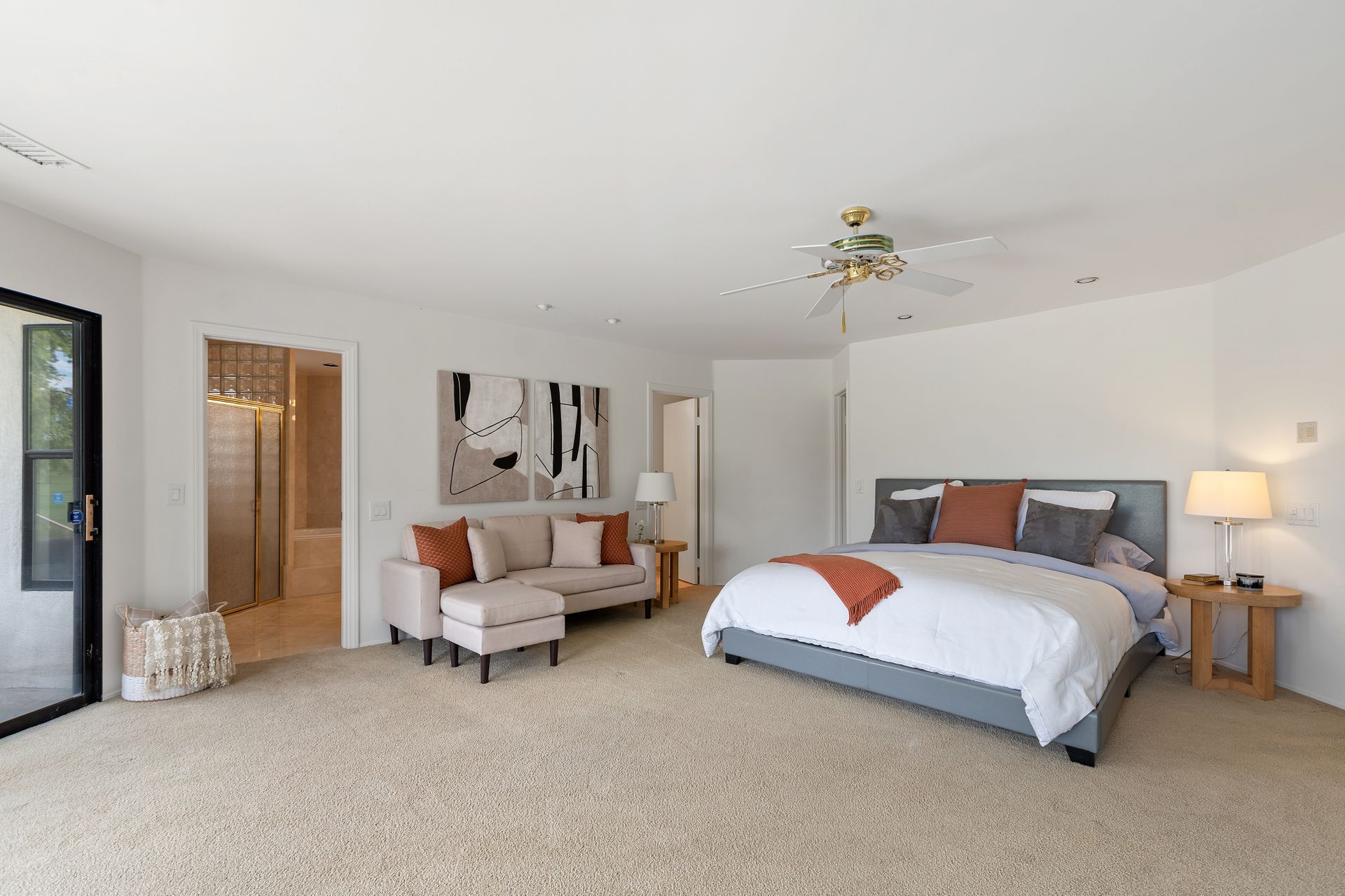 Your dream home awaits you in Bermuda Dunes Country Club. This contemporary approximately 3,588 square foot home is located on the #5 fairway of the classic one course at the club that hosted the Bob Hope Chrysler Classic for 50 years! You will love the South Facing backyard with a double fairway, Lake and Santa Rosa Mountain views. Walk through the courtyard and enjoy the serene waterfall pond. Continue through the double door entry and be amazed by the soaring wood-beamed ceilings and grand open floor plan. This home is an entertainer's delight with a step-down living room with a marble fireplace and a martini bar. The formal dining room is just off of the kitchen as well as the fabulous great room with an inviting granite gas fireplace. The kitchen is also surrounded with granite slab countertops, freshly painted cabinets, a huge breakfast bar and updated stainless steel double ovens and microwave. Outside, enjoy the beautifully landscaped backyard highlighted by a pebble tech pool and spa and misters to keep you cool. The primary suite is a welcome retreat with a built-in office. There is a huge walk-in closet, a granite shower, jacuzzi tub and marble countertops with dual sinks. The two guest bedrooms are both ensuite. This home has been recently painted inside and out! Travertine floors have been cleaned and polished. One air conditioner was replaced in 2023 and the other in 2019. There is also a generator for peace of mind. The spacious two-car garage also has a golf cart garage or storage area. Low HOA of only $214 per month includes internet and cable television with two boxes with Showtime and HBO through Spectrum, as well as 24-hour guard gated security. IID for lower electric. Come and see this spectacular home today!