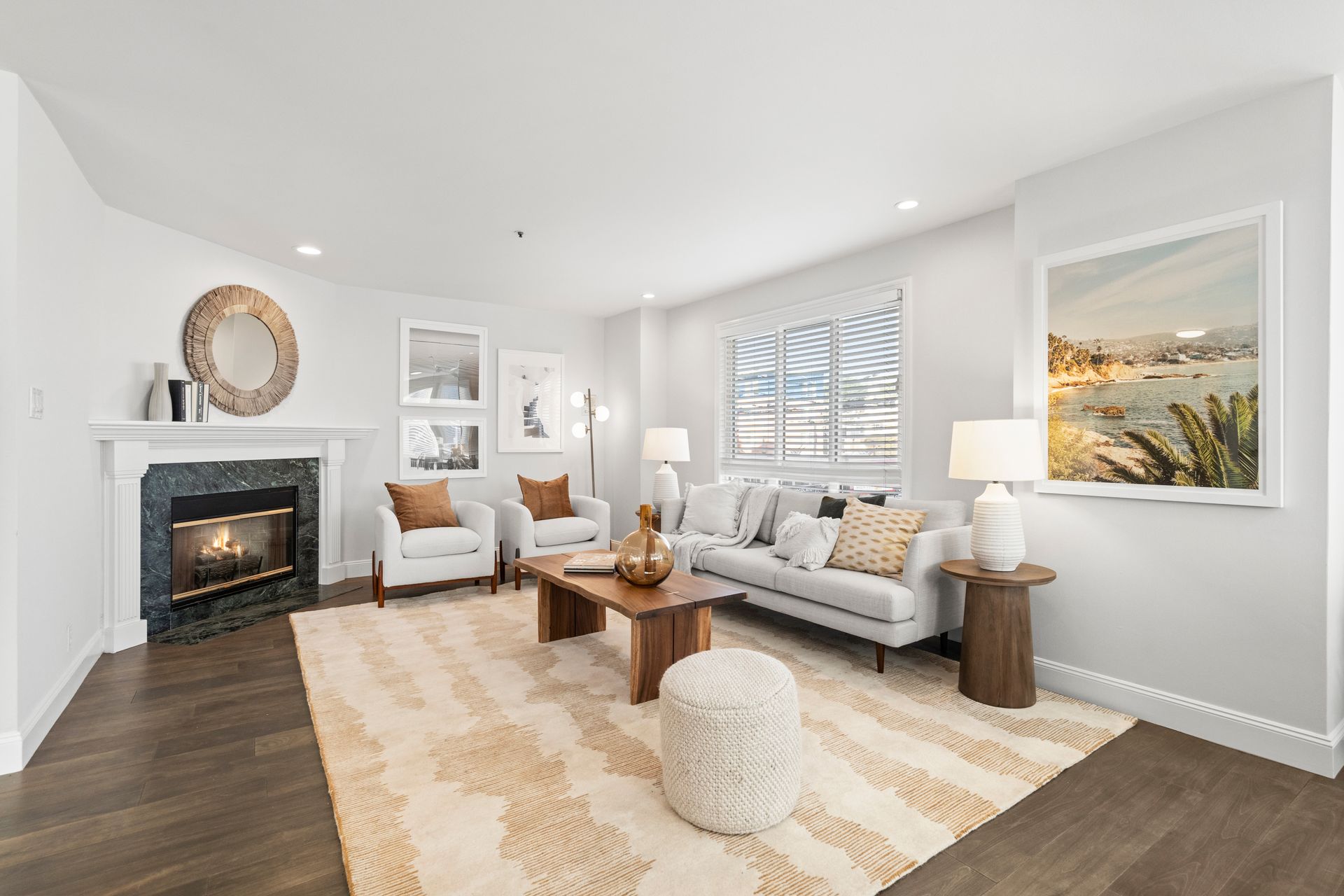 Enter inside and feel instantly at home as sunlight pours through expansive windows, showcasing expansive views of the Pacific Ocean and breathtaking sunsets. The open-concept living and dining area, complete with a cozy fireplace and gleaming hardwood floors, provides the ideal setting for relaxation or entertaining. The bright kitchen features premium appliances, ample cabinet space and a breakfast nook by the window—ideal for morning coffee with a view.