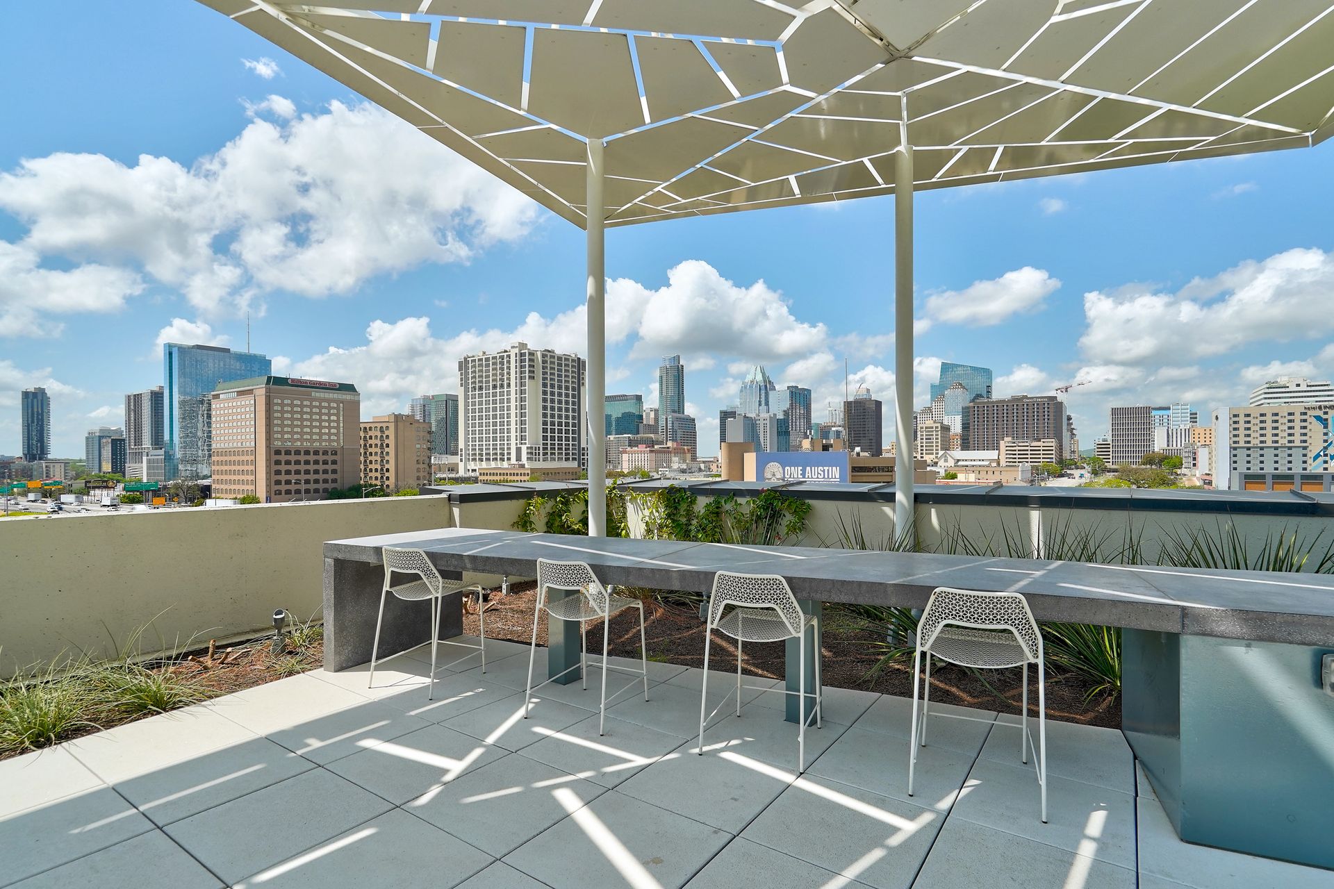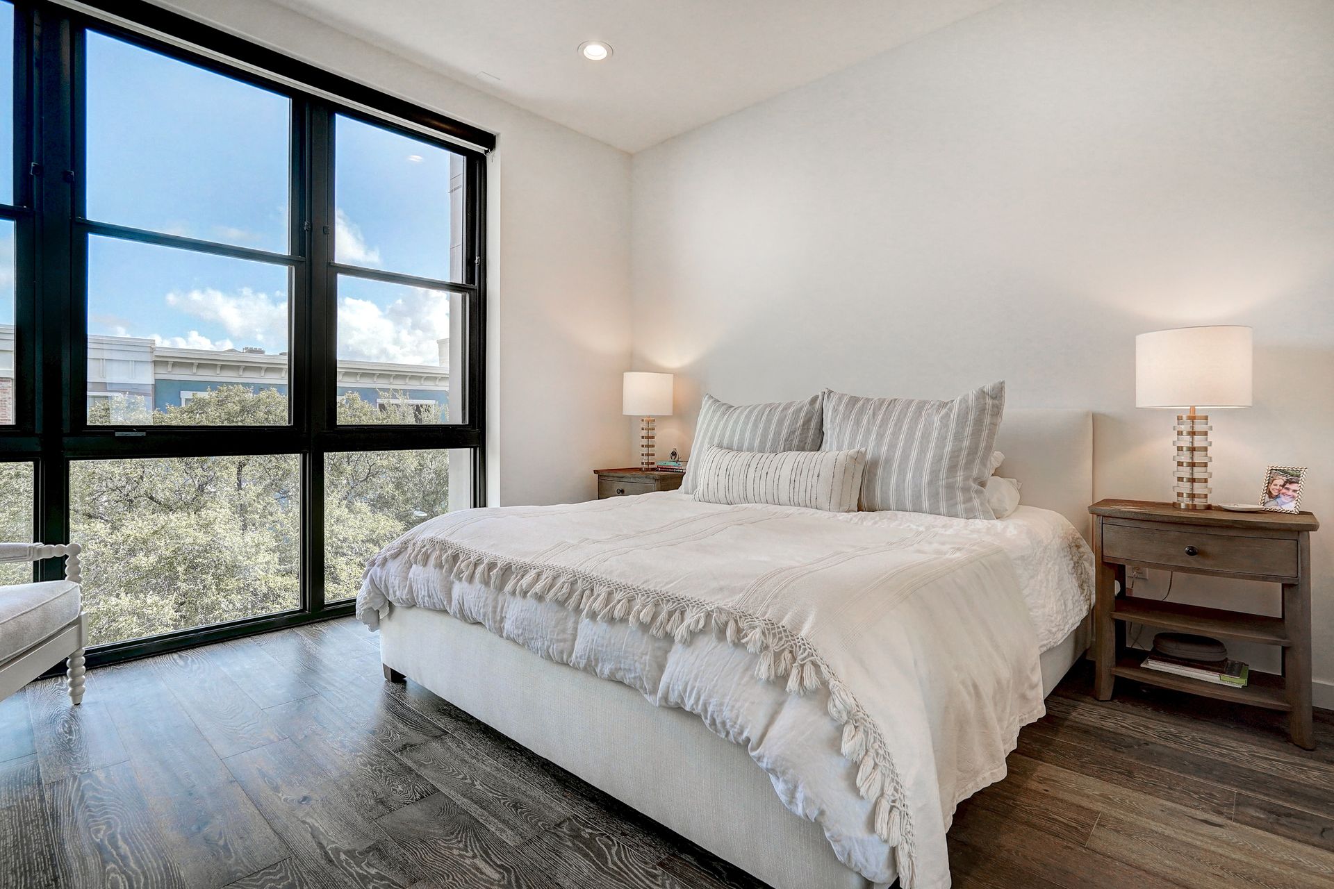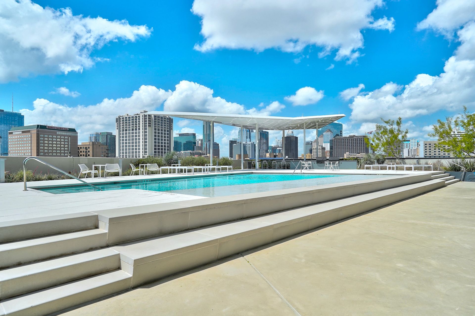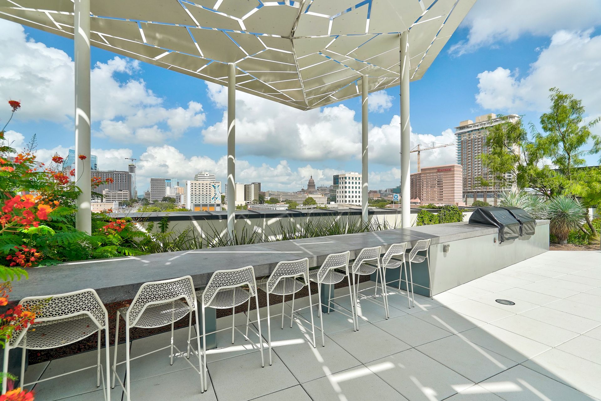 Welcome to this spacious, East Downtown Condo at the Tyndall. This home has exceptional views, amenities & the best floor plan. Admire the stunning 2 bedroom, 2 bathroom corner unit with an office/flex room, open kitchen/living and dining room and superb finishes, including stainless steel appliances, quartz countertops, wood floors and indoor utilities. Located on the Northwest corner of the Tyndall, the bedrooms, kitchen & living/dining rooms have downtown Austin views with floor to ceiling windows to catch a glimpse of the Capital and the city. Each window is shaded with automatic blinds for maximum privacy, including blackout shades in both bedrooms. This is a highly sought after unit with maximum views and a mother-in-law floor plan separating the primary from the secondary bedroom and bonus room. There's a walk-in closet in the primary bedroom adjacent to the spa-like primary bath. The Tyndall community has everything you need for living, working and entertaining in a modern, luxury downtown building. Amenities include 24/7 concierge service, a relaxing, refreshing, pool and sundeck with downtown views, covered grills, 2 dog runs, a business center & conference room, private courtyard, indoor/outdoor clubhouse, 2 parking spaces along with plenty of guest parking.