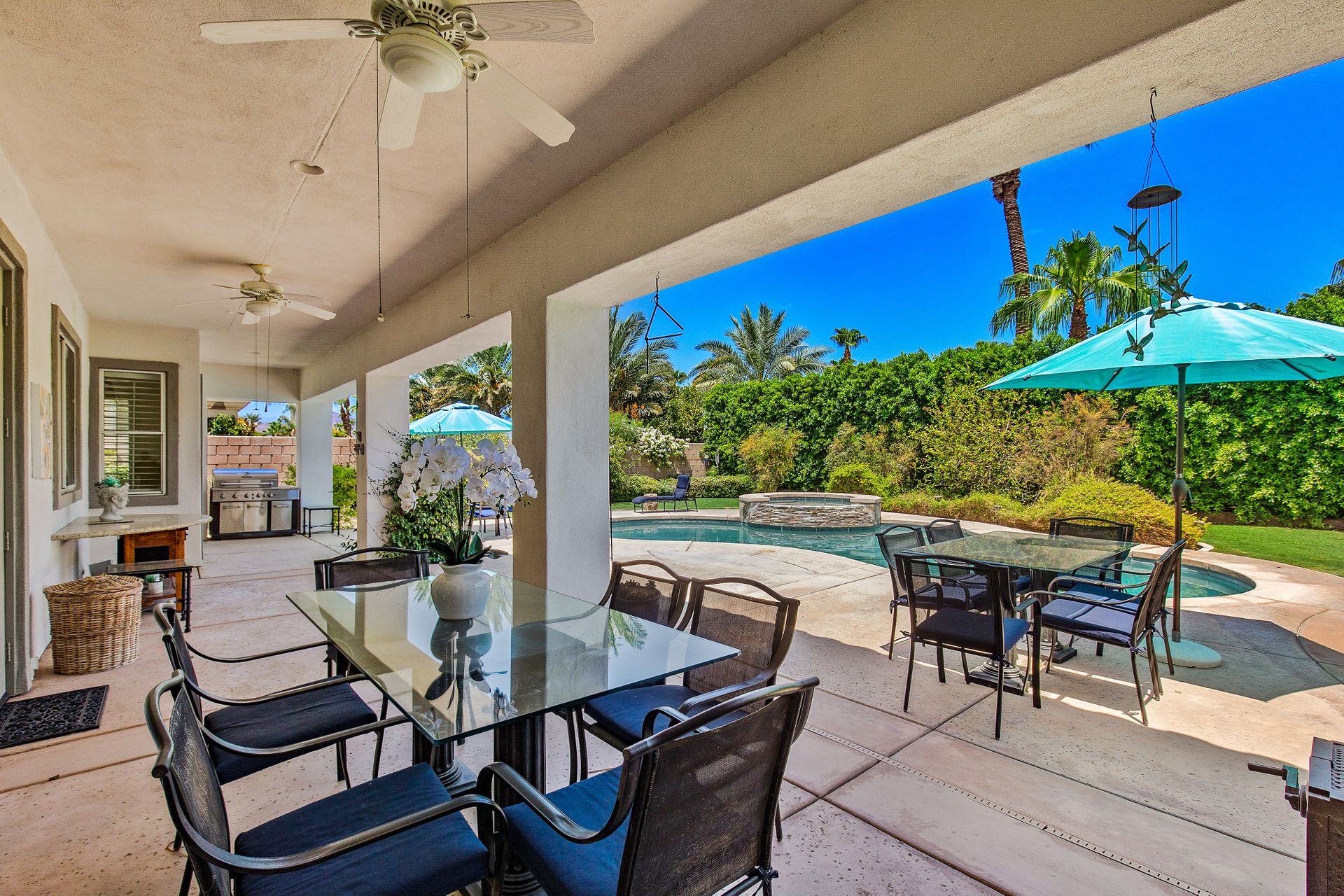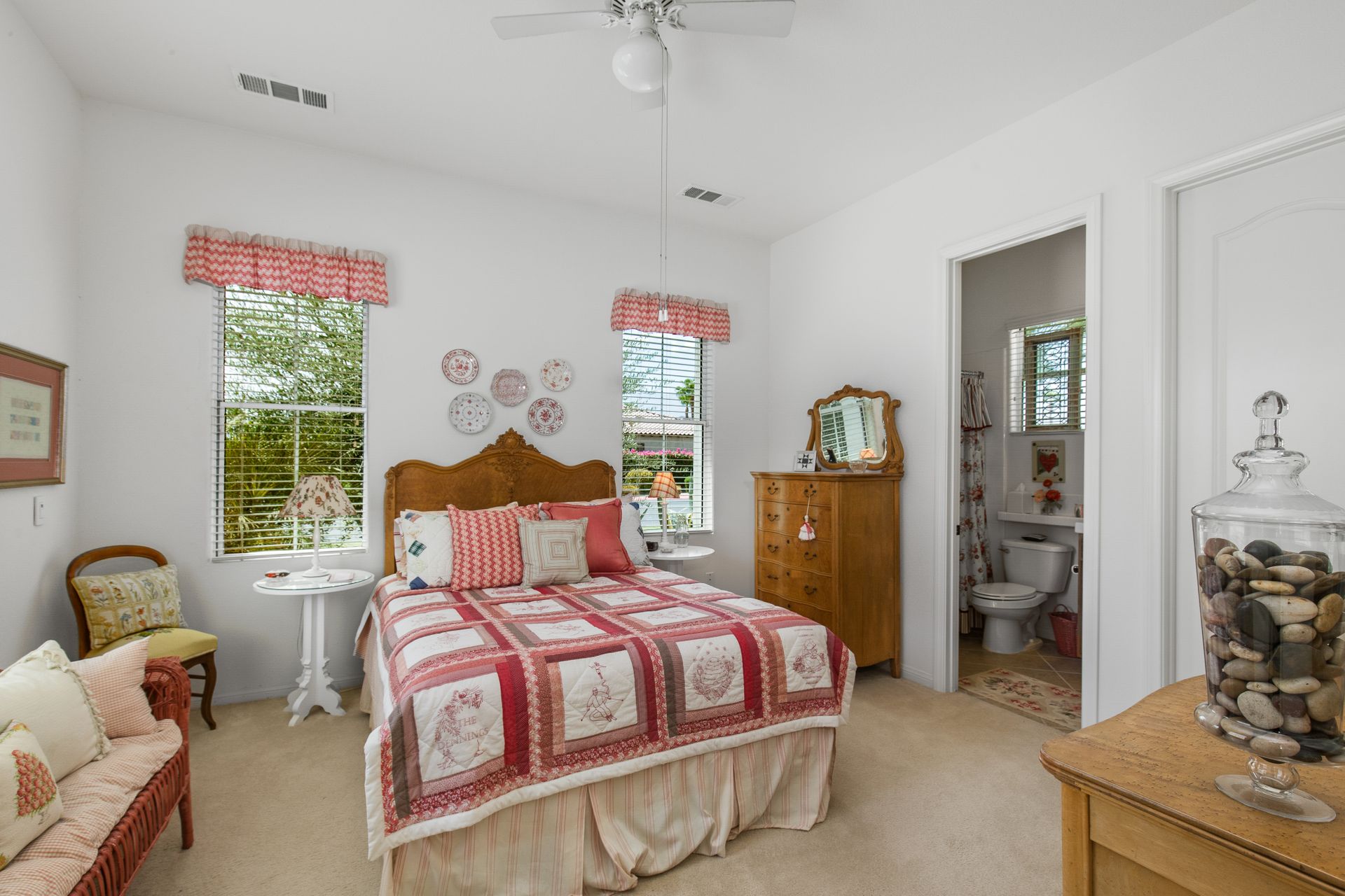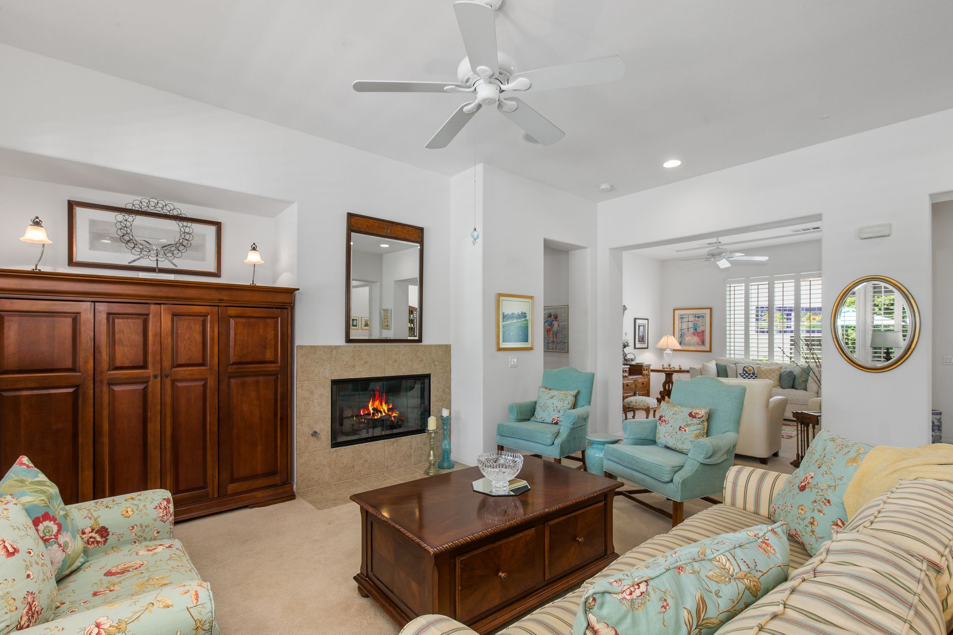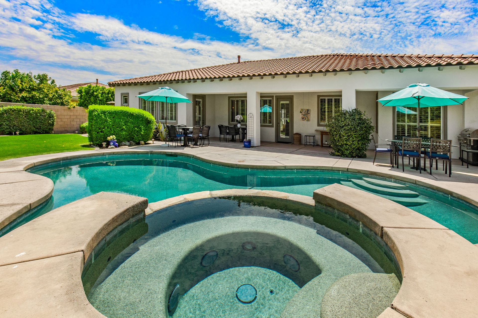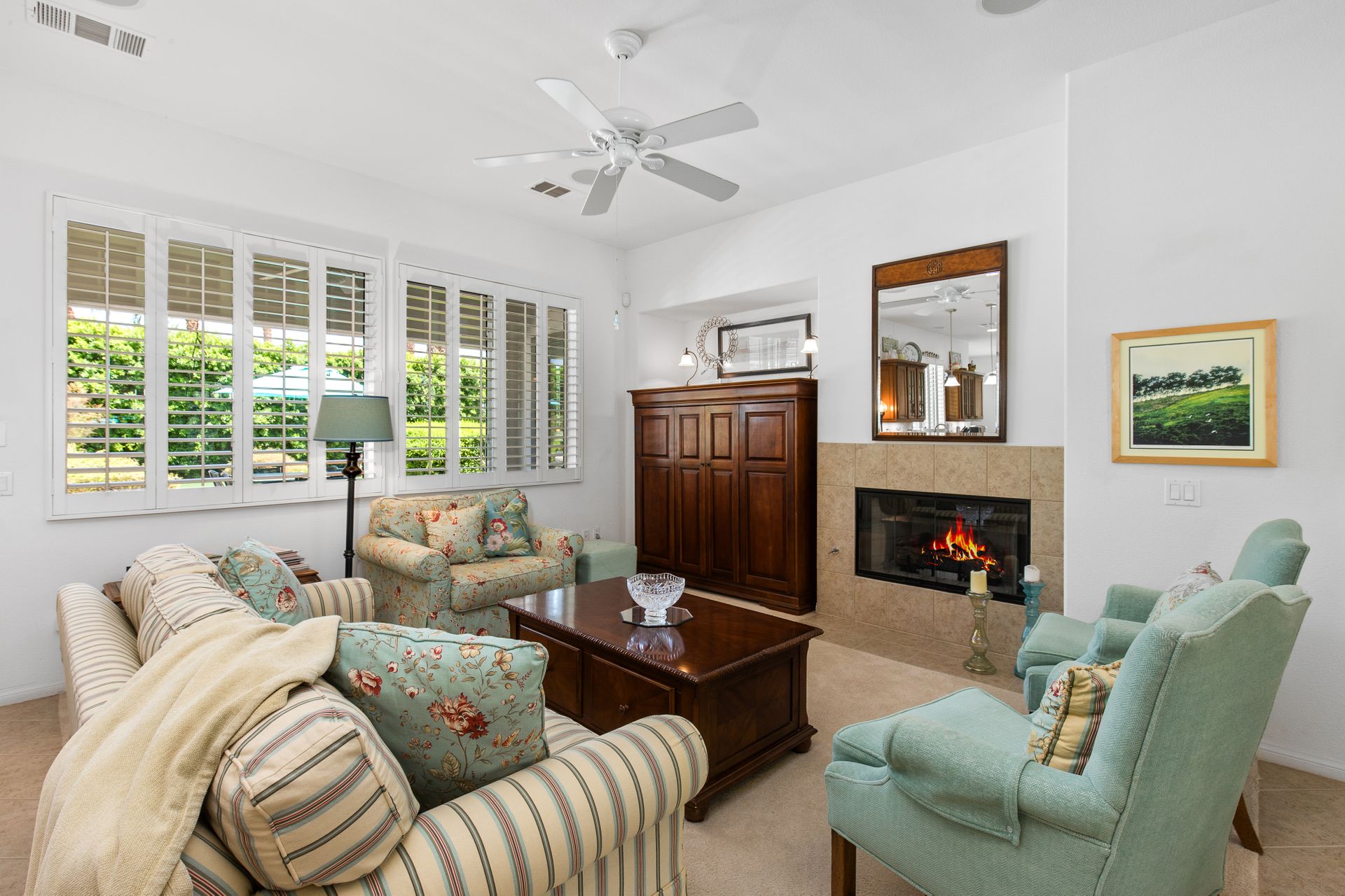 Huge $100,000 Price Improvement! This stunning single-story home sits on a vast lot, offering unparalleled space and comfort for both family living and entertainment. Located approximately 1 mile from the renowned Empire Polo Grounds, home to famous music festivals, this home perfectly combines luxury and convenience. Inside features 5BR including a separate casita, ideal for guests or an in-law suite. Enter through a charming courtyard w/a fireplace, setting the tone for elegance within. Enjoy the spacious layout w/ soaring 10+ft ceilings, Shutters throughout, separate formal living/dining room for refined entertaining. Cozy family room w/ a warm fireplace for family gatherings. Gourmet kitchen equipped w/ custom birch cabinetry, custom hardware, custom pendant lighting, double ovens, built-in microwave, granite countertops w/bar, and a breakfast nook. Large guest BR features Jack-in-Jill BA, plus one BR has its own private BA. Primary suite Features tray ceilings, a private exit to the backyard. Primary BA features travertine countertops and shower, double vanity sinks, huge soaking tub, massive walk-in closet. Walk outside to a tropical Oasis! Sit in your pool/spa and enjoy the mountain views. Also featuring a fully covered patio. Ideal for outdoor dining. Don't miss the opportunity to make this exquisite property your own! Low HOA. The Orchards HOA allows STRs for music festivals and Tennis weekends.