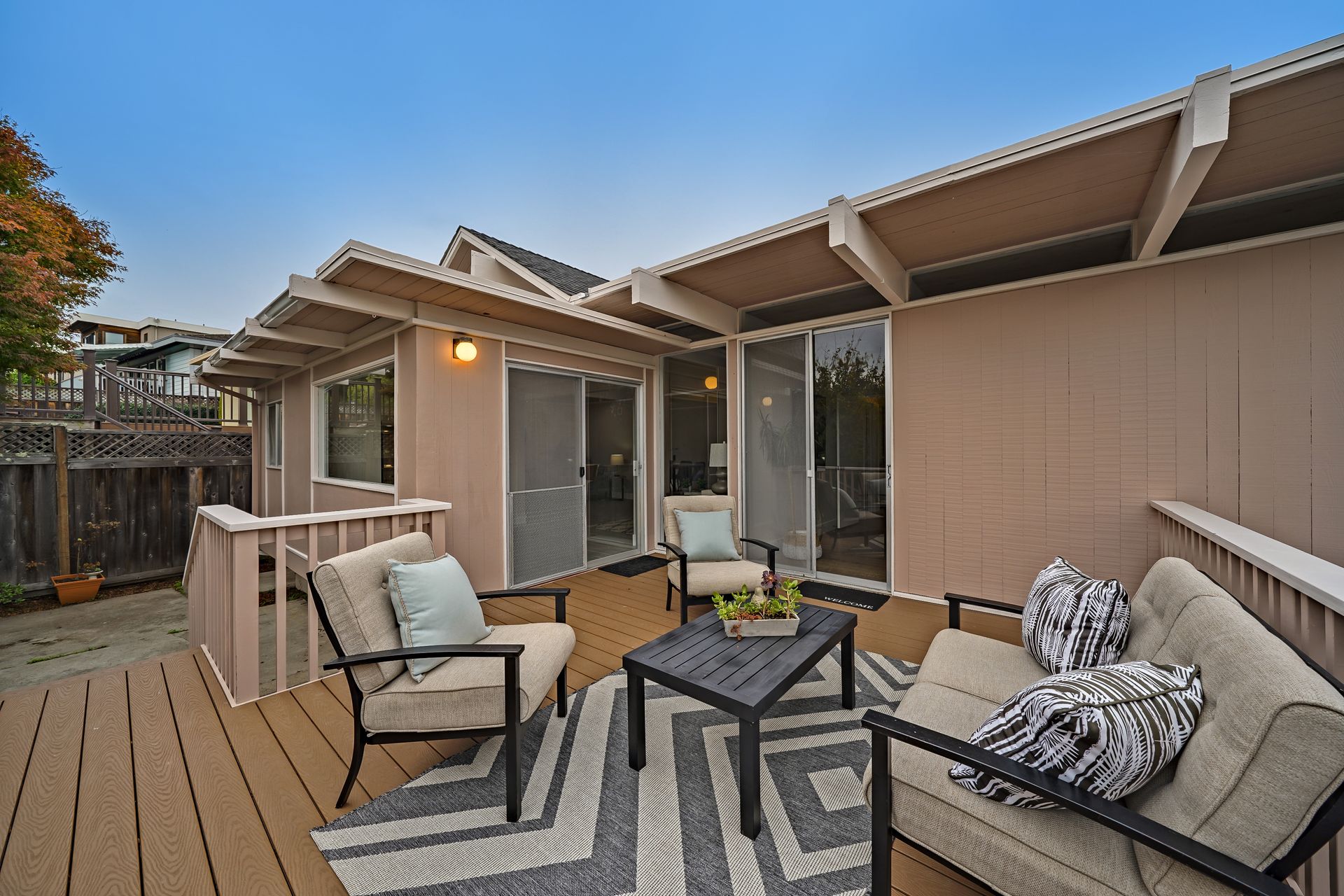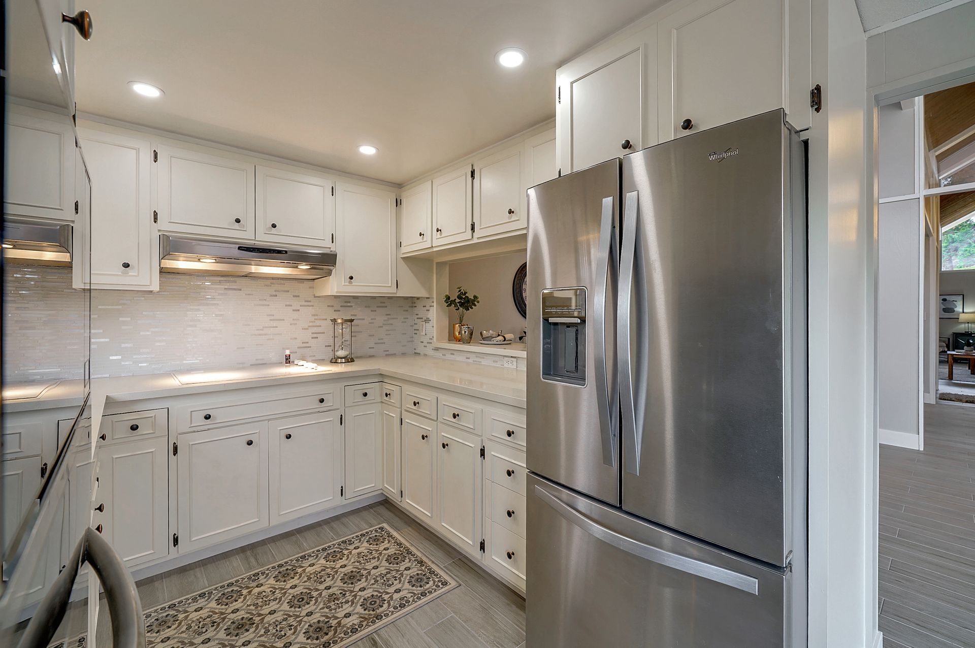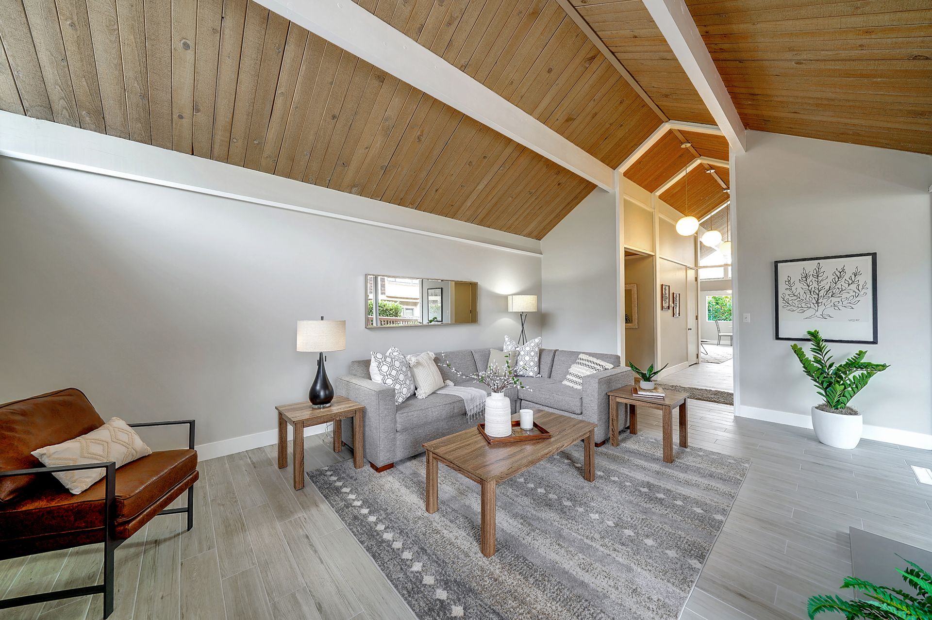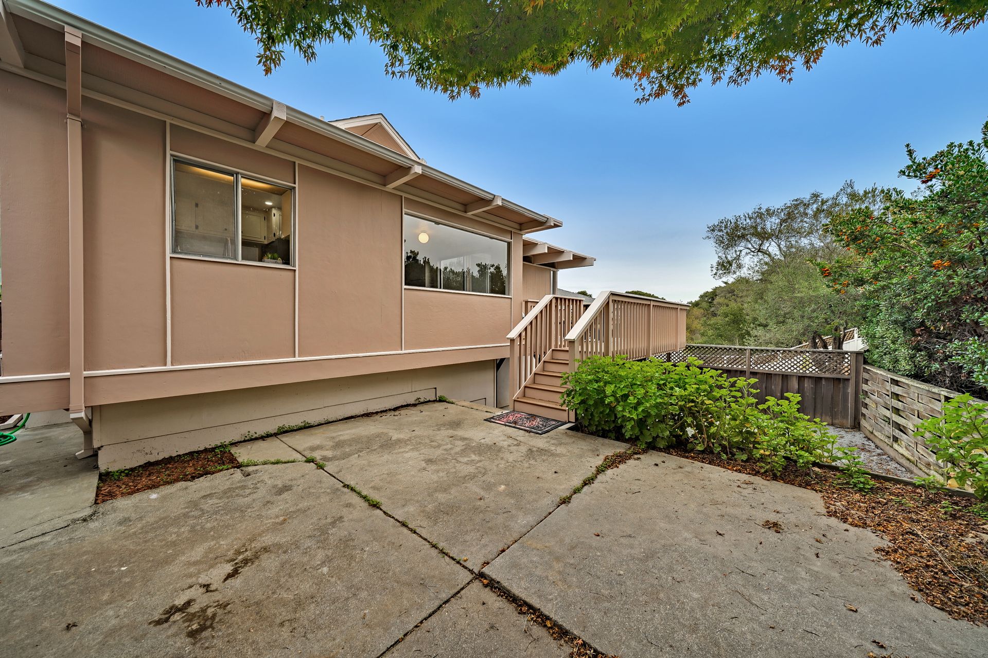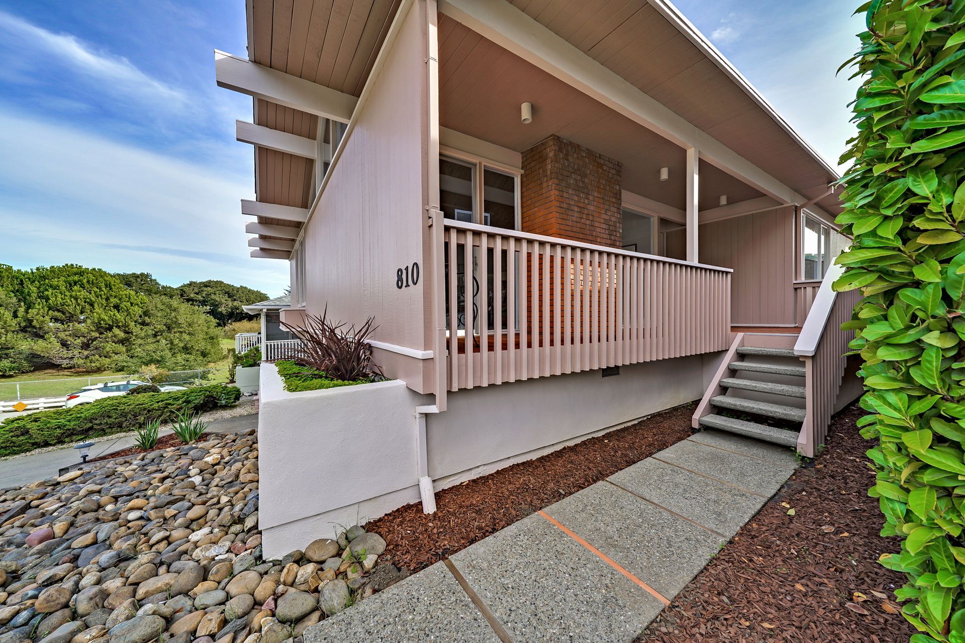 This lovely three bedroom, two bath split-level home is located in the desirable Meadows neighborhood of Millbrae. Features include a tiled formal entryway; a remodeled kitchen with quartz countertops, glass backsplash, stainless steel appliances and a breakfast bar; a breakfast nook with an adjacent, recently rebuilt deck; a formal dining room; a living room with dramatic vaulted beamed ceilings and a fireplace; a family room also with vaulted beamed ceilings; refinished hardwood floors and a freshly painted interior. There is a primary bedroom suite with a walk-in closet and an updated primary bathroom with a quartz topped vanity, dual sinks, a skylight, shower stall and tiled floors. The updated hall bathroom offers a skylight and quartz topped vanity. Additional features include an attached two-car garage with a spacious full basement, attractive landscaped yards and more. Located at the peaceful end of Larkspur Drive, it is nearby the Meadows Swim Club and Regional Park. With approximately 1,950 square feet of livable space, this home sits on an approximately 5,252 square foot lot. www.810Larkspur.com
