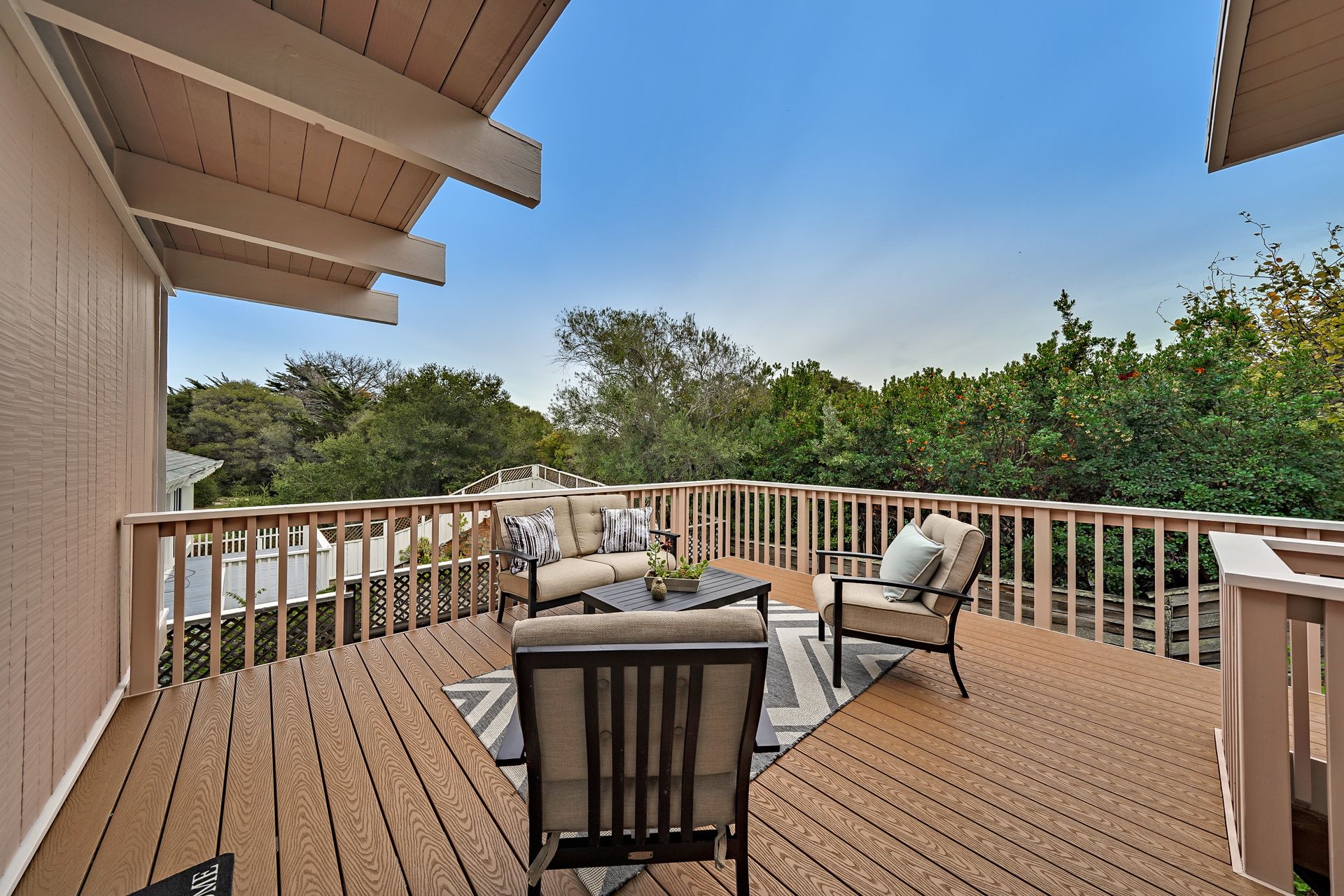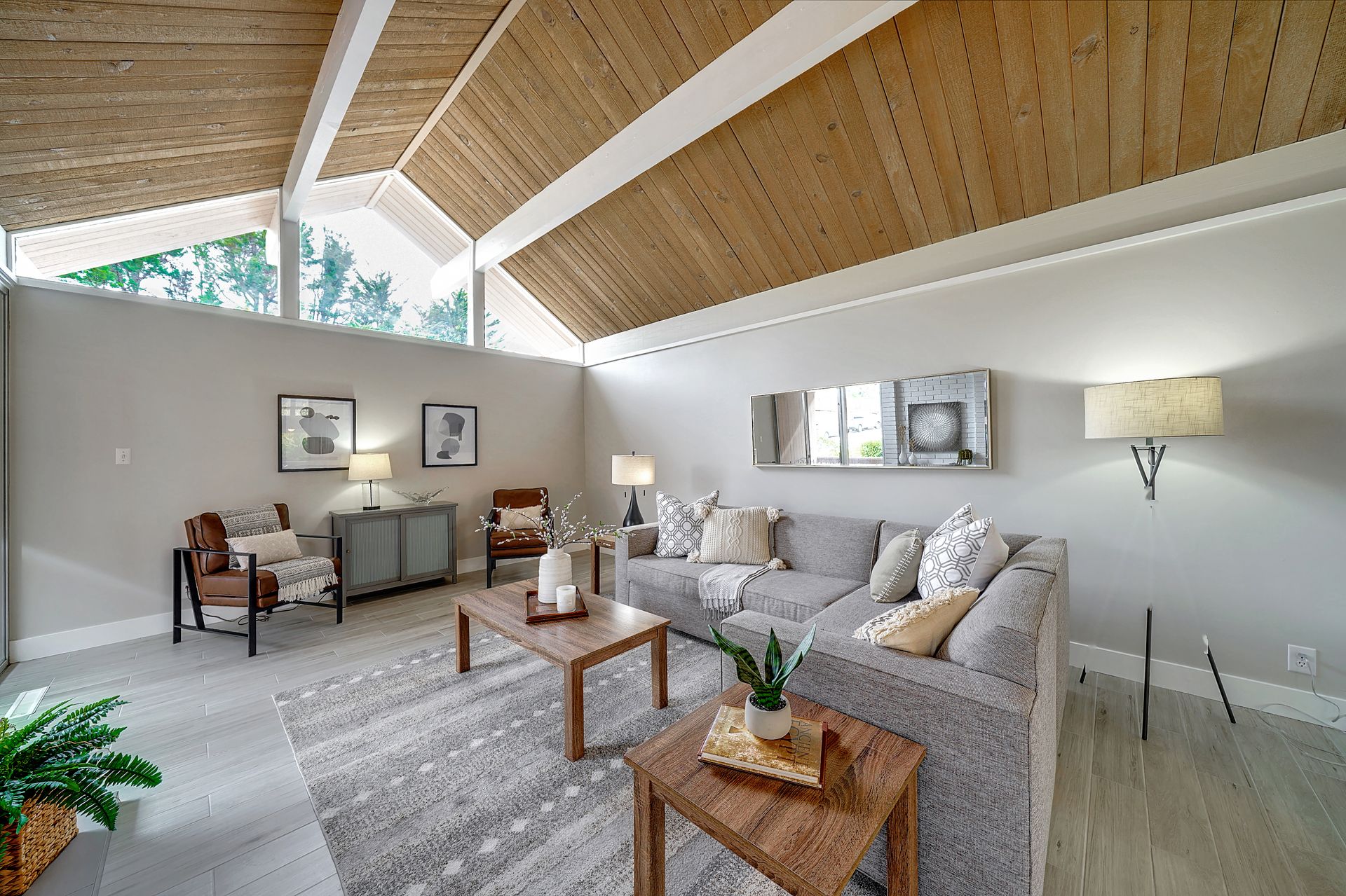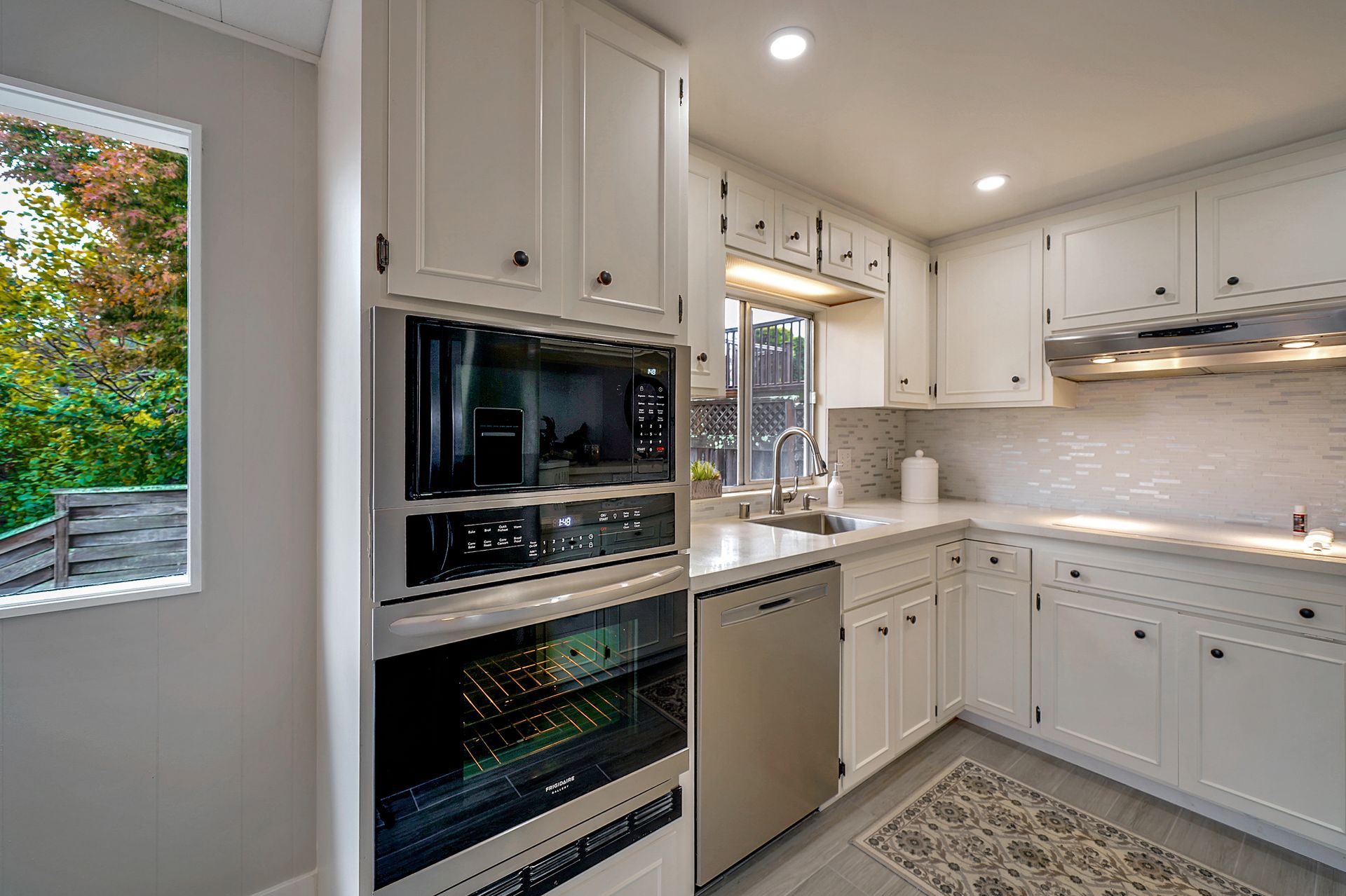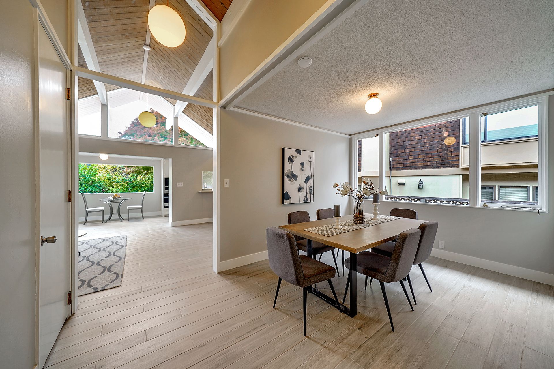 This lovely three bedroom, two bath split-level home is located in the desirable Meadows neighborhood of Millbrae. Features include a tiled formal entryway; a remodeled kitchen with quartz countertops, glass backsplash, stainless steel appliances and a breakfast bar; a breakfast nook with an adjacent, recently rebuilt deck; a formal dining room; a living room with dramatic vaulted beamed ceilings and a fireplace; a family room also with vaulted beamed ceilings; refinished hardwood floors and a freshly painted interior. There is a primary bedroom suite with a walk-in closet and an updated primary bathroom with a quartz topped vanity, dual sinks, a skylight, shower stall and tiled floors. The updated hall bathroom offers a skylight and quartz topped vanity. Additional features include an attached two-car garage with a spacious full basement, attractive landscaped yards and more. Located at the peaceful end of Larkspur Drive, it is nearby the Meadows Swim Club and Regional Park. With approximately 1,950 square feet of livable space, this home sits on an approximately 5,252 square foot lot. www.810Larkspur.com
