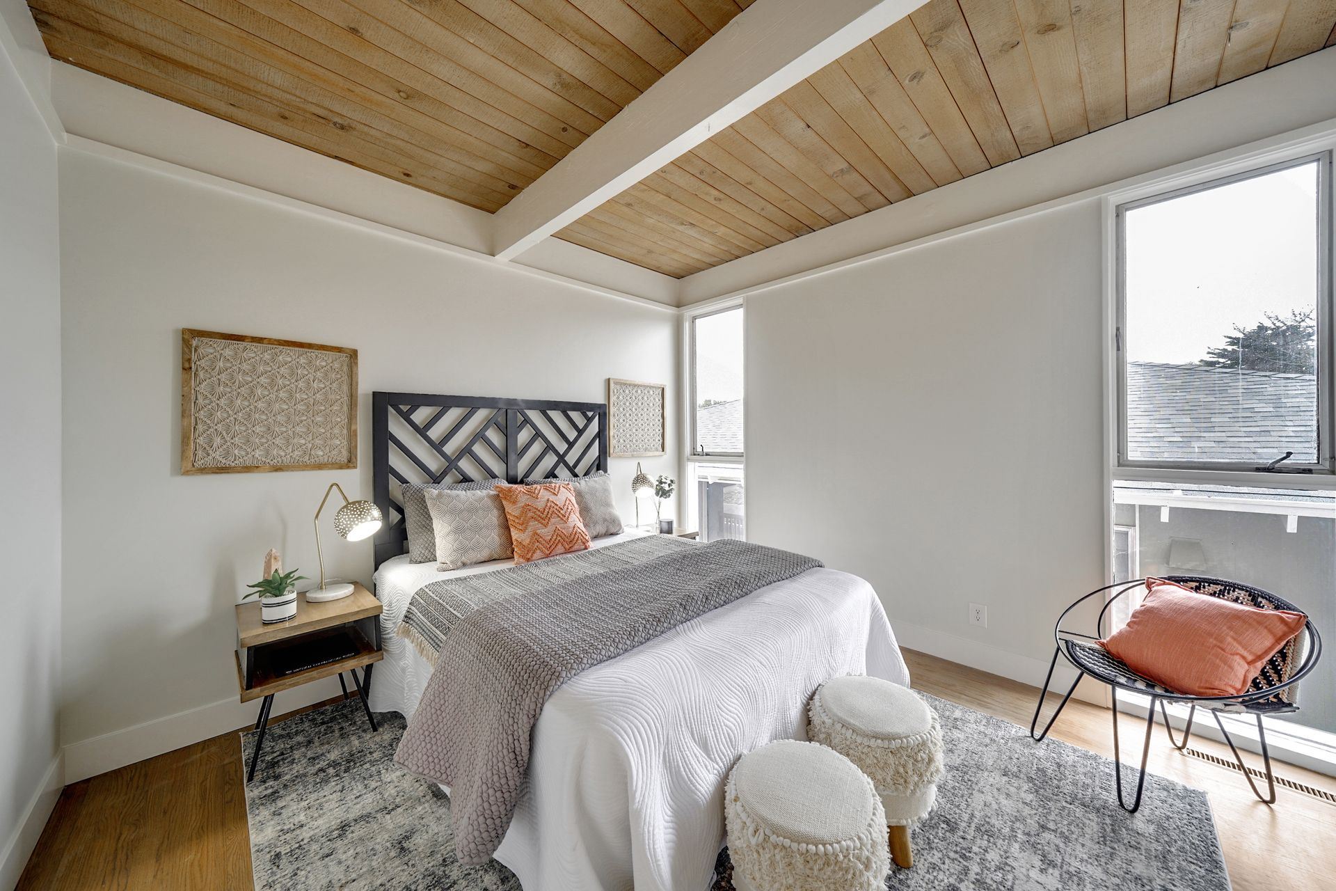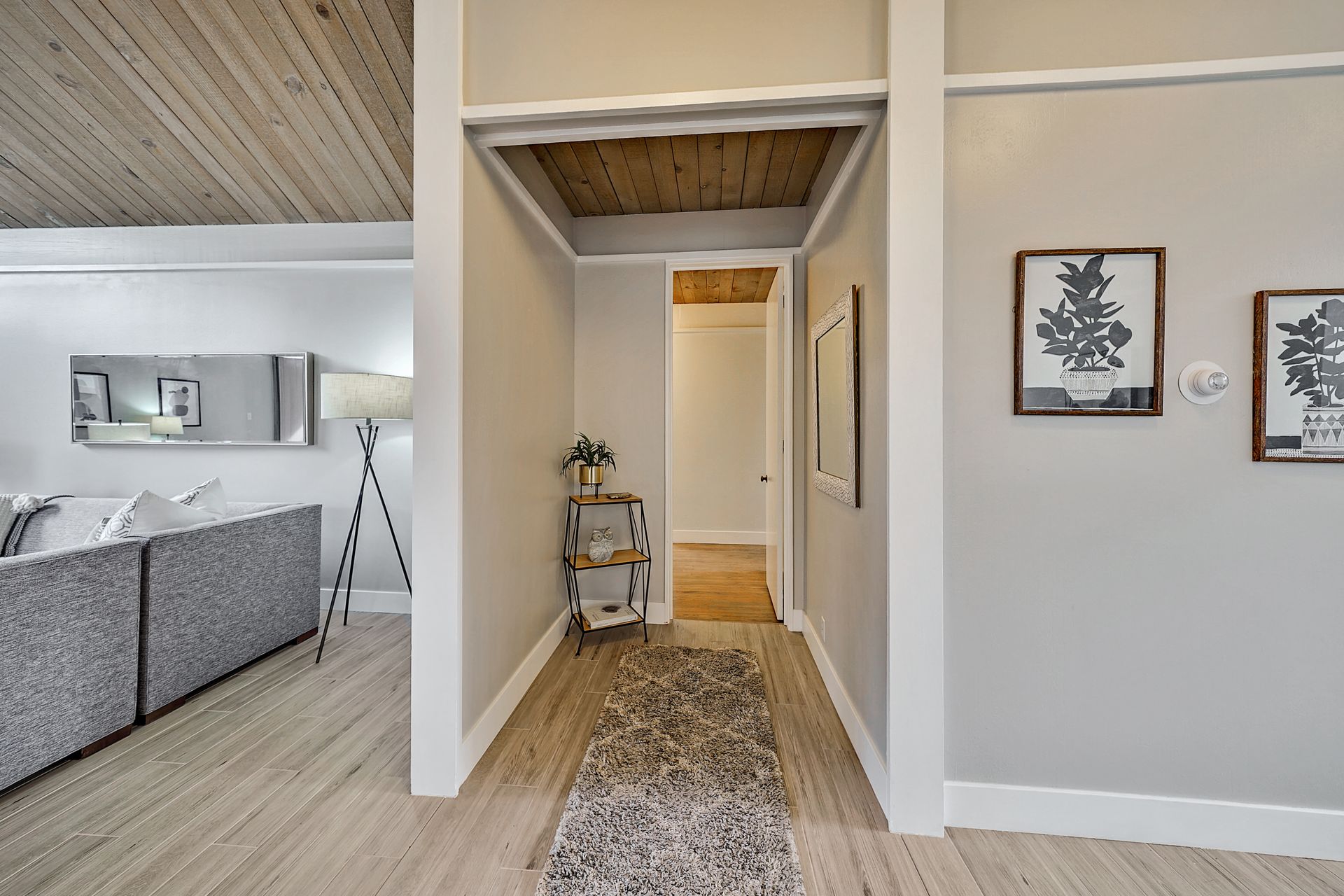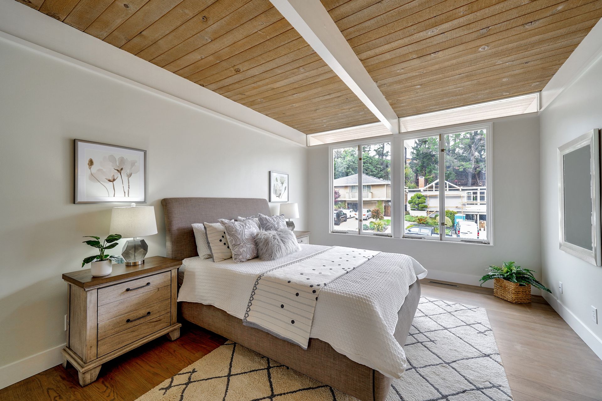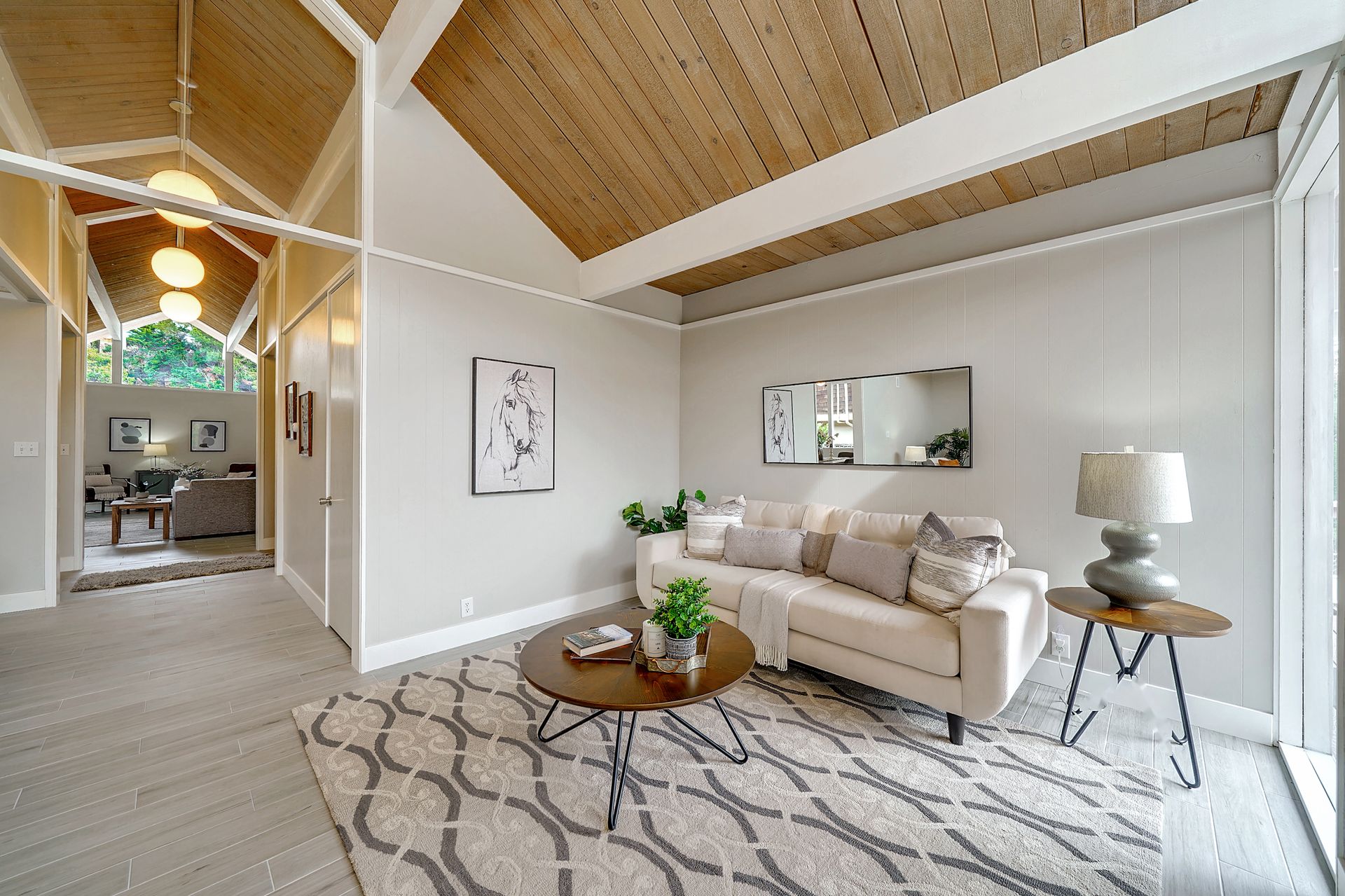 This lovely three bedroom, two bath split-level home is located in the desirable Meadows neighborhood of Millbrae. Features include a tiled formal entryway; a remodeled kitchen with quartz countertops, glass backsplash, stainless steel appliances and a breakfast bar; a breakfast nook with an adjacent, recently rebuilt deck; a formal dining room; a living room with dramatic vaulted beamed ceilings and a fireplace; a family room also with vaulted beamed ceilings; refinished hardwood floors and a freshly painted interior. There is a primary bedroom suite with a walk-in closet and an updated primary bathroom with a quartz topped vanity, dual sinks, a skylight, shower stall and tiled floors. The updated hall bathroom offers a skylight and quartz topped vanity. Additional features include an attached two-car garage with a spacious full basement, attractive landscaped yards and more. Located at the peaceful end of Larkspur Drive, it is nearby the Meadows Swim Club and Regional Park. With approximately 1,950 square feet of livable space, this home sits on an approximately 5,252 square foot lot. www.810Larkspur.com