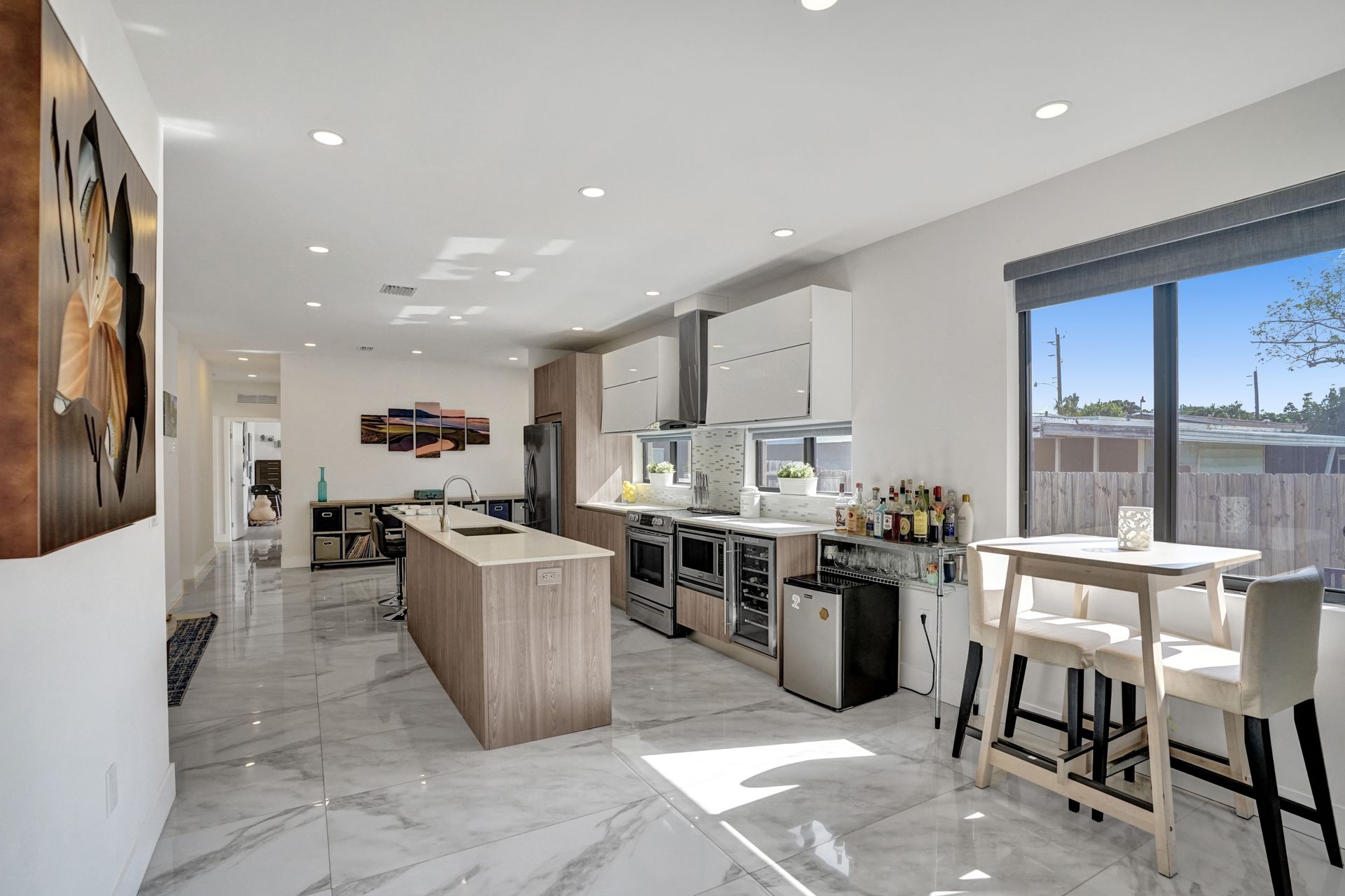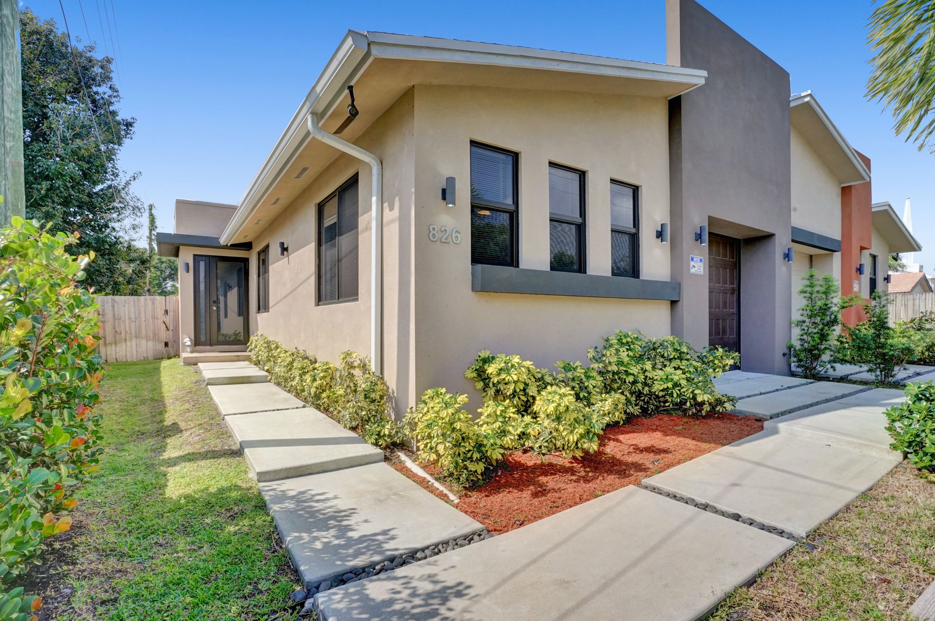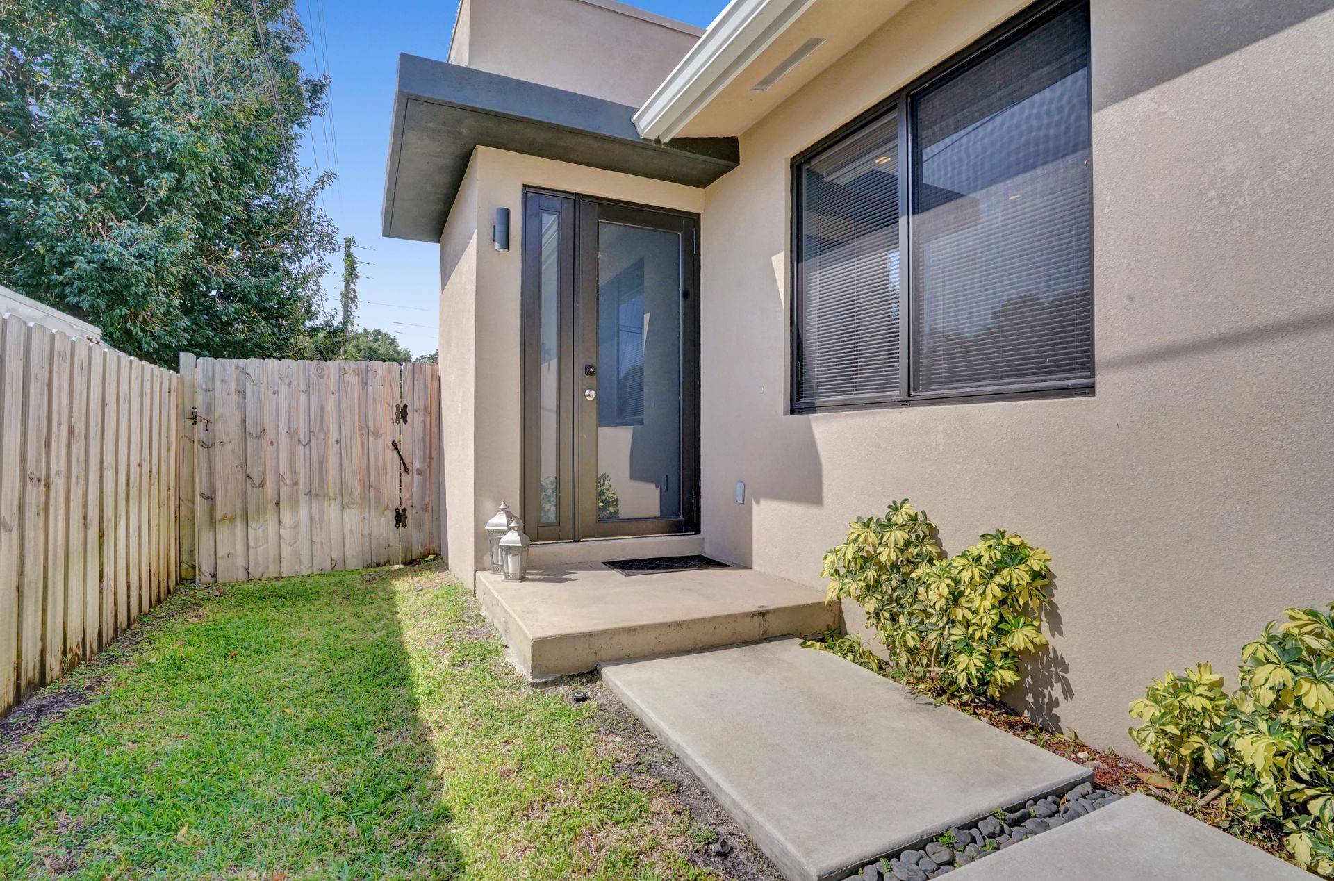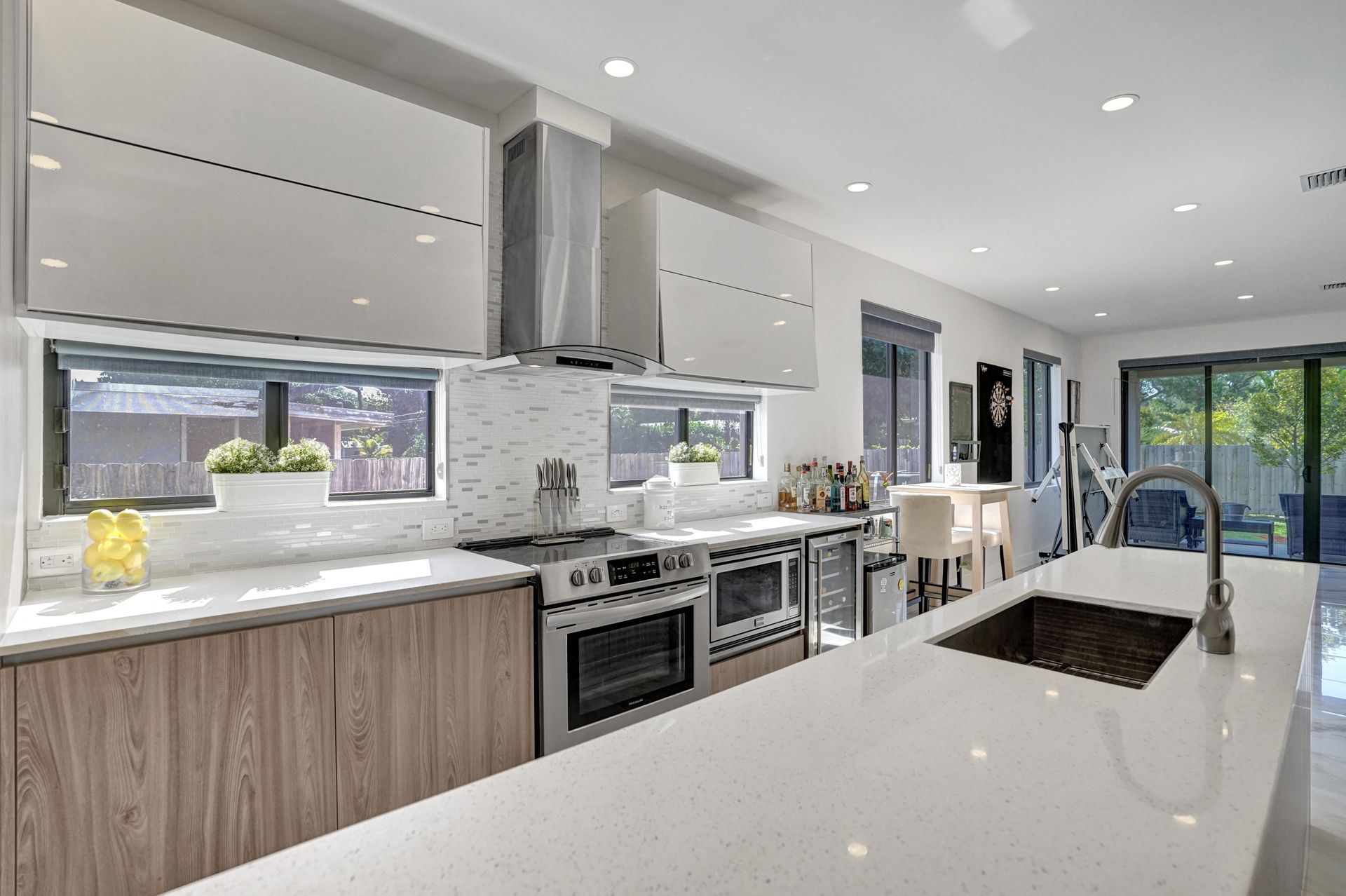 Some of the home's highlights include 10' ceilings, 24x48 porcelain tile in main living area, plank tile in bedrooms, LED lighting, SS appliances, wine cooler, counter bar, walk-in closets and laundry room. European custom closets throughout along with quartz countertops. Impact windows and doors along with one-car garage. The lot is completely fenced-in with plenty of privacy. There's room for pets, a pool or playground. Covered patio to grill & chill.
