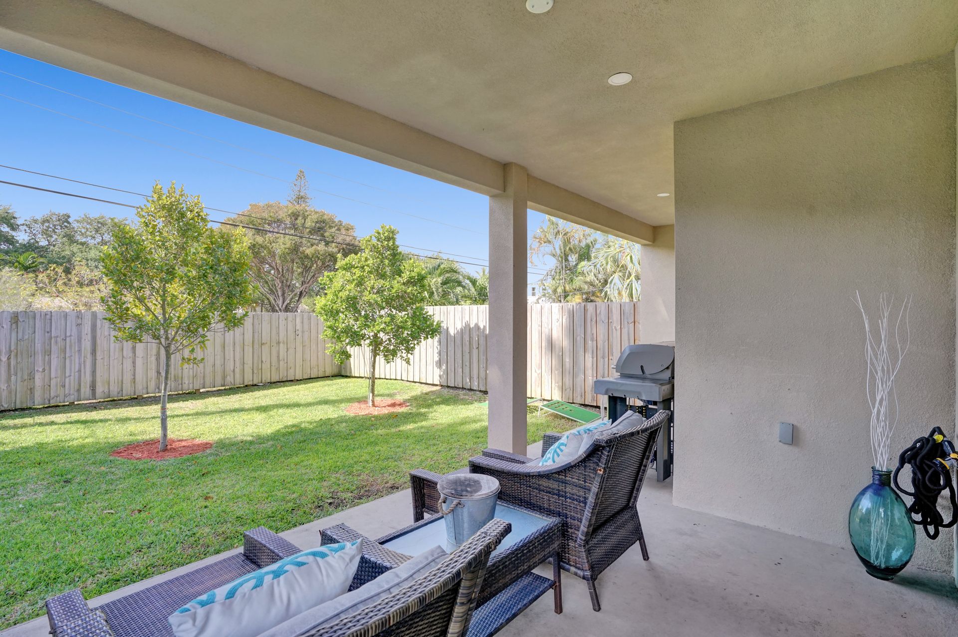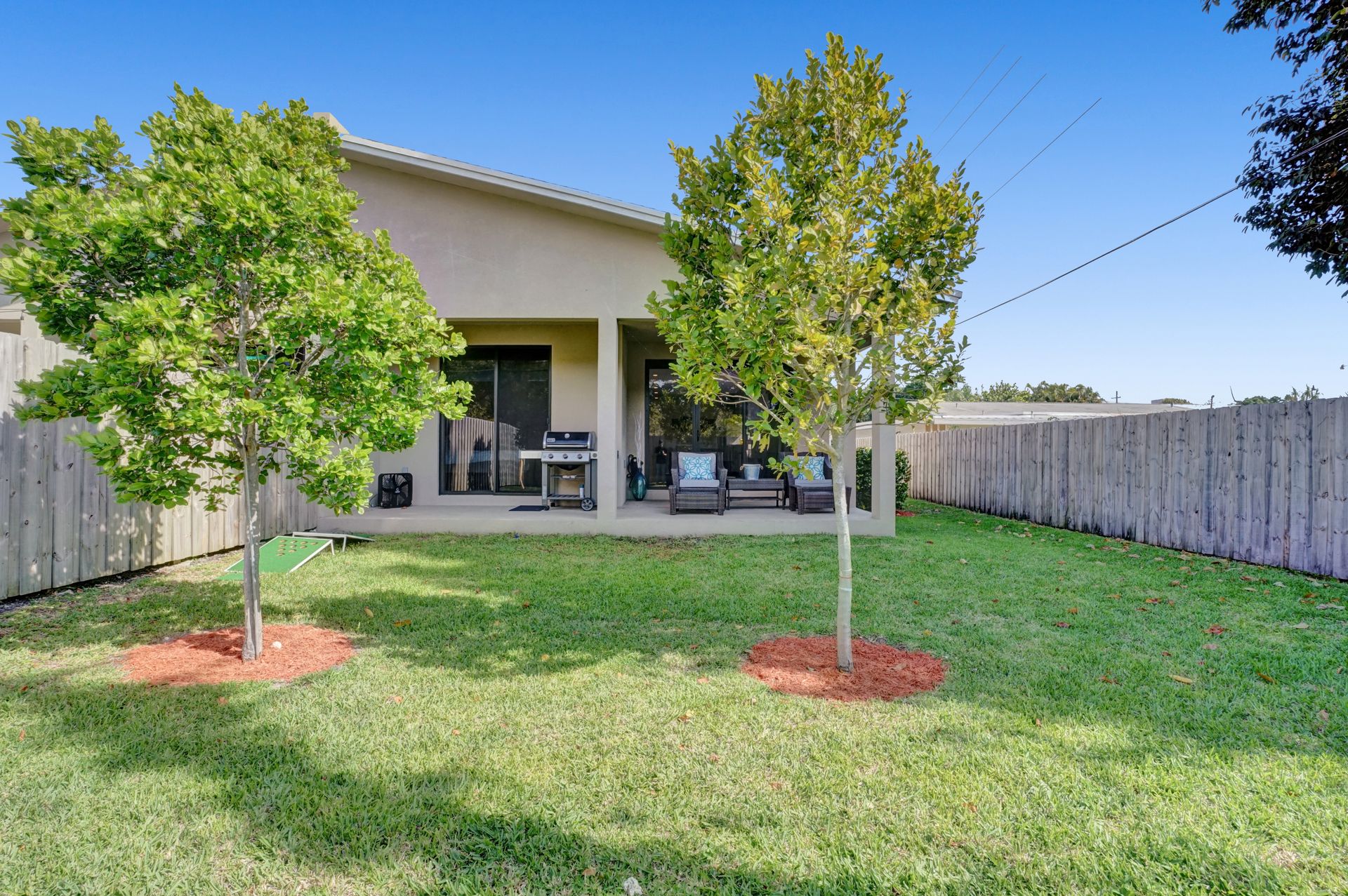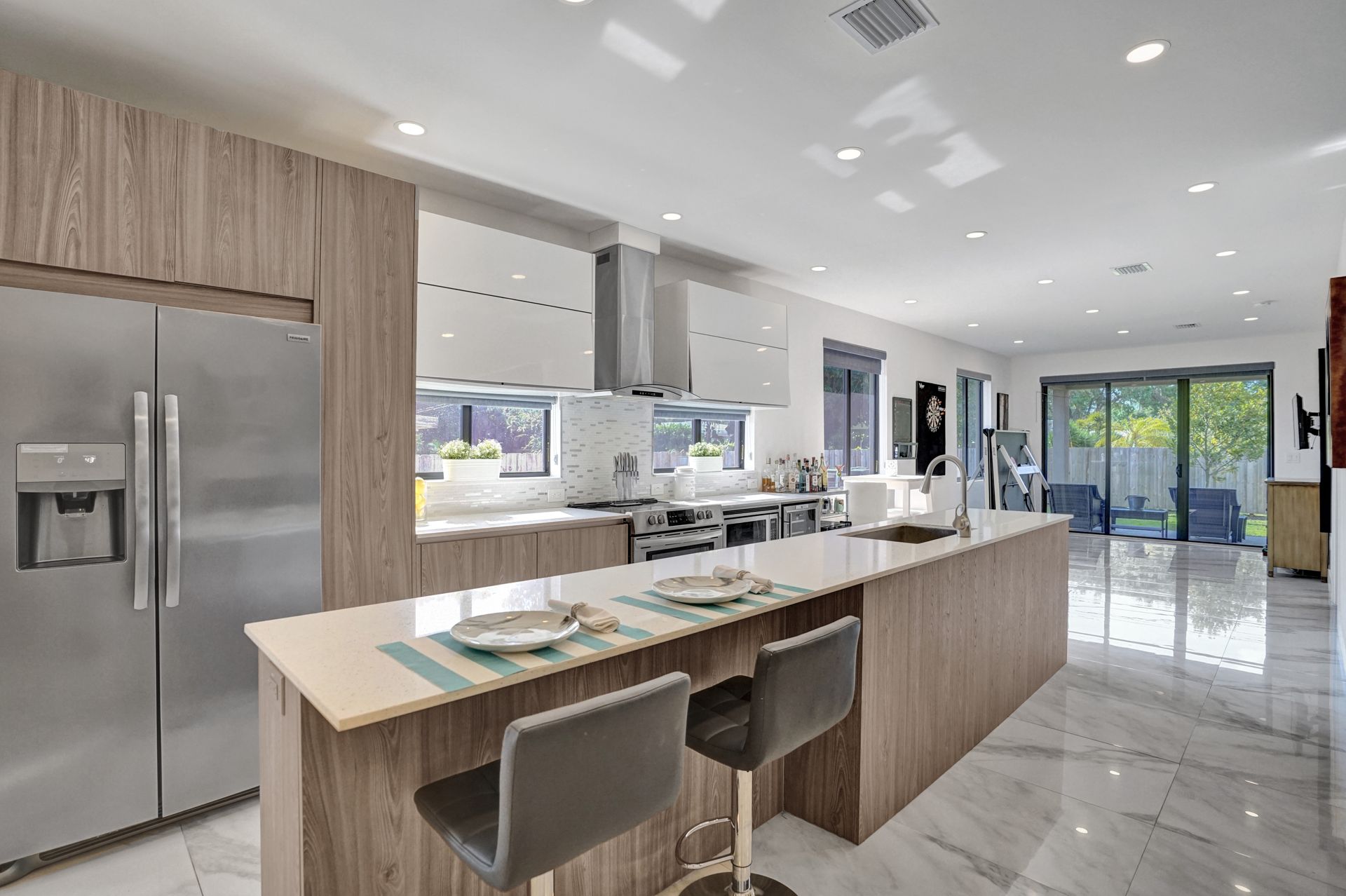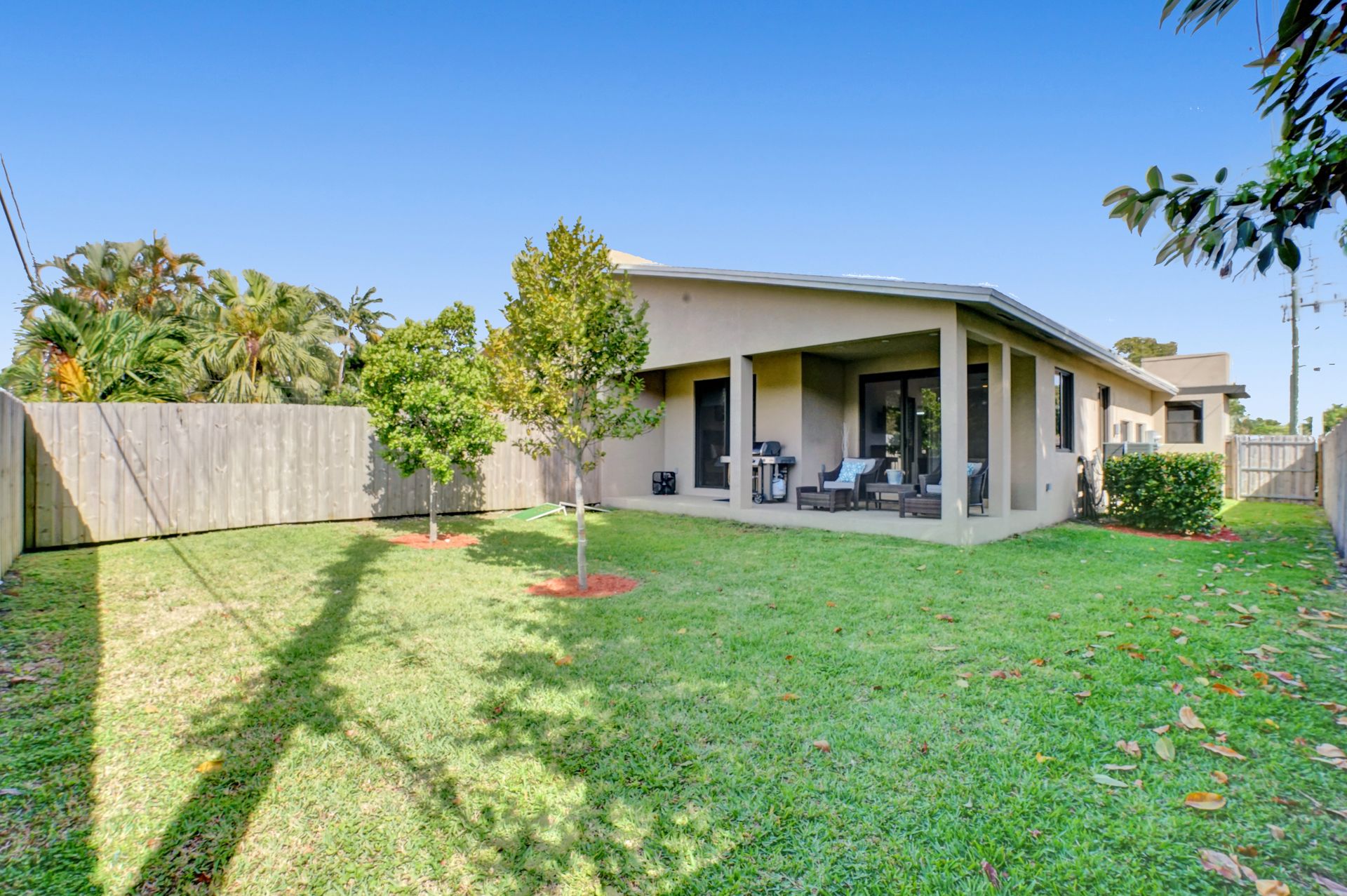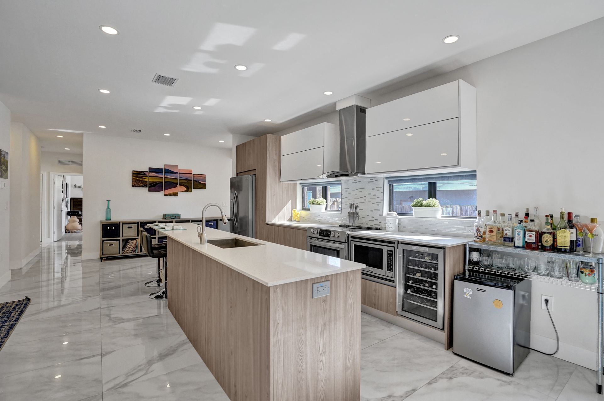 Some of the home's highlights include 10' ceilings, 24x48 porcelain tile in main living area, plank tile in bedrooms, LED lighting, SS appliances, wine cooler, counter bar, walk-in closets and laundry room. European custom closets throughout along with quartz countertops. Impact windows and doors along with one-car garage. The lot is completely fenced-in with plenty of privacy. There's room for pets, a pool or playground. Covered patio to grill & chill.
