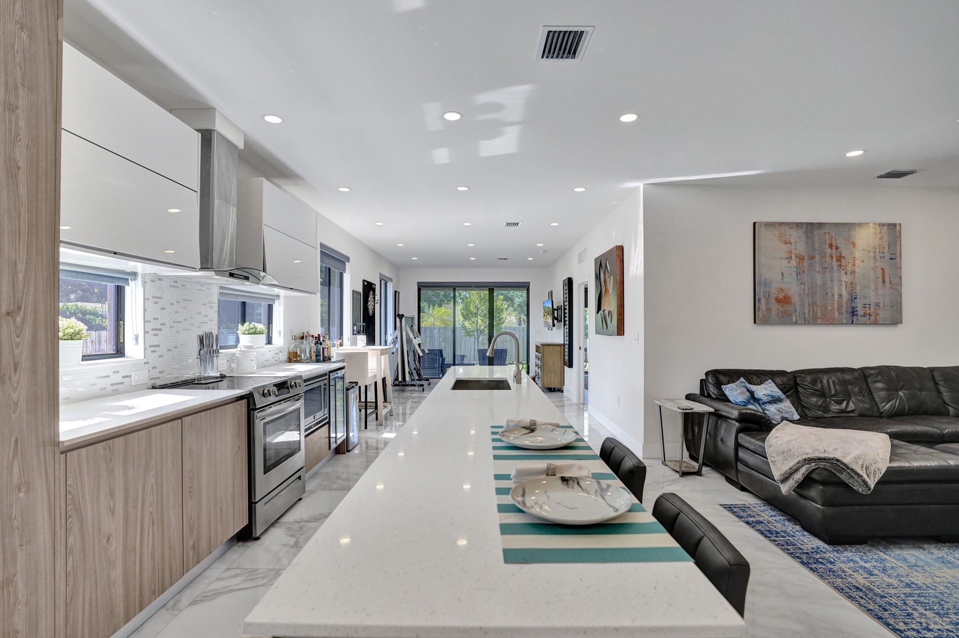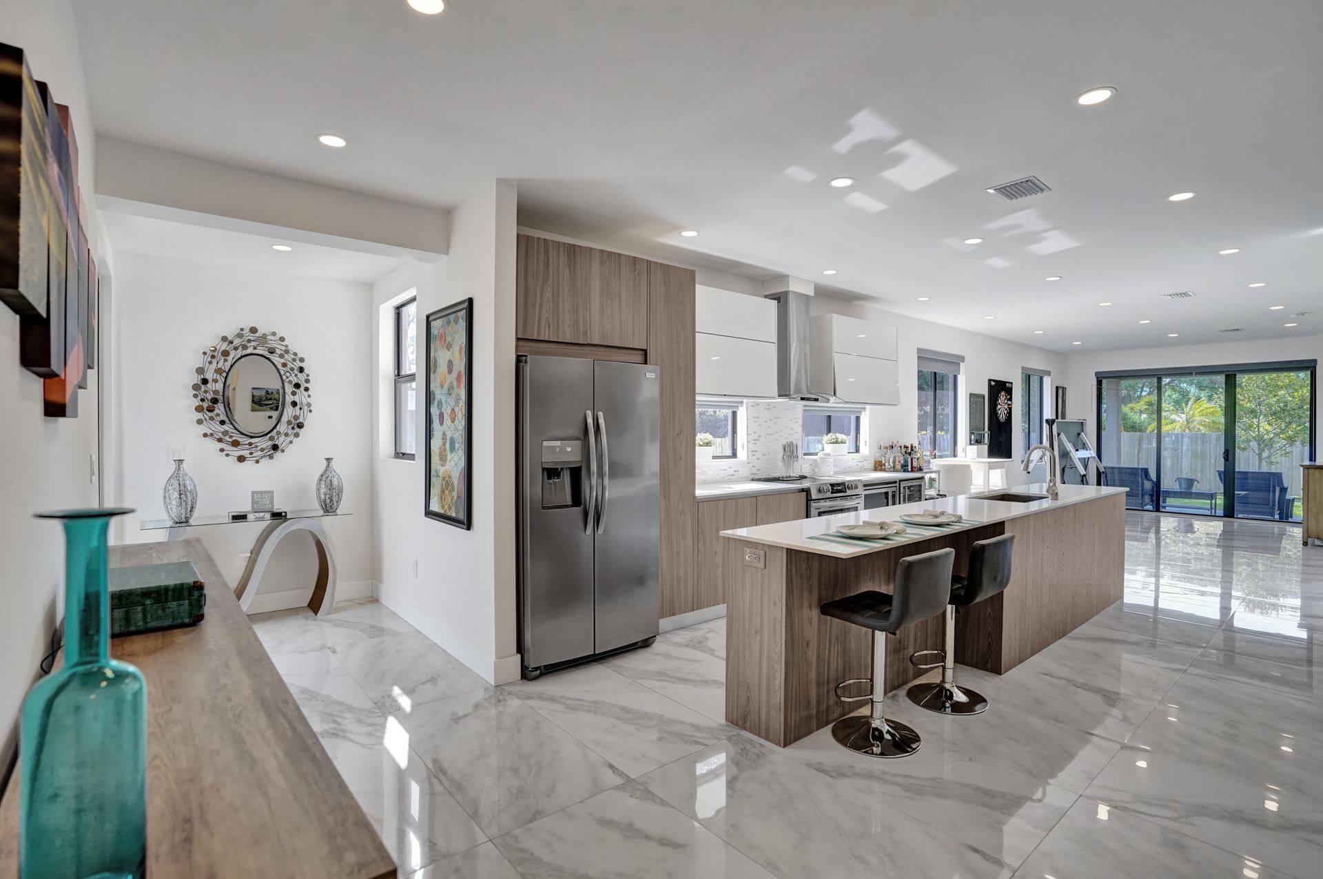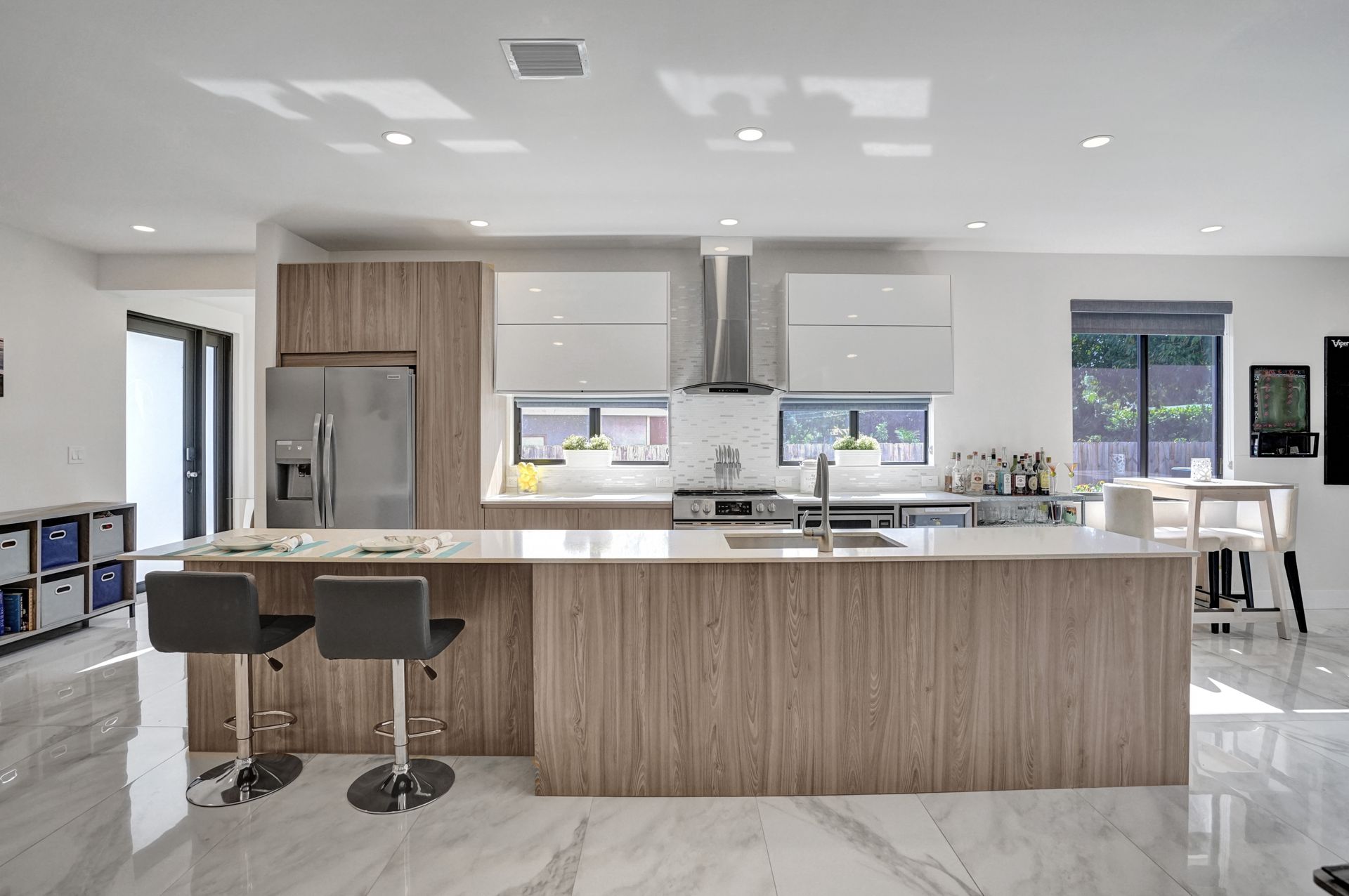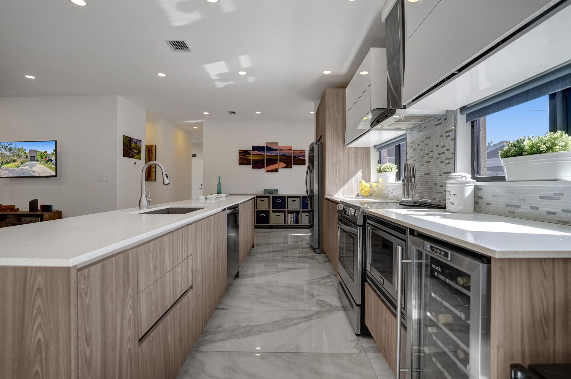 Some of the home's highlights include 10' ceilings, 24x48 porcelain tile in main living area, plank tile in bedrooms, LED lighting, SS appliances, wine cooler, counter bar, walk-in closets and laundry room. European custom closets throughout along with quartz countertops. Impact windows and doors along with one-car garage. The lot is completely fenced-in with plenty of privacy. There's room for pets, a pool or playground. Covered patio to grill & chill.