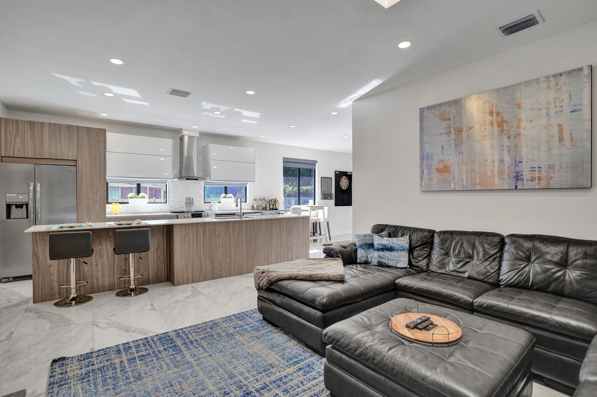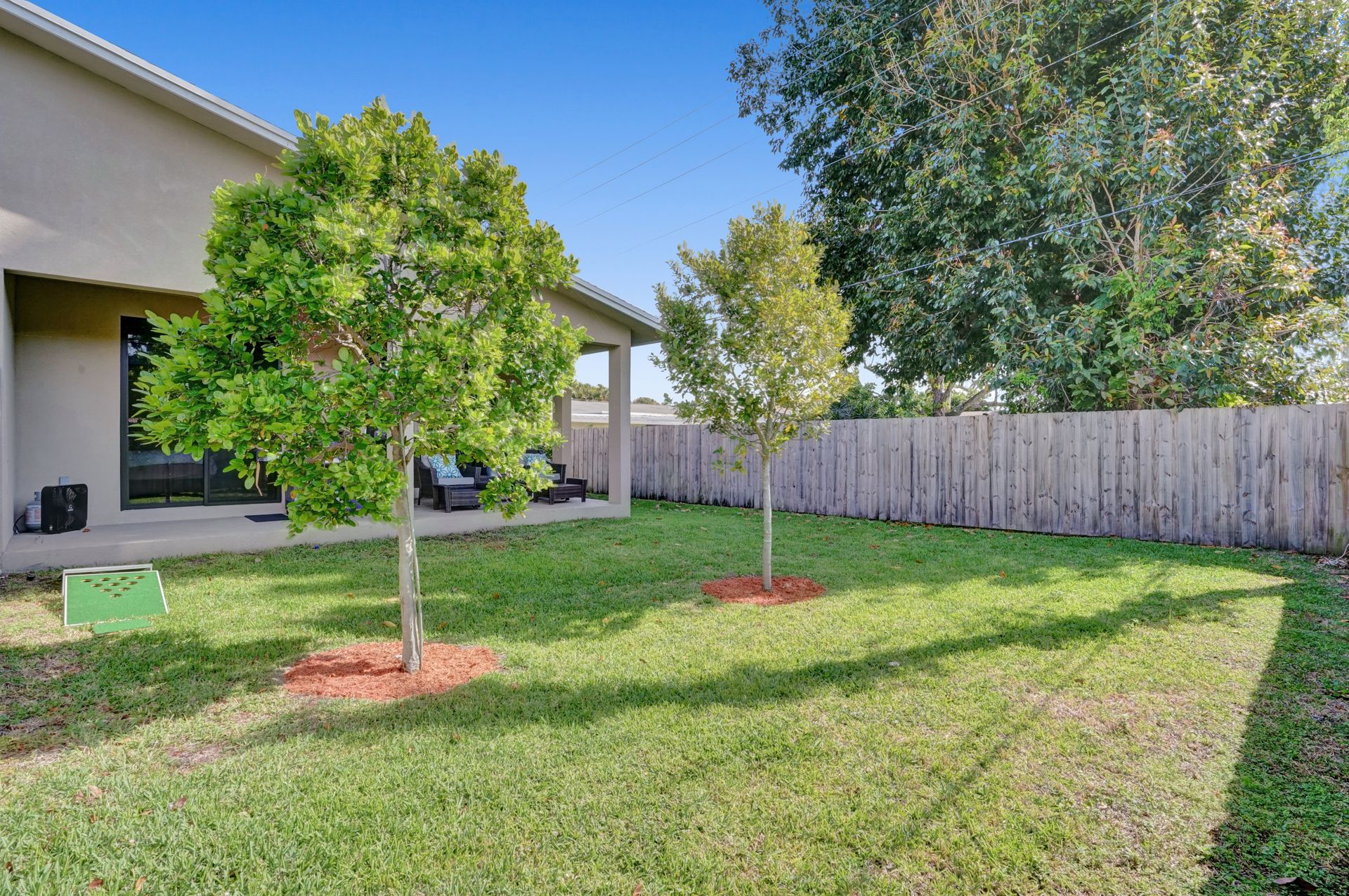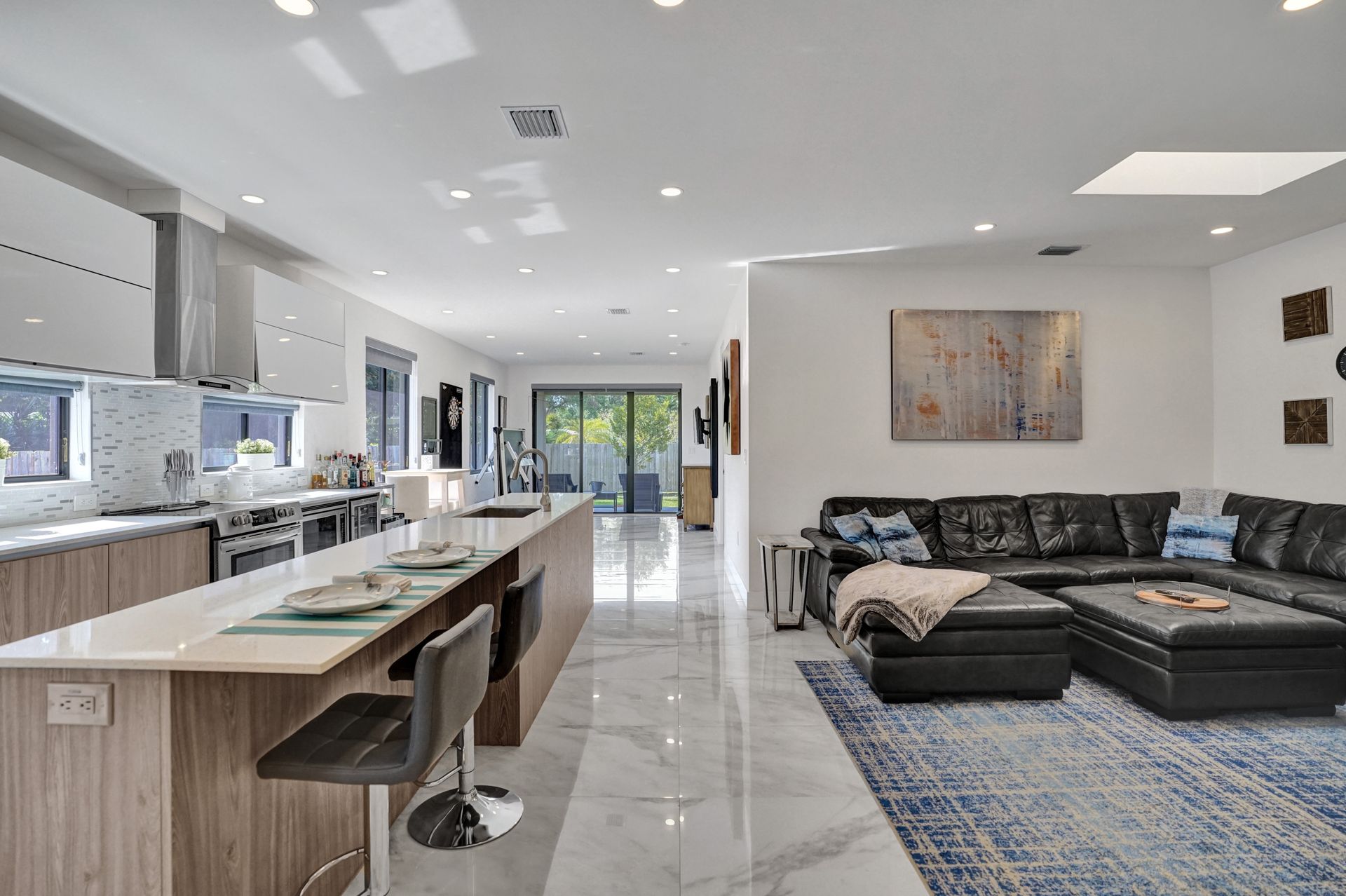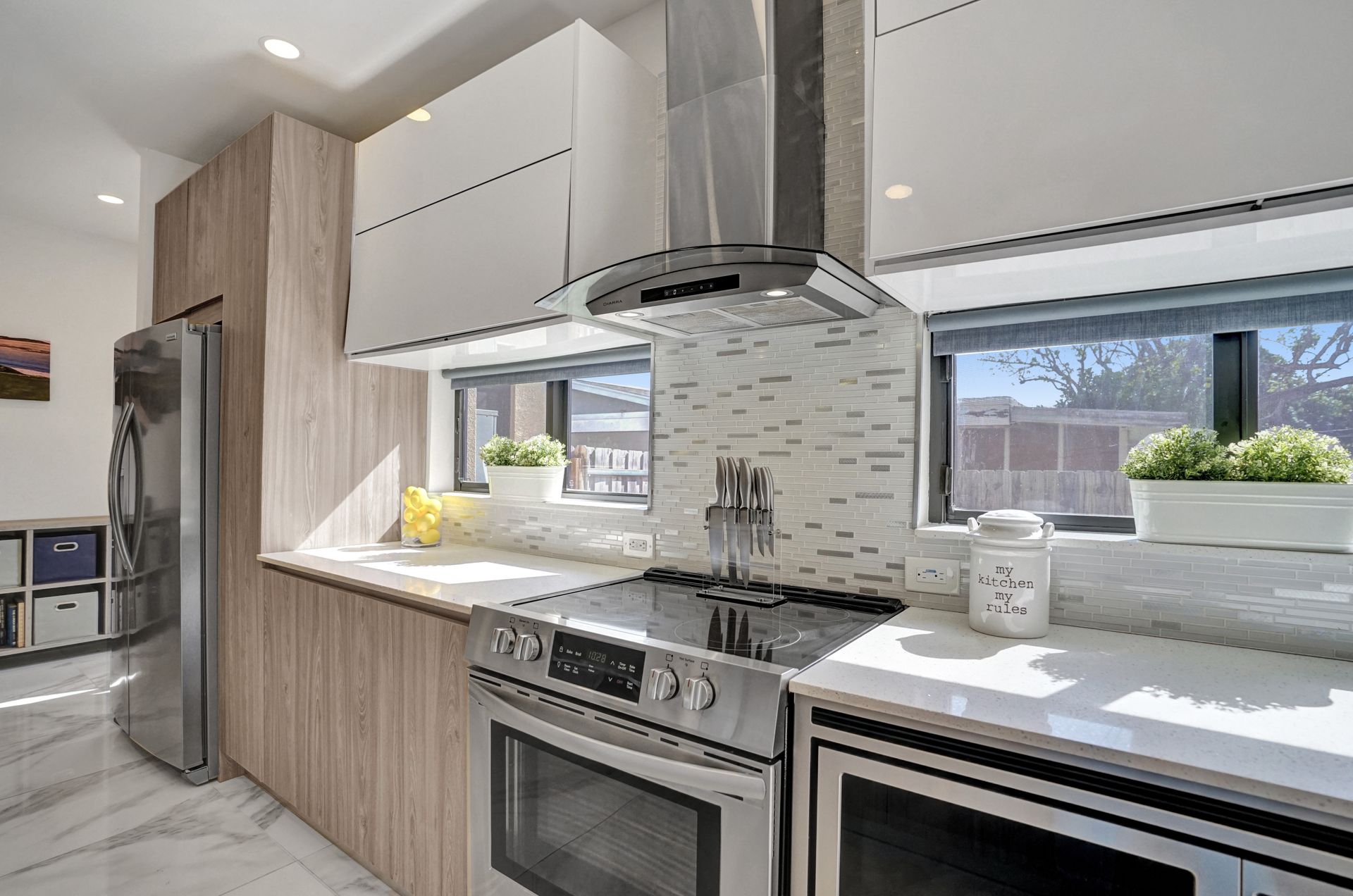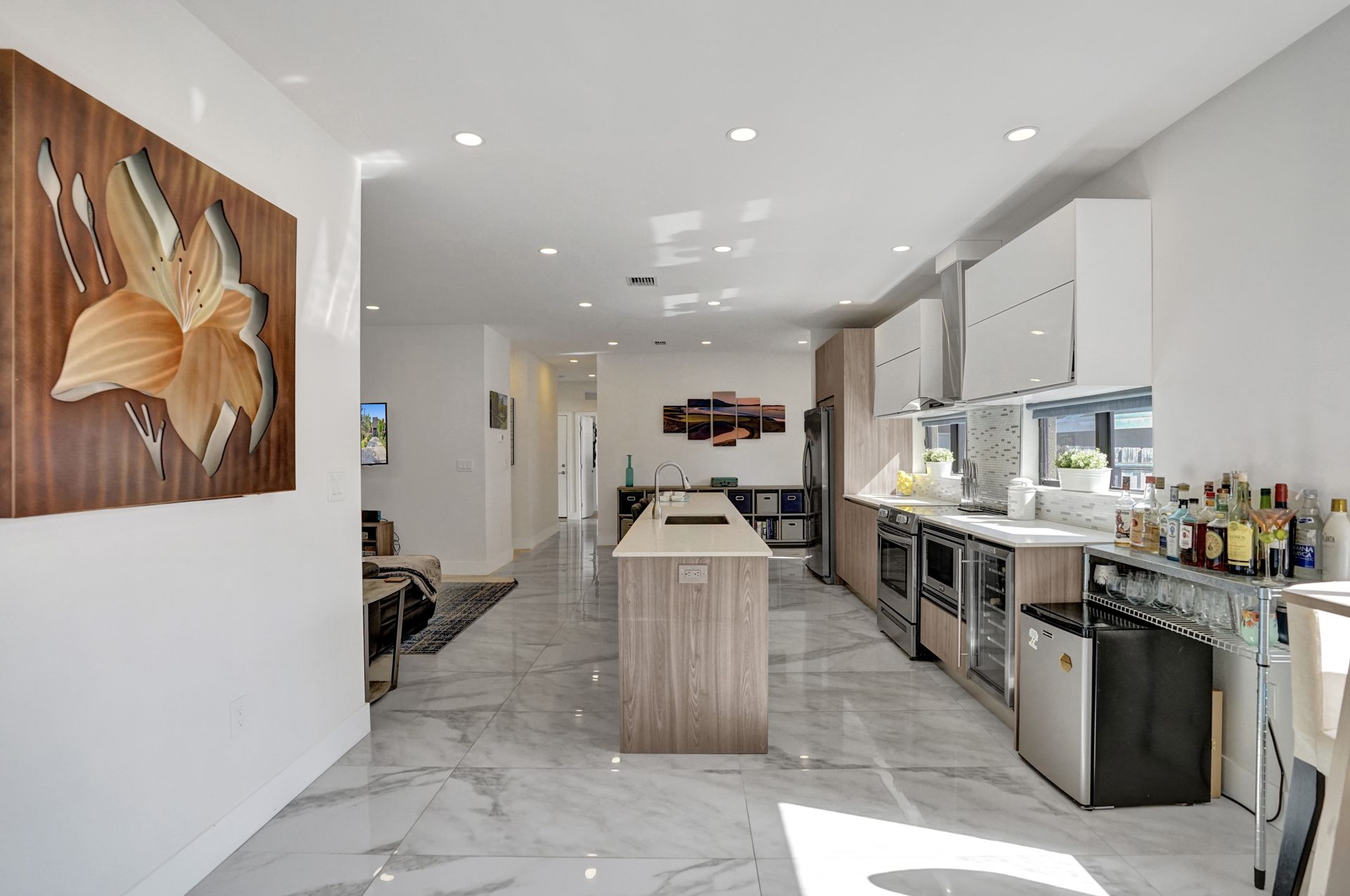 Some of the home's highlights include 10' ceilings, 24x48 porcelain tile in main living area, plank tile in bedrooms, LED lighting, SS appliances, wine cooler, counter bar, walk-in closets and laundry room. European custom closets throughout along with quartz countertops. Impact windows and doors along with one-car garage. The lot is completely fenced-in with plenty of privacy. There's room for pets, a pool or playground. Covered patio to grill & chill.