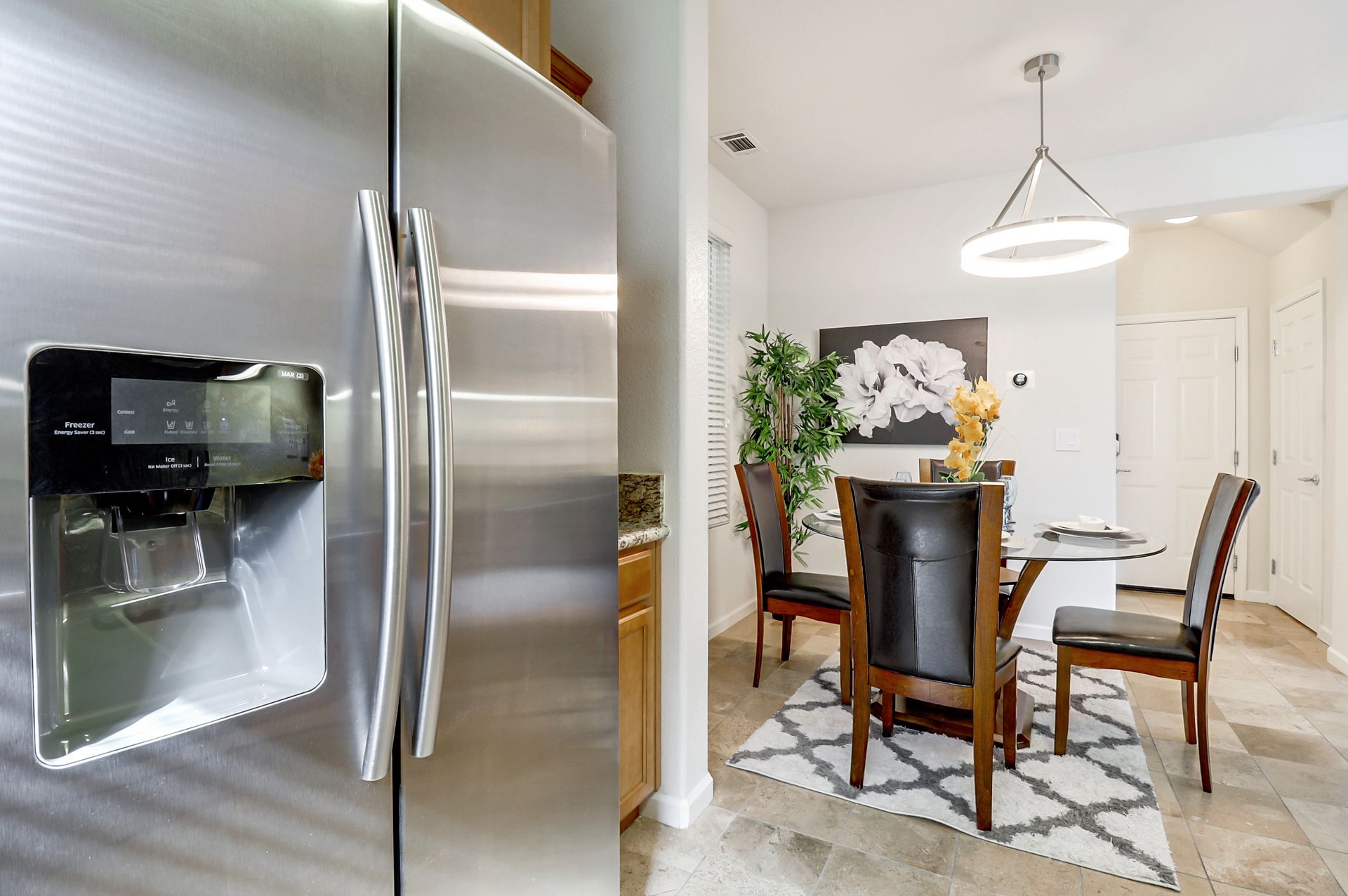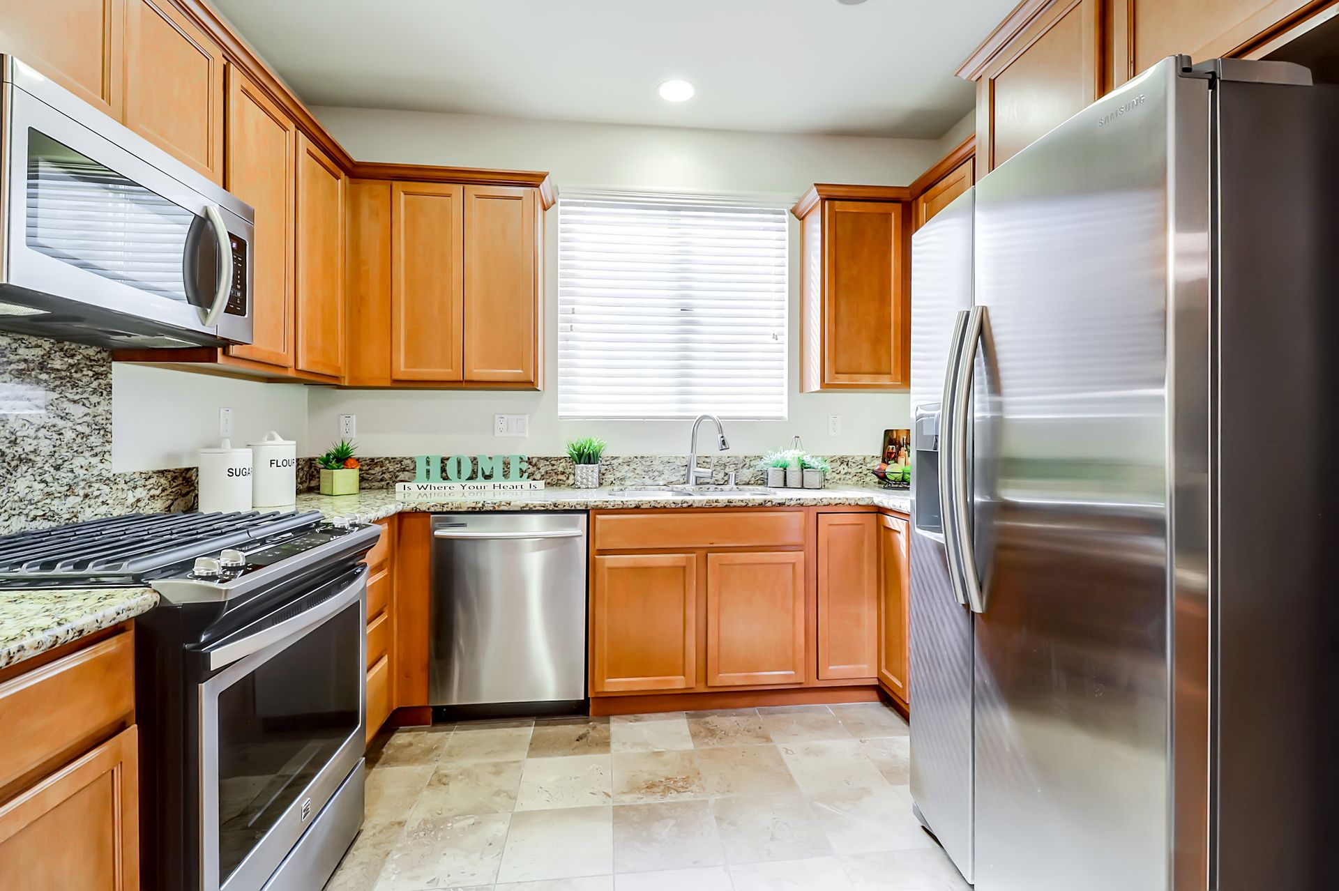 The main level includes a bright and spacious living room plus a chef's kitchen. The kitchen boasts granite countertops and top-branded appliances from Samsung and Kenmore. The dining area is adjacent to a one-half bathroom and there is a sliding door leading to the backyard.