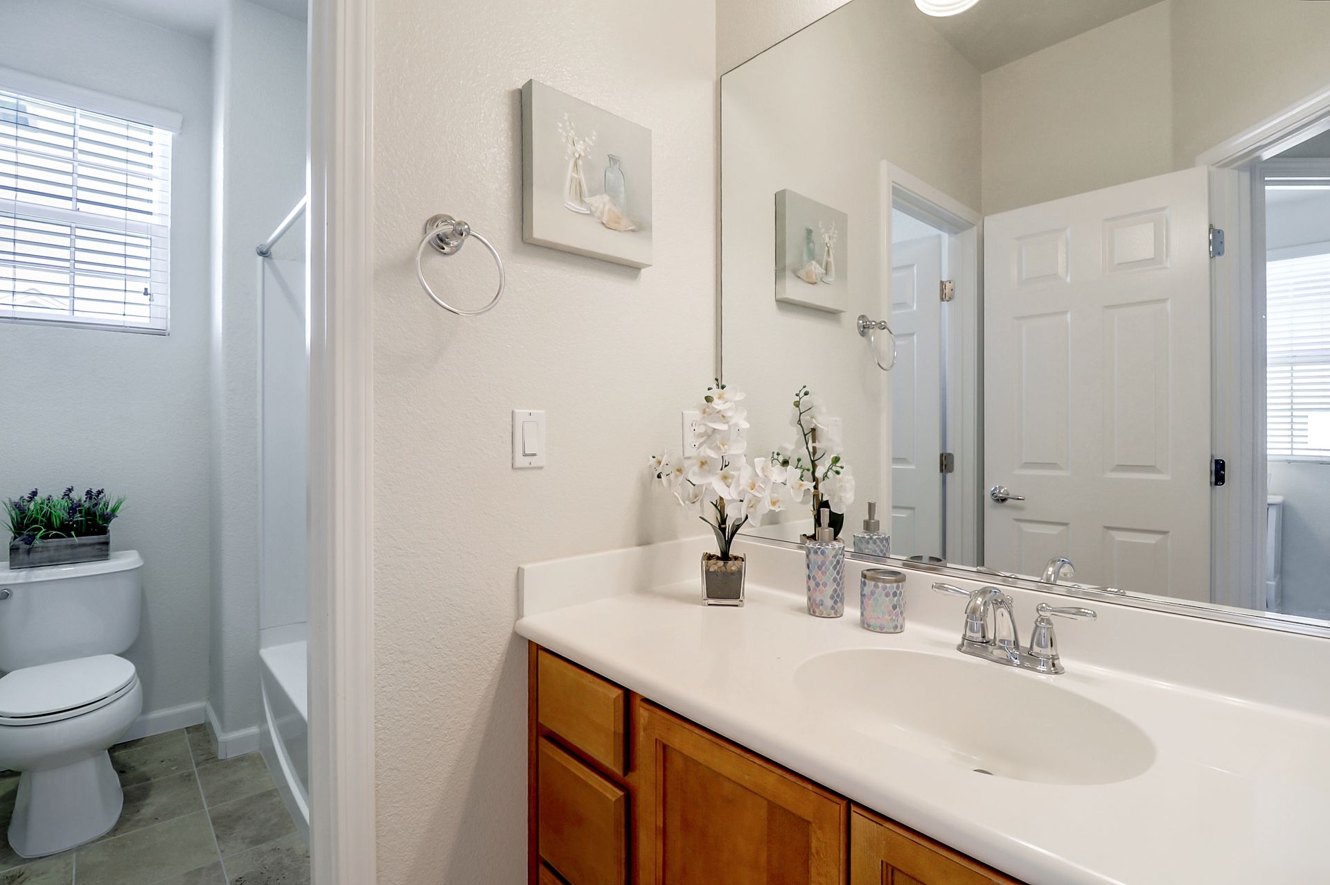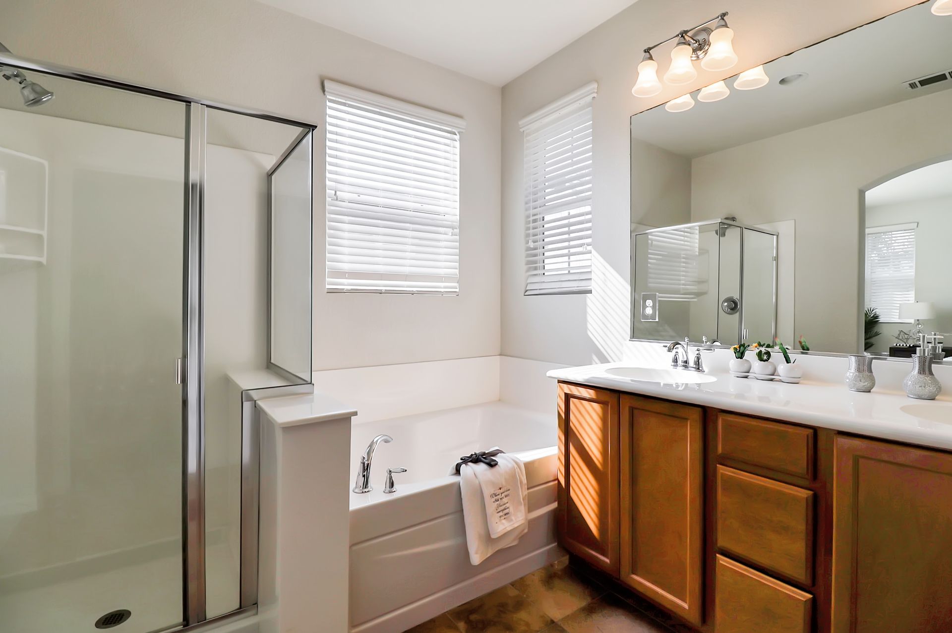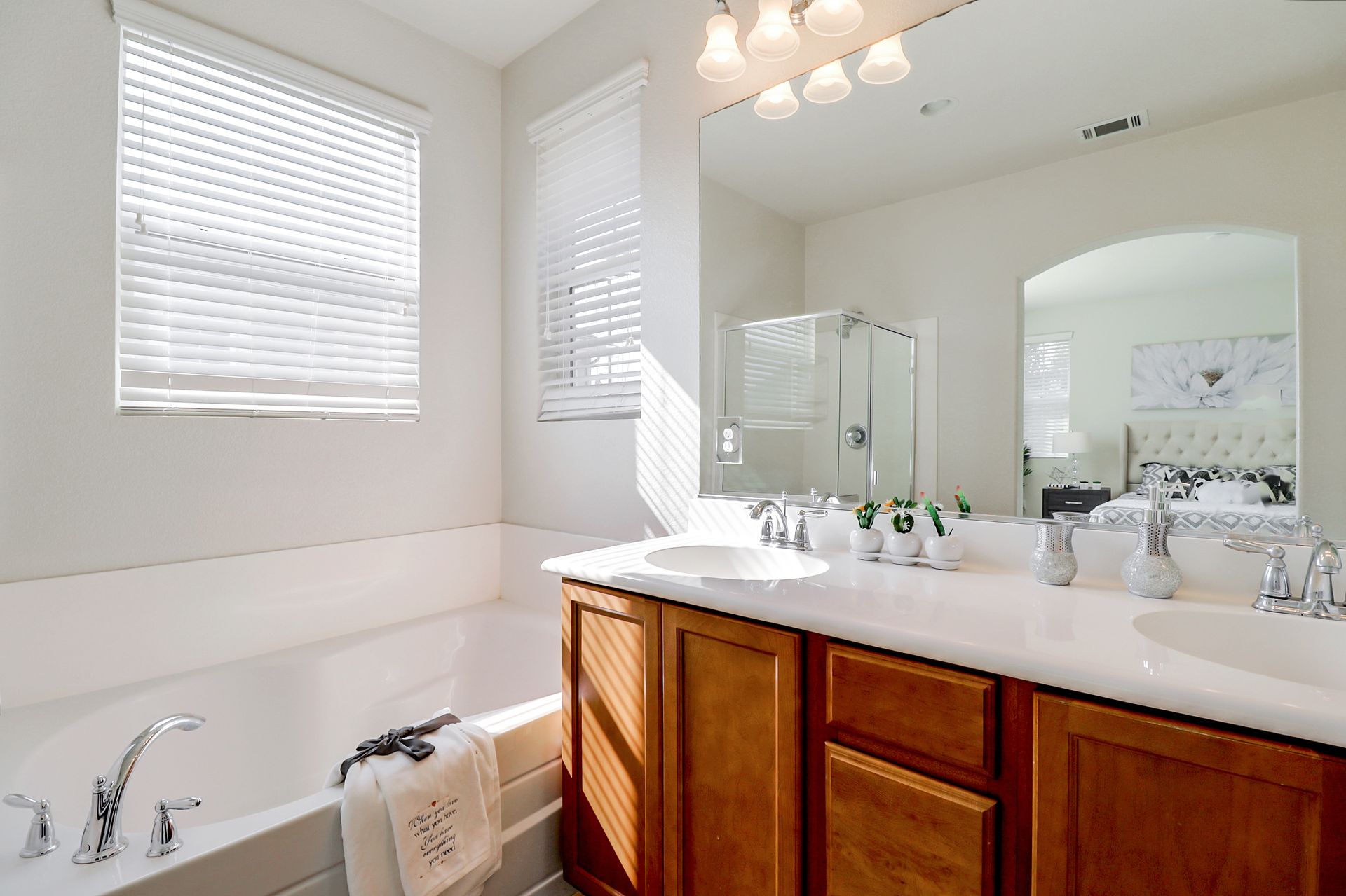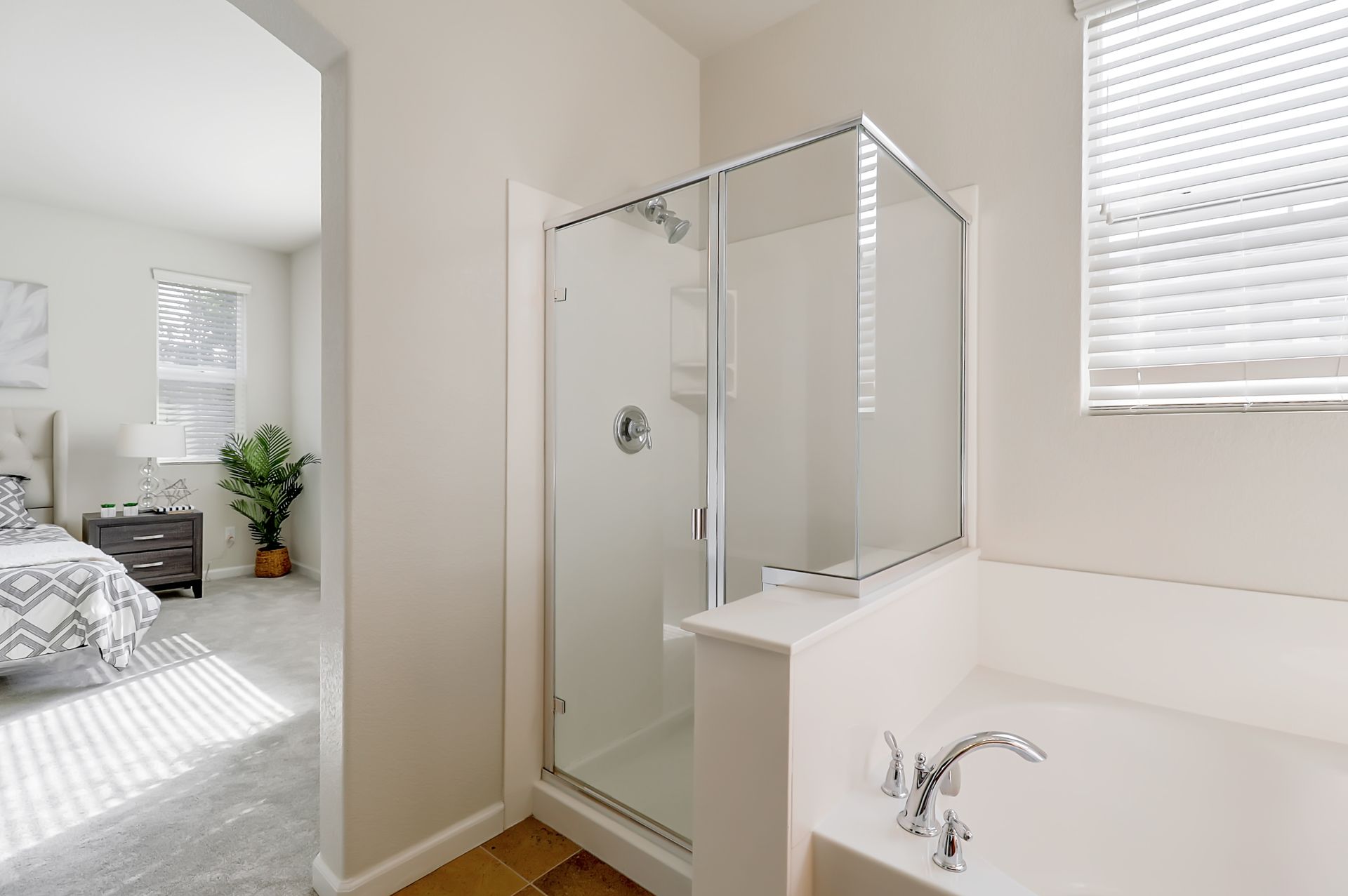 The second level of the home has three large bedrooms, a den, and two baths. The home has spacious bedrooms and a spectacular master suite, offering a large walk-in closet and an en-suite bathroom with a separate shower and double sinks.