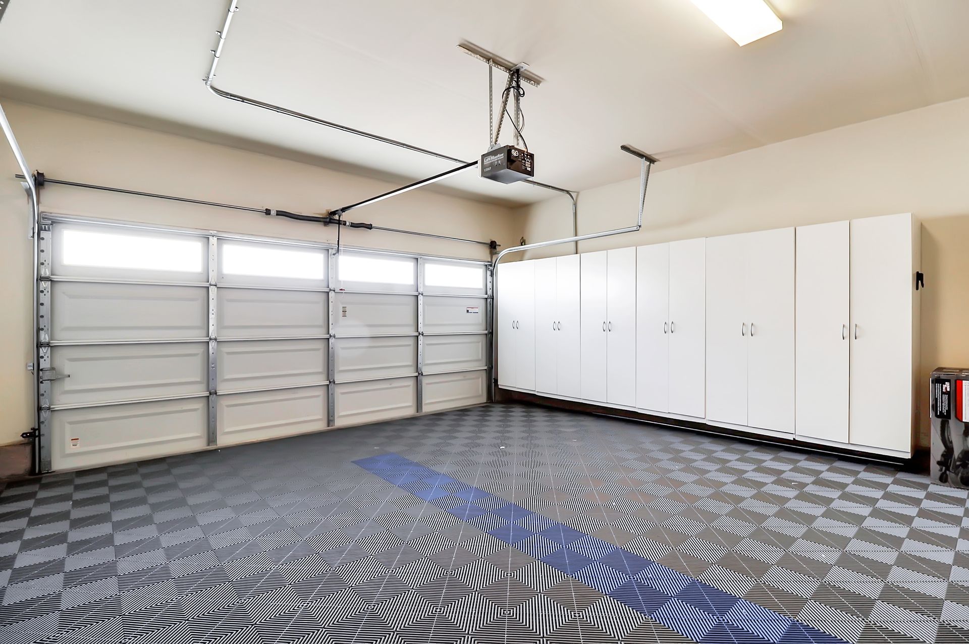 - Two-car garage with built-in Tesla charger and Swisstrax (Ribtrax Smooth Pro Garage Floor Tile)