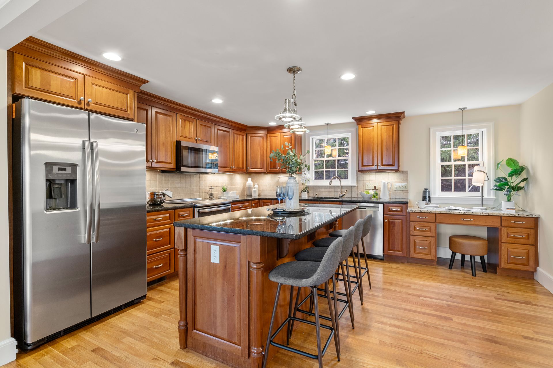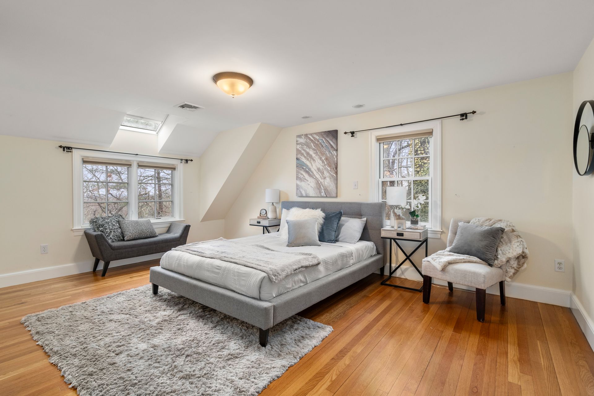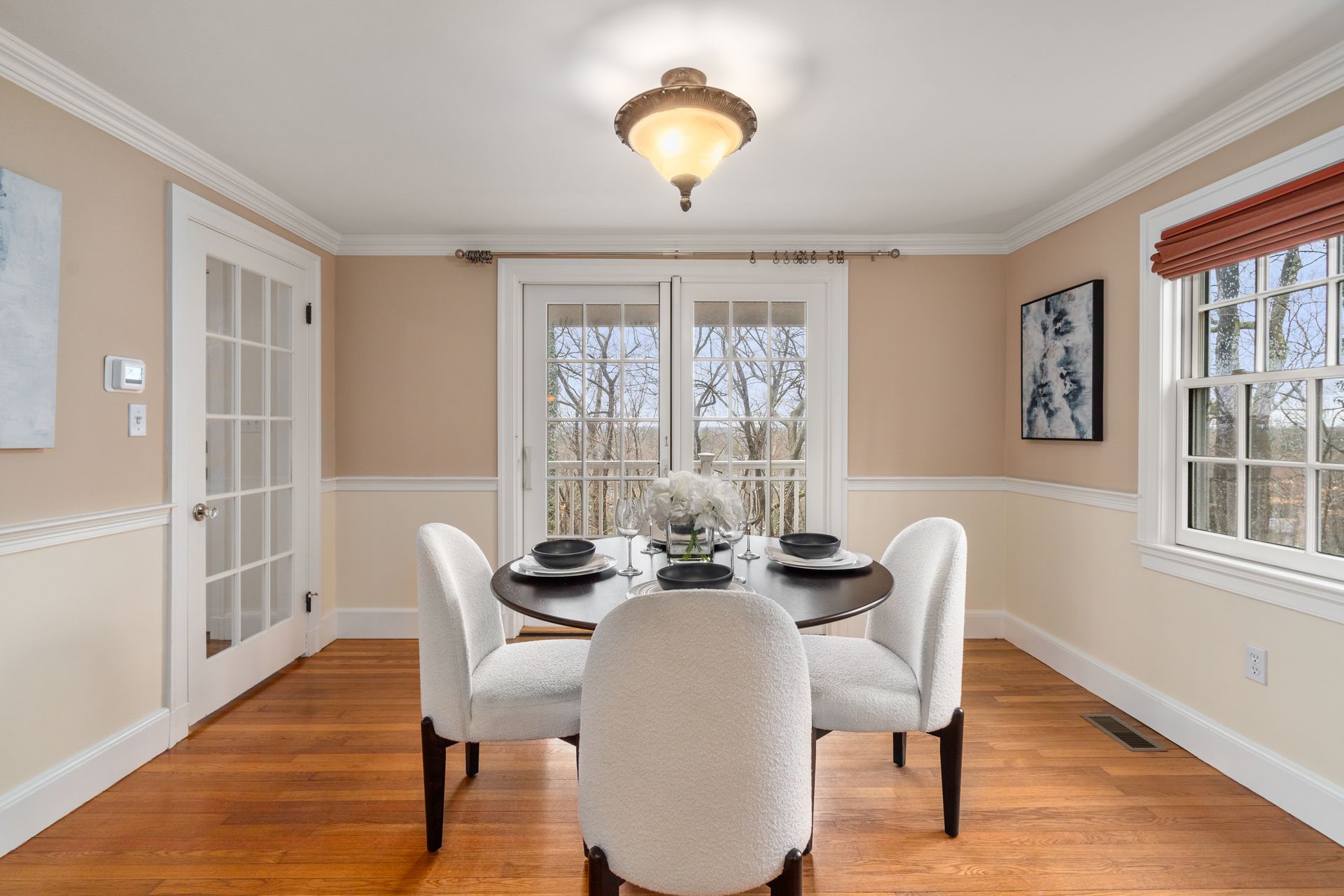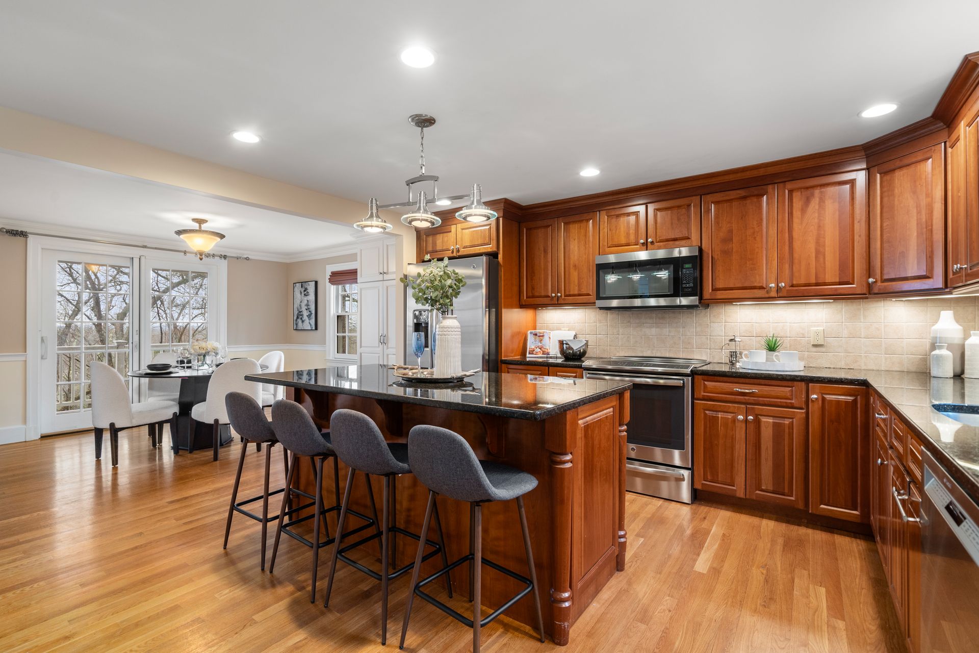 Tranquility and privacy describe this four bedroom/three and a half bath home located in a coveted Bird's Hill neighborhood. The sundrenched open concept first floor features a chef's kitchen with custom cabinets, stainless steel appliances, granite counters and a lovely island that leads into a formal dining room. The spacious family room with fireplace has French doors leading out to an expansive deck perfect for hours of outdoor living and incredible sunsets. Completing the main level is a mudroom and powder room. The second floor features an oversized primary ensuite with a lovely bathroom and walk in closet. Three additional family bedrooms, a full bathroom and laundry area complete this level. The finished lower level offers a playroom, office, full bathroom and a large bonus room with exterior access perfect for an au pair or in-law suite. Completing this home is two car detached garage with additional loft space perfect for a private office. Close to the commuter rail and everything Needham Center has to offer!