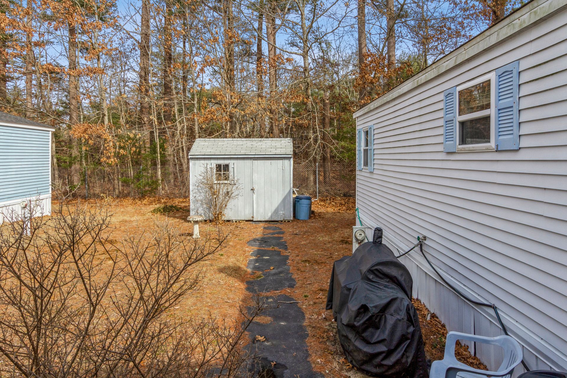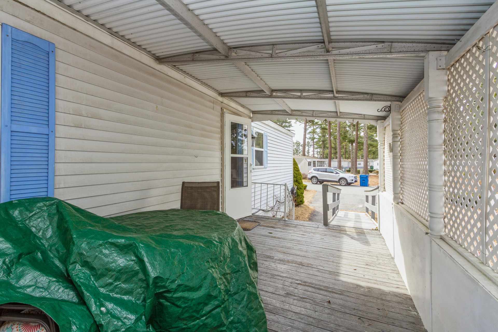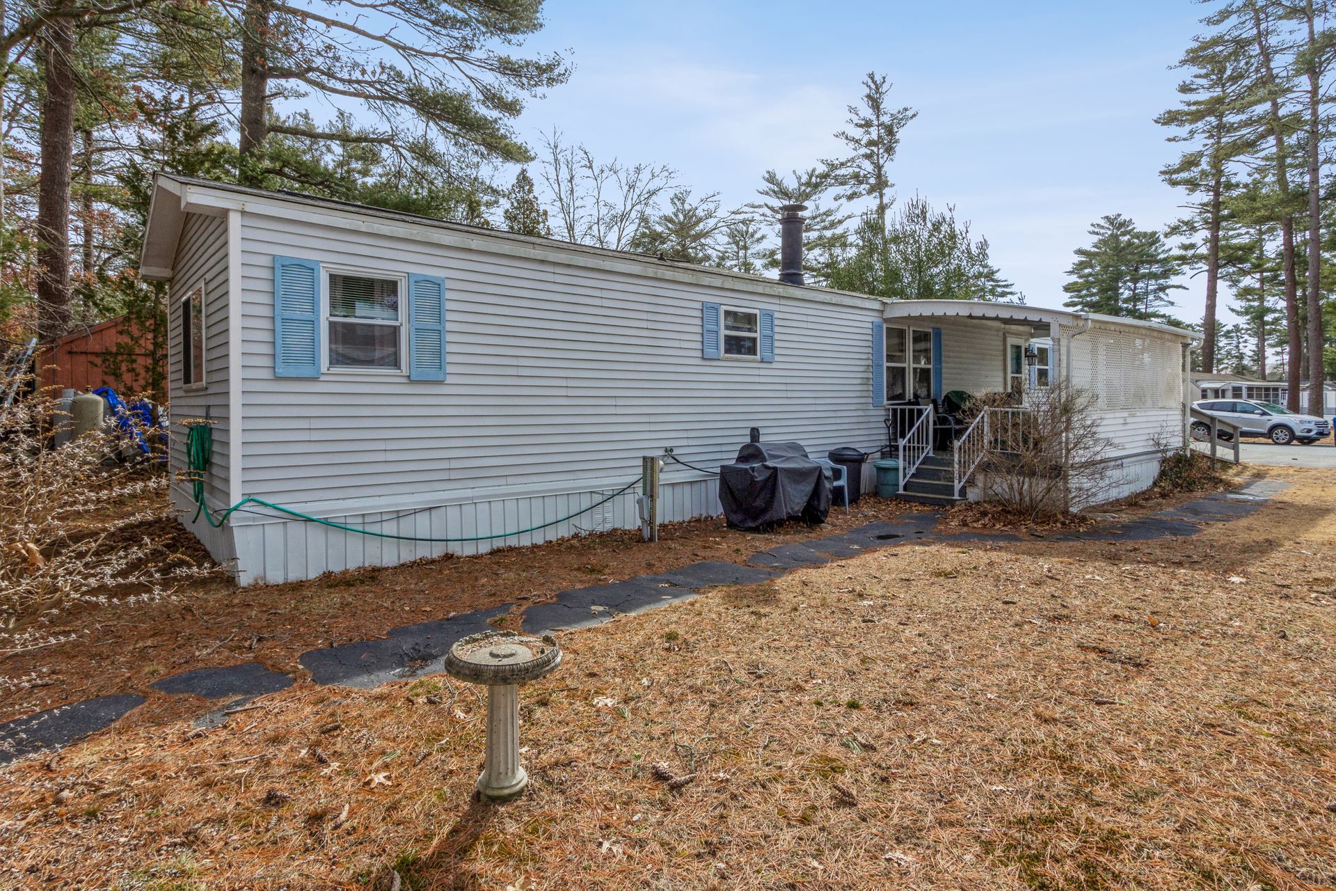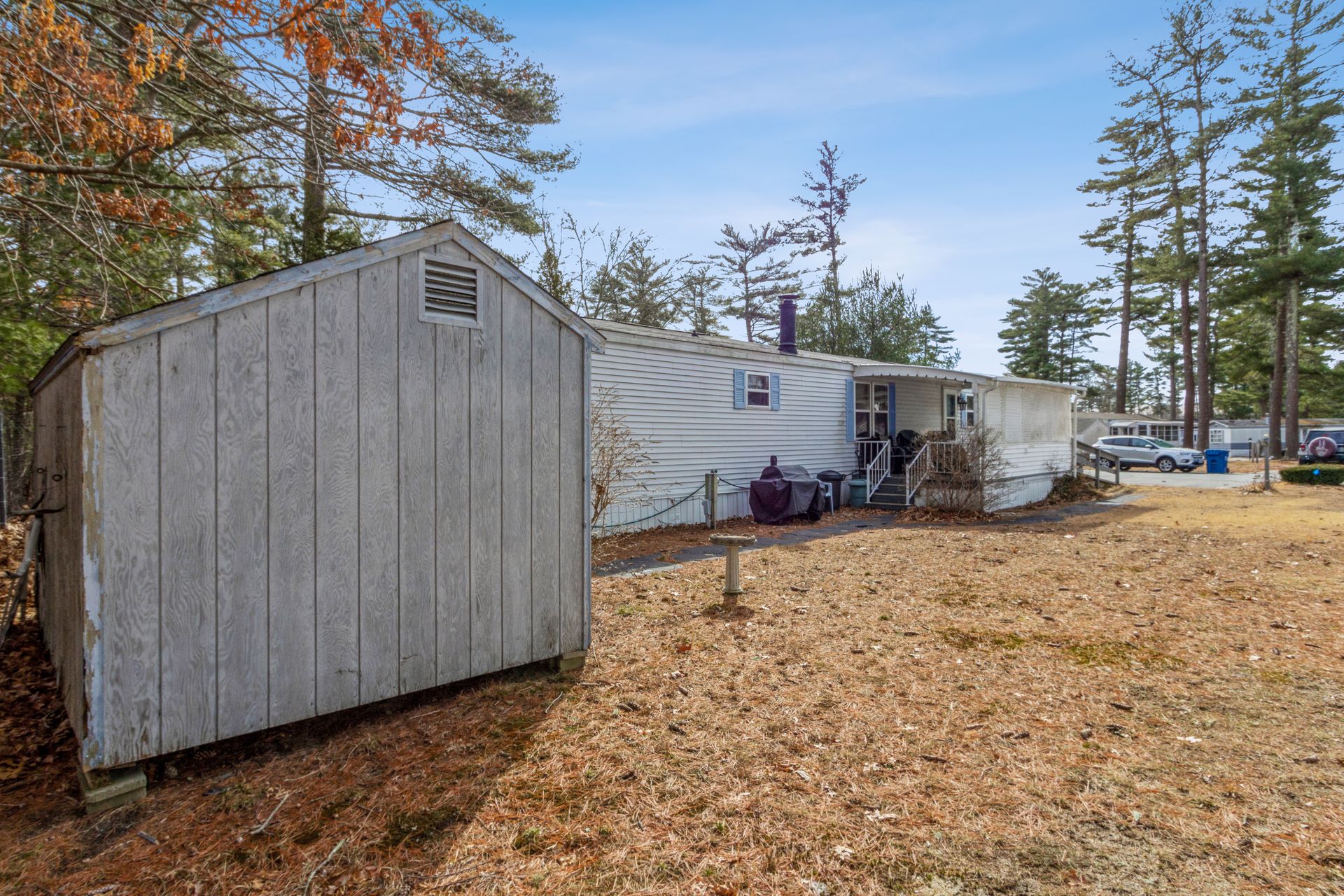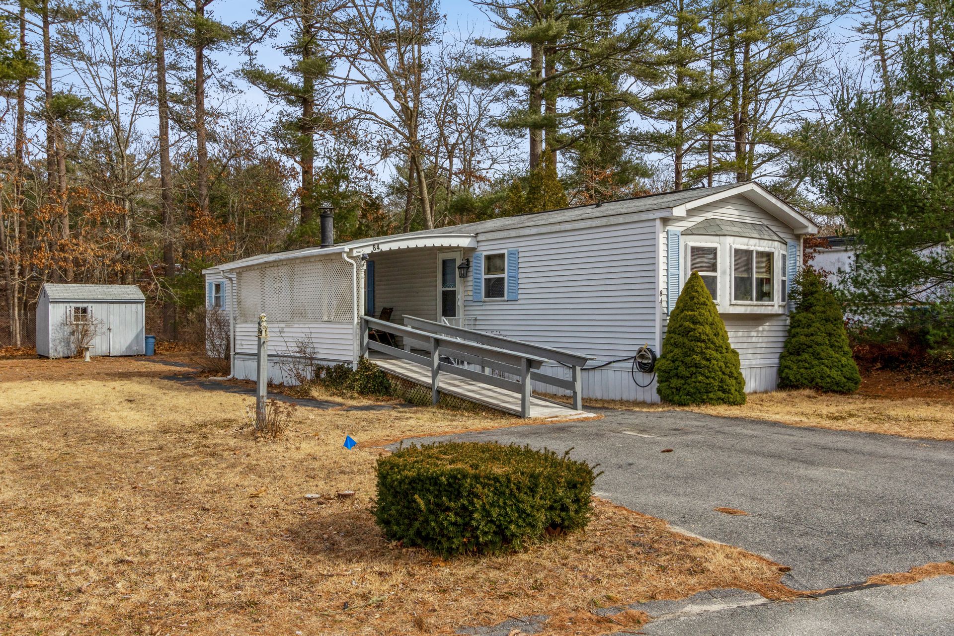 Two-bedroom and one and a half bathroom mobile home with cathedral ceilings located in Royal Crest, 55+ plus community is waiting for you! This mobile home features approximately 1,000 square feet of open floor plan living space that includes large living room with fireplace and ceiling fan, dining area, kitchen with plenty of cabinet space and island. This home features a Primary bedroom offering a half bathroom and second bedroom, on the opposite side of the home. Also, utility space for laundry and a full bathroom. Handicap ramp up to a large covered porch. Recent updates include gas water heater, two storm doors and stove fan (2020) and Roof replacement rear and rear bedroom carpet (2021). For additional storage, shed available on property. Park Fees $624 / month includes common area expenses, insurance for the park (not personal insurance), taxes, water, snow plowing street and trash removal. Area amenities offer Wareham Crossing Mall, Cape Cod Canal and Onset Beach. Buyer is subject to park approval.