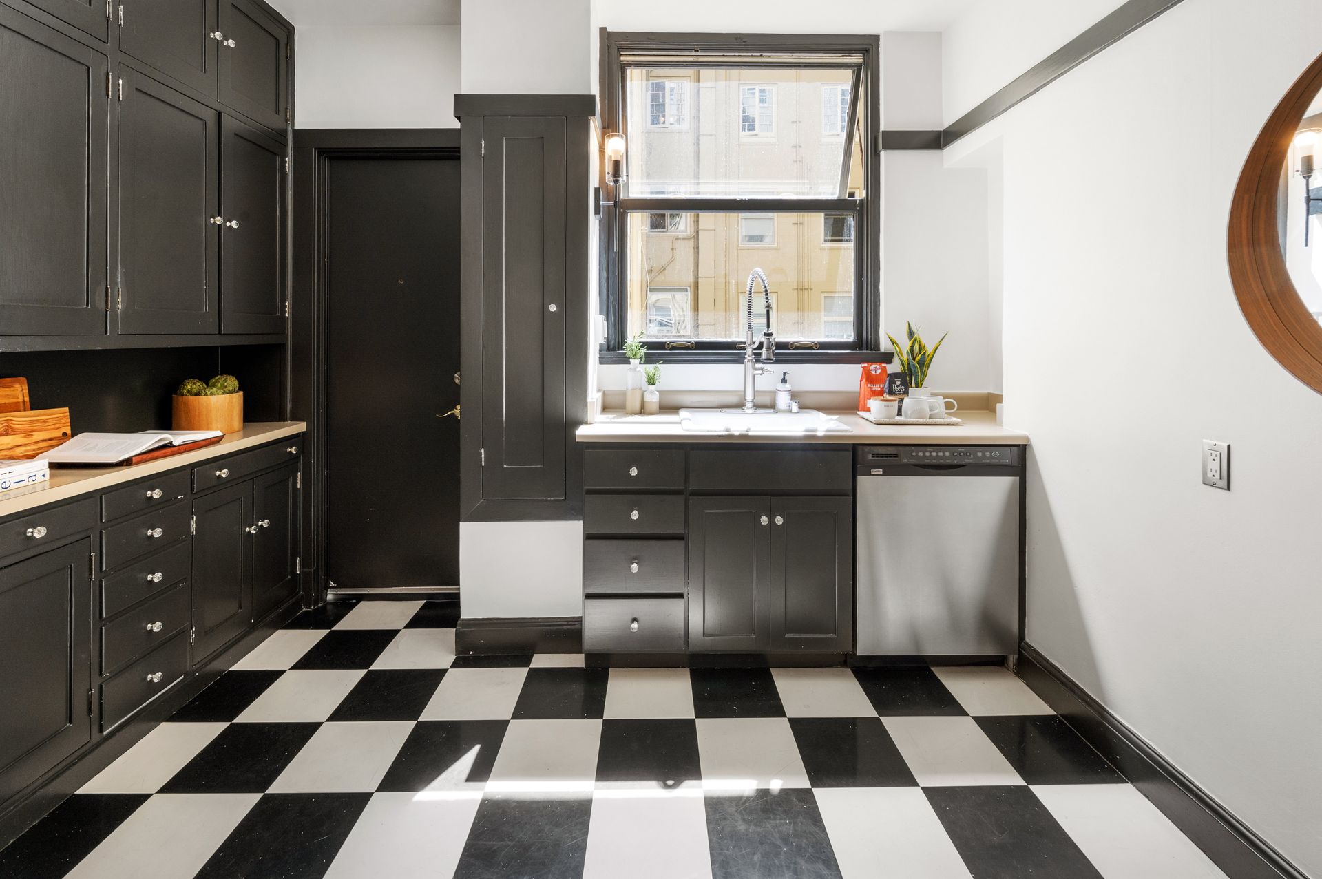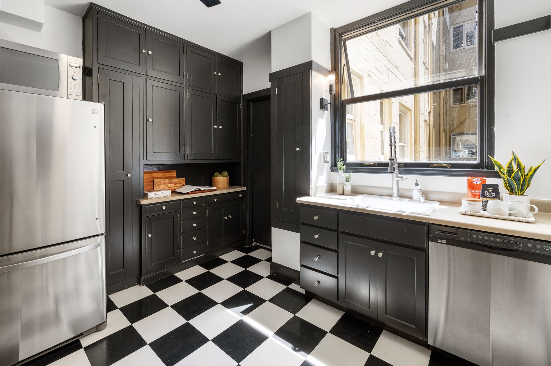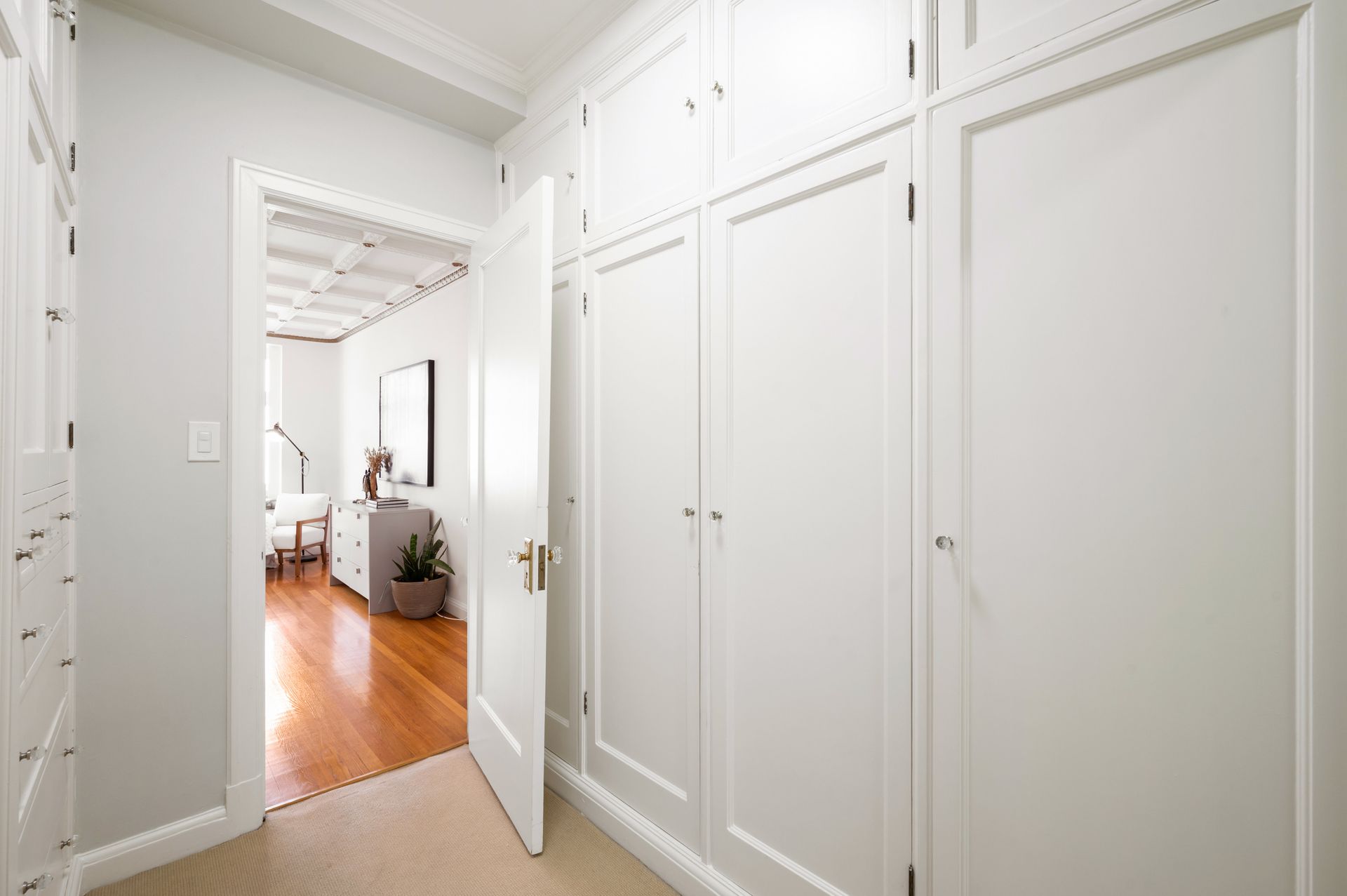 The Chef’s kitchen offers stainless appliances and a large window with bright eastern-facing light. An additional walk-in pantry/storage room adjoins the space providing direct access to the garage level via the service elevator—an excellent convenience for caterers, workpersons, and cleaning staff—in addition to the passenger elevator just outside the front door.