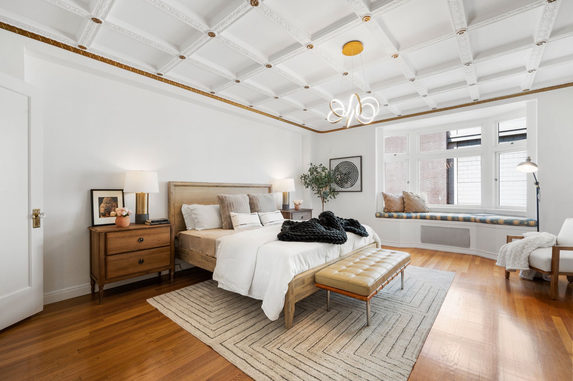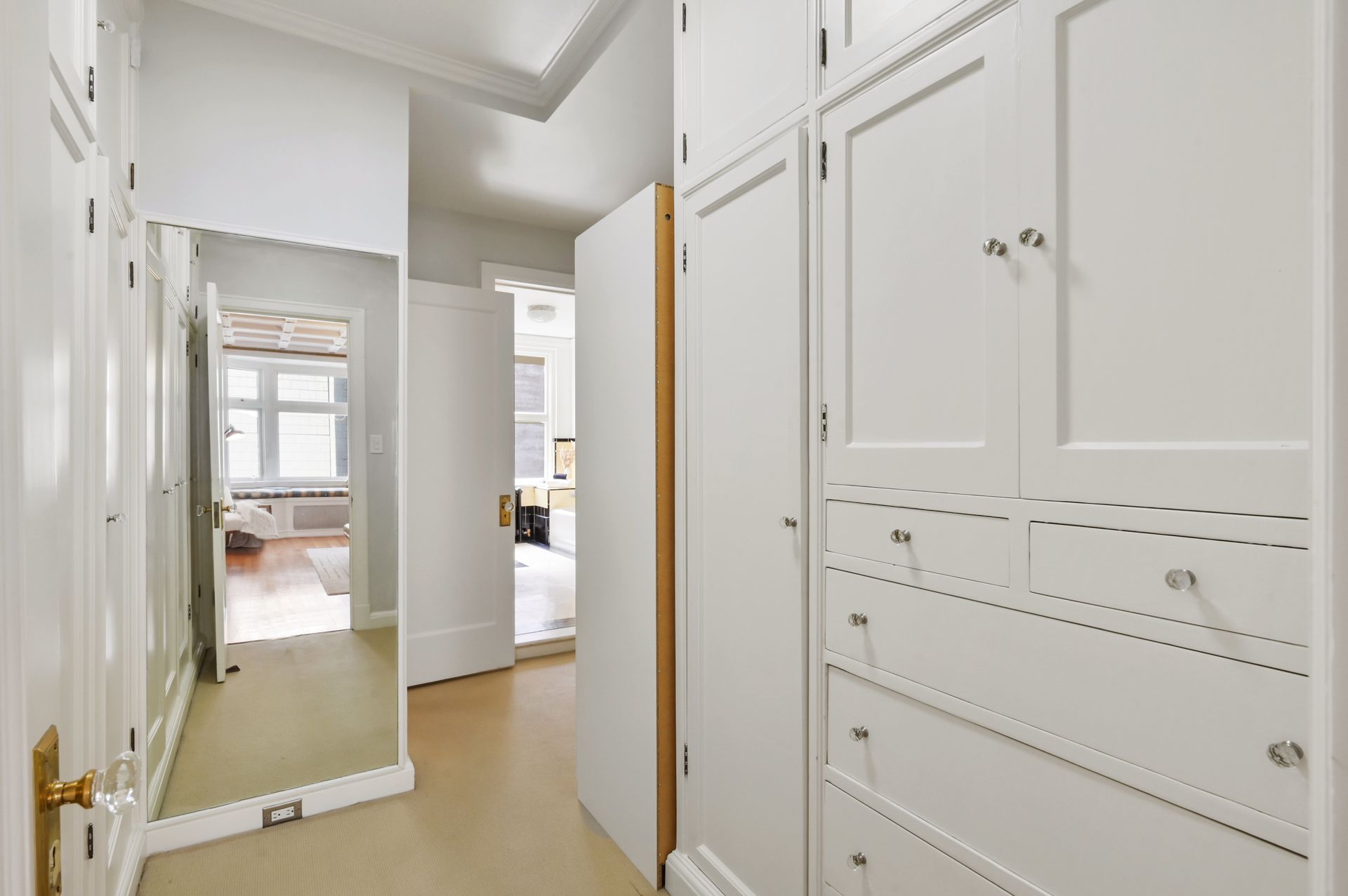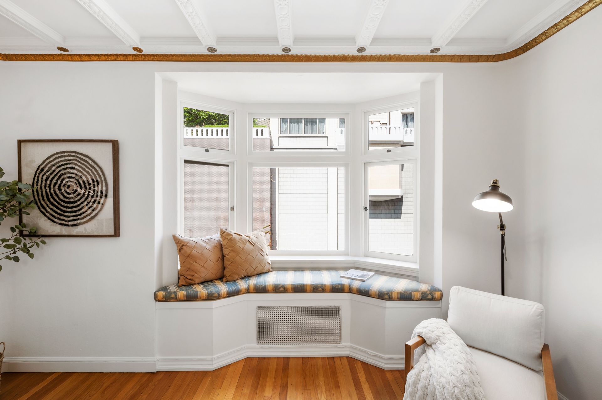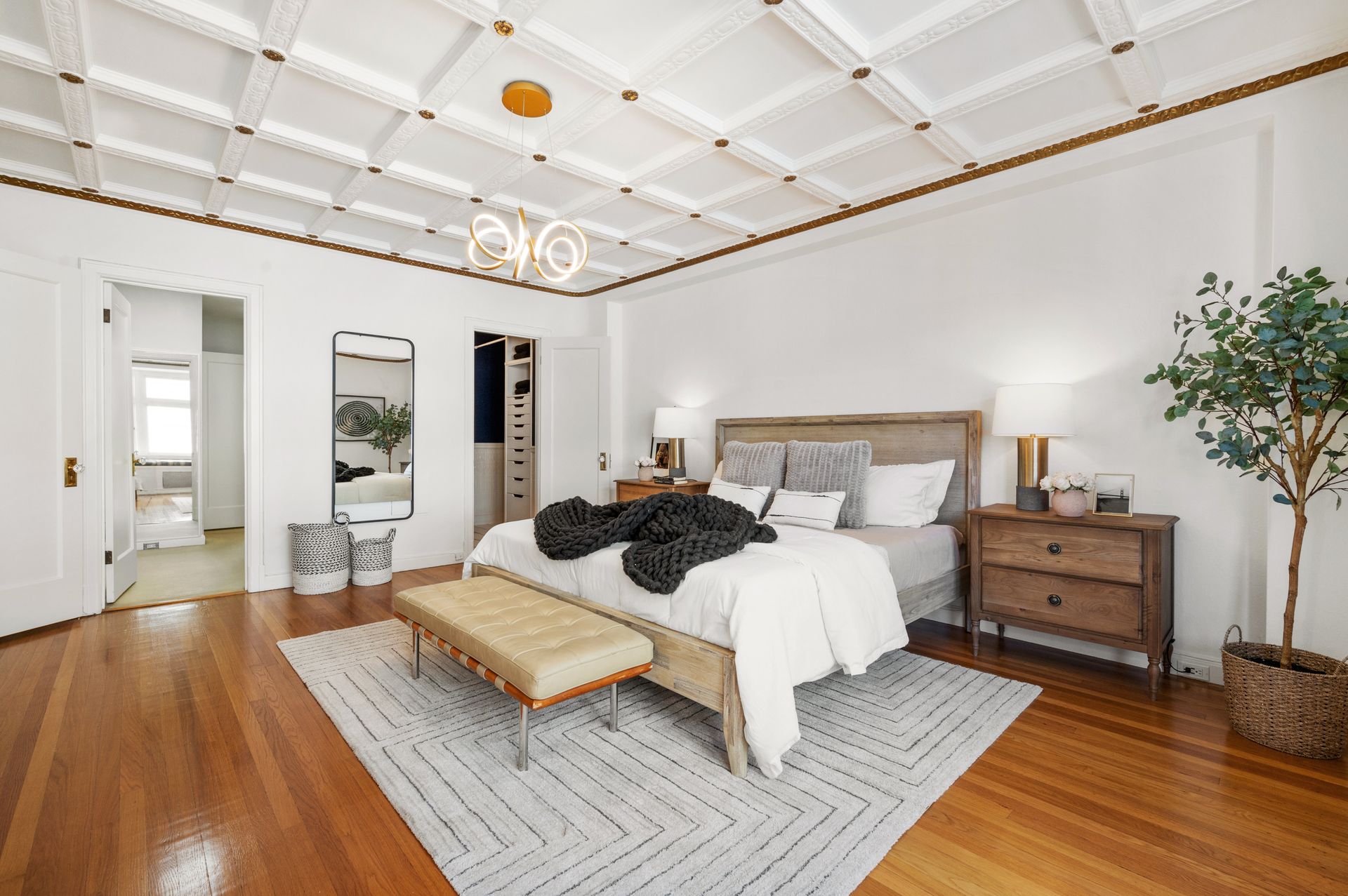 The oversized primary suite features expertly crafted plasterwork ceilings, old-growth hardwood floors, an ensuite half bathroom with embossed wainscoting, a large bay window seat with views of Alcatraz and upgraded acoustic glass. A large walk-in closet with cedar-lining has ample additional storage and access to the full bathroom and second bedroom.