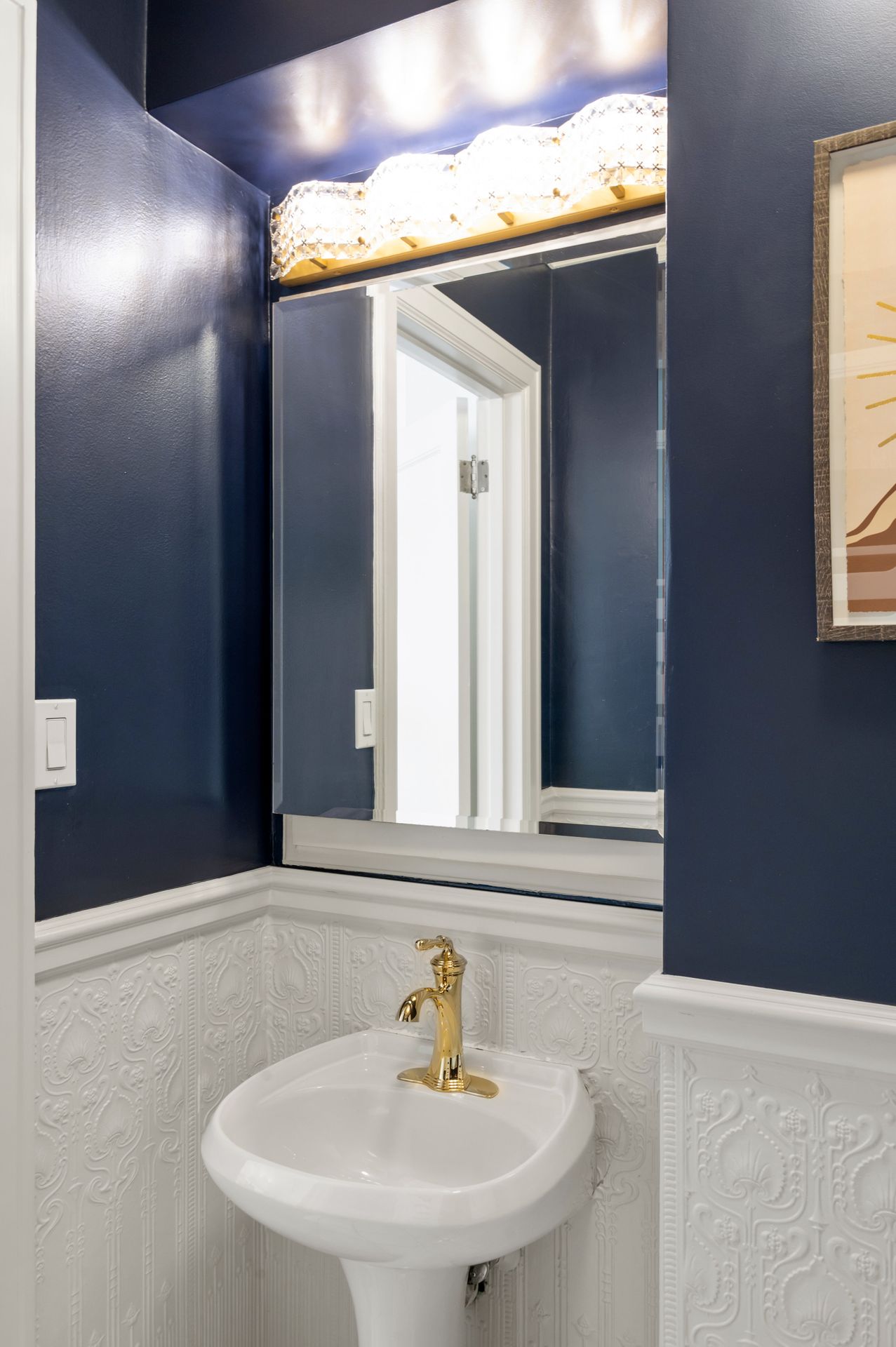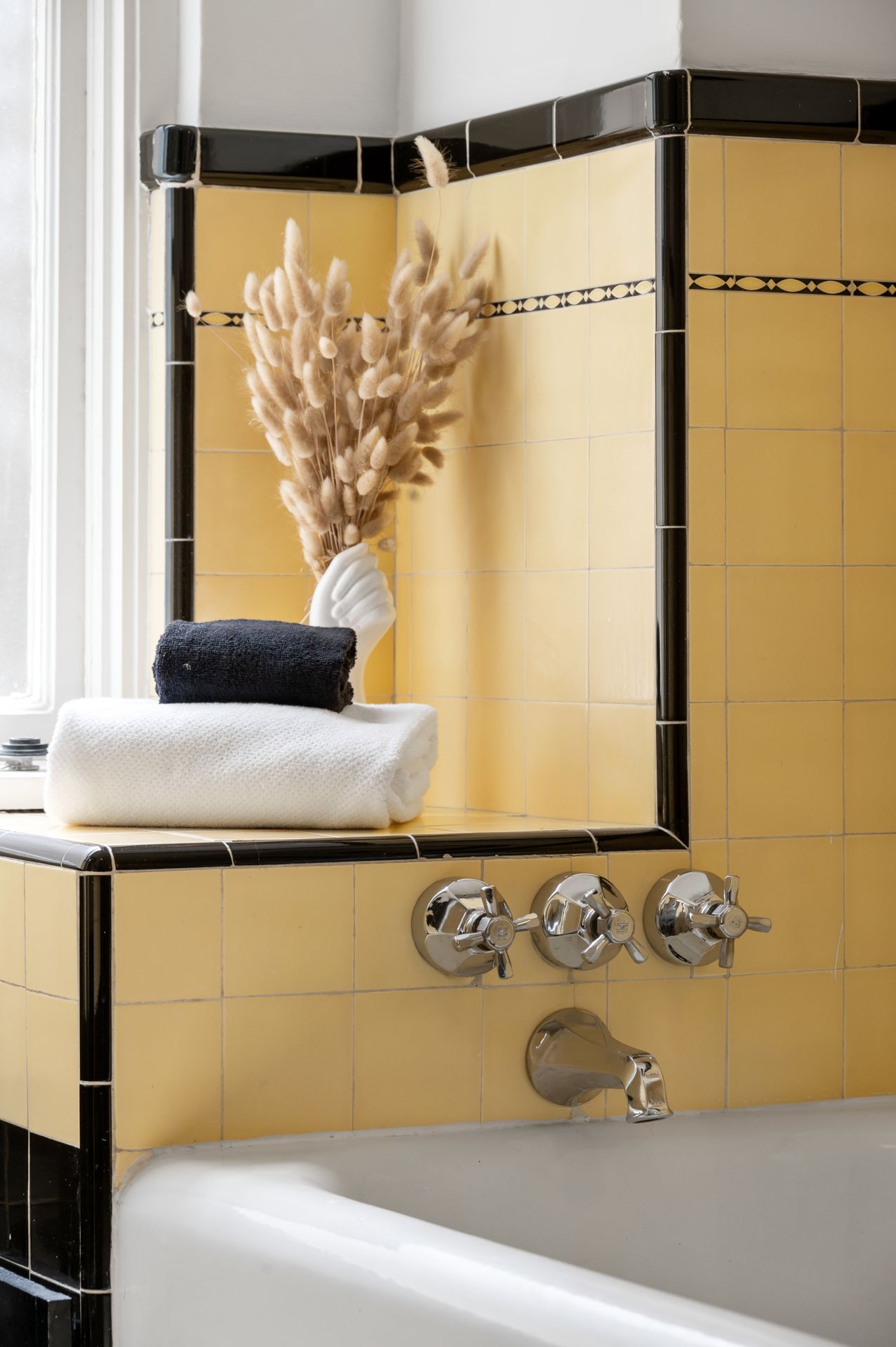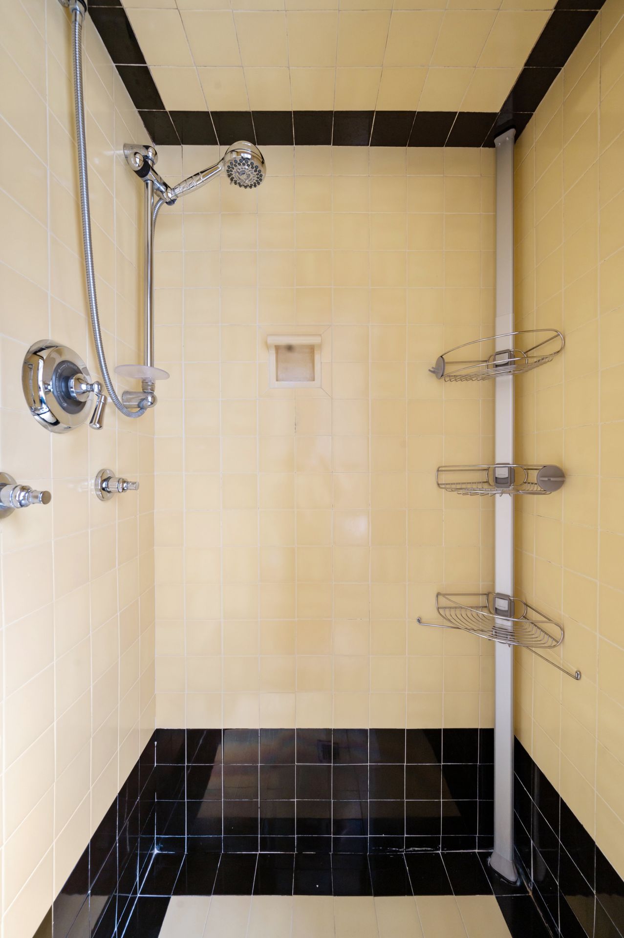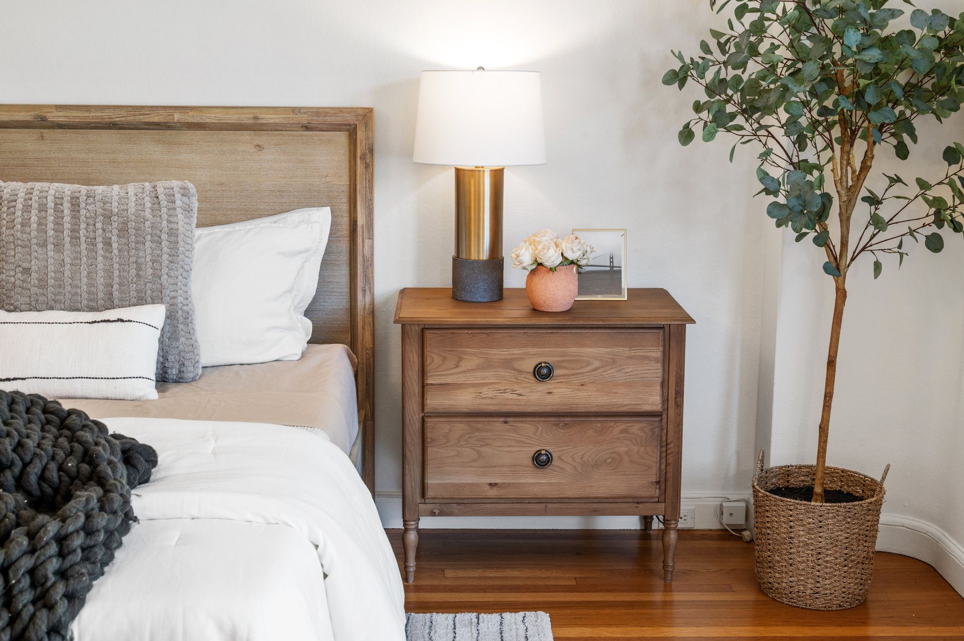 The oversized primary suite features expertly crafted plasterwork ceilings, old-growth hardwood floors, an ensuite half bathroom with embossed wainscoting, a large bay window seat with views of Alcatraz and upgraded acoustic glass. A large walk-in closet with cedar-lining has ample additional storage and access to the full bathroom and second bedroom.