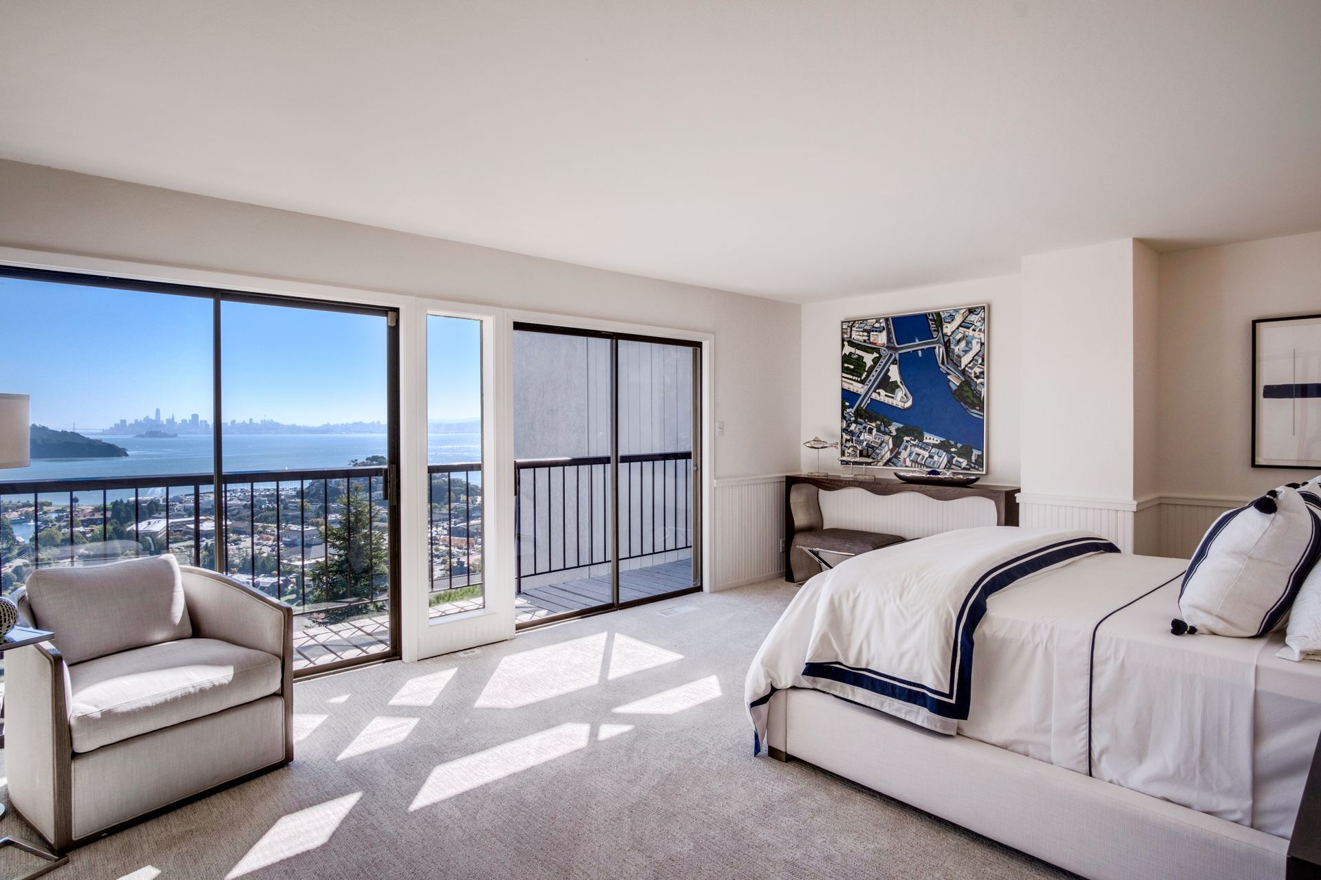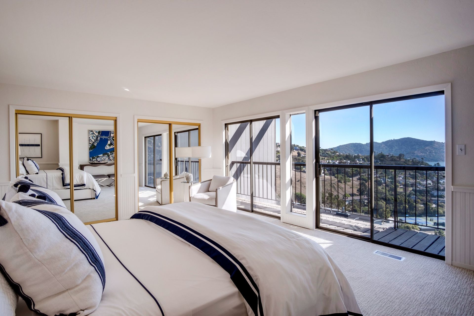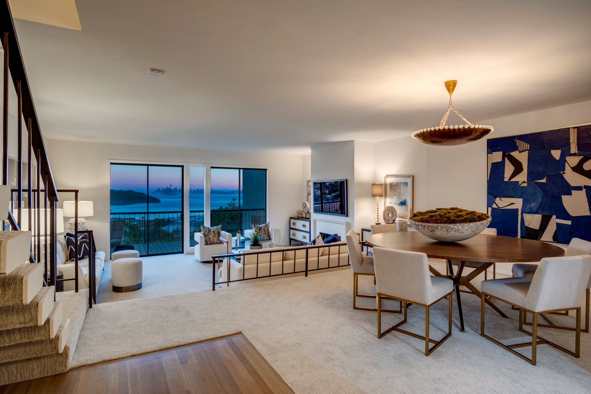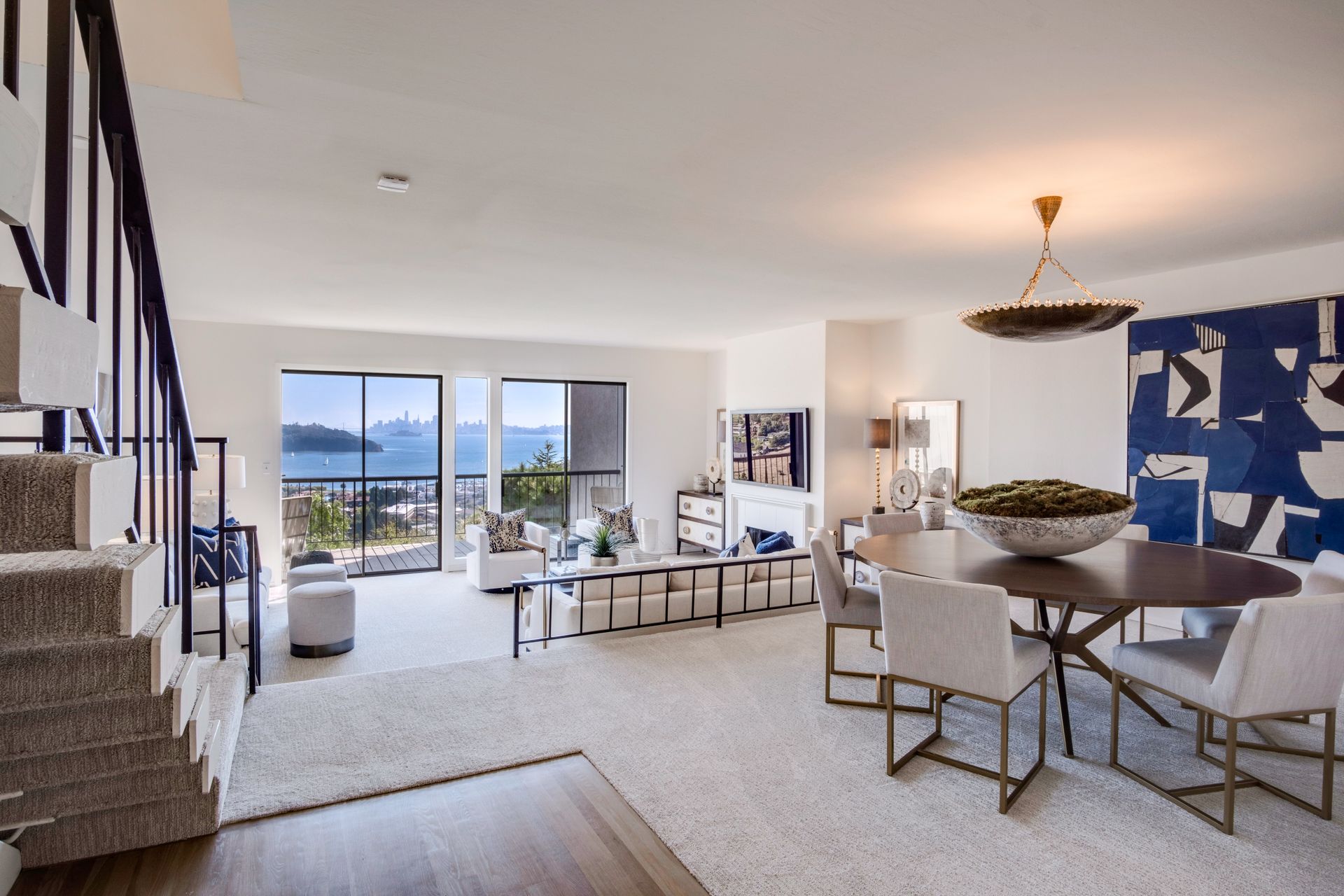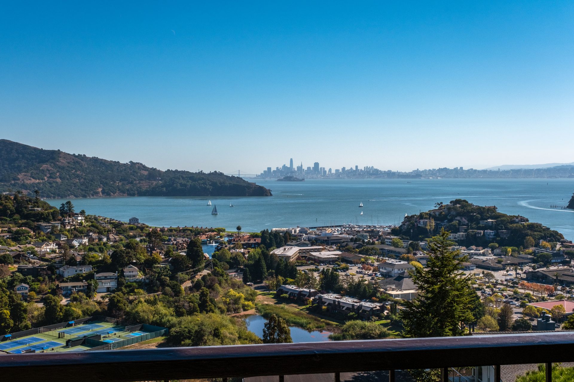 86 Red Hill Circle offers sweeping panoramic views that wrap around from Angel Island to the Golden Gate Bridge, SF & the Bay, to Belvedere Lagoon. This beautifully updated, southwest-facing 3 bedroom, 2.5 bathroom home is light-filled throughout the day. Sliding glass doors lead to the deck, perfect for indoor/outdoor flow. The open-concept design ensures unobstructed views of the Bay from the dining and living areas, making it a perfect space for entertaining. The large kitchen is great for cooking & socializing. The top floor has three bedrooms, two baths, and a laundry area all filled with natural light from the skylights. The spacious primary bedroom offers breathtaking views and a private balcony, inviting you to step out and enjoy the vistas, Bay & cityscape. The home features a two-car garage with space for SUPs, bikes, and more. Enjoy Tiburon's superb climate on the decks and expansive central courtyard. Savor vacation-like sunsets every day!