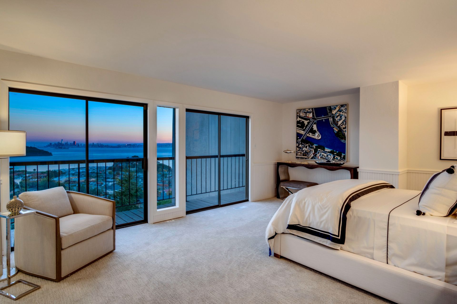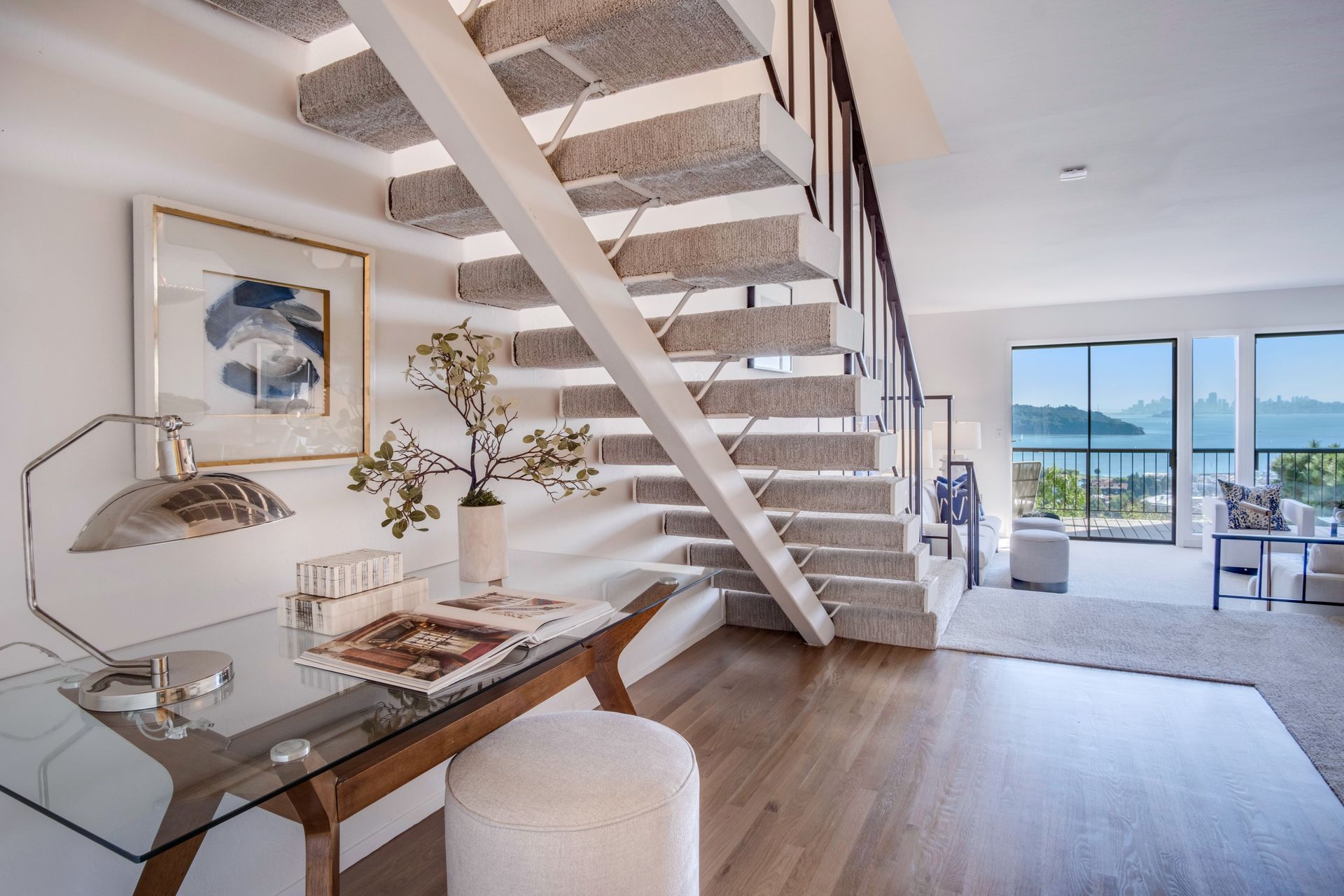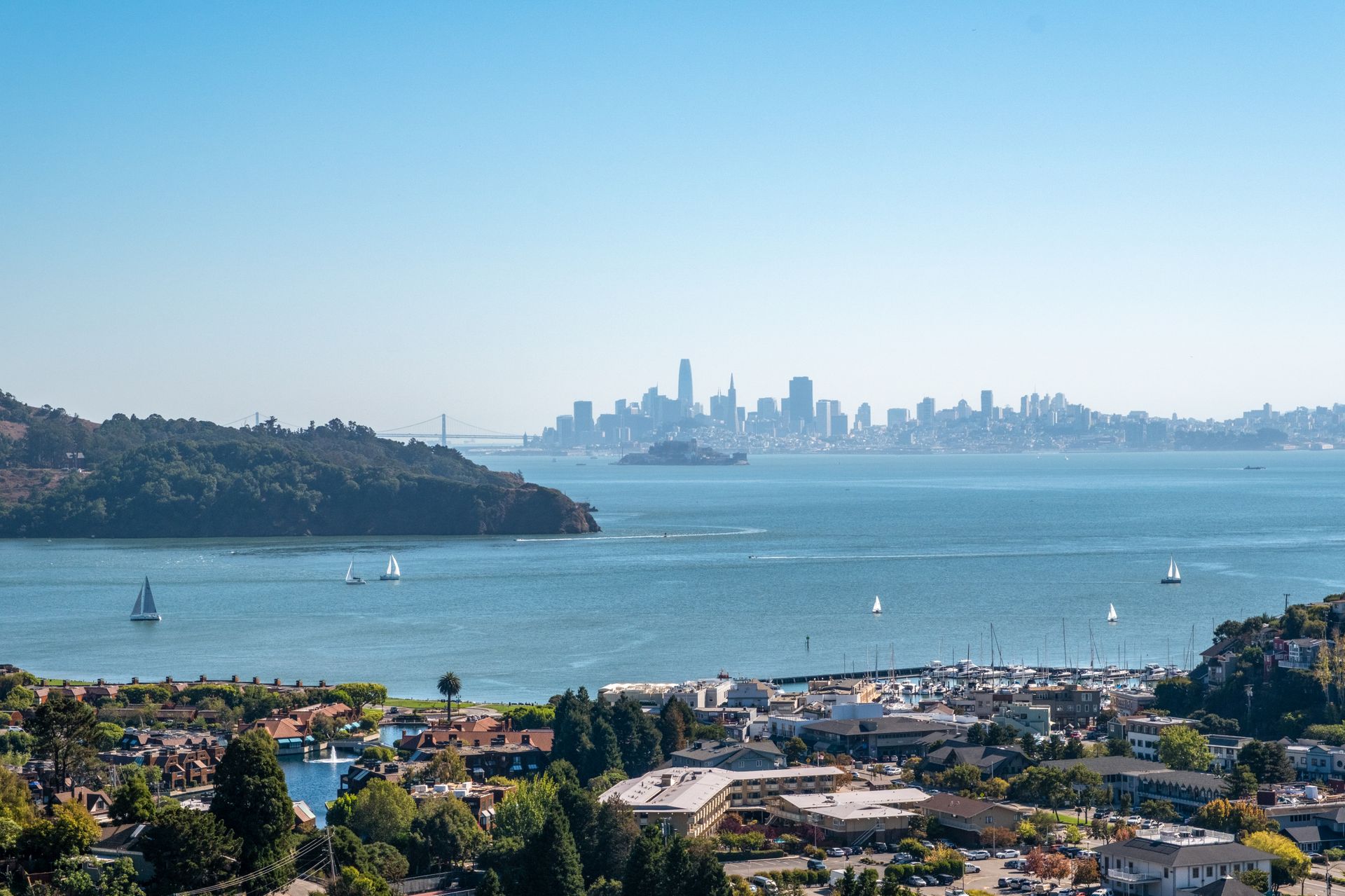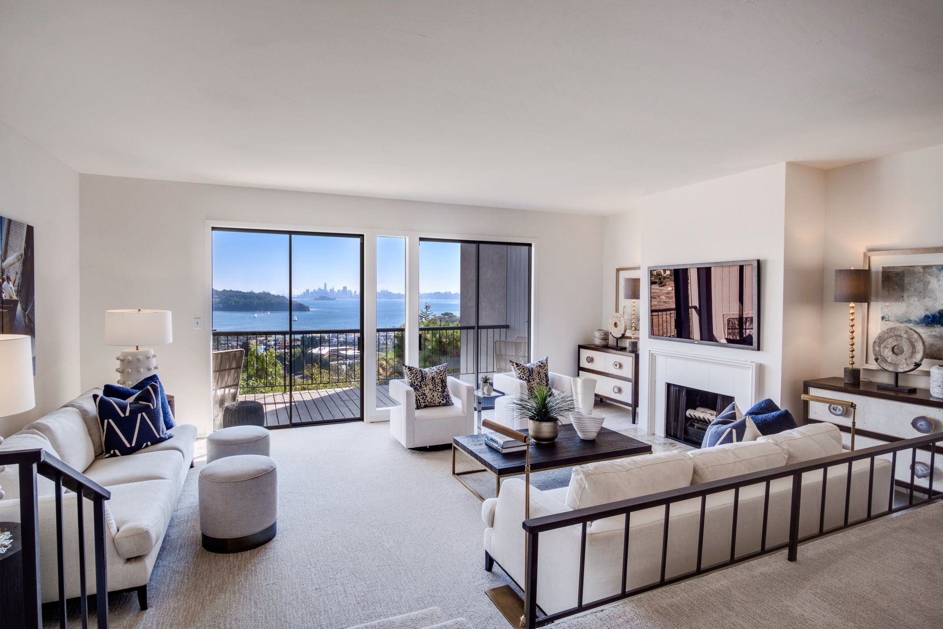 86 Red Hill Circle offers sweeping panoramic views that wrap around from Angel Island to the Golden Gate Bridge, SF & the Bay, to Belvedere Lagoon. This beautifully updated, southwest-facing 3 bedroom, 2.5 bathroom home is light-filled throughout the day. Sliding glass doors lead to the deck, perfect for indoor/outdoor flow. The open-concept design ensures unobstructed views of the Bay from the dining and living areas, making it a perfect space for entertaining. The large kitchen is great for cooking & socializing. The top floor has three bedrooms, two baths, and a laundry area all filled with natural light from the skylights. The spacious primary bedroom offers breathtaking views and a private balcony, inviting you to step out and enjoy the vistas, Bay & cityscape. The home features a two-car garage with space for SUPs, bikes, and more. Enjoy Tiburon's superb climate on the decks and expansive central courtyard. Savor vacation-like sunsets every day!
