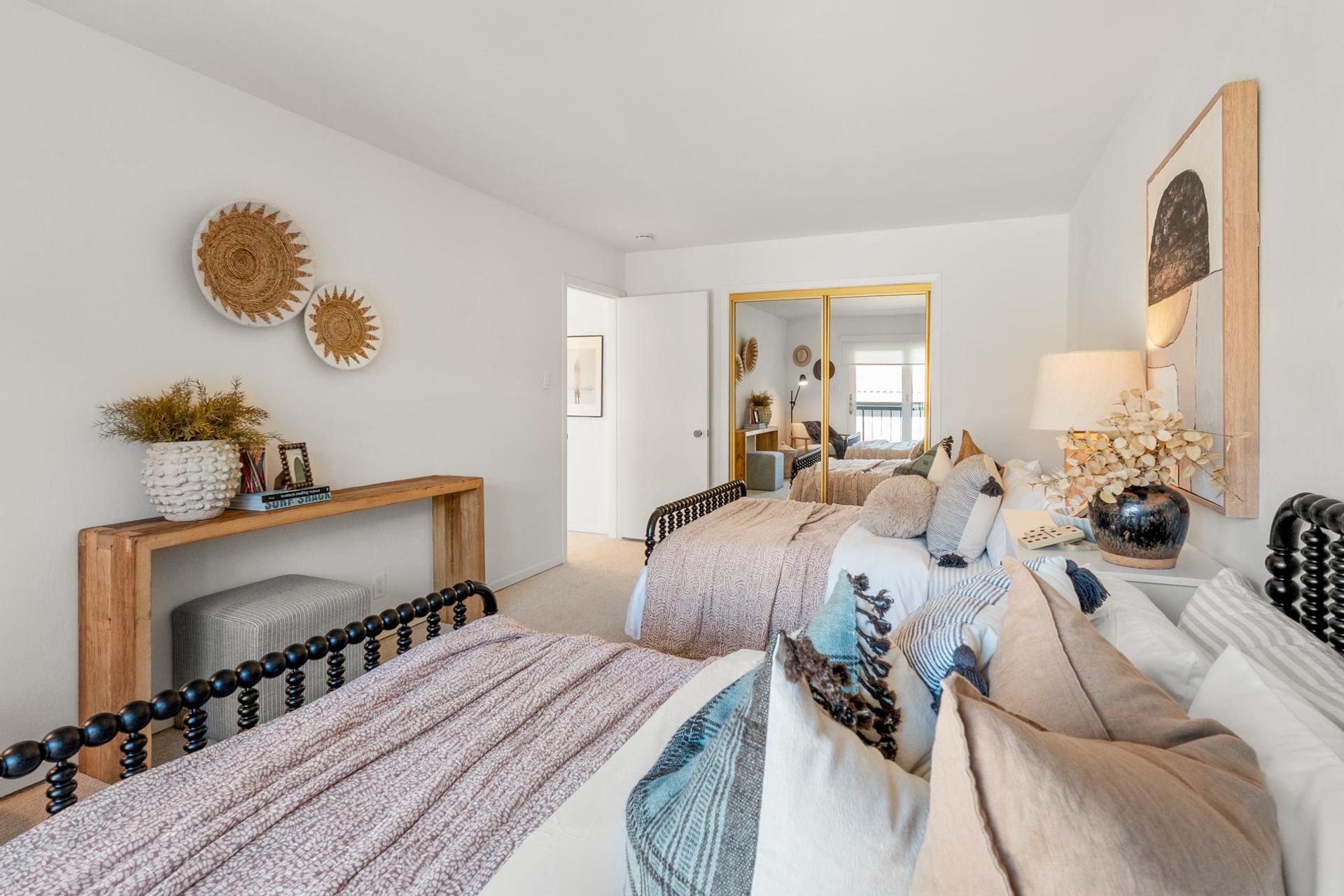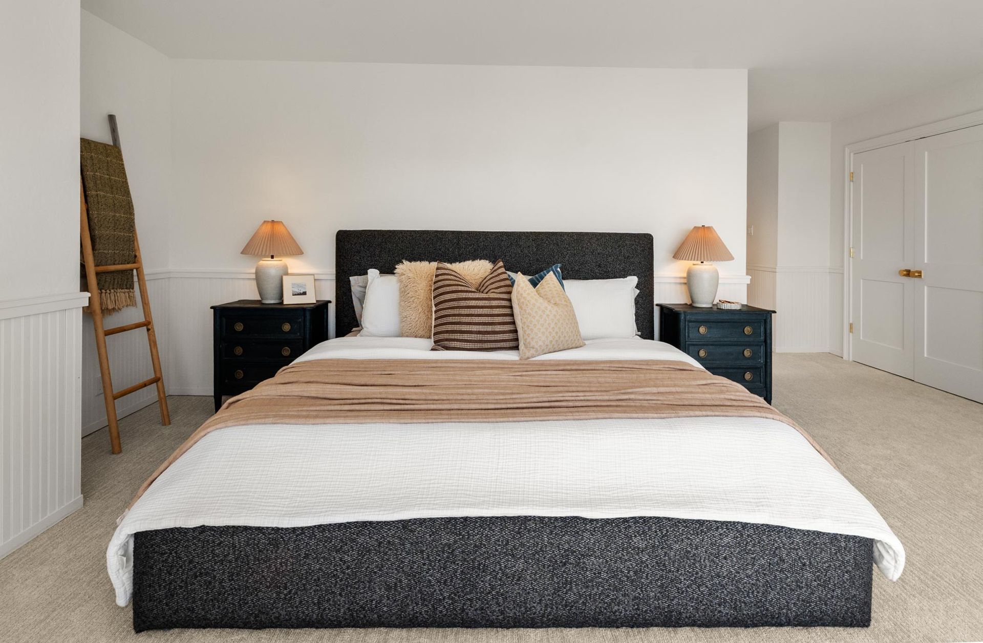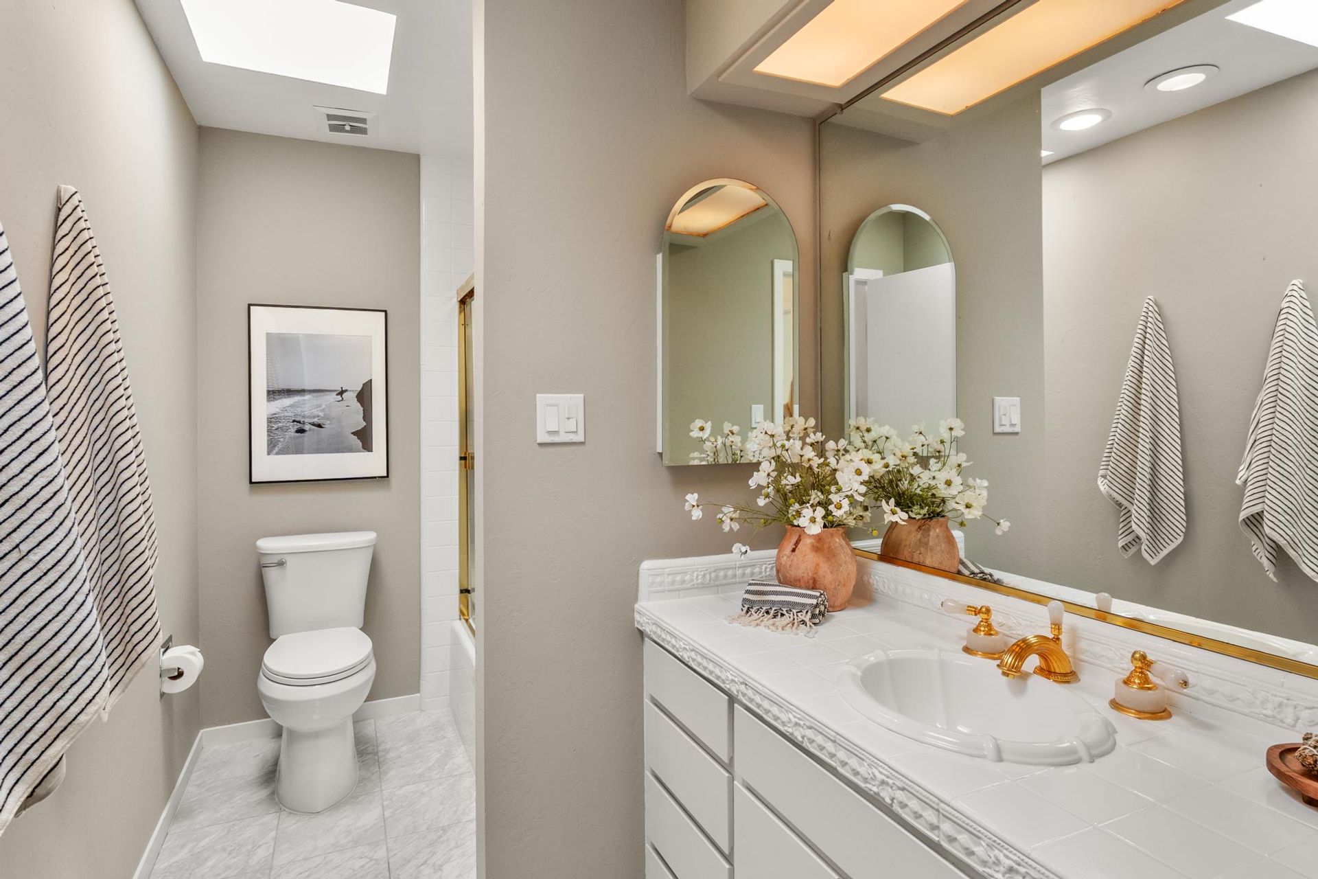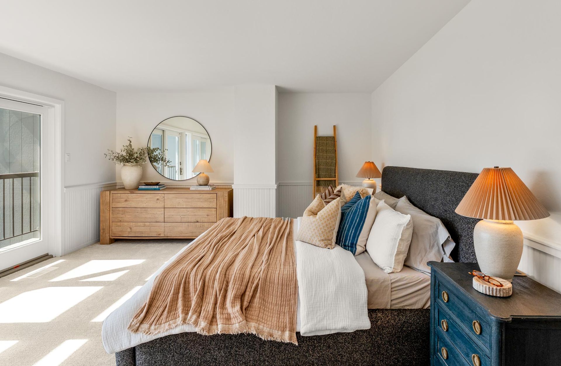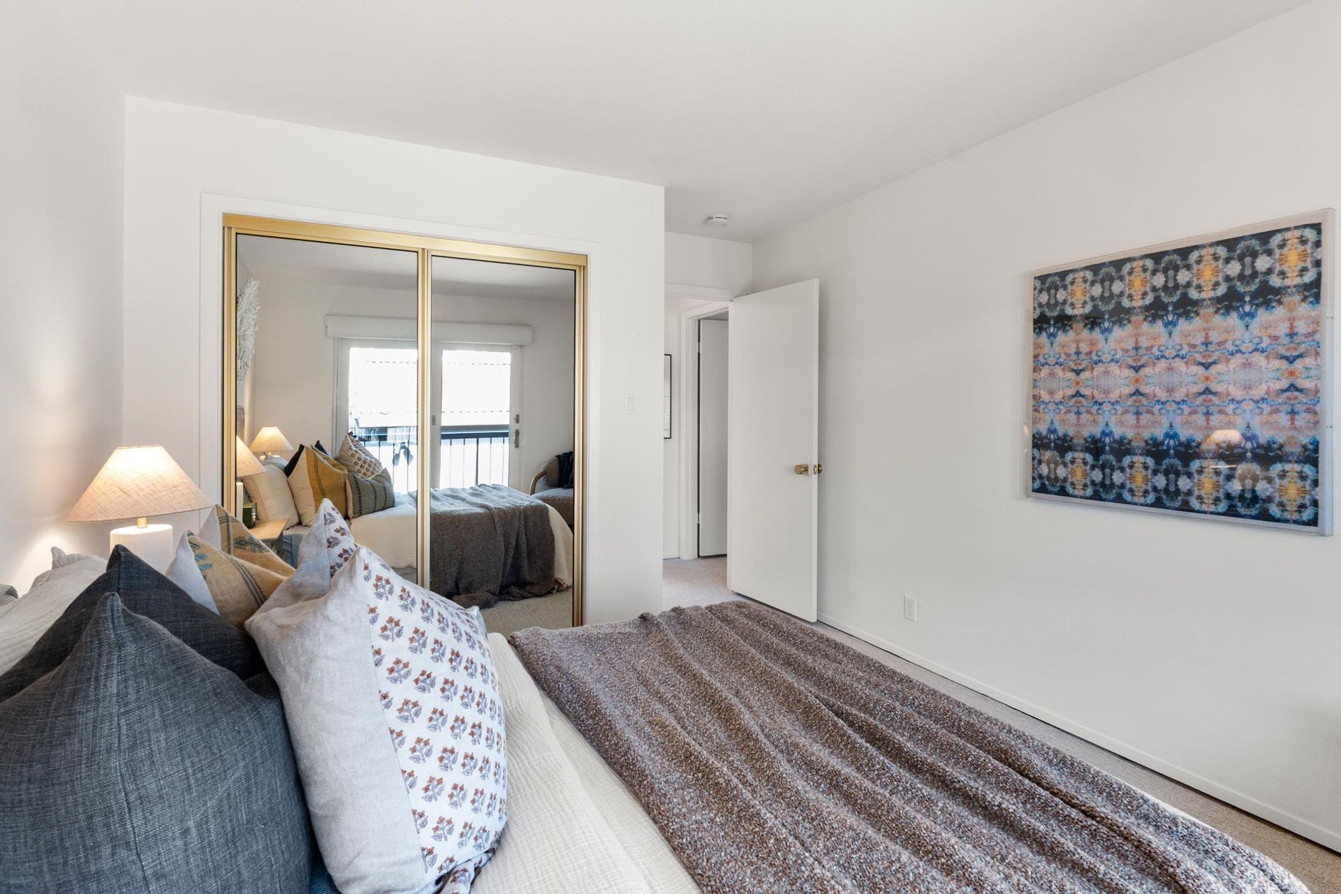 Upstairs, three bedrooms and two full bathrooms provide comfortable, flexible space for everyday life. The primary suite includes a private balcony with its own uninterrupted view of the Bay, a quiet spot to start or end the day. In-unit laundry adds a layer of practical convenience.
