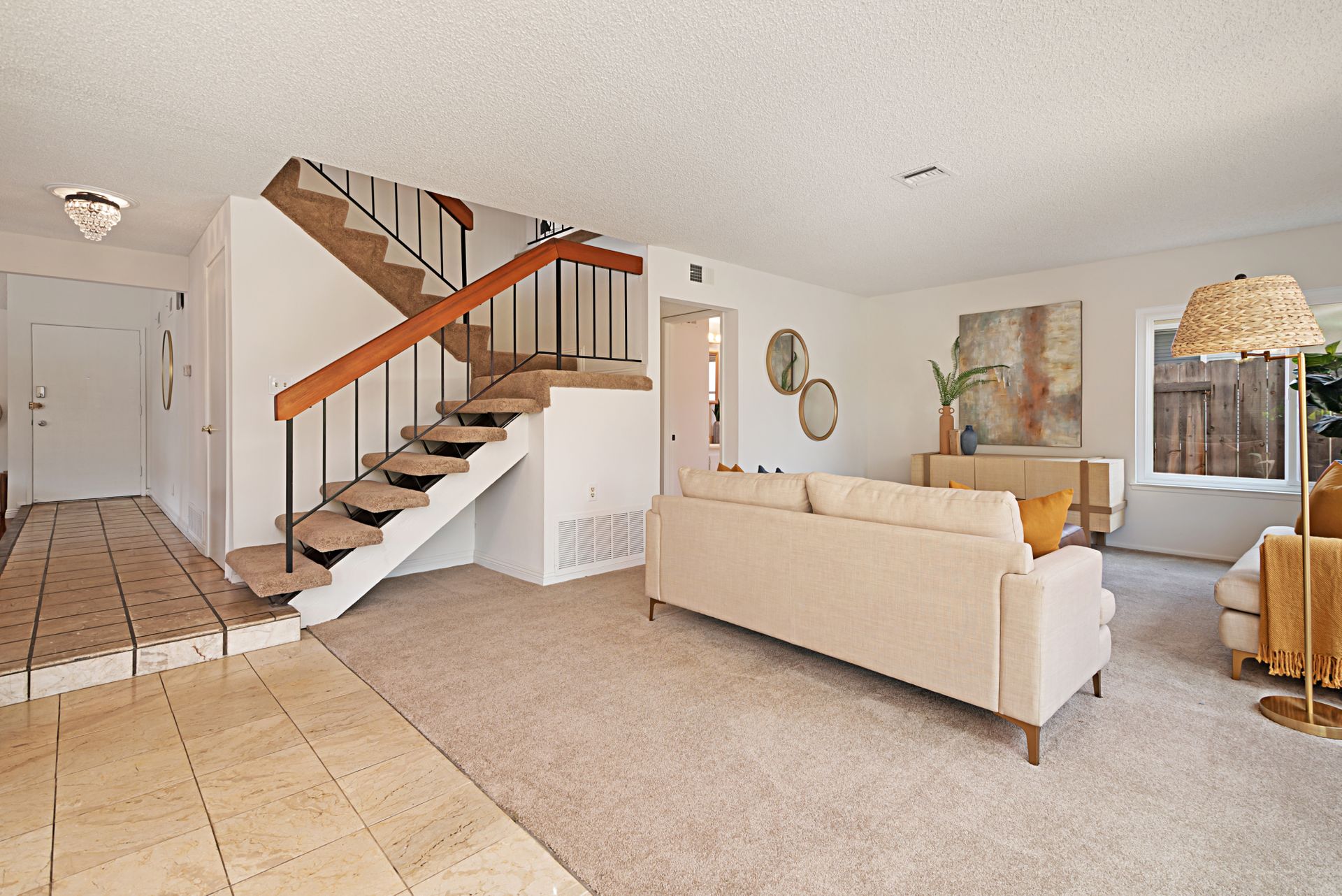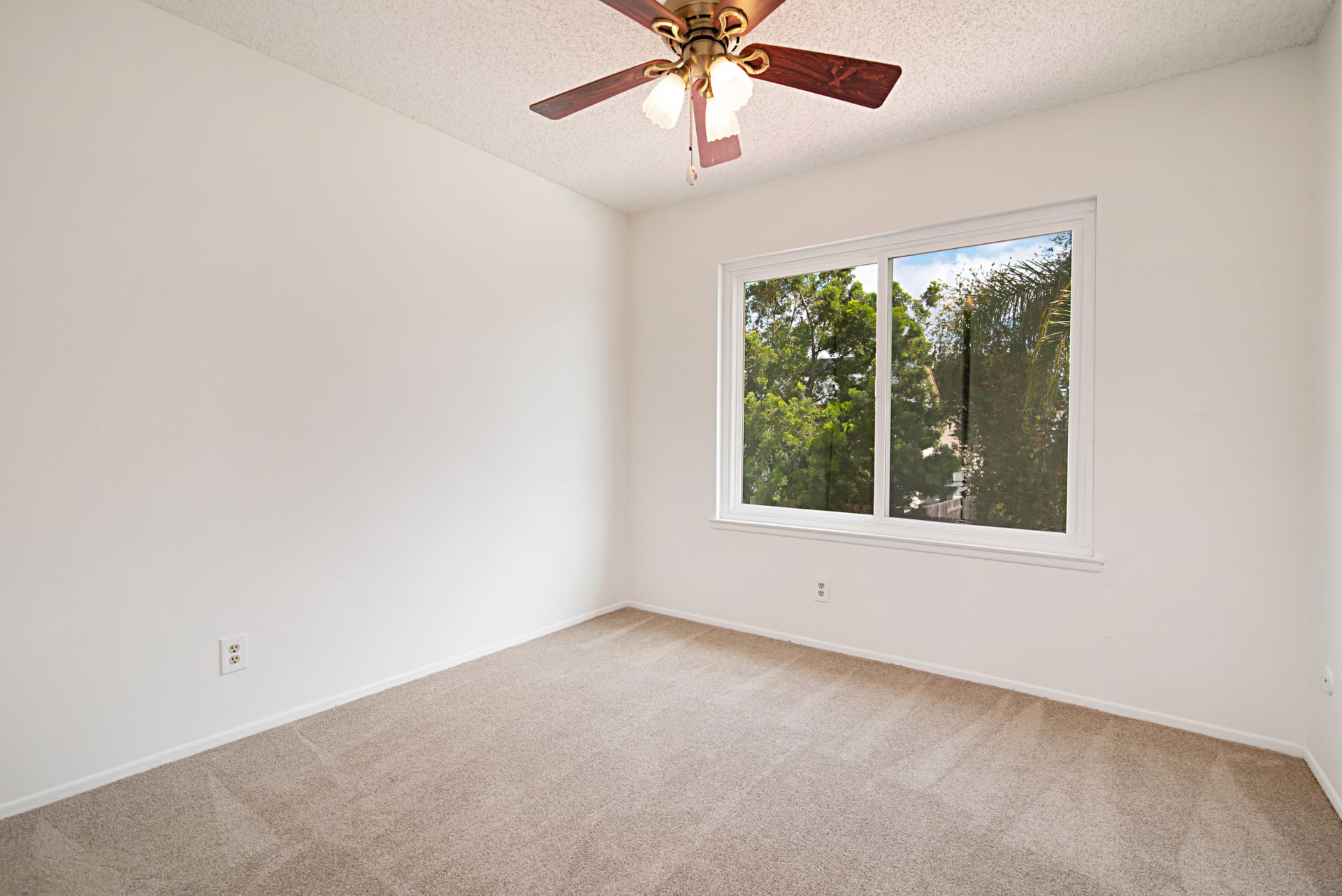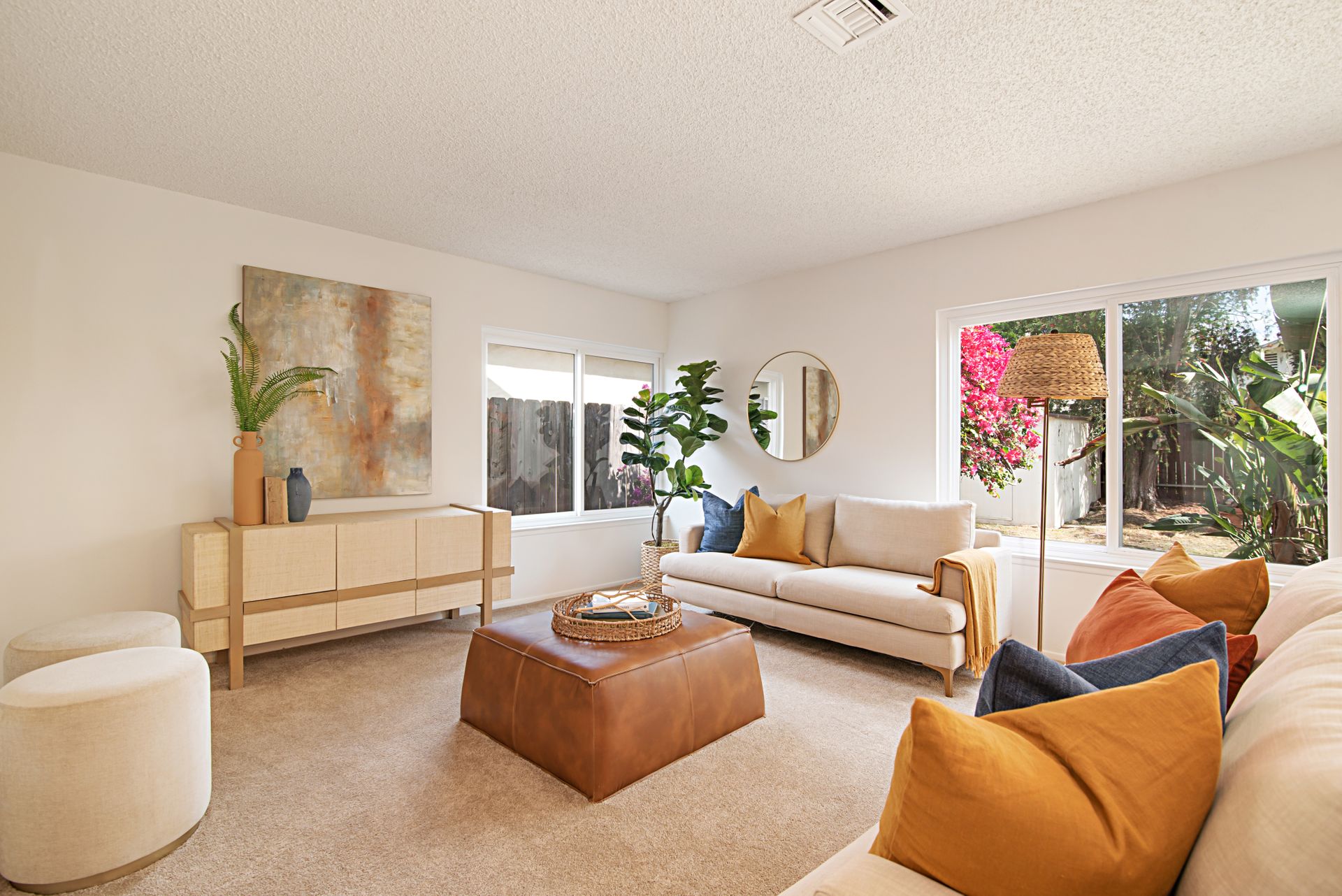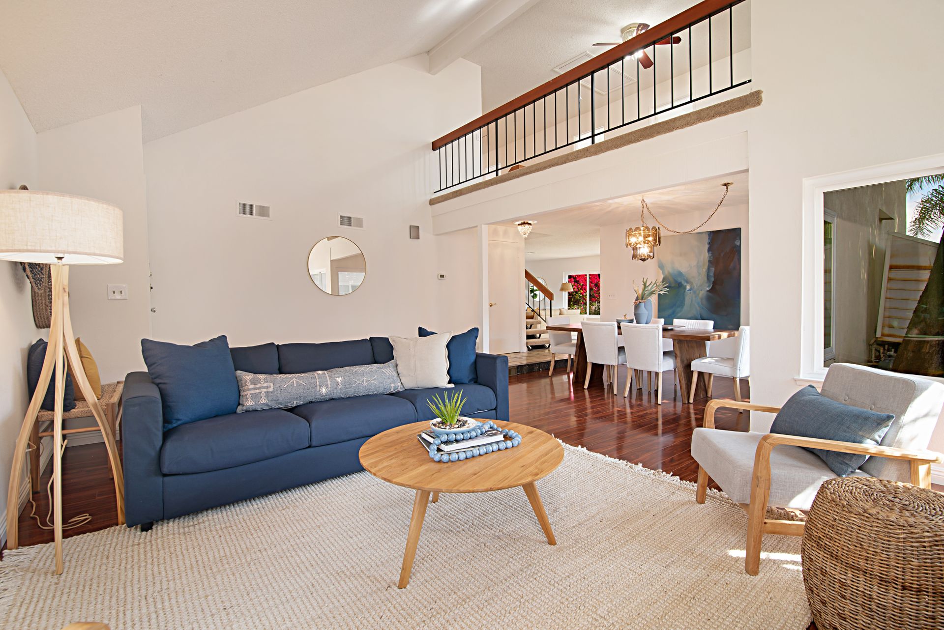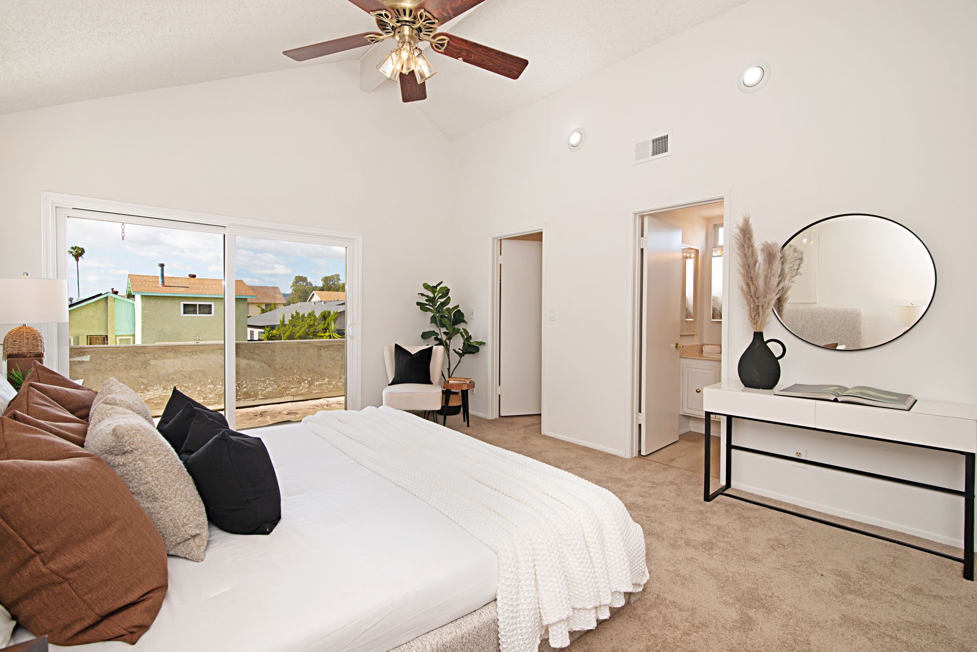 Highly desired Mira Mesa home including four bedrooms plus a loft and two and one-half baths is ready for new homeowners! The interior is freshly painted with new carpet throughout. As you enter you will find vaulted ceilings, a formal living room, a dining room and a fireplace. The kitchen is open to a bright family room with sliding glass door access to an amazing tropical backyard and patio. You will also find a newer stainless-steel refrigerator, a six-burner gas stove, along with washer/dryer that convey. The large primary suite includes vaulted ceiling, an ensuite bath and sliding glass door access to a balcony. You will love this home! The home has solar and water softener system. The community pool is located nearby.