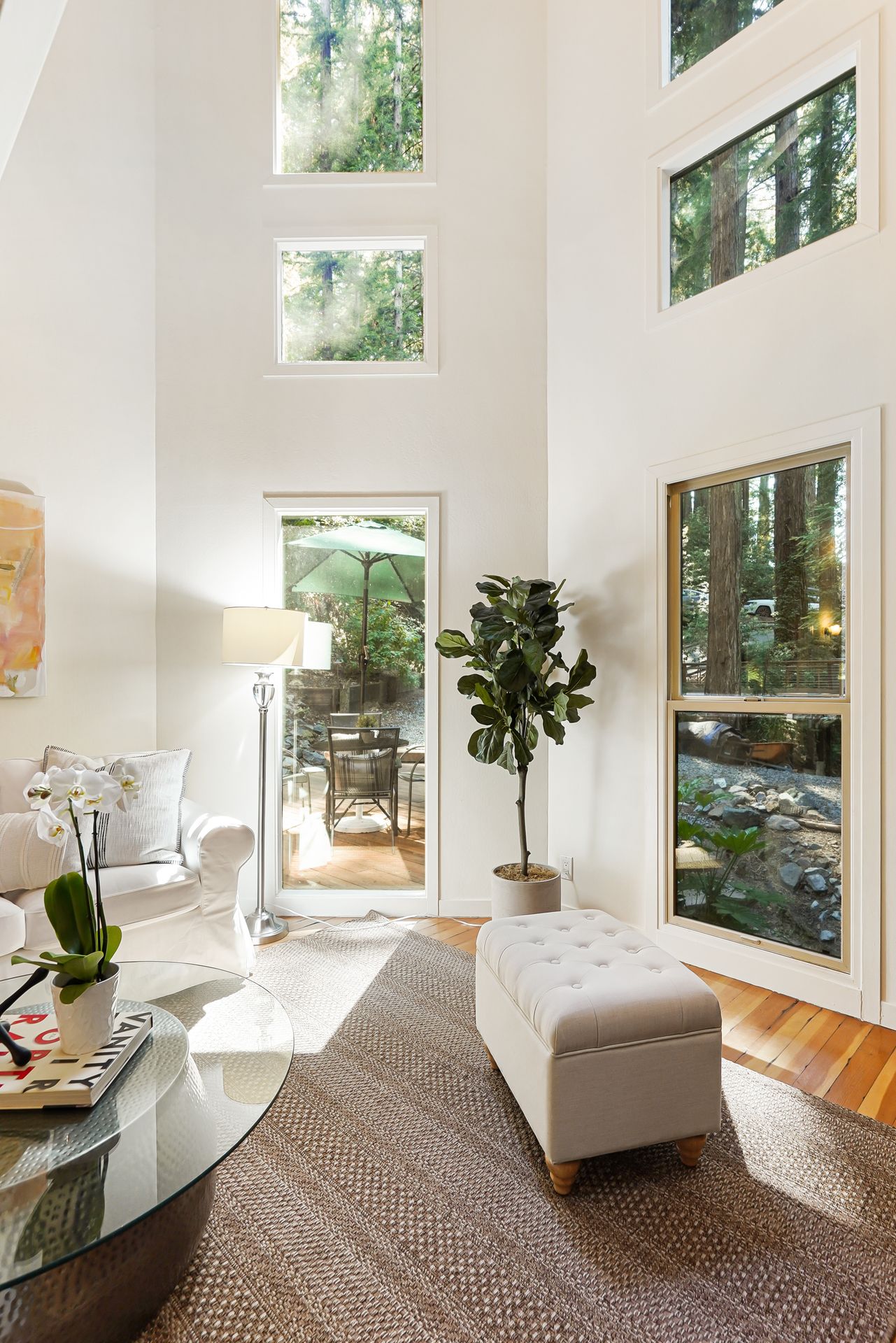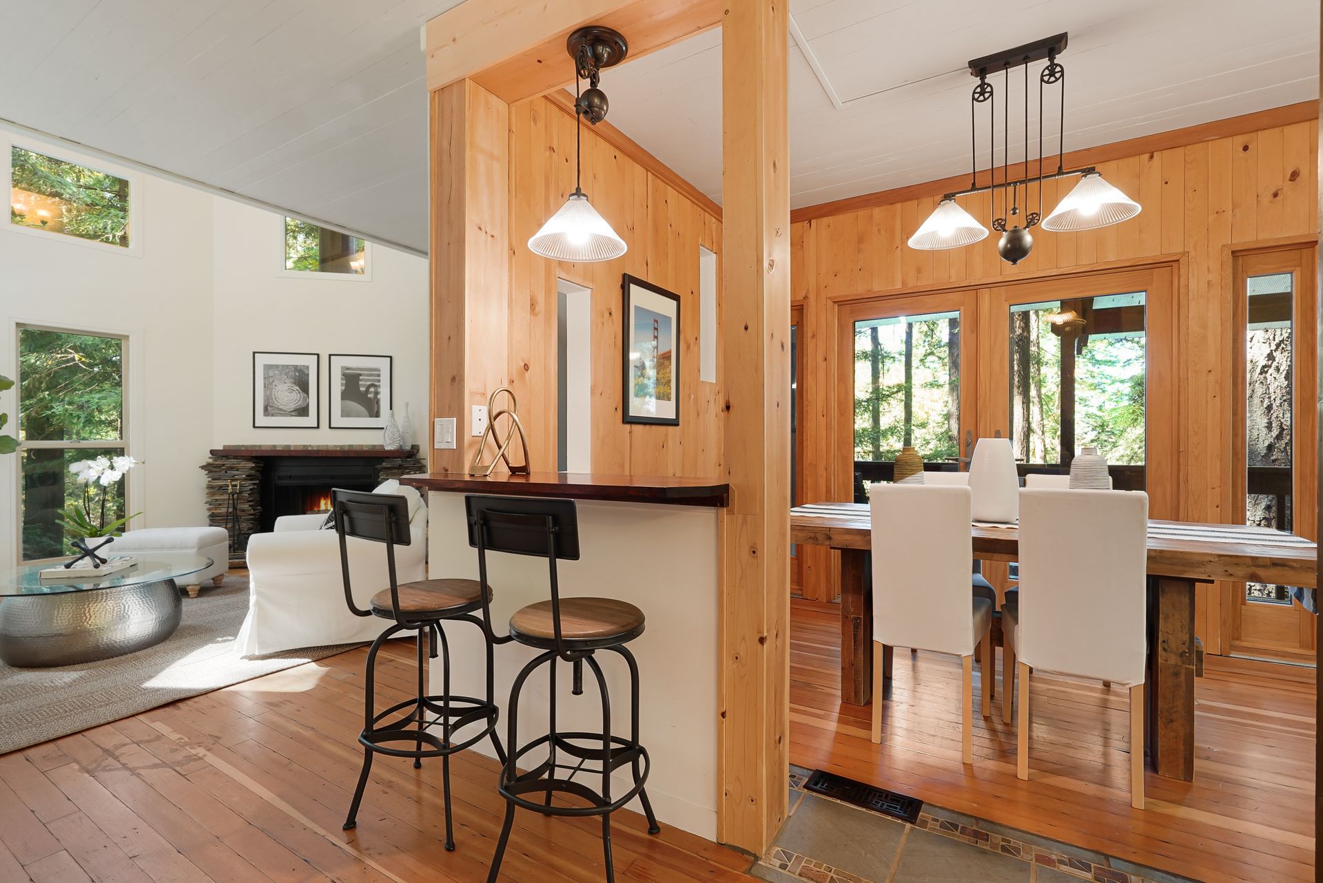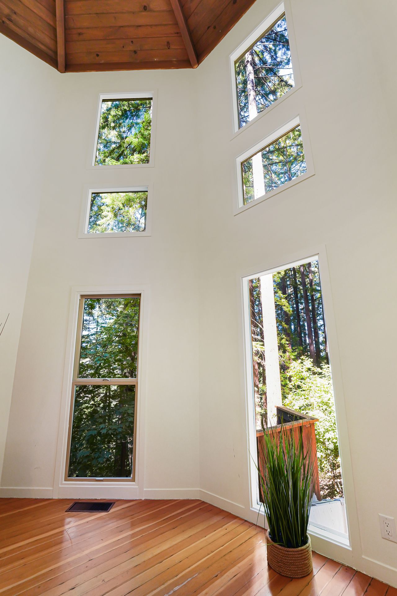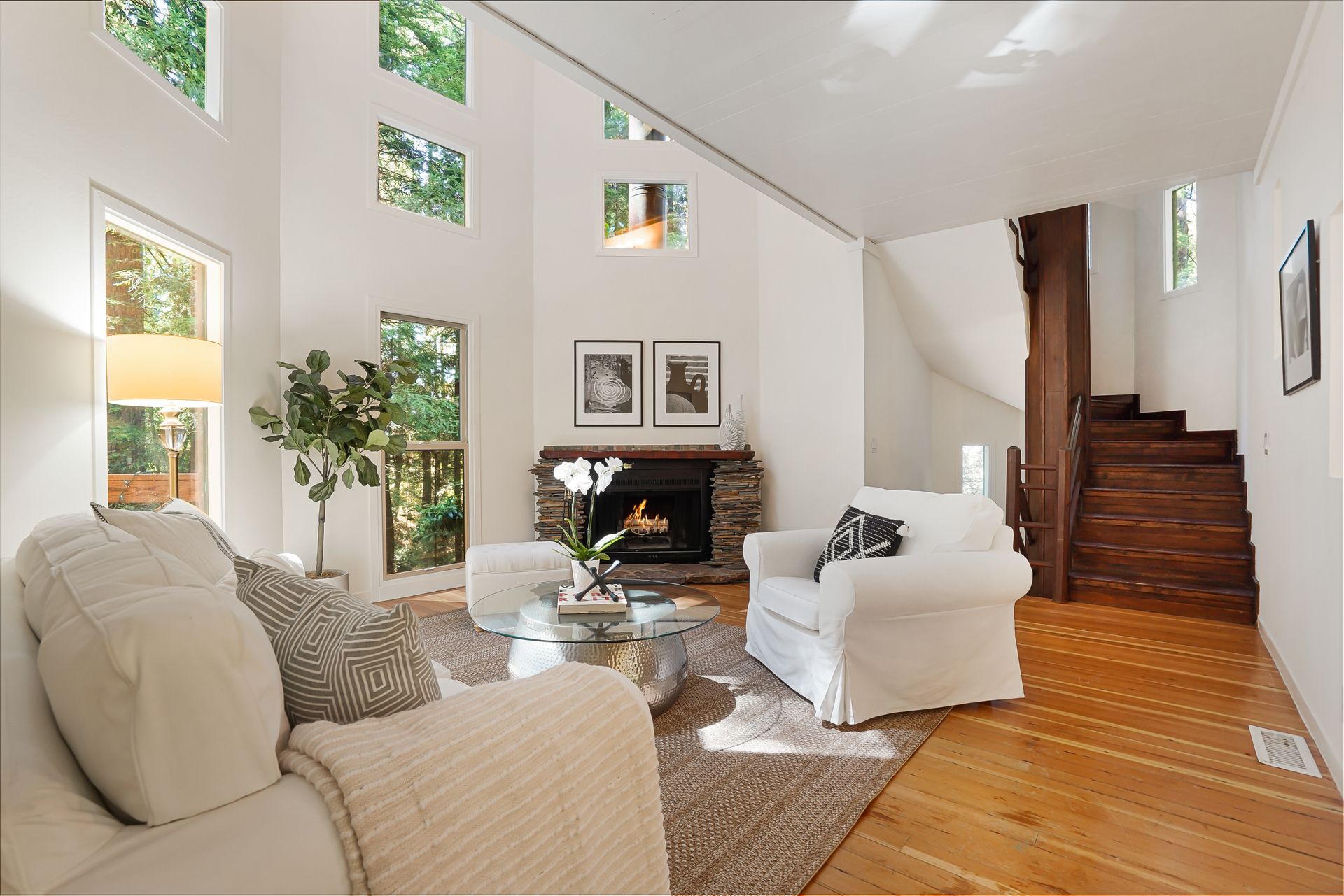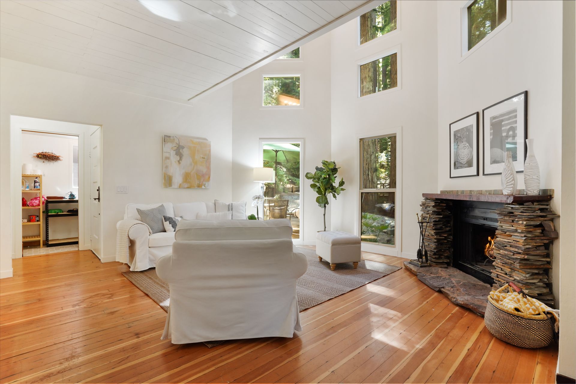 - Great room with flat stack supported hewn slab mantel, soaring ceiling and flanked by a floor to ceiling windows highlighting the surrounding redwood and the grandness of this powerful setting