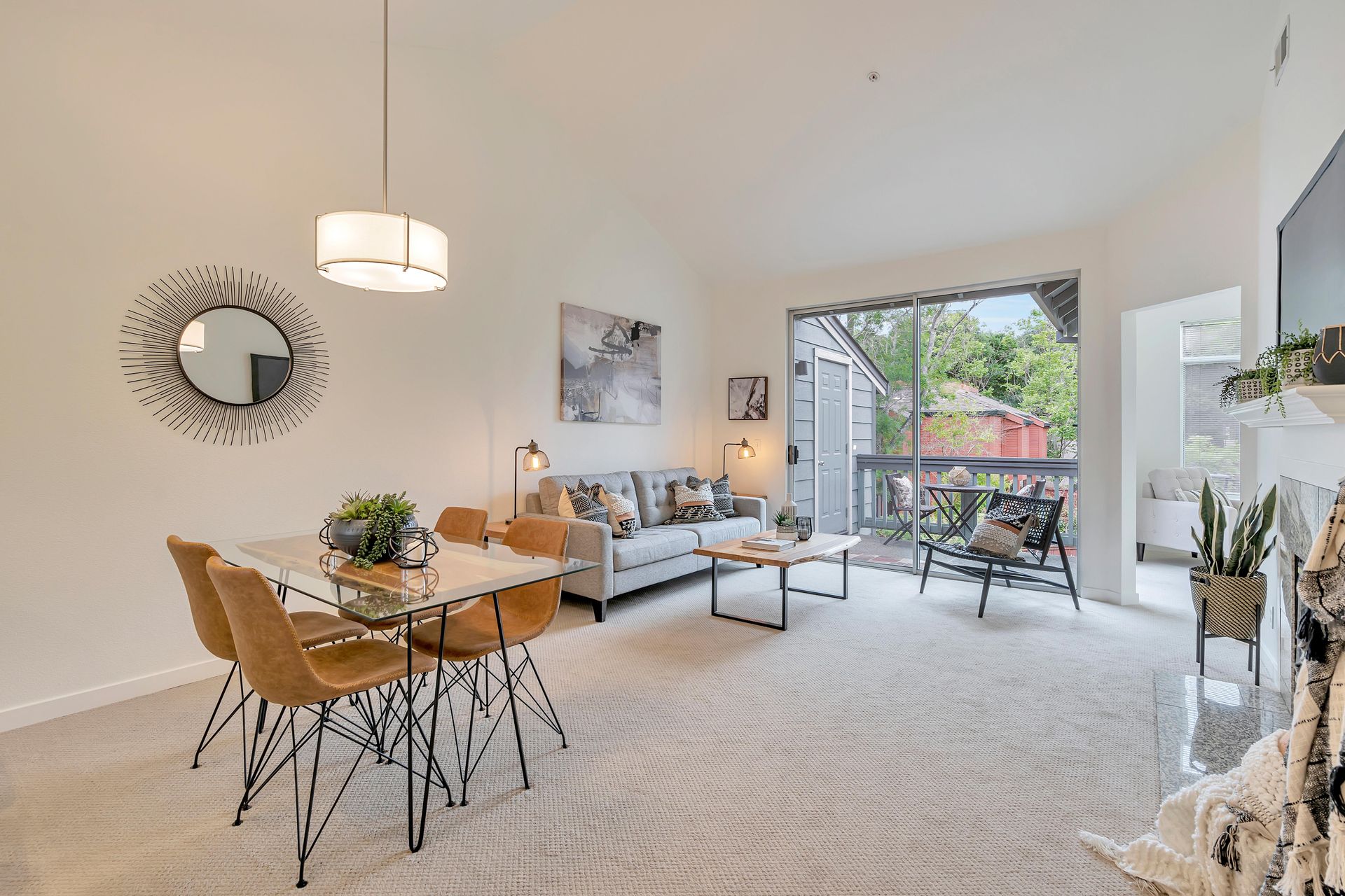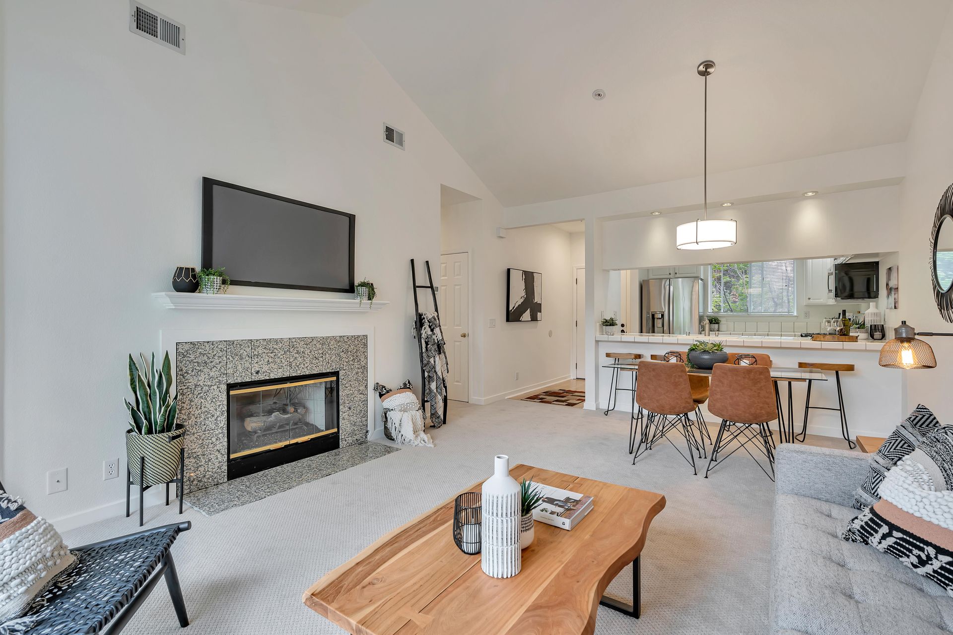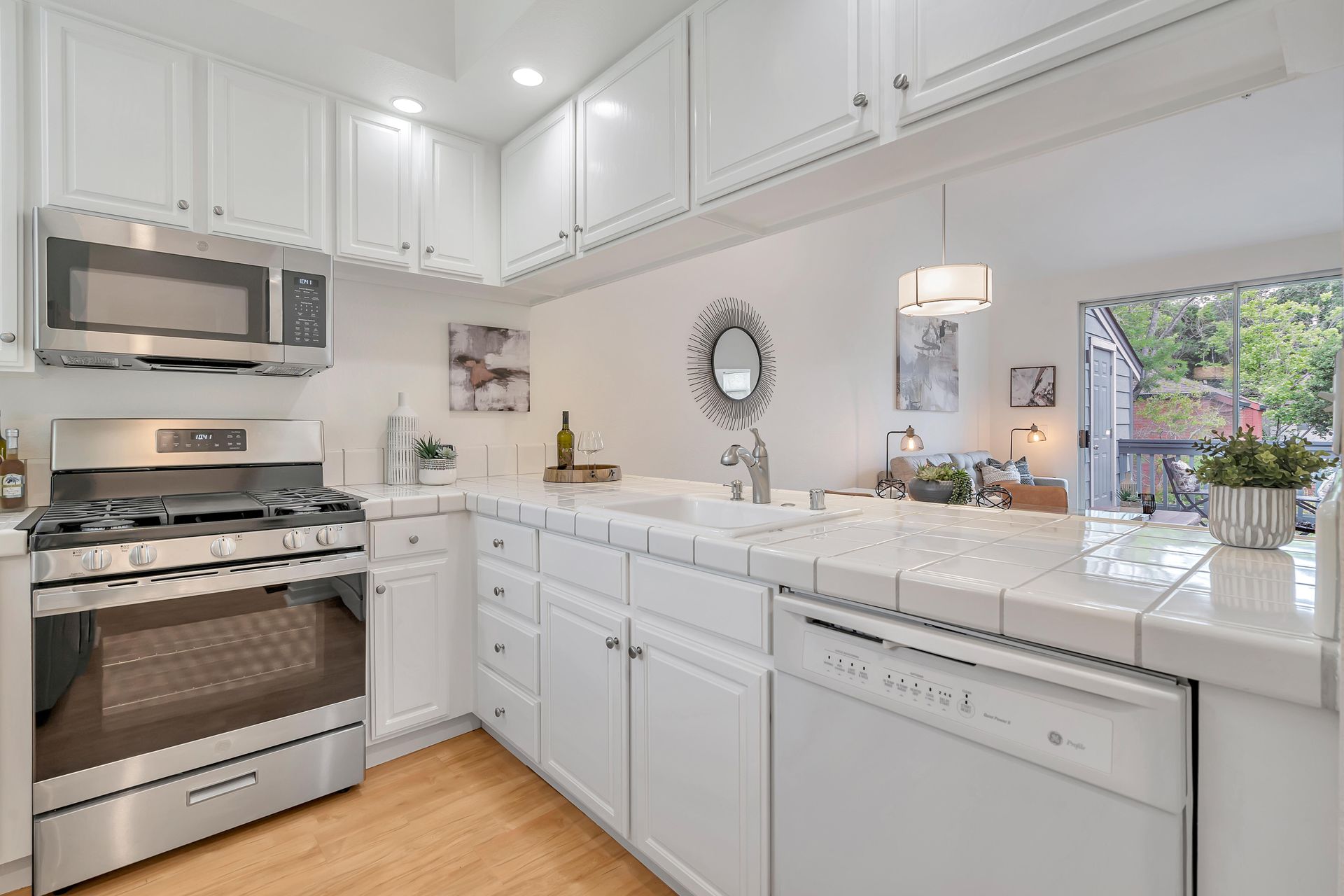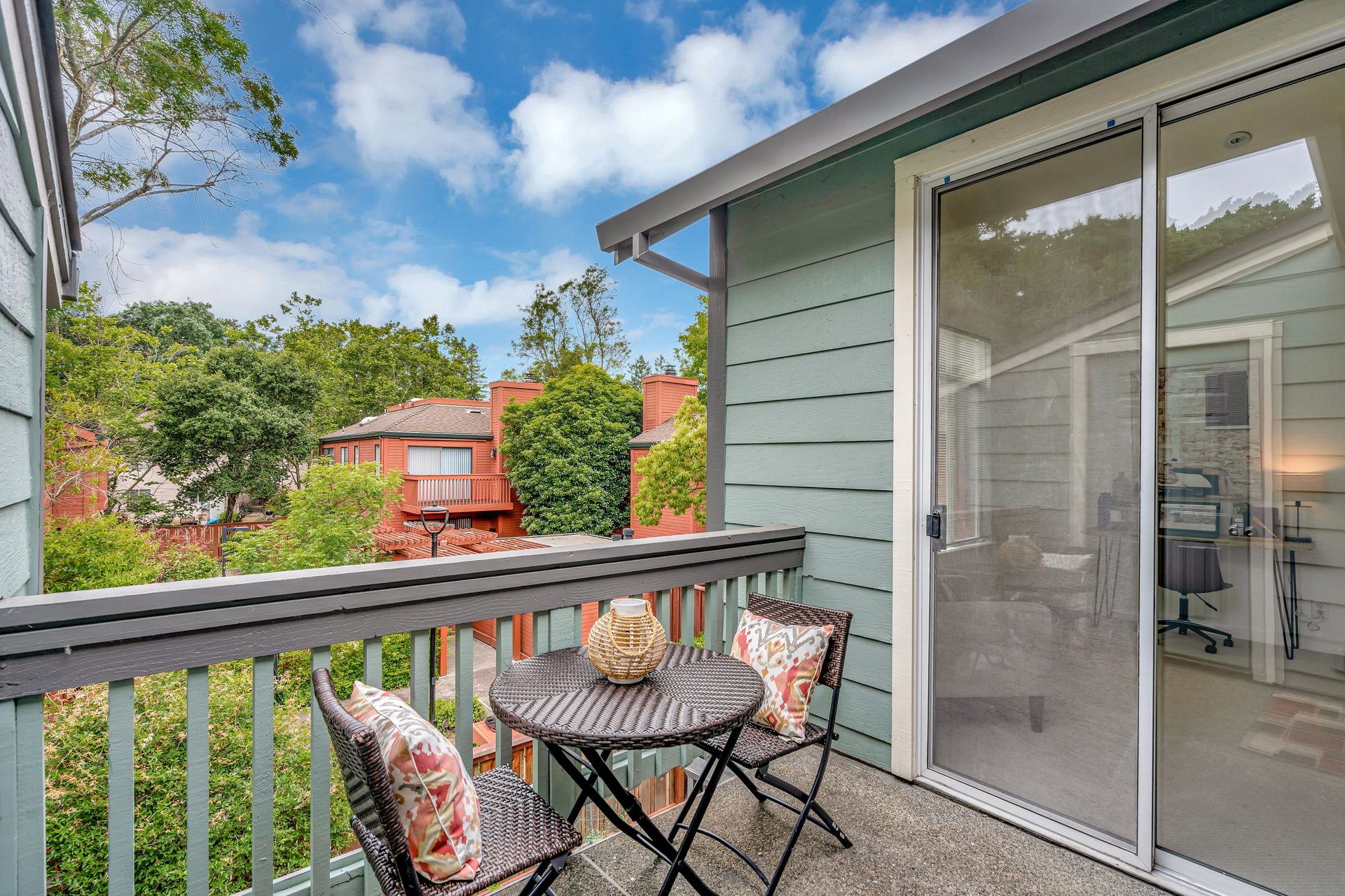 This is an amazing price for this charming, move-in ready, top floor end unit! Nestled on a private lane in a serene setting, this light and airy, two bedroom, two bath plus den (can be ideally used for a third bedroom) home features vaulted ceilings, a fireplace, newer carpeting, fresh paint, a newly installed stainless stove/microwave, a single-car garage with storage and one additional assigned parking spot. Enjoy summer evenings on your private balcony or stroll to town for shopping and fine restaurants.