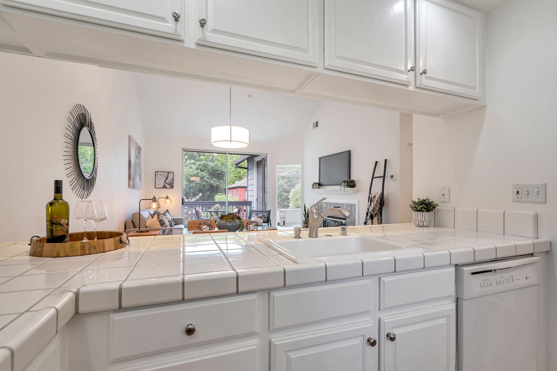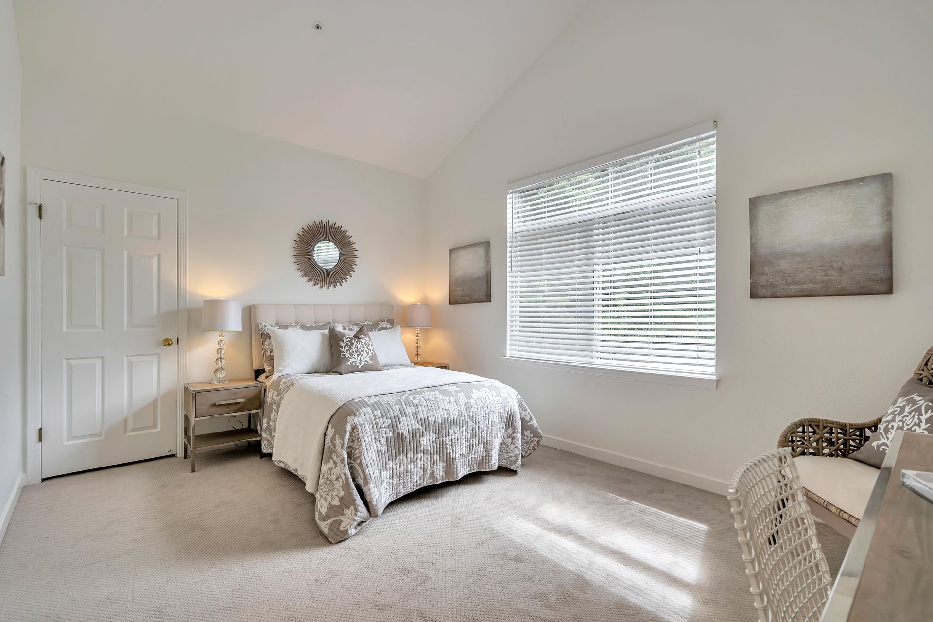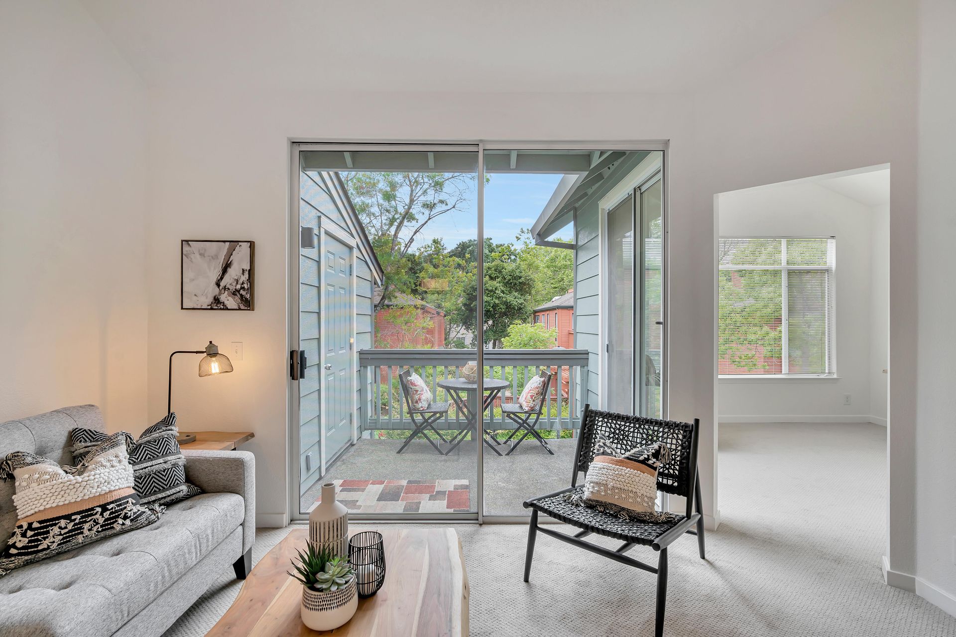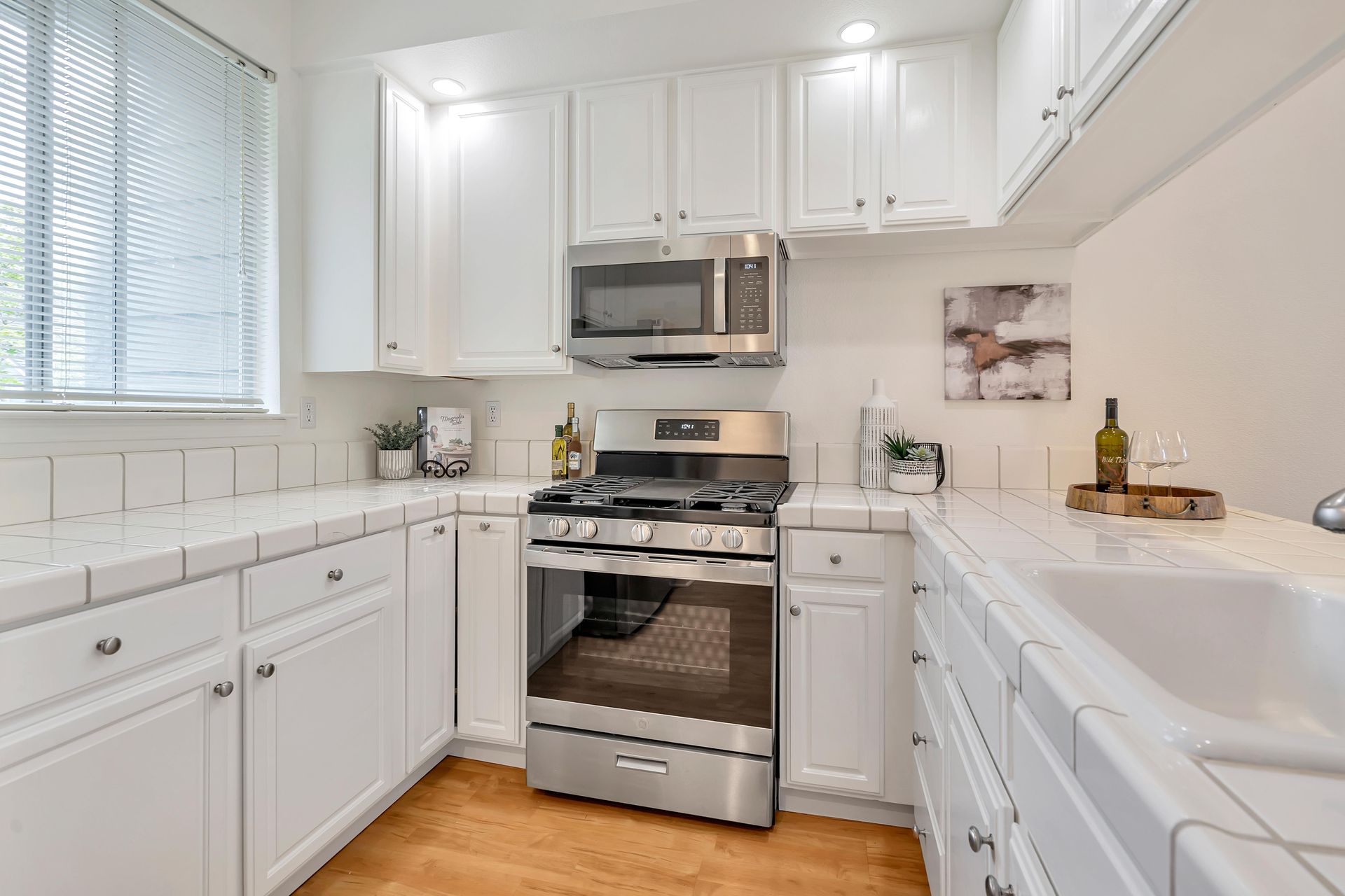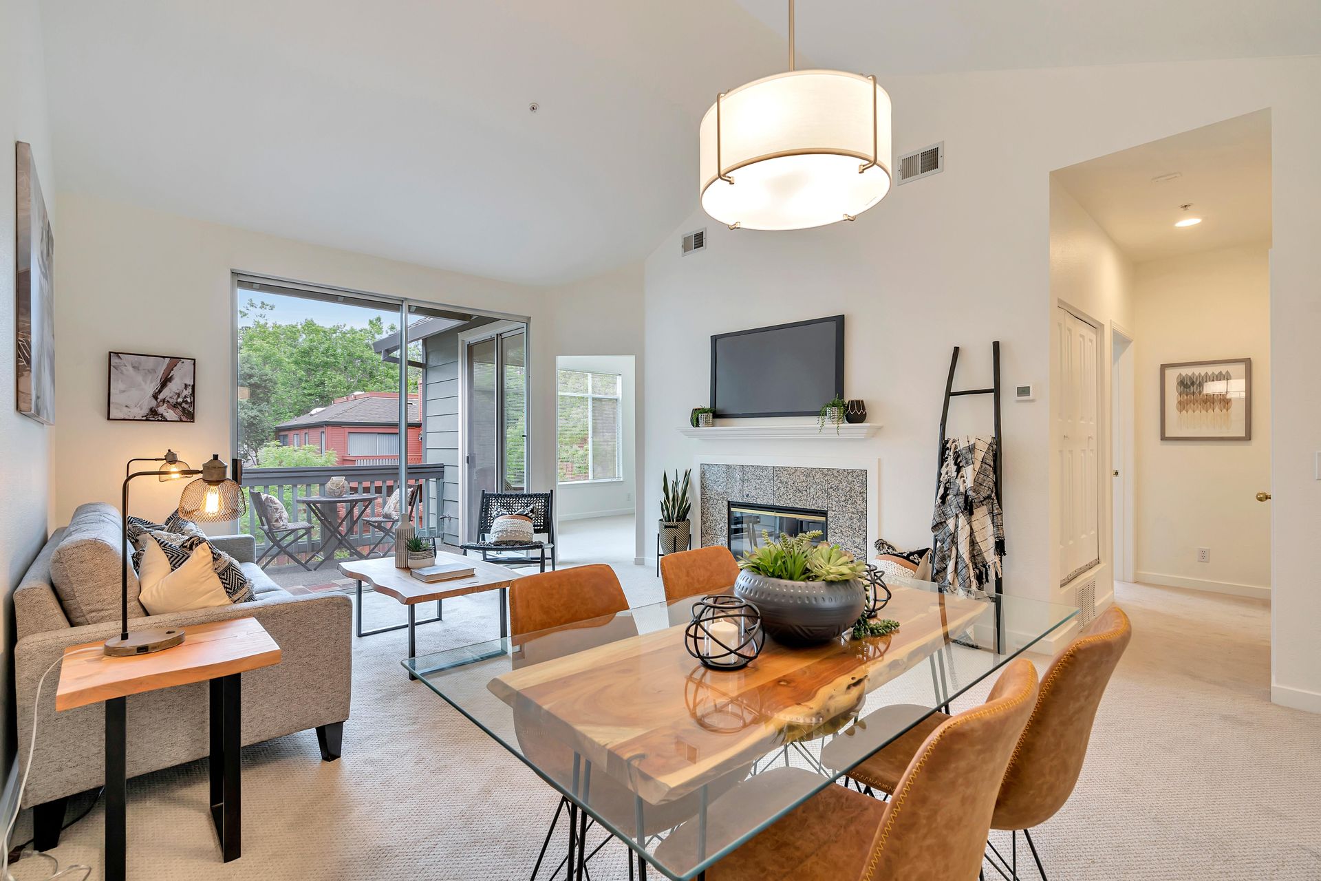 This is an amazing price for this charming, move-in ready, top floor end unit! Nestled on a private lane in a serene setting, this light and airy, two bedroom, two bath plus den (can be ideally used for a third bedroom) home features vaulted ceilings, a fireplace, newer carpeting, fresh paint, a newly installed stainless stove/microwave, a single-car garage with storage and one additional assigned parking spot. Enjoy summer evenings on your private balcony or stroll to town for shopping and fine restaurants.