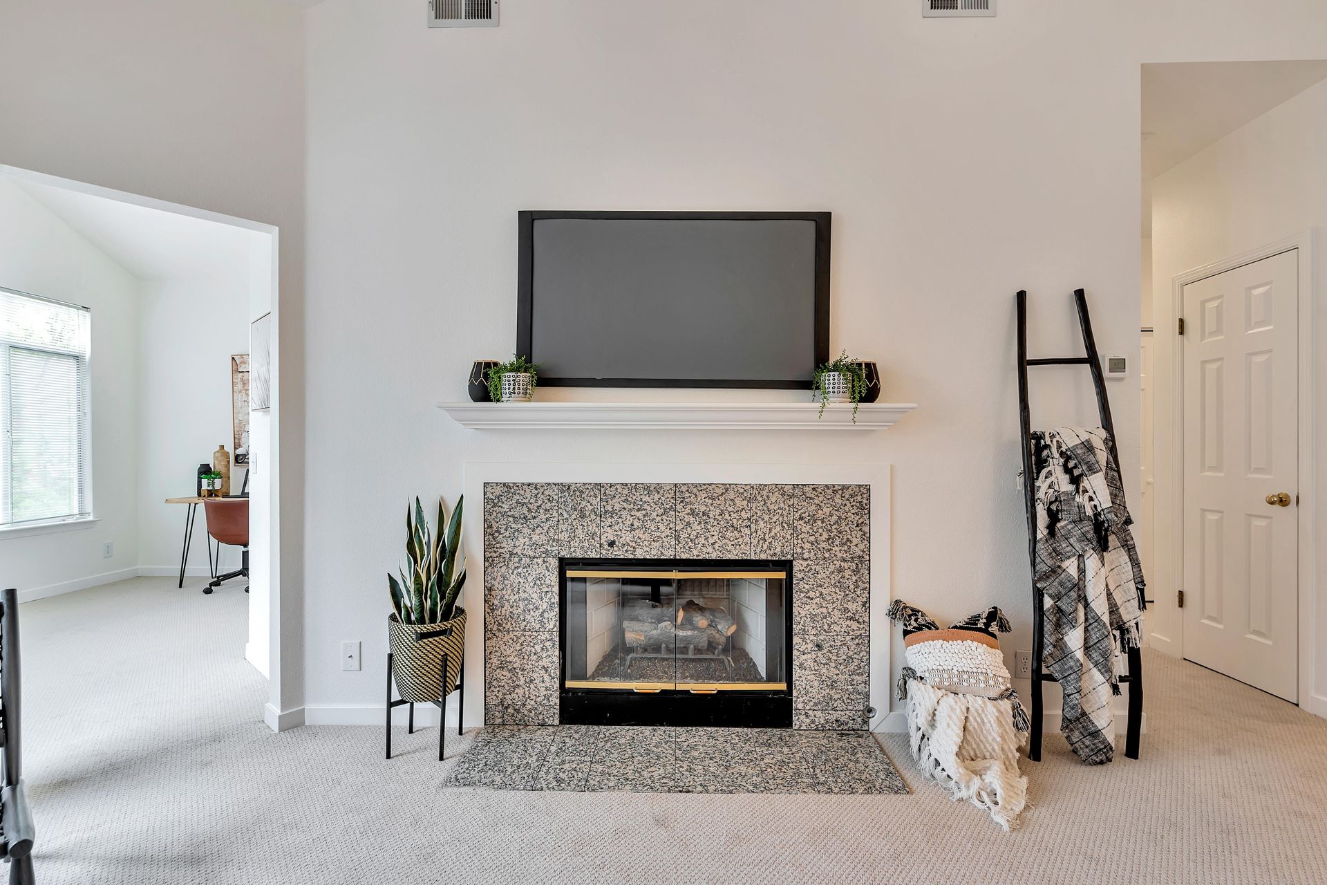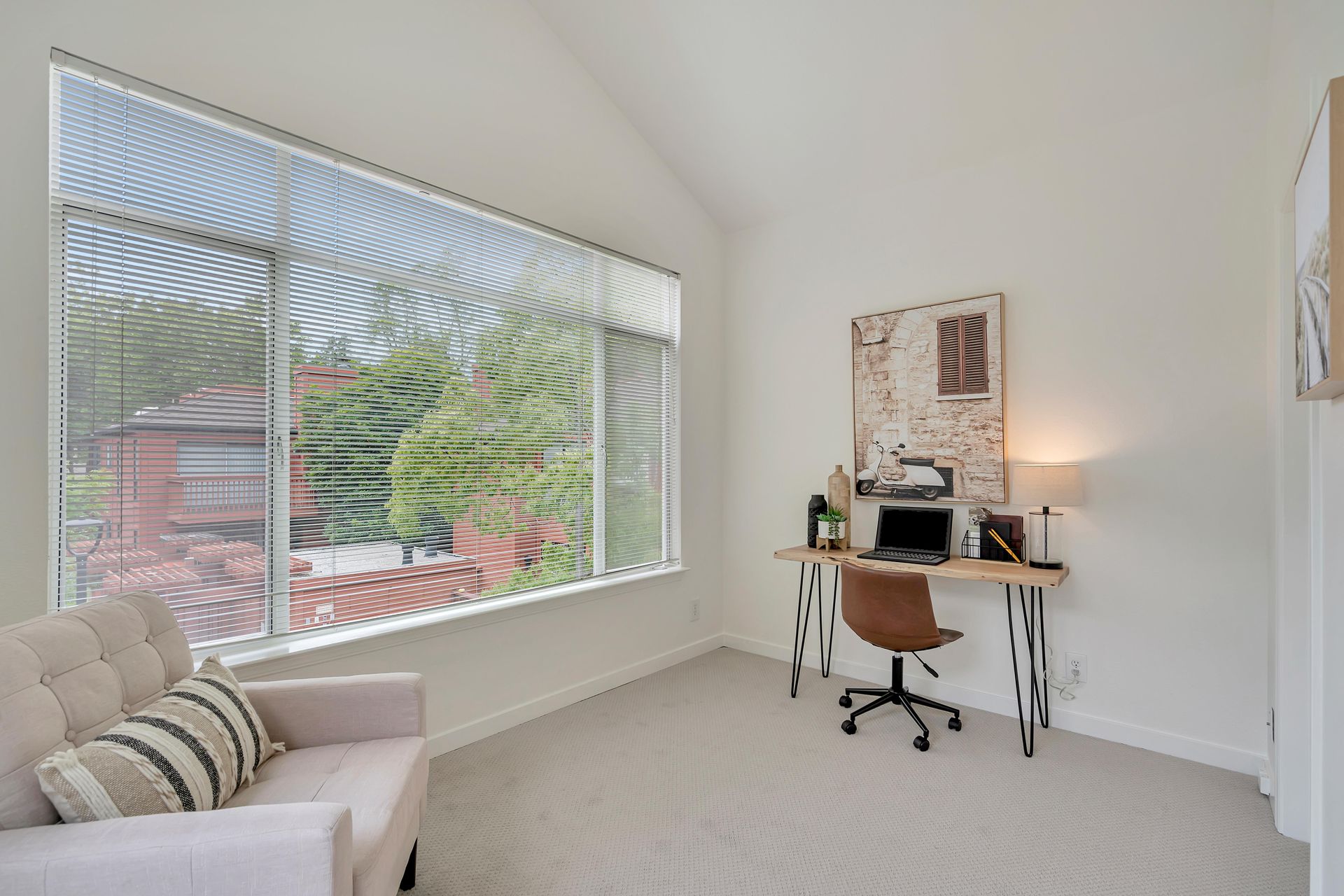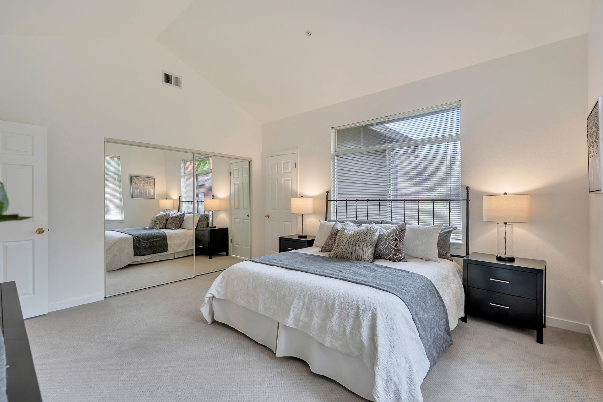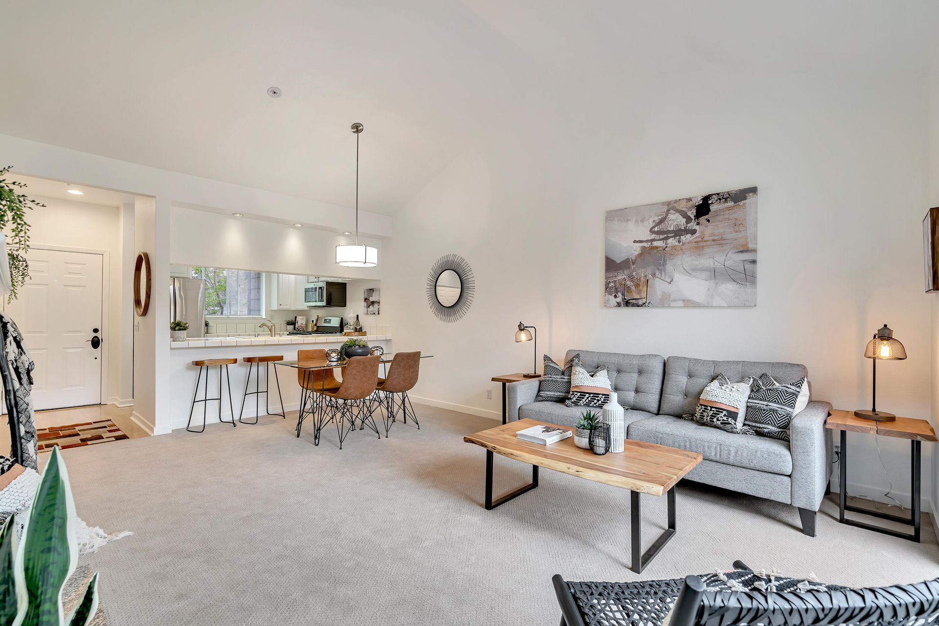 This is an amazing price for this charming, move-in ready, top floor end unit! Nestled on a private lane in a serene setting, this light and airy, two bedroom, two bath plus den (can be ideally used for a third bedroom) home features vaulted ceilings, a fireplace, newer carpeting, fresh paint, a newly installed stainless stove/microwave, a single-car garage with storage and one additional assigned parking spot. Enjoy summer evenings on your private balcony or stroll to town for shopping and fine restaurants.