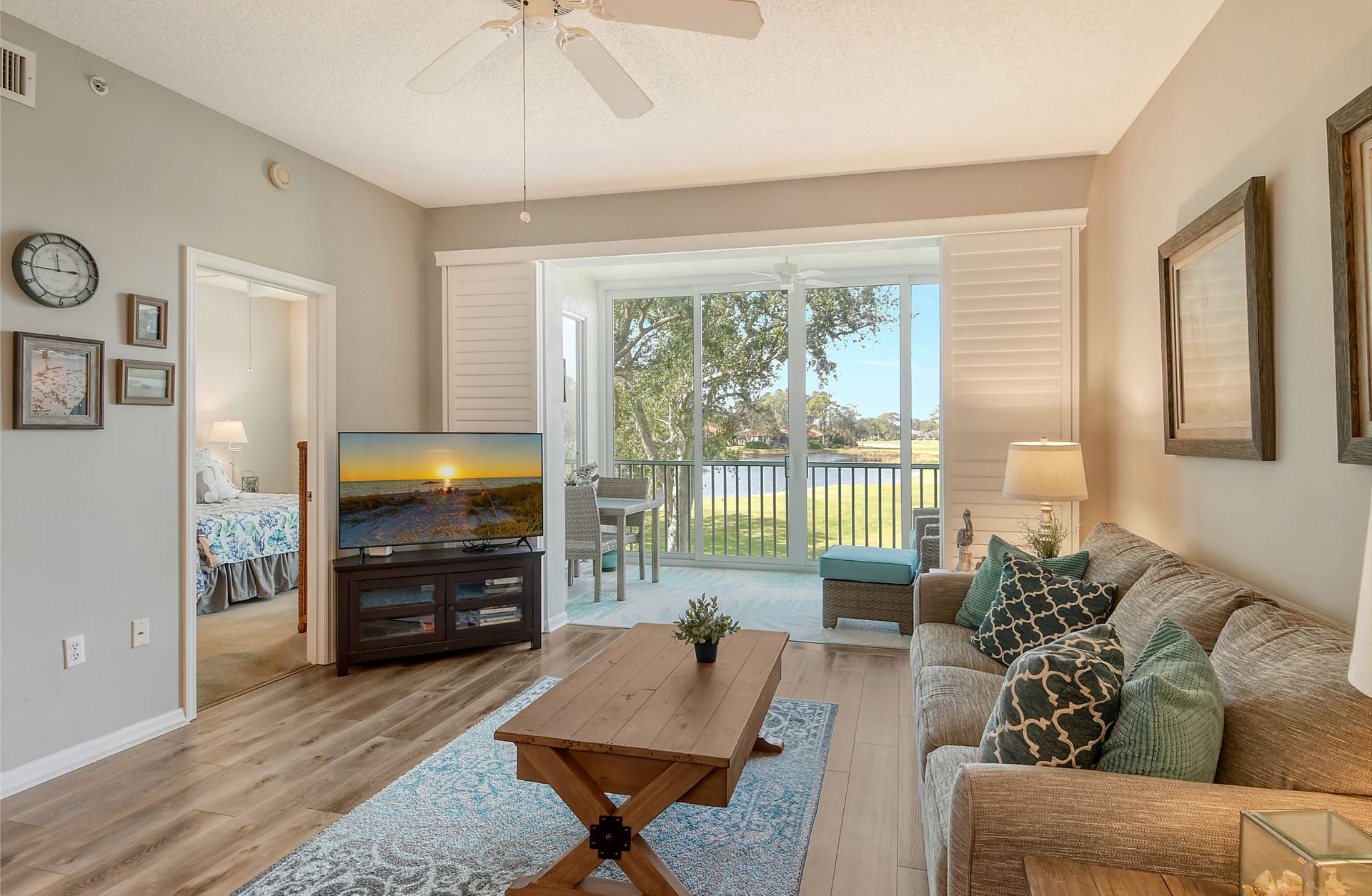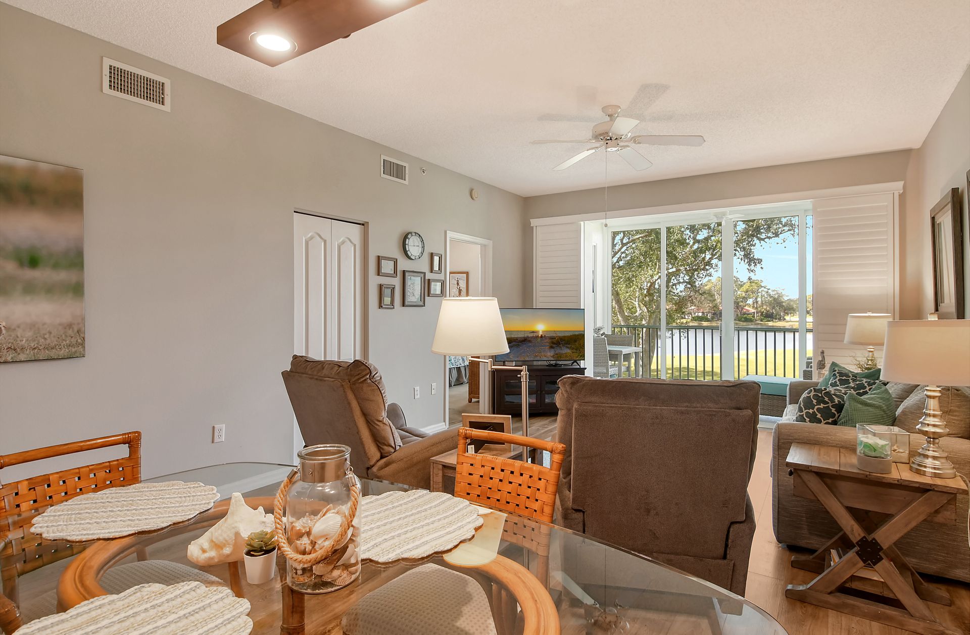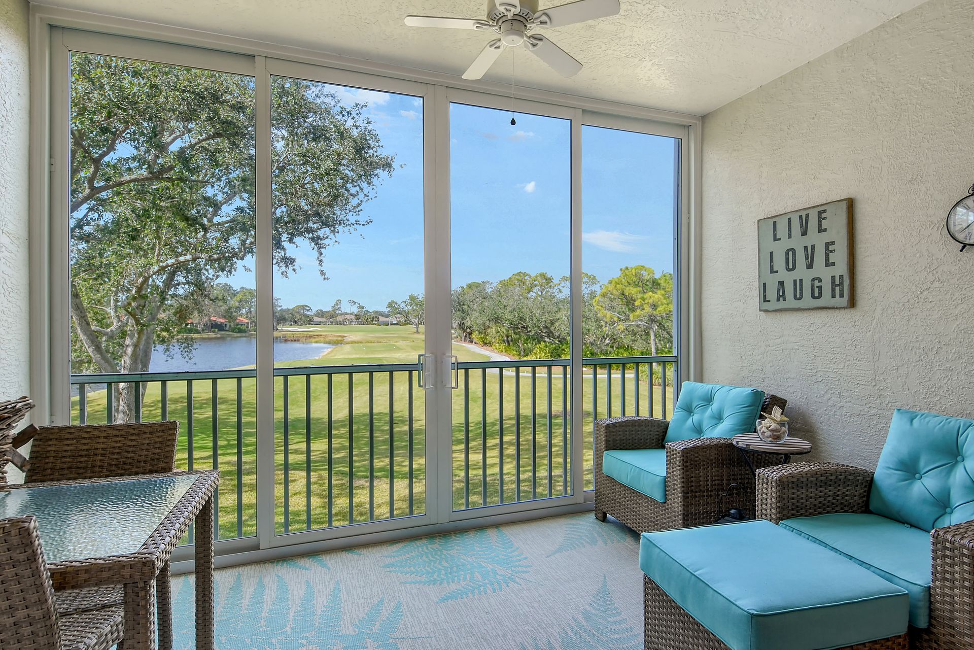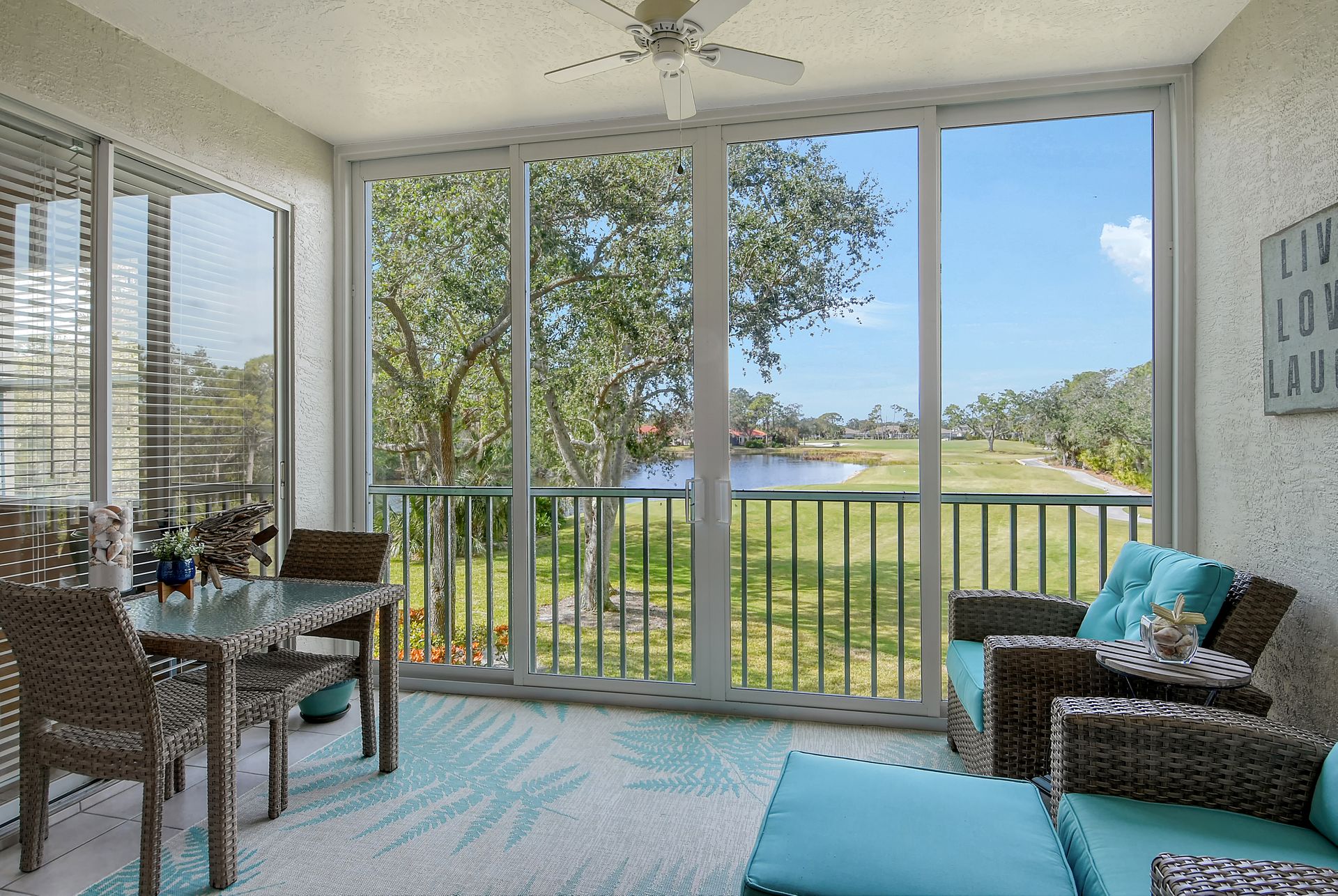 This beautifully furnished second-floor condo offers stunning views of the lake and the 9th Tee. Recently updated, you'll love the bright and open floor plan enhanced by impact windows throughout. The well-appointed kitchen is equipped with white cabinetry, granite countertops, stainless steel appliances and a dinette area that comfortably seats two to four people. The spacious living and dining areas seamlessly lead to a glass-enclosed lanai, with built-in screens for outdoor enjoyment and additional living space. The primary bedroom, with its generous walk-in closet, offers direct access to the lanai, providing picturesque views of the golf course and lake. The ensuite bathroom is equipped with a walk-in shower and ample counter space for two people. The guest room is equally inviting with two twin beds, while the guest bathroom conveniently houses a full-sized washer and dryer in the closet. The Terrace is a vibrant neighborhood with numerous social events and amenities, including a community pool, tennis and pickleball courts. Each unit includes its own carport space plus an external storage closet. Stoneybrook, a premier member-owned country club, features a newly redesigned Arthur Hill 18-hole golf course, a pro shop, indoor and outdoor dining options, a Har-Tru tennis facility, an impressive fitness center, and an additional community pool and spa. Perfectly situated just minutes from Siesta Key, a variety of shopping options, and adjacent to the Legacy Trail, this condo offers the perfect opportunity to enjoy the sought-after Sarasota Lifestyle. Schedule your appointment today to experience this exceptional property firsthand!