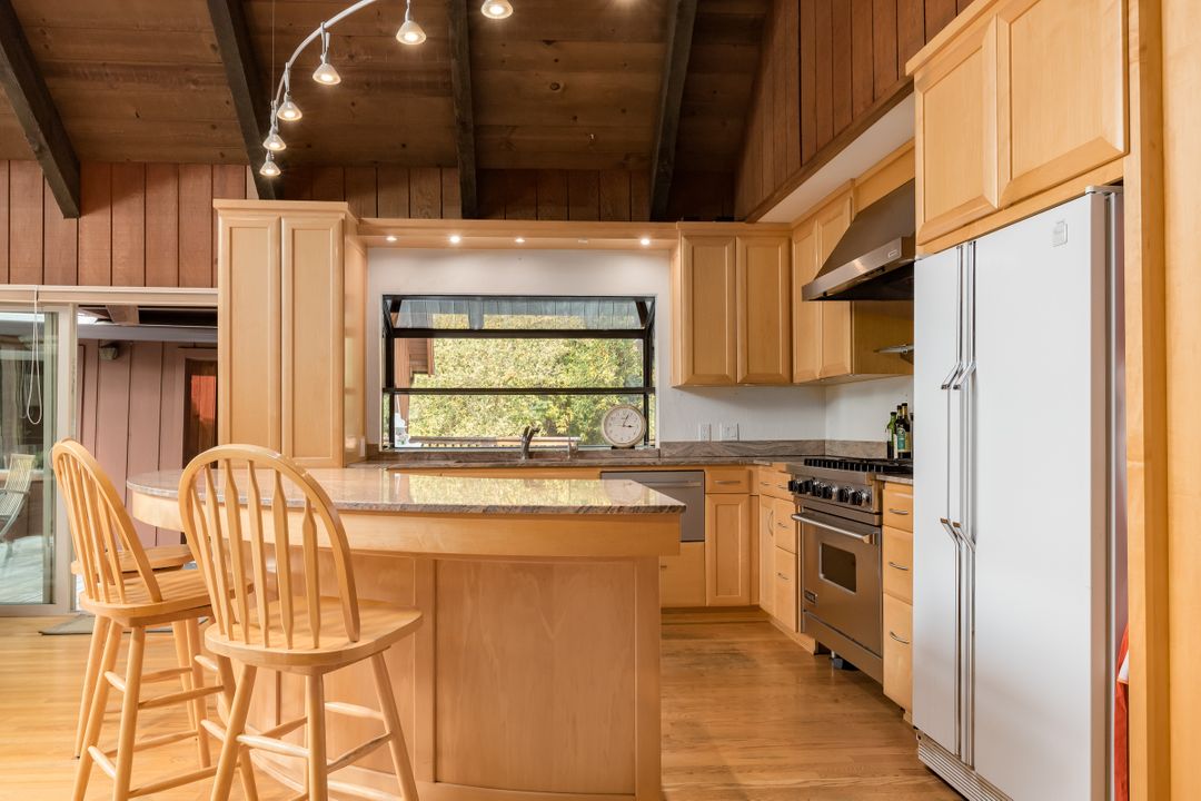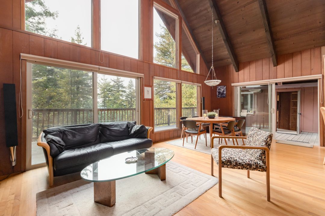 This spacious, vaulted and bright Chalet is nestled on the ridgeline above Scotts Valley Drive, just minutes from the Granite Creek Exit. Its cathedral ceilings and floor-to-roof-peak windows orient to the West, across the magnificent Santa Cruz Mountains, leaving bustle behind. Broad decks wrap around providing sun, shade, solitude, space for company or a hot soak, as you wish. A true great room is at the home’s core with its sylvan views, a wood hearth and a beautiful custom kitchen with a curved granite breakfast bar. Each bedroom has its unique personality and flexible use. Two bedrooms and full baths are on the ground floor (one is detached) and a third, lofted bed/bath is the only space that isn’t on the main level. An attached two-car garage completes this casual, comfortable, unpretentious home. Our Coast Redwoods capture more carbon dioxide than any other tree on Earth while providing living things of all kinds a refuge from the hustles of daily life. Fortunately, you don’t have to go far to make your home among them here!