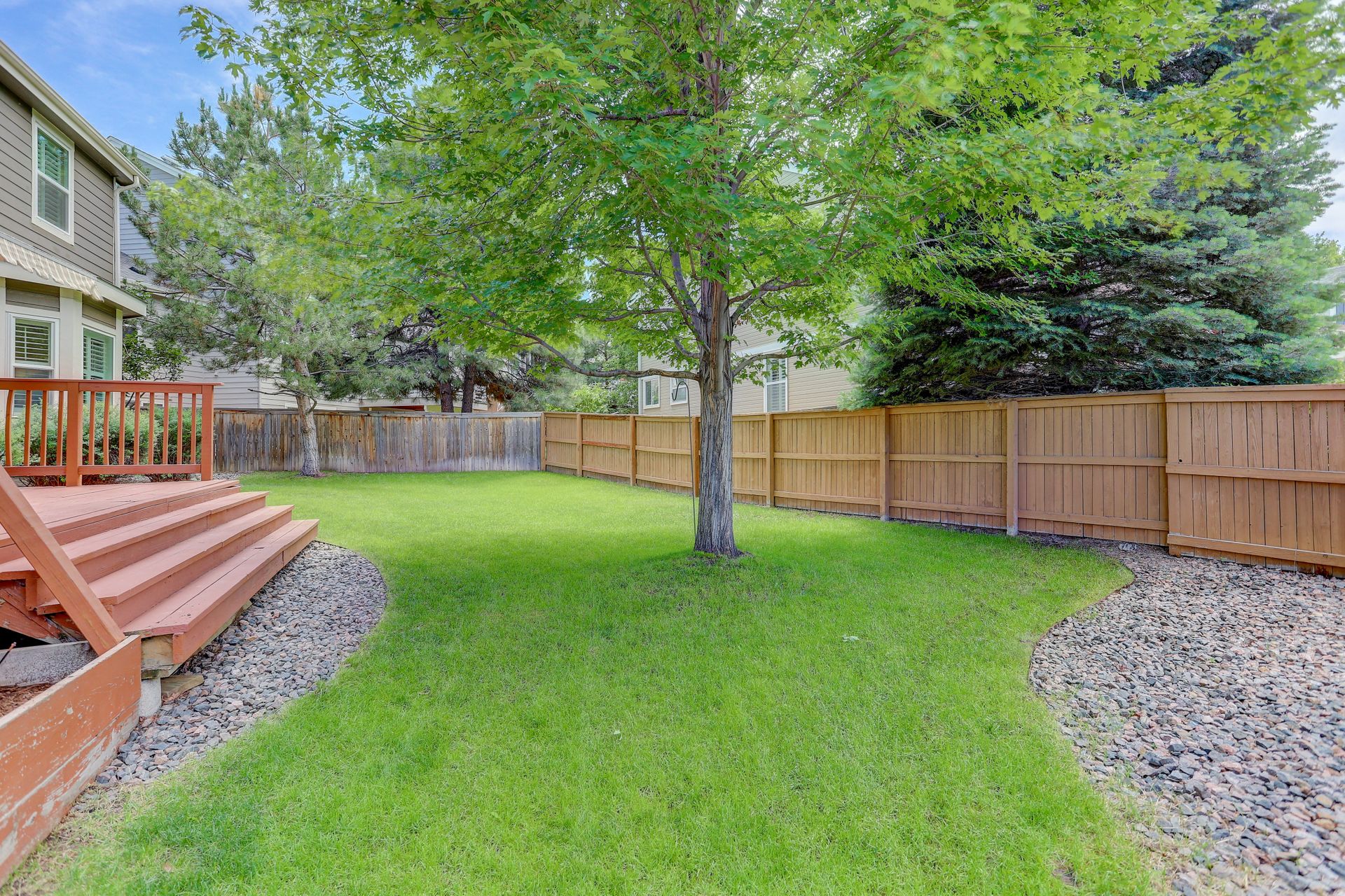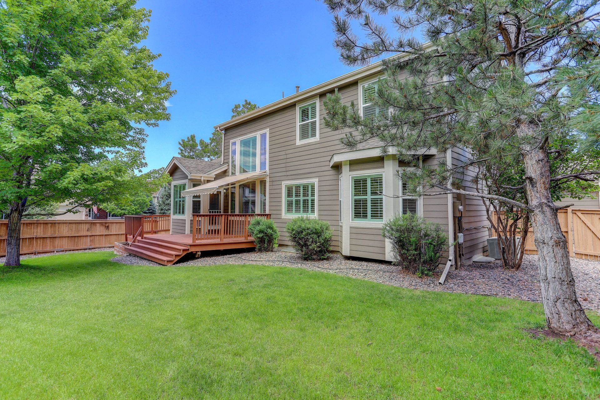 The private backyard is a great space to play or relax. Outdoor entertaining will be a pleasure on this deck shaded by the retractable awning and the flat lawn which is ideal for yard games.