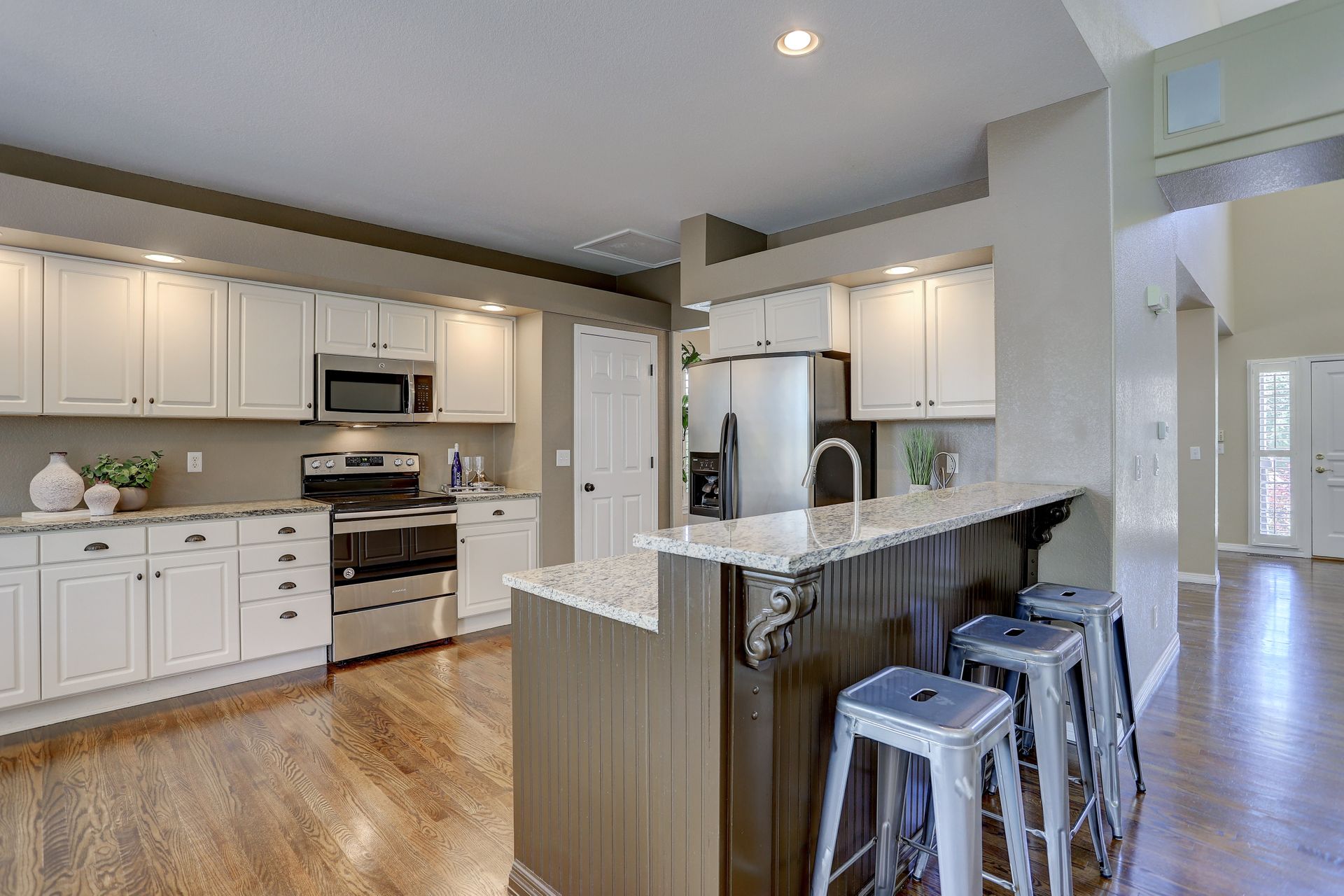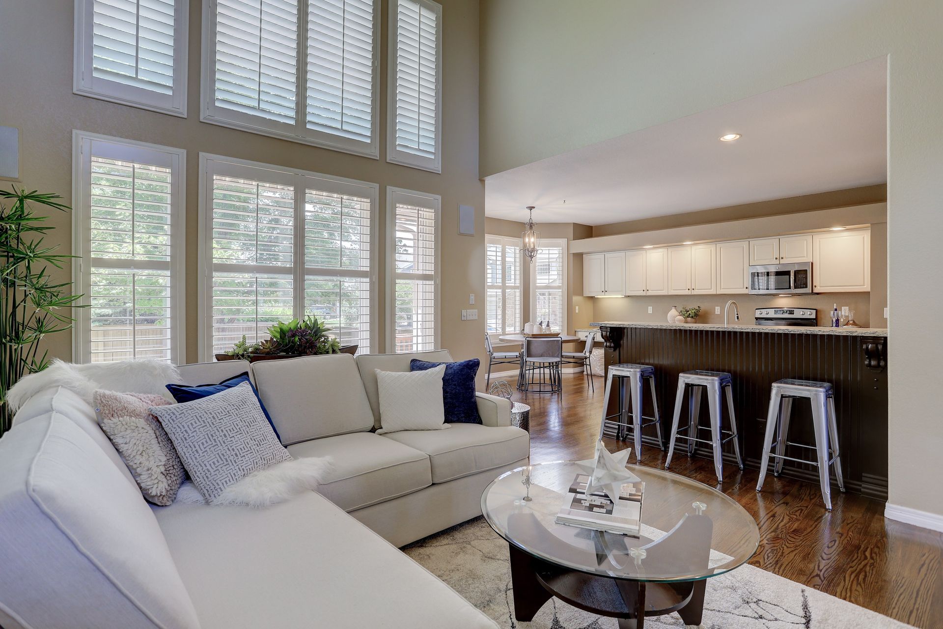 The kitchen features granite counters, stainless appliances, a breakfast bar, a command center, and dining area with access to the back deck. Soaring ceilings, hardwood floors and a wall of windows to the backyard are the perfect backdrop for this family room with fireplace.