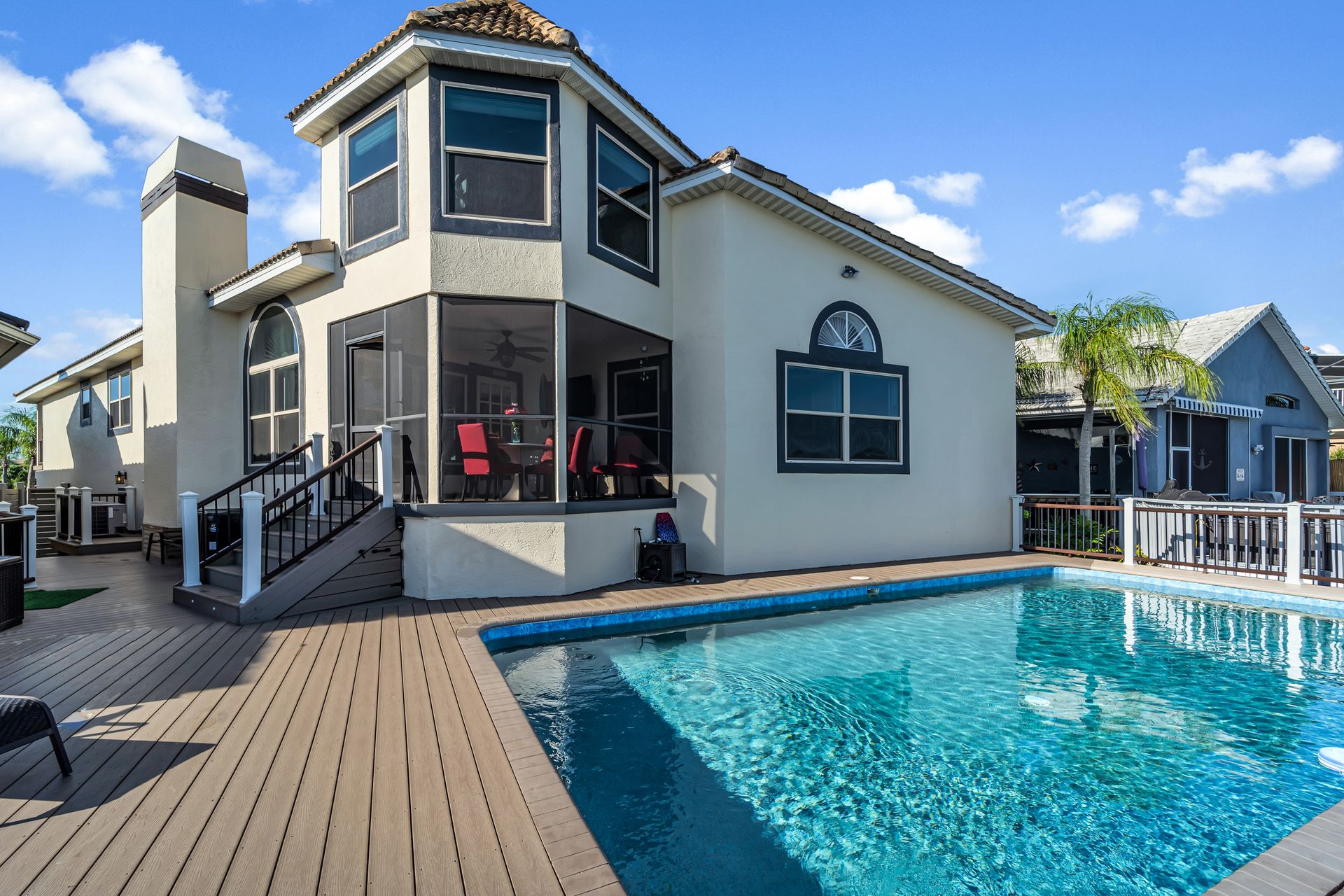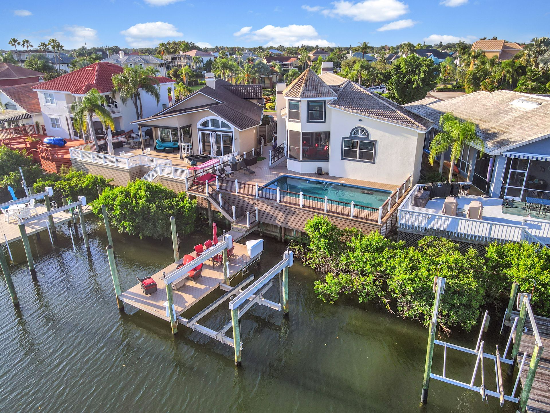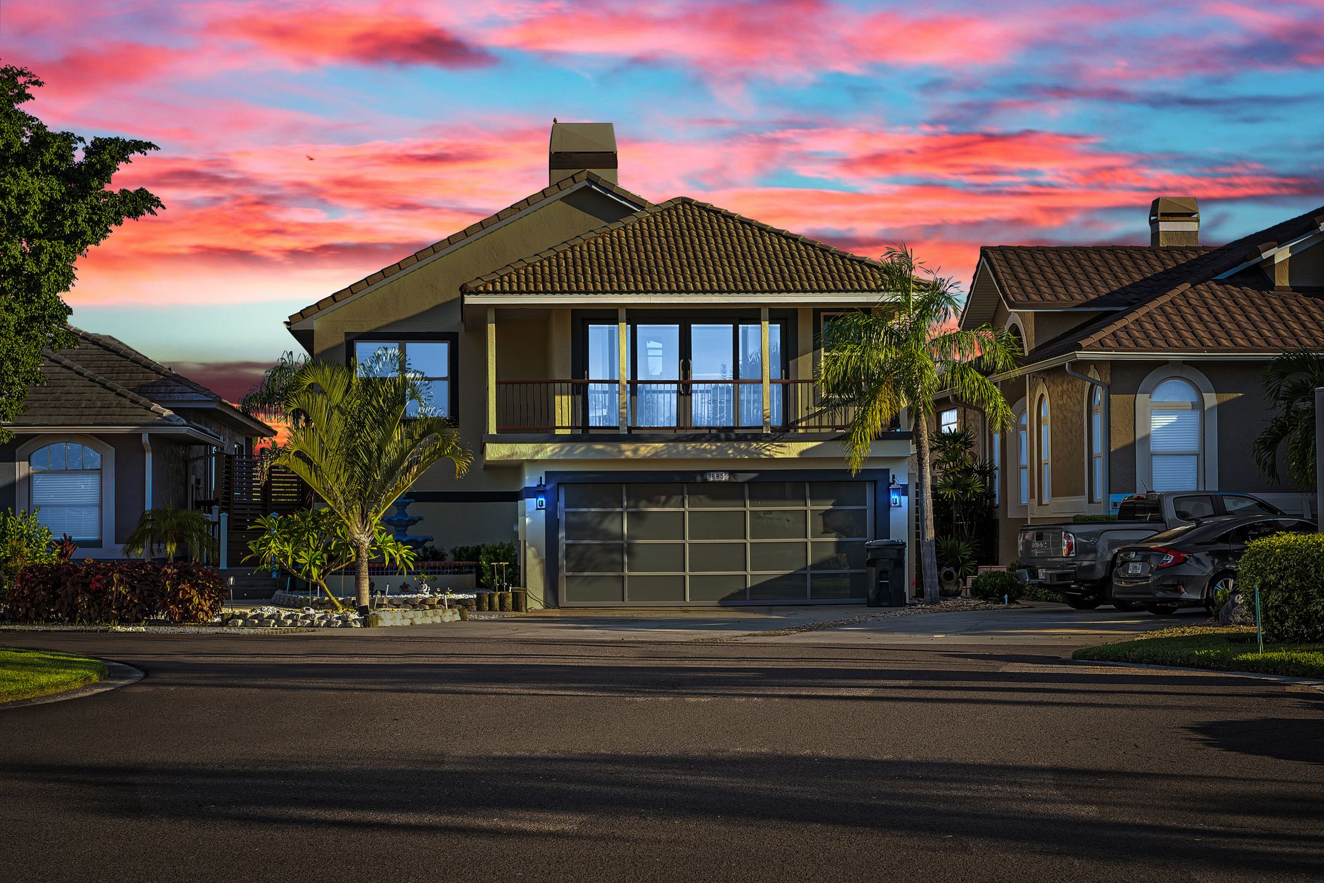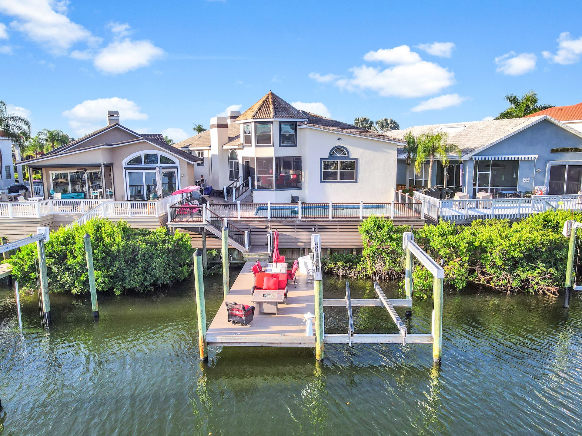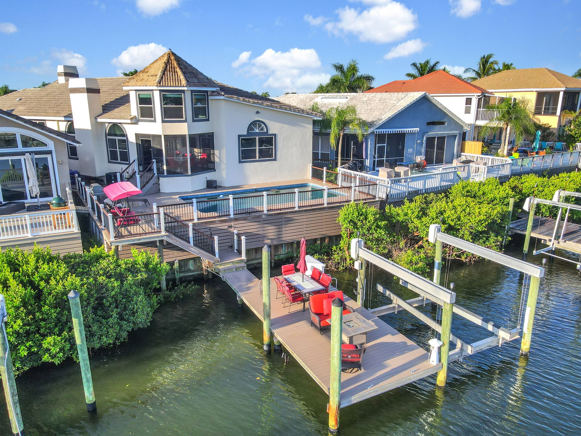 Welcome to intercoastal living at its finest! When entering past the guard checkpoint, you will notice the beautifully maintained common grounds as well as the stunning waterfront homes that adorn the streets on either side. Leading to the entry, step onto solid hardwood oak floors and a custom wood inlay that separates the foyer from the rest of the home. THIS THREE-BEDROOM THREE-BATHROOM HOME, WITH THE ADDITION OF A BONUS ROOM THAT CAN SERVE AS A FOURTH BEDROOM, IS A HOME YOU WON'T WANT TO MISS. The entire home has vaulted ceilings throughout with a grand open concept offering water views from the kitchen, dining, and main living areas. The living room has a gas-burning fireplace adorned with custom coastal decorative wood paneling from floor to ceiling. With custom floating glass and LED-lit stairs and a custom glass handrail throughout with LED lighting, enter the second level where the large dining room and kitchen are opened. The kitchen has all-wood custom cabinetry and a granite countertop with a great peninsula. Adjacent to this space includes a bonus room with a large on-suite bathroom and custom glass door sliders leading to a front wrap-around balcony. Another oversized bedroom sits on this level with a gas-burning fireplace that gives this room a unique ambiance with its vaulted ceilings. The primary bedroom also sits on the first level offering breathtaking water views and vaulted ceilings. The on-suite bath is equipped with a large jetted soaking tub and an oversized shower with a private toilet and a large walk-in closet. The staircase leading you to the third-floor level loft offers amazing water views. This level also offers a large mechanical room for added storage and hidden access into another unique space. Coming down this staircase you can access the back screened lanai where you can enjoy entertaining with water views. Head down onto the heated saltwater pool deck and continue down to the updated boat dock equipped with a 23,000-pound lift, BOAT ON PROPERTY IS UP FOR SALE AND CAN BE DISCOUNTED WITH THE PURCHASE OF THIS PROPERTY. The garage has an oversized glass door with parking enough for four cars tandemly. The garage also has an incredibly large storage/workspace, unlike any other property in this community. Come and see for yourself intercoastal living at its finest.