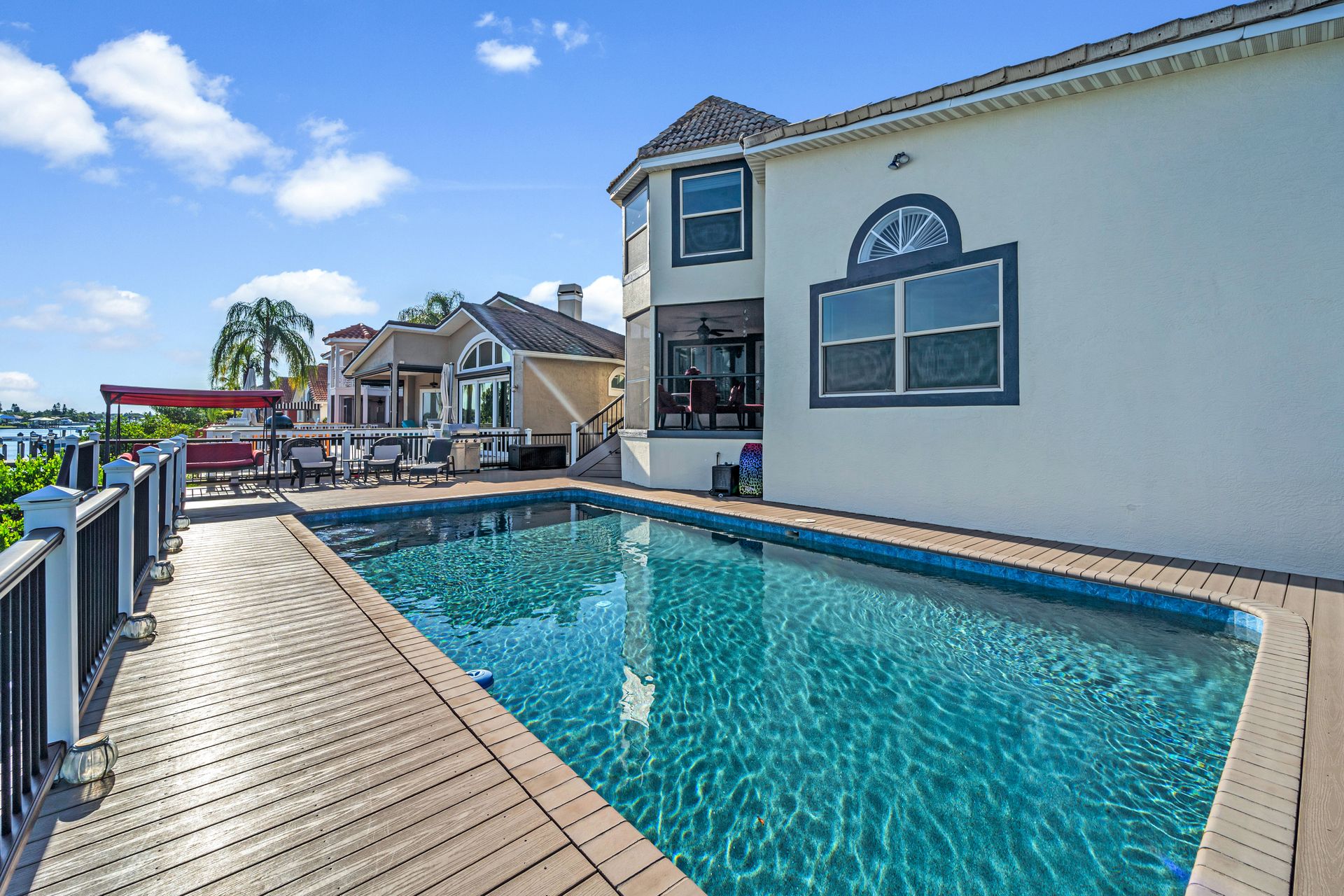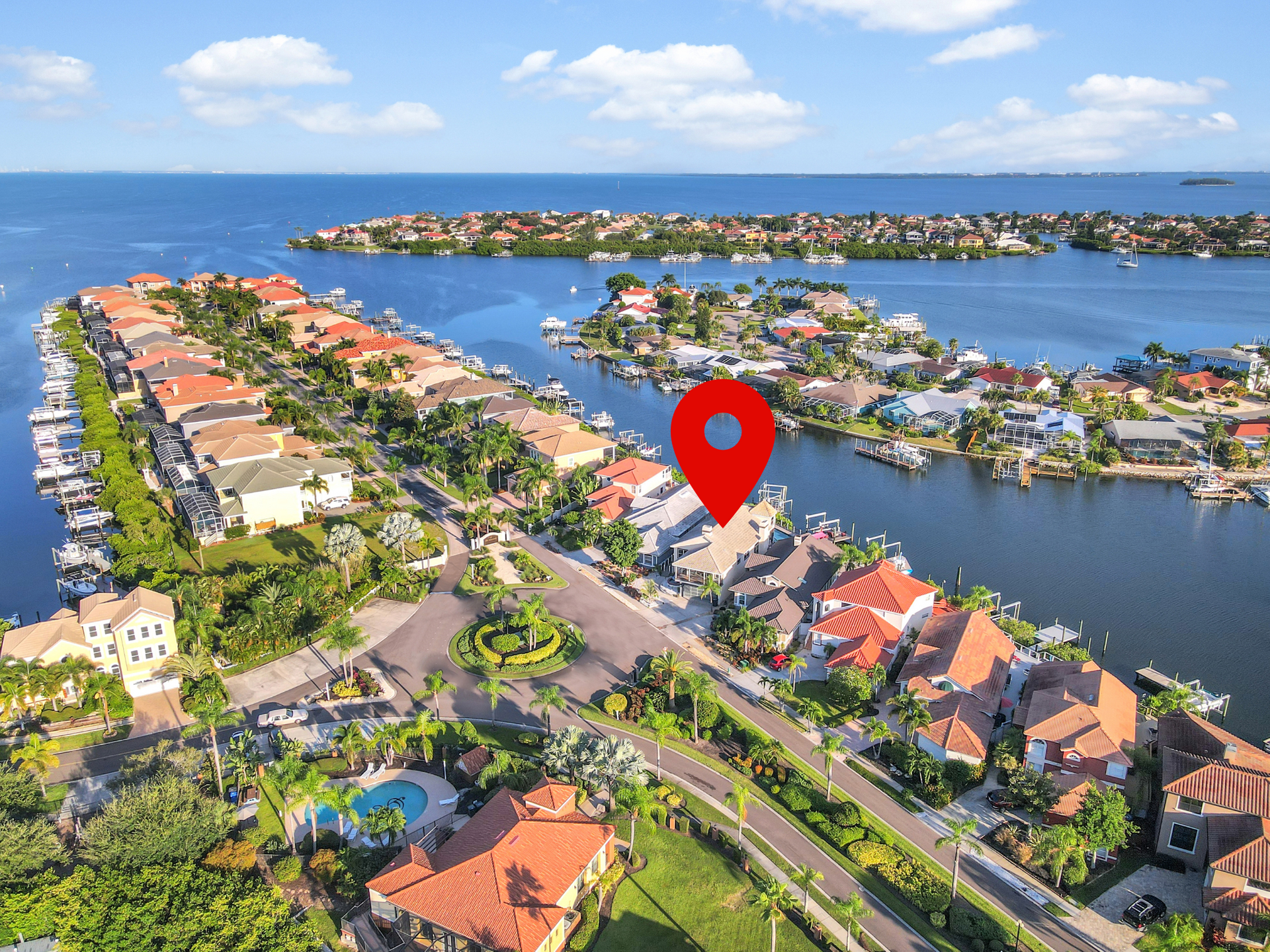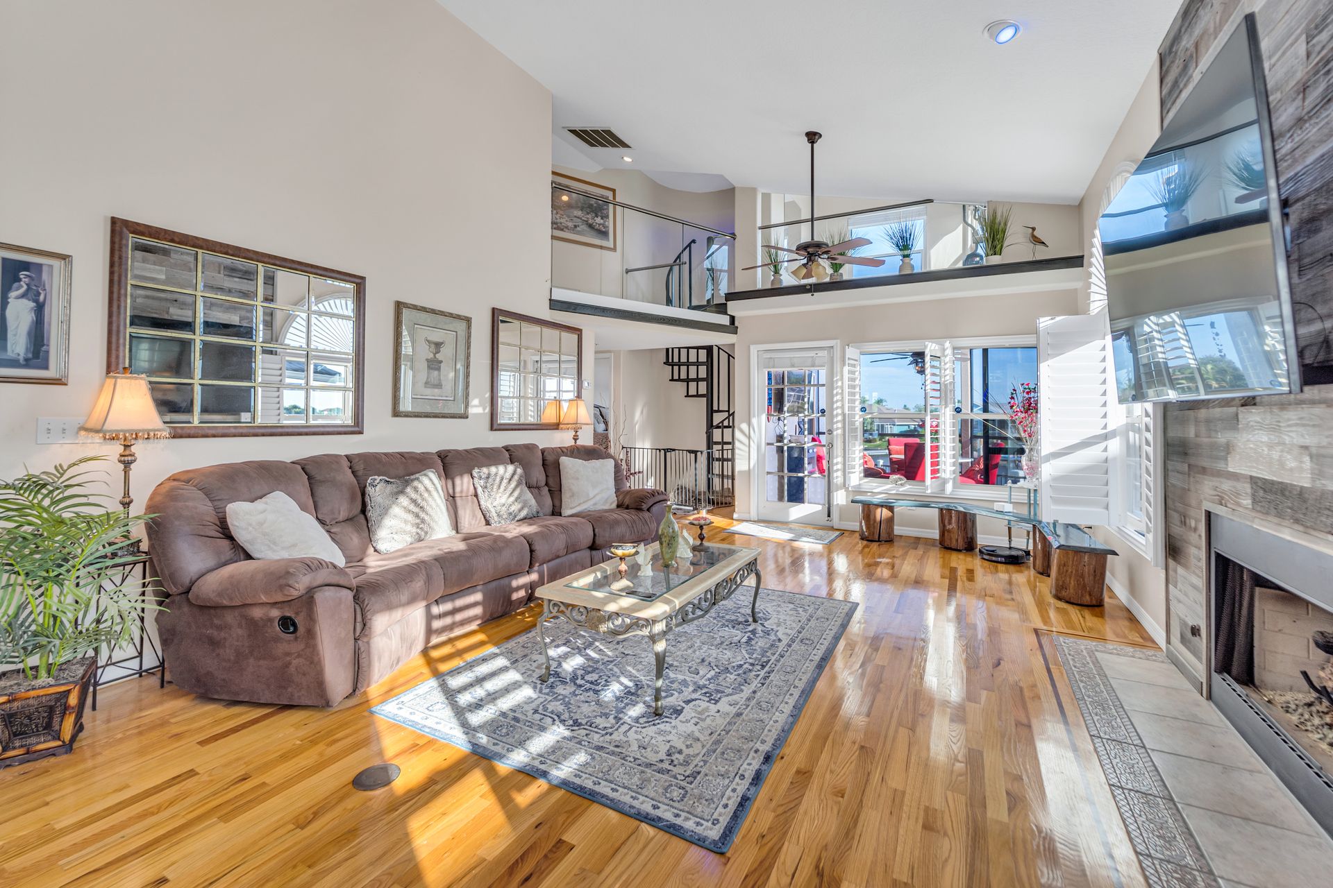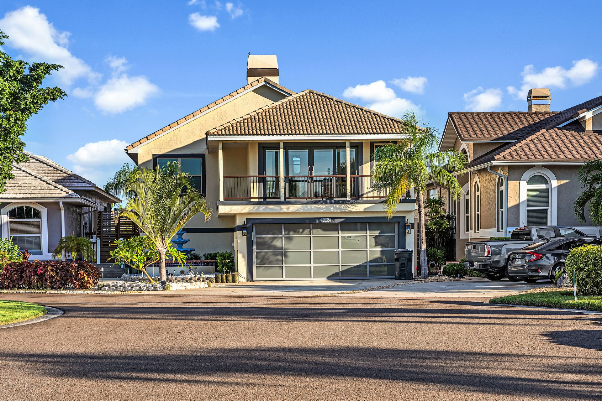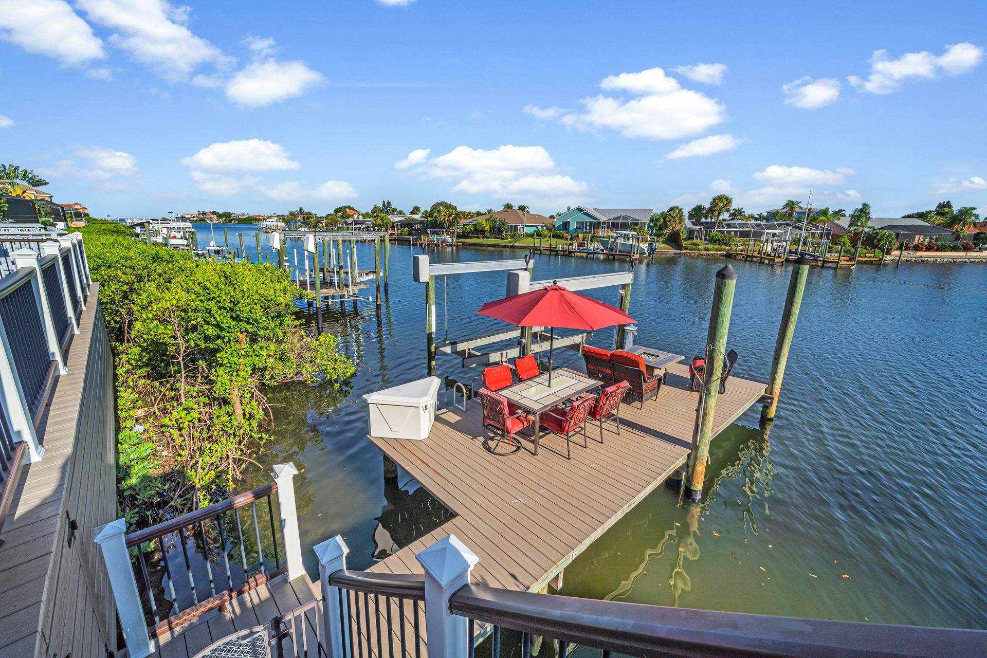 Welcome to intercoastal living at its finest! When entering past the guard checkpoint, you will notice the beautifully maintained common grounds as well as the stunning waterfront homes that adorn the streets on either side. Leading to the entry, step onto solid hardwood oak floors and a custom wood inlay that separates the foyer from the rest of the home. THIS THREE-BEDROOM THREE-BATHROOM HOME, WITH THE ADDITION OF A BONUS ROOM THAT CAN SERVE AS A FOURTH BEDROOM, IS A HOME YOU WON'T WANT TO MISS. The entire home has vaulted ceilings throughout with a grand open concept offering water views from the kitchen, dining, and main living areas. The living room has a gas-burning fireplace adorned with custom coastal decorative wood paneling from floor to ceiling. With custom floating glass and LED-lit stairs and a custom glass handrail throughout with LED lighting, enter the second level where the large dining room and kitchen are opened. The kitchen has all-wood custom cabinetry and a granite countertop with a great peninsula. Adjacent to this space includes a bonus room with a large on-suite bathroom and custom glass door sliders leading to a front wrap-around balcony. Another oversized bedroom sits on this level with a gas-burning fireplace that gives this room a unique ambiance with its vaulted ceilings. The primary bedroom also sits on the first level offering breathtaking water views and vaulted ceilings. The on-suite bath is equipped with a large jetted soaking tub and an oversized shower with a private toilet and a large walk-in closet. The staircase leading you to the third-floor level loft offers amazing water views. This level also offers a large mechanical room for added storage and hidden access into another unique space. Coming down this staircase you can access the back screened lanai where you can enjoy entertaining with water views. Head down onto the heated saltwater pool deck and continue down to the updated boat dock equipped with a 23,000-pound lift, BOAT ON PROPERTY IS UP FOR SALE AND CAN BE DISCOUNTED WITH THE PURCHASE OF THIS PROPERTY. The garage has an oversized glass door with parking enough for four cars tandemly. The garage also has an incredibly large storage/workspace, unlike any other property in this community. Come and see for yourself intercoastal living at its finest.