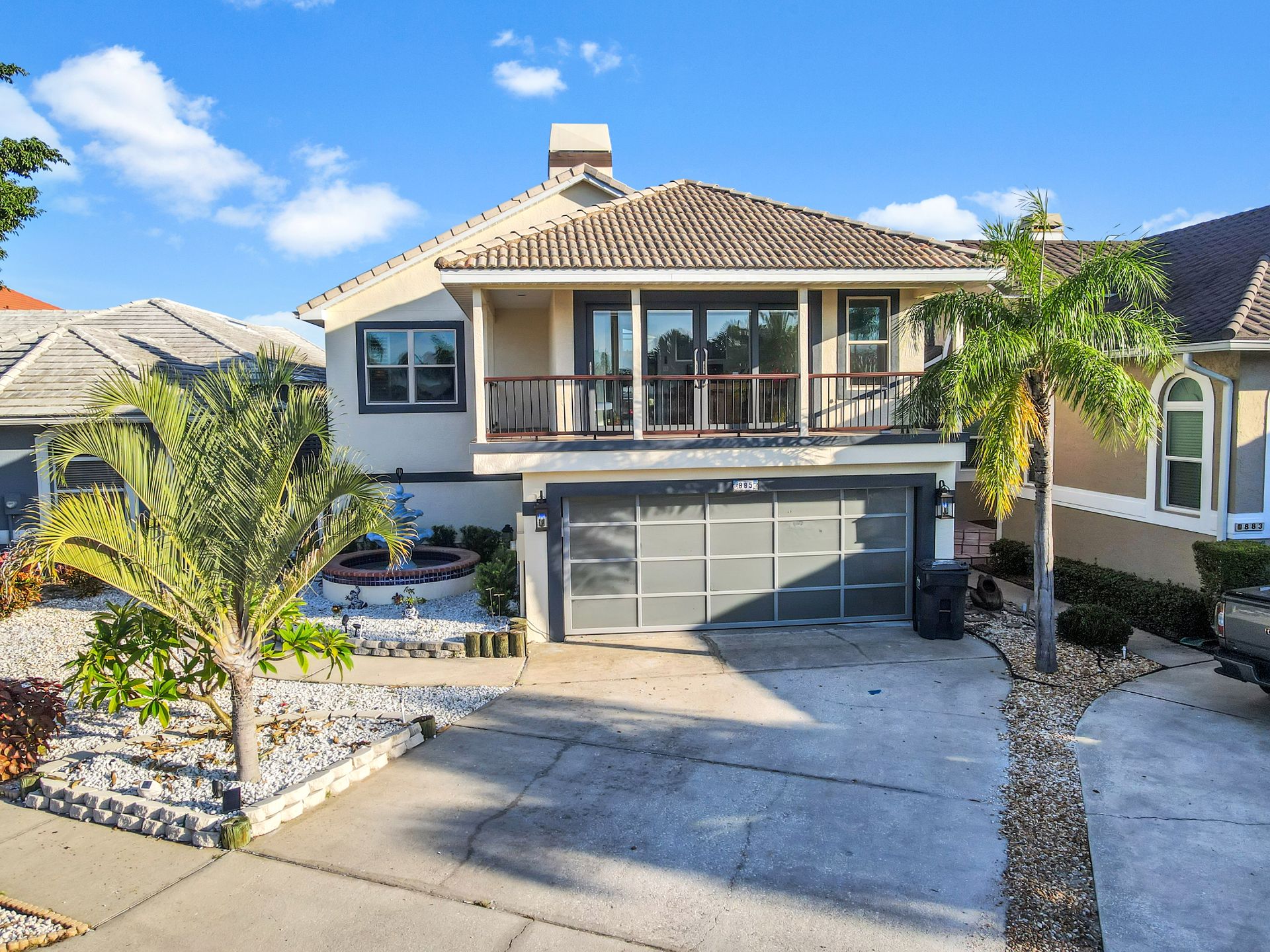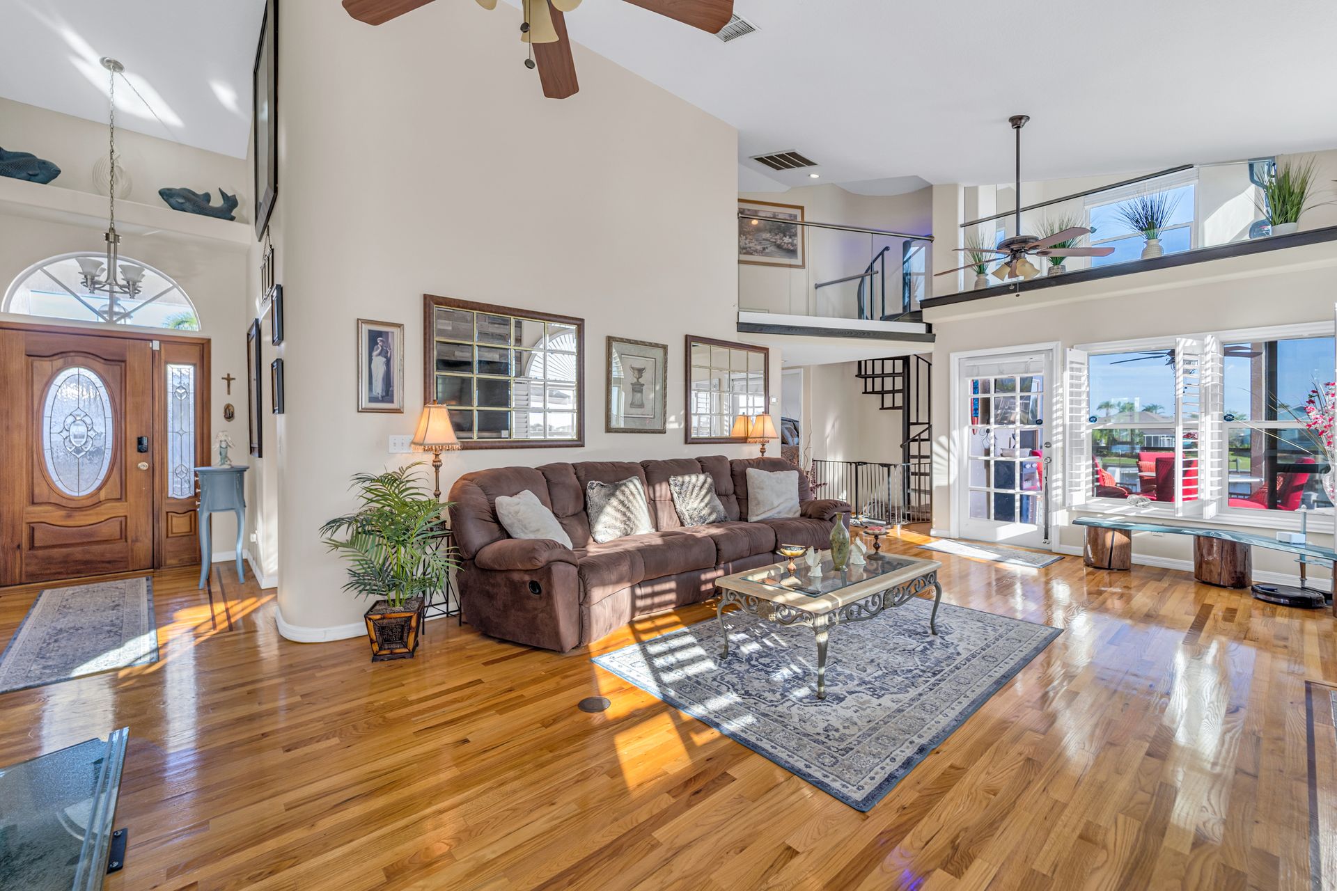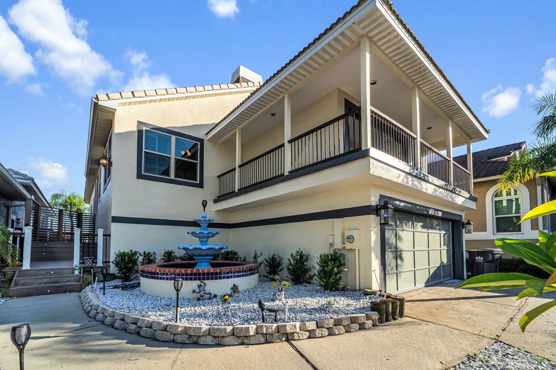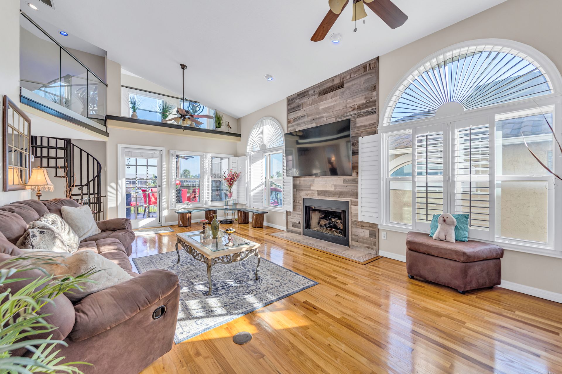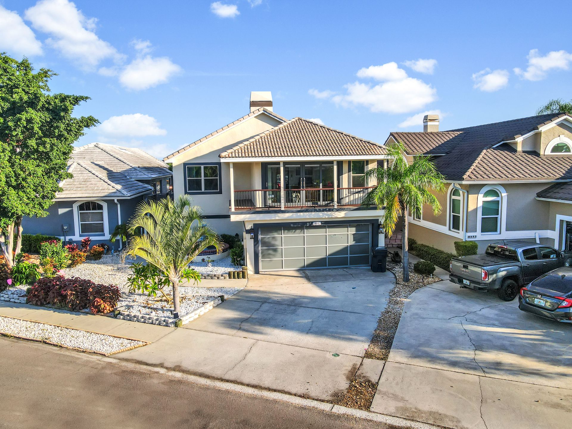 Welcome to intercoastal living at its finest! When entering past the guard checkpoint, you will notice the beautifully maintained common grounds as well as the stunning waterfront homes that adorn the streets on either side. Leading to the entry, step onto solid hardwood oak floors and a custom wood inlay that separates the foyer from the rest of the home. THIS THREE-BEDROOM THREE-BATHROOM HOME, WITH THE ADDITION OF A BONUS ROOM THAT CAN SERVE AS A FOURTH BEDROOM, IS A HOME YOU WON'T WANT TO MISS. The entire home has vaulted ceilings throughout with a grand open concept offering water views from the kitchen, dining, and main living areas. The living room has a gas-burning fireplace adorned with custom coastal decorative wood paneling from floor to ceiling. With custom floating glass and LED-lit stairs and a custom glass handrail throughout with LED lighting, enter the second level where the large dining room and kitchen are opened. The kitchen has all-wood custom cabinetry and a granite countertop with a great peninsula. Adjacent to this space includes a bonus room with a large on-suite bathroom and custom glass door sliders leading to a front wrap-around balcony. Another oversized bedroom sits on this level with a gas-burning fireplace that gives this room a unique ambiance with its vaulted ceilings. The primary bedroom also sits on the first level offering breathtaking water views and vaulted ceilings. The on-suite bath is equipped with a large jetted soaking tub and an oversized shower with a private toilet and a large walk-in closet. The staircase leading you to the third-floor level loft offers amazing water views. This level also offers a large mechanical room for added storage and hidden access into another unique space. Coming down this staircase you can access the back screened lanai where you can enjoy entertaining with water views. Head down onto the heated saltwater pool deck and continue down to the updated boat dock equipped with a 23,000-pound lift, BOAT ON PROPERTY IS UP FOR SALE AND CAN BE DISCOUNTED WITH THE PURCHASE OF THIS PROPERTY. The garage has an oversized glass door with parking enough for four cars tandemly. The garage also has an incredibly large storage/workspace, unlike any other property in this community. Come and see for yourself intercoastal living at its finest.