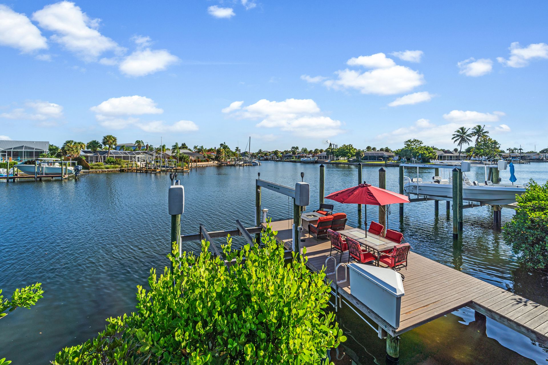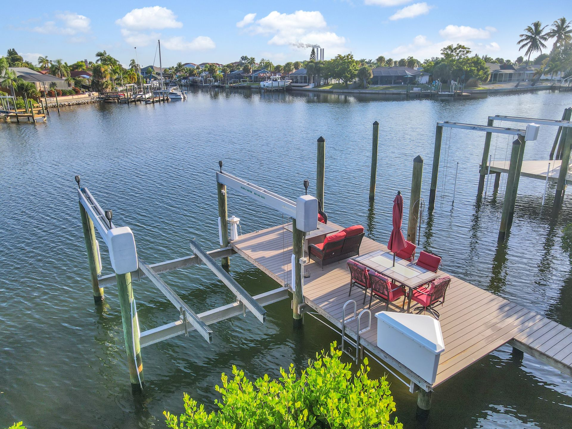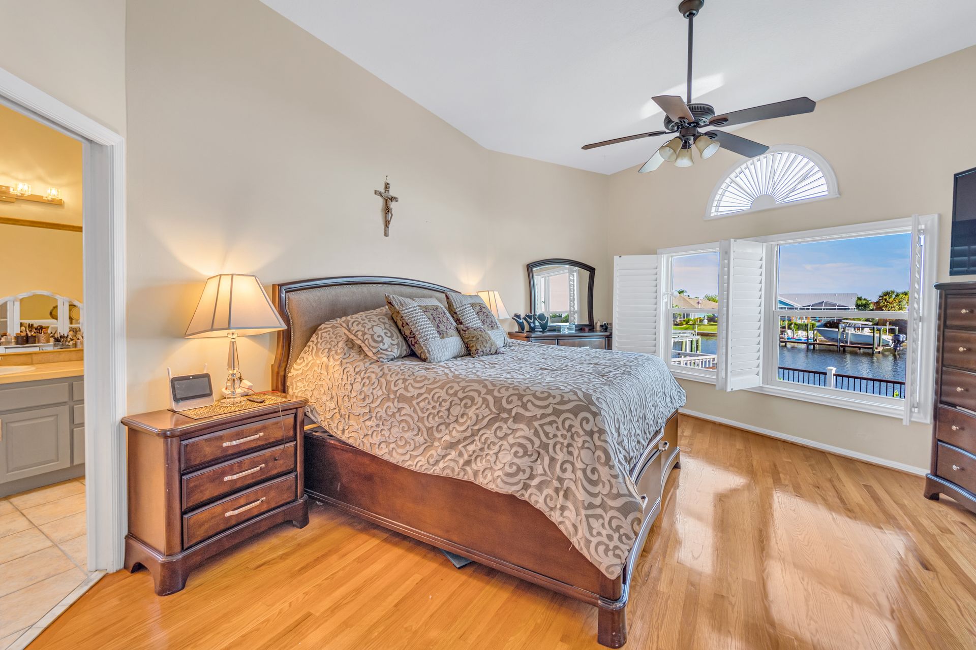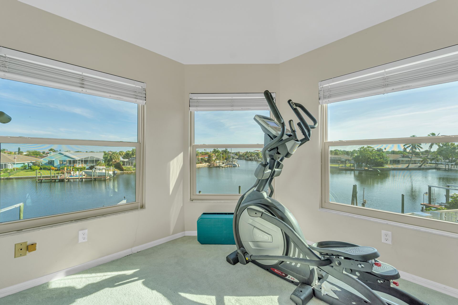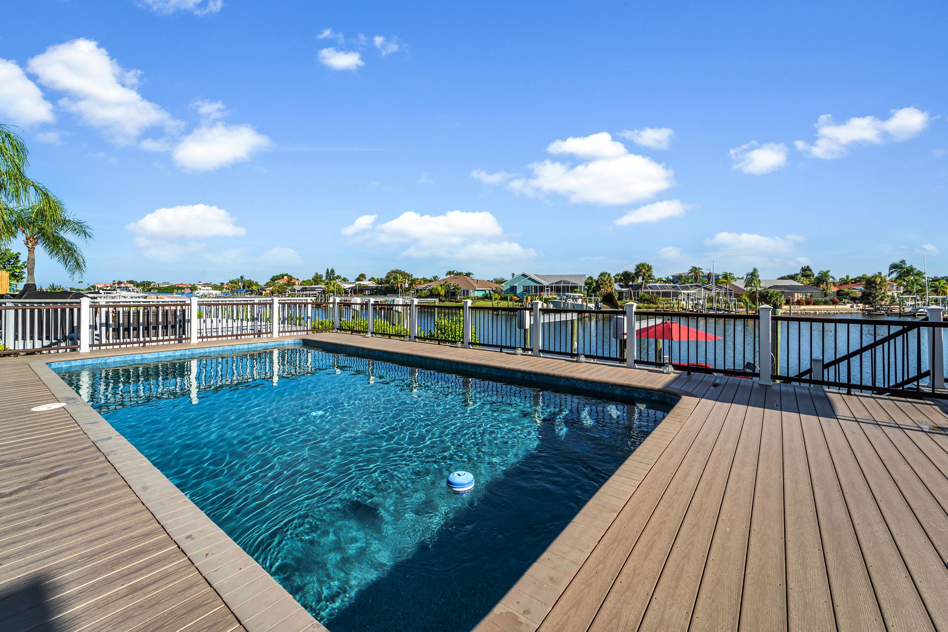 Welcome to intercoastal living at its finest! When entering past the guard checkpoint, you will notice the beautifully maintained common grounds as well as the stunning waterfront homes that adorn the streets on either side. Leading to the entry, step onto solid hardwood oak floors and a custom wood inlay that separates the foyer from the rest of the home. THIS THREE-BEDROOM THREE-BATHROOM HOME, WITH THE ADDITION OF A BONUS ROOM THAT CAN SERVE AS A FOURTH BEDROOM, IS A HOME YOU WON'T WANT TO MISS. The entire home has vaulted ceilings throughout with a grand open concept offering water views from the kitchen, dining, and main living areas. The living room has a gas-burning fireplace adorned with custom coastal decorative wood paneling from floor to ceiling. With custom floating glass and LED-lit stairs and a custom glass handrail throughout with LED lighting, enter the second level where the large dining room and kitchen are opened. The kitchen has all-wood custom cabinetry and a granite countertop with a great peninsula. Adjacent to this space includes a bonus room with a large on-suite bathroom and custom glass door sliders leading to a front wrap-around balcony. Another oversized bedroom sits on this level with a gas-burning fireplace that gives this room a unique ambiance with its vaulted ceilings. The primary bedroom also sits on the first level offering breathtaking water views and vaulted ceilings. The on-suite bath is equipped with a large jetted soaking tub and an oversized shower with a private toilet and a large walk-in closet. The staircase leading you to the third-floor level loft offers amazing water views. This level also offers a large mechanical room for added storage and hidden access into another unique space. Coming down this staircase you can access the back screened lanai where you can enjoy entertaining with water views. Head down onto the heated saltwater pool deck and continue down to the updated boat dock equipped with a 23,000-pound lift, BOAT ON PROPERTY IS UP FOR SALE AND CAN BE DISCOUNTED WITH THE PURCHASE OF THIS PROPERTY. The garage has an oversized glass door with parking enough for four cars tandemly. The garage also has an incredibly large storage/workspace, unlike any other property in this community. Come and see for yourself intercoastal living at its finest.