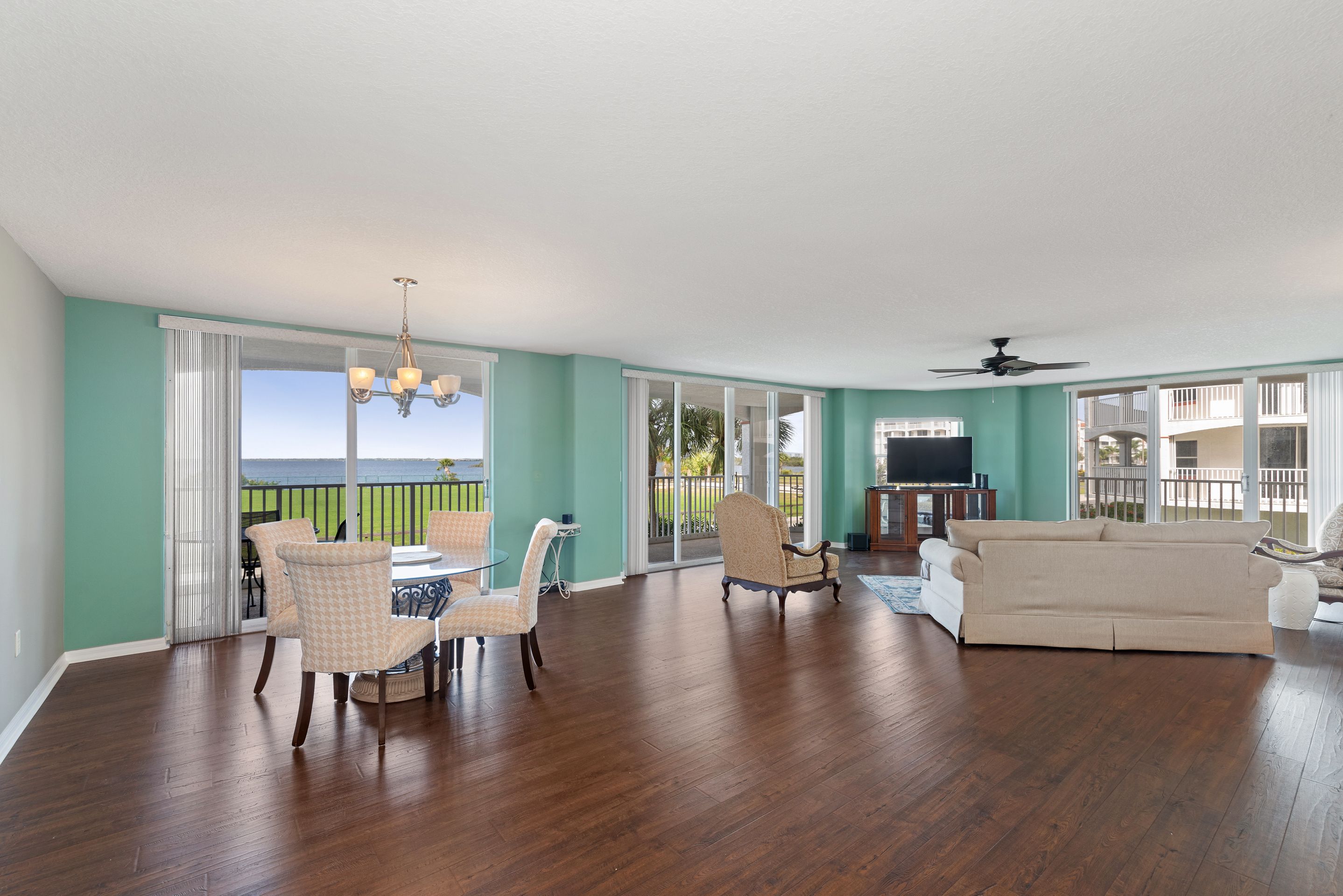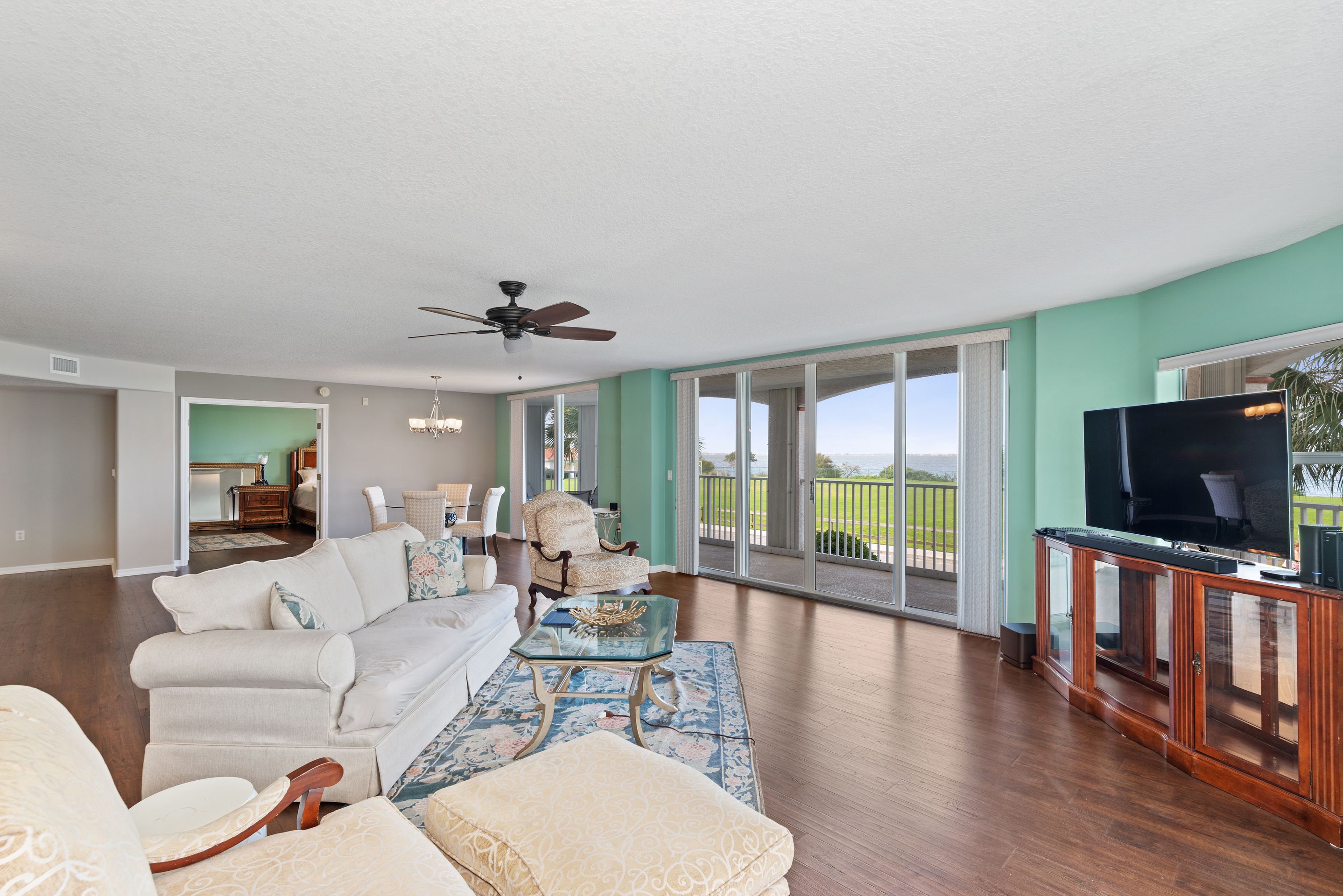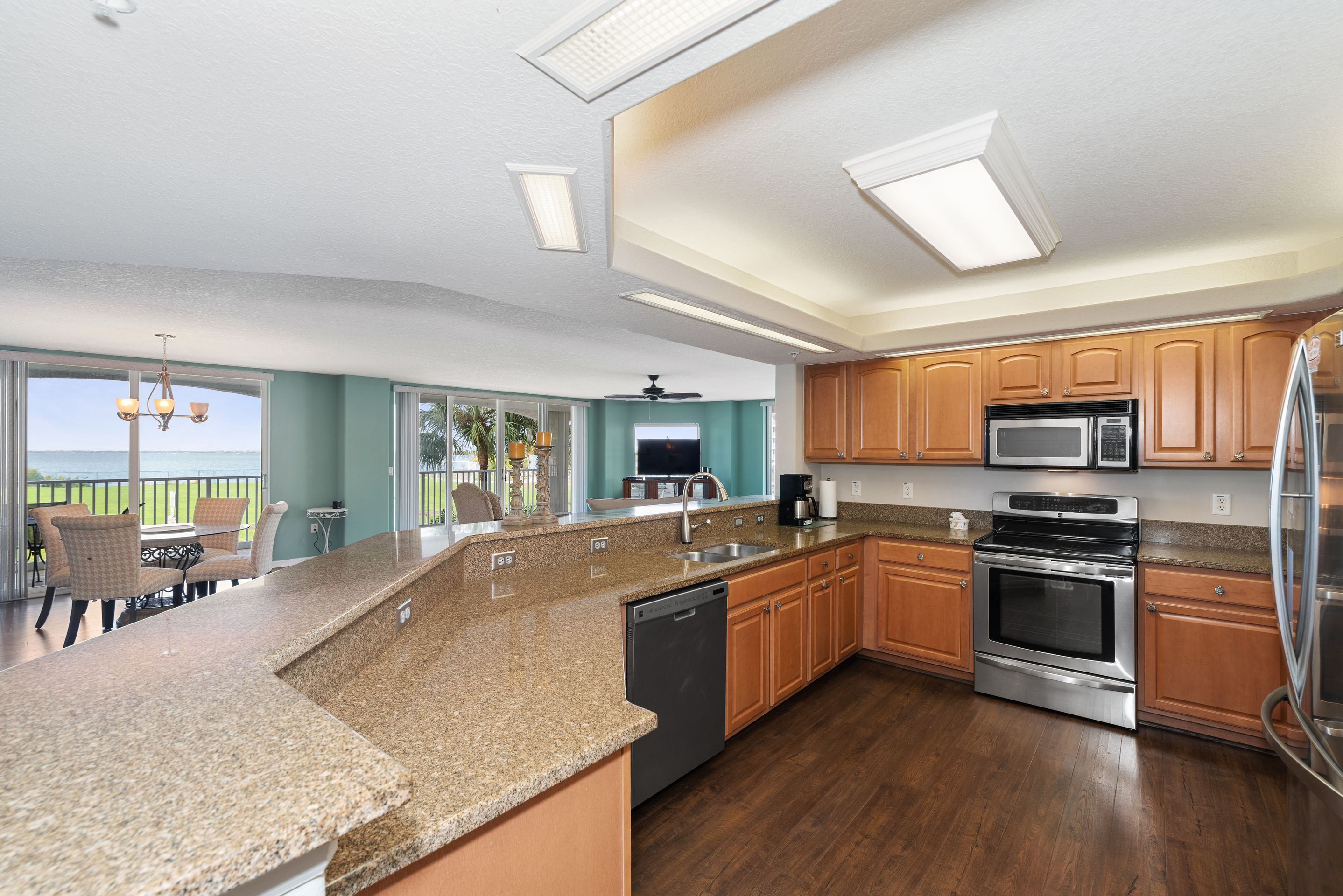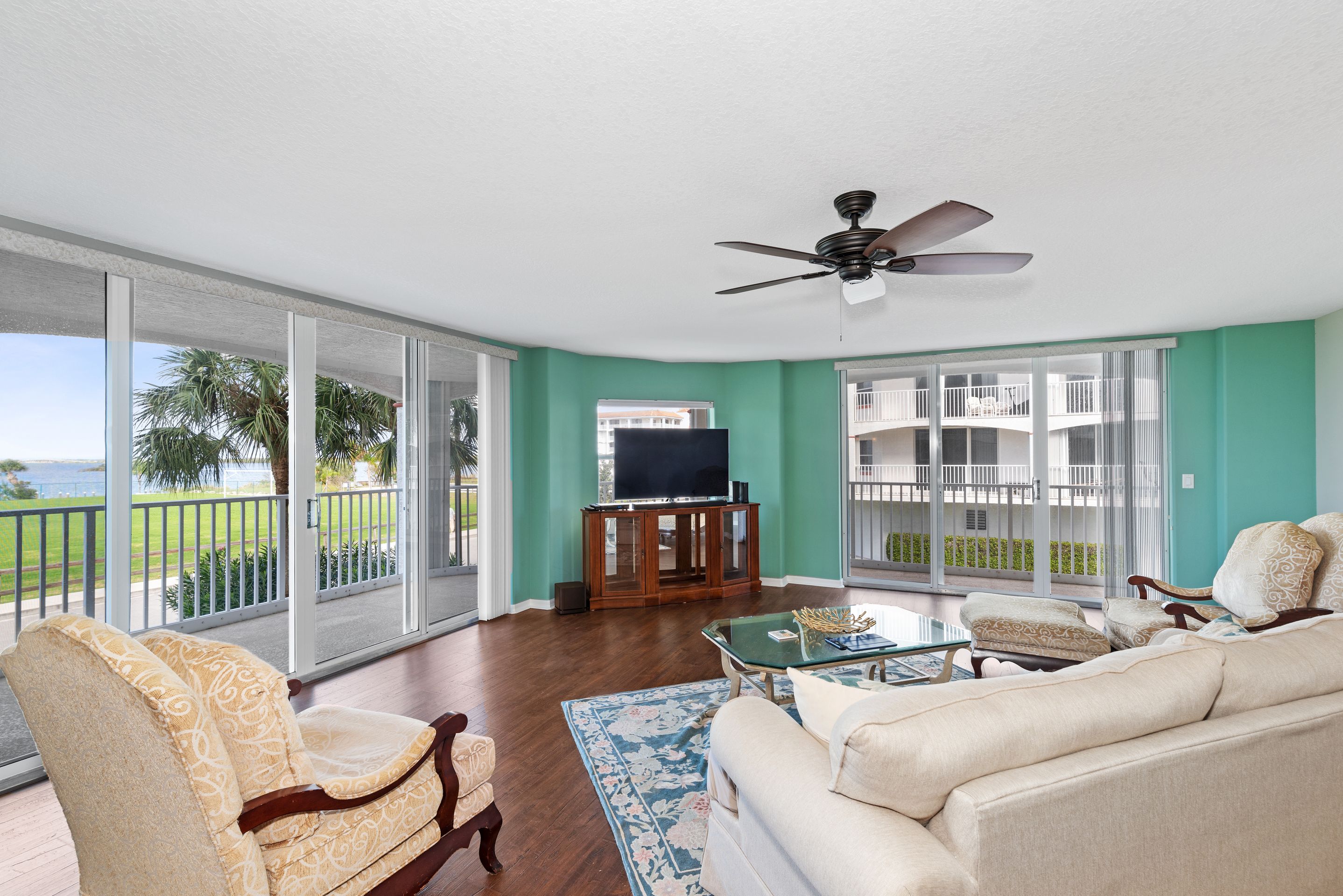 Direct riverfront with stunning sunsets to enjoy in this highly sought after Puerto del Rio Community. It is resort-style maintenance free living. Relax on the large wrap around balcony equipped with hurricane shutters throughout. The community offers two pools and hot tubs. Each building has two elevators, one that will drop you at your front door. Each building offers a fitness and recreational room. Kayak launch steps from your door at the Banana River park. You will be within close distance to parks, restaurants, shops, mini golf and the port. Bike path to the port and to the beach. Assigned indoor parking spot with shared storage area and plenty of outside parking. Stress free living. Cable and internet included in HOA.