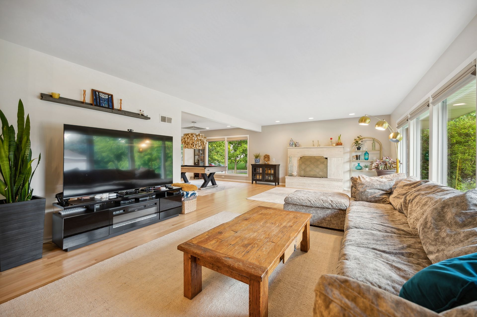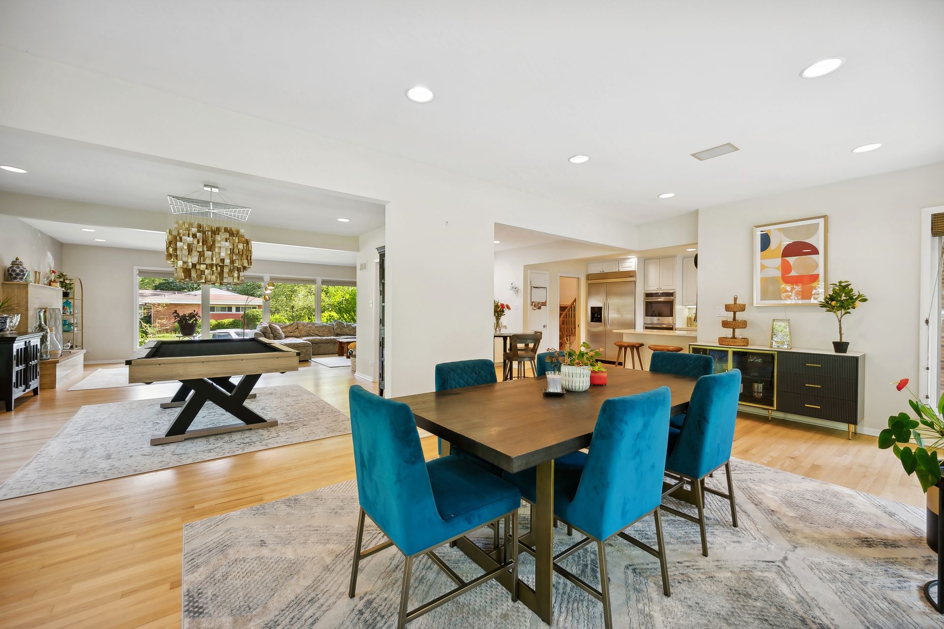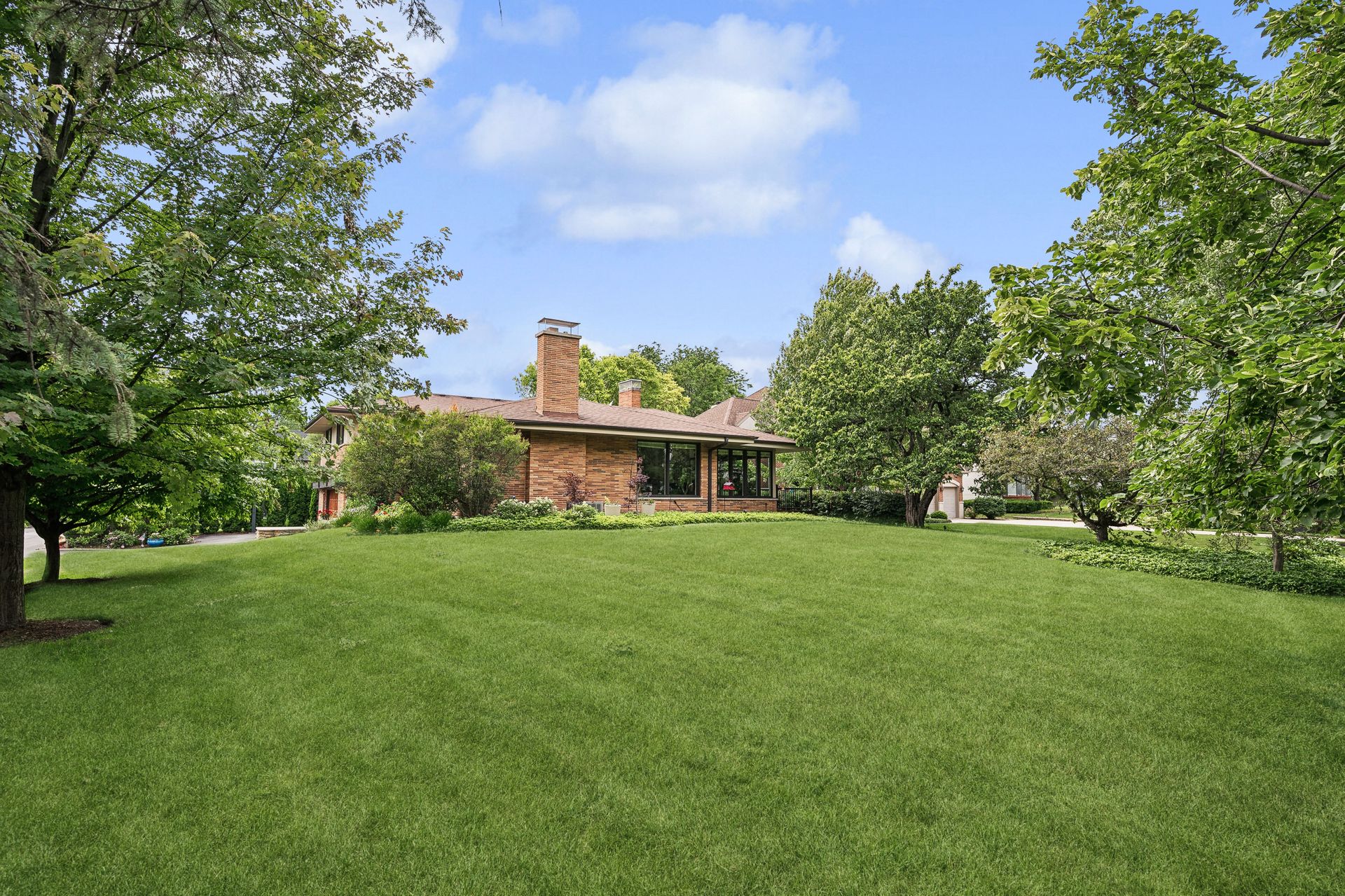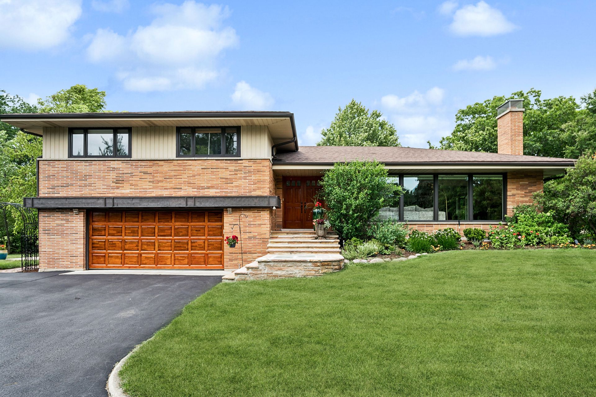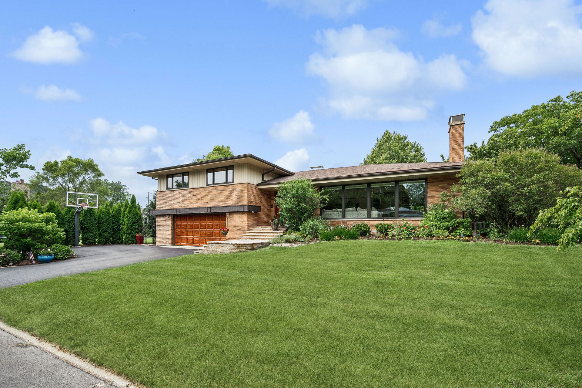 This Mid-Century Modern home has a California feel. Large open floor plan. Gracious Living Room with fireplace, formal Dining Room, Sun Room with windows galore and a terrific Kitchen with Breakfast Room that boasts newer appliances and Quartzite countertops. Family Room with sliding glass doors that lead to a spectacular yard! Primary bedroom with private bath and dressing area. Two more bedrooms up with a full bath. Basement features a Rec Room, Laundry Room and Bedroom. Hardwood floors throughout except for the Family Room which has ceramic tile flooring. Newer windows on the main floor except for over the Kitchen sink. Deck, patio and pergola in back yard.