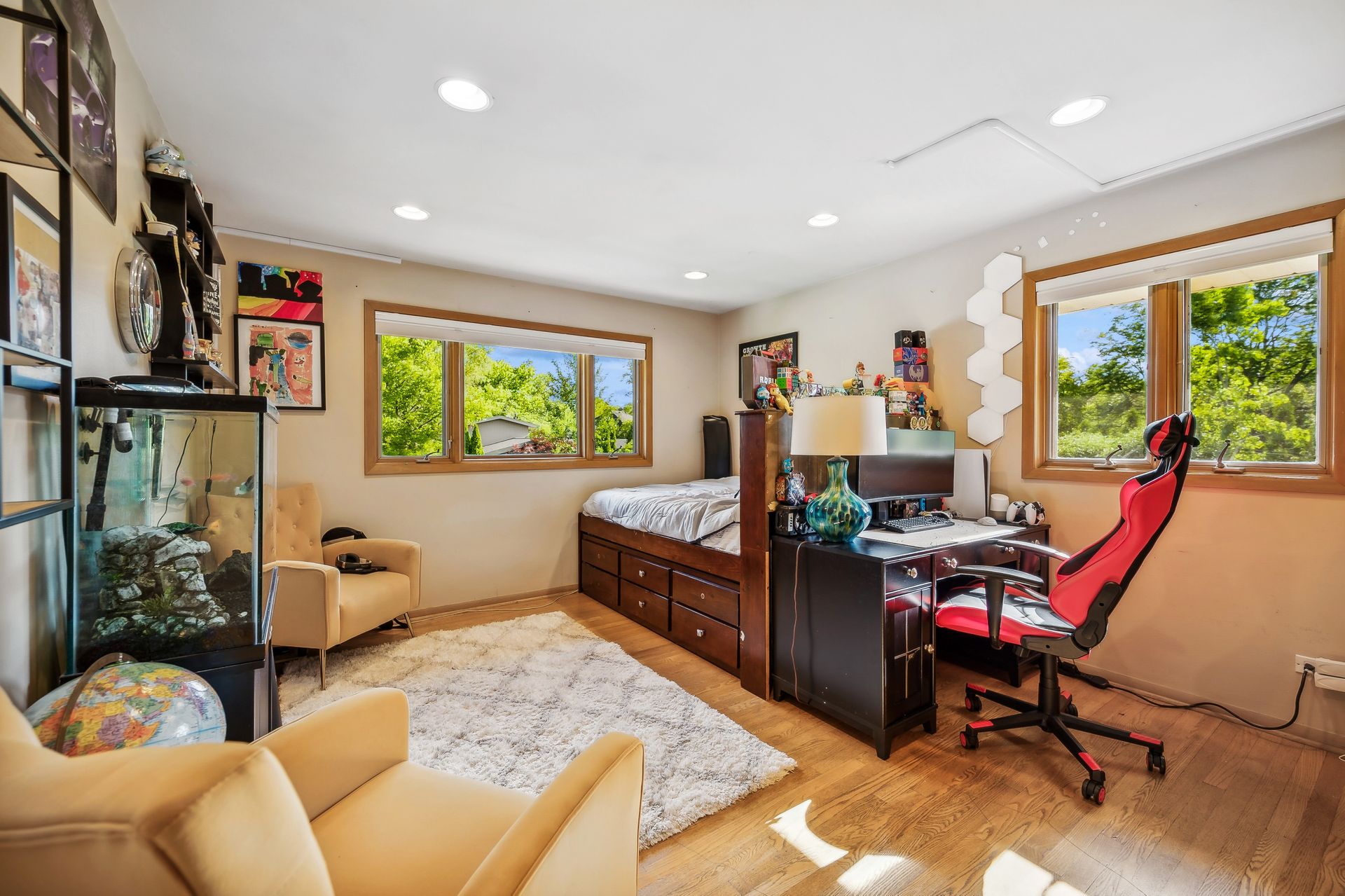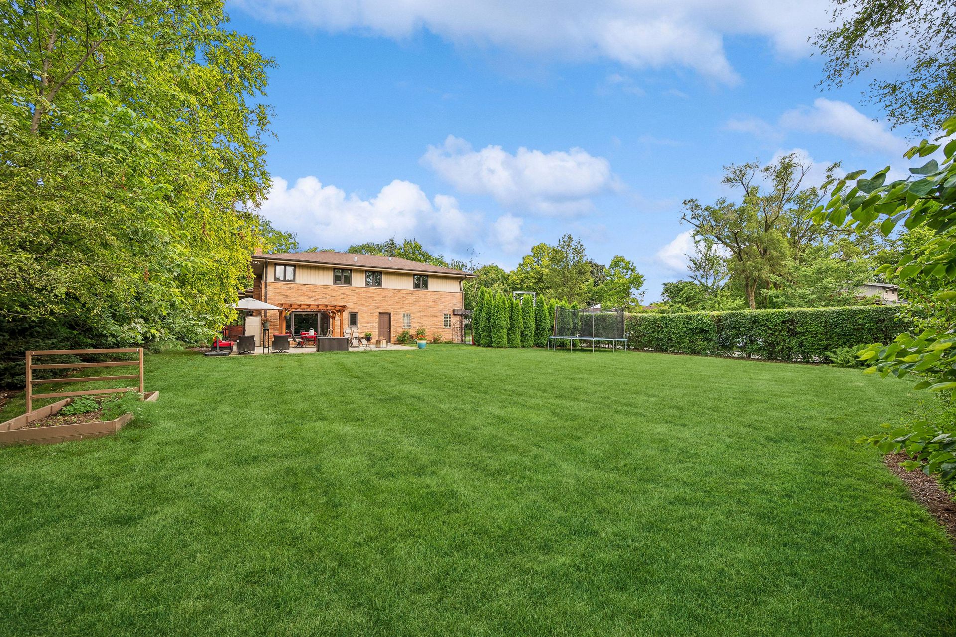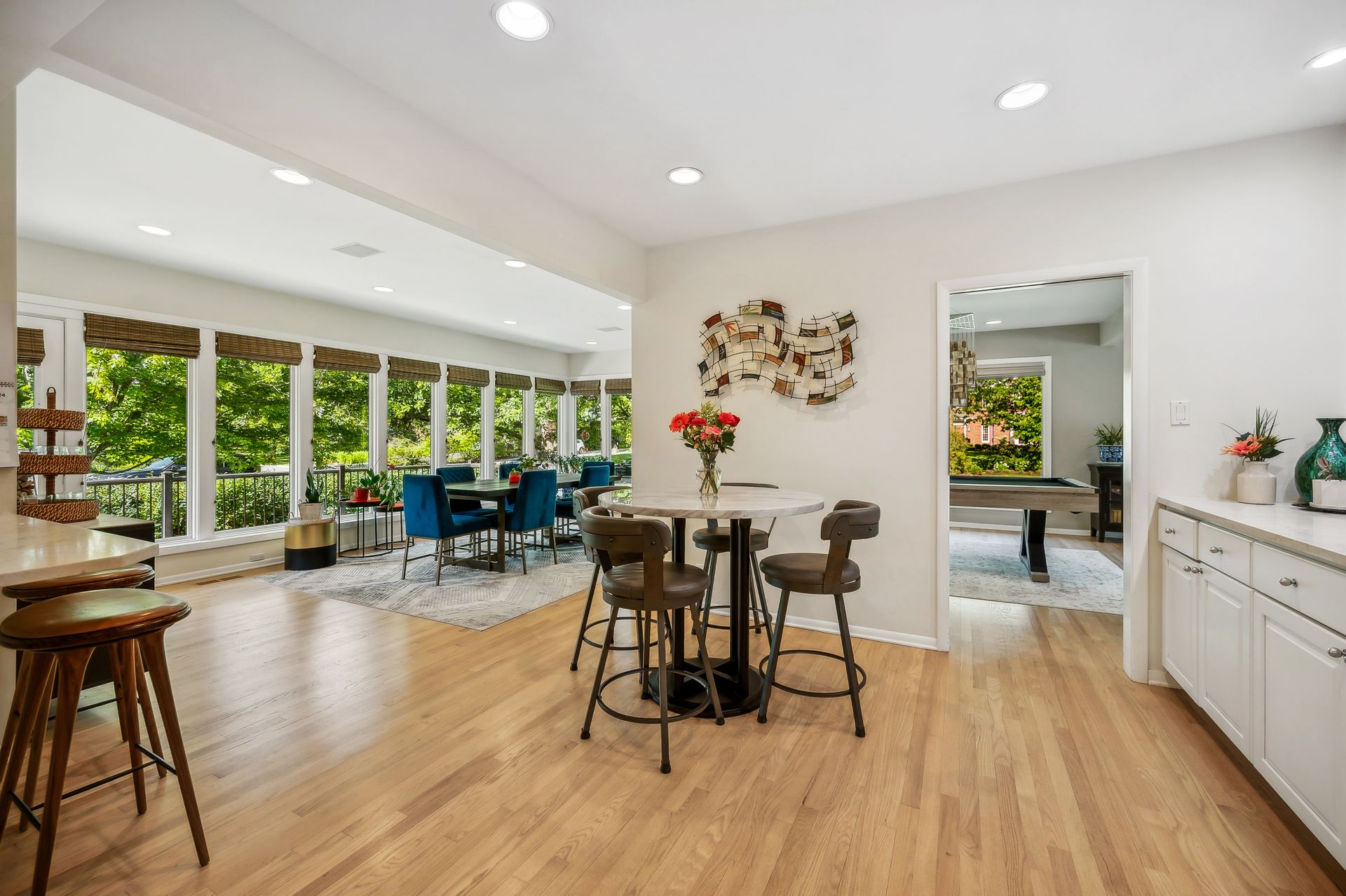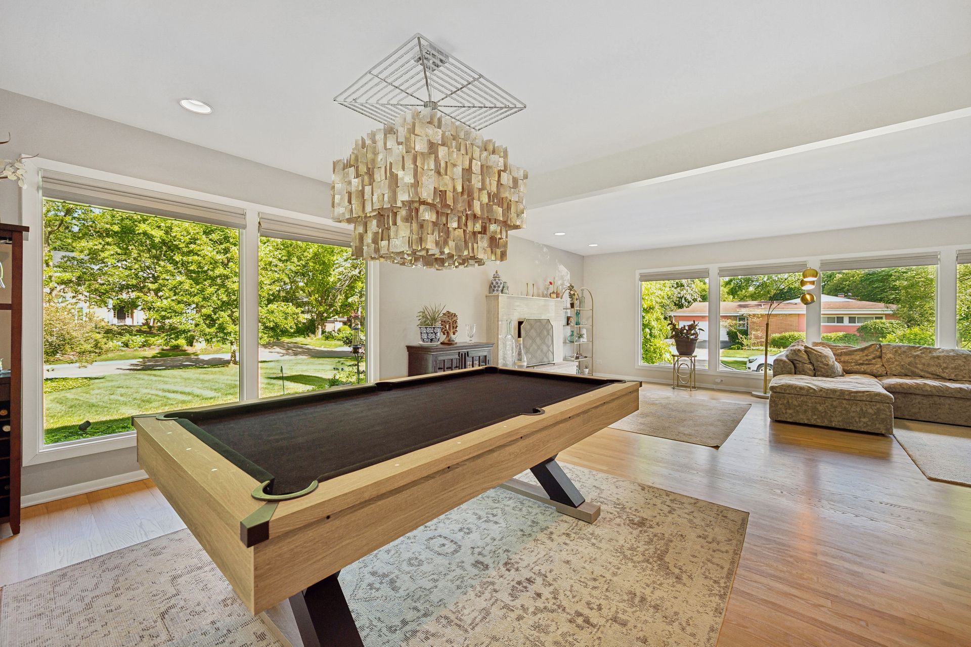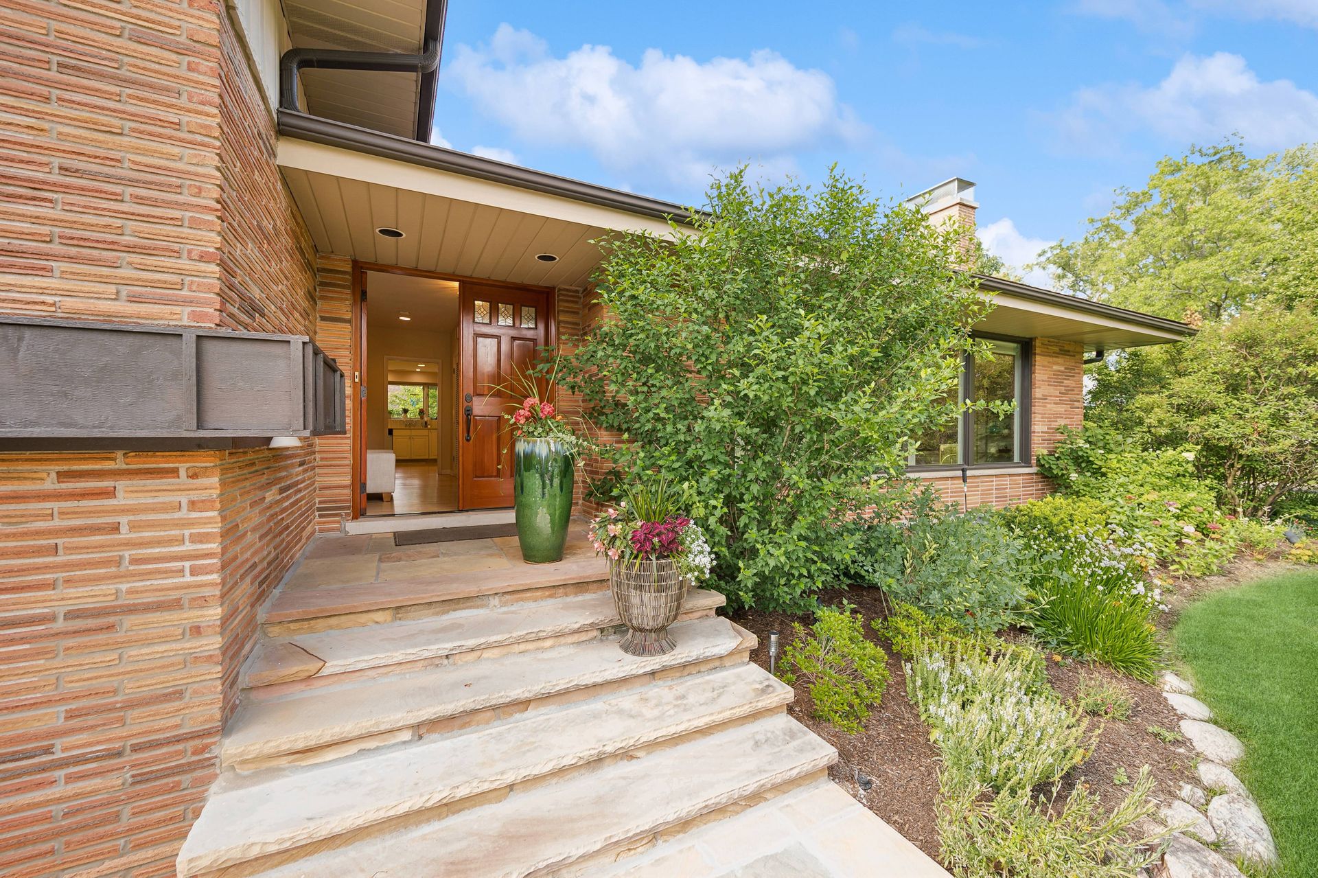 This Mid-Century Modern home has a California feel. Large open floor plan. Gracious Living Room with fireplace, formal Dining Room, Sun Room with windows galore and a terrific Kitchen with Breakfast Room that boasts newer appliances and Quartzite countertops. Family Room with sliding glass doors that lead to a spectacular yard! Primary bedroom with private bath and dressing area. Two more bedrooms up with a full bath. Basement features a Rec Room, Laundry Room and Bedroom. Hardwood floors throughout except for the Family Room which has ceramic tile flooring. Newer windows on the main floor except for over the Kitchen sink. Deck, patio and pergola in back yard.