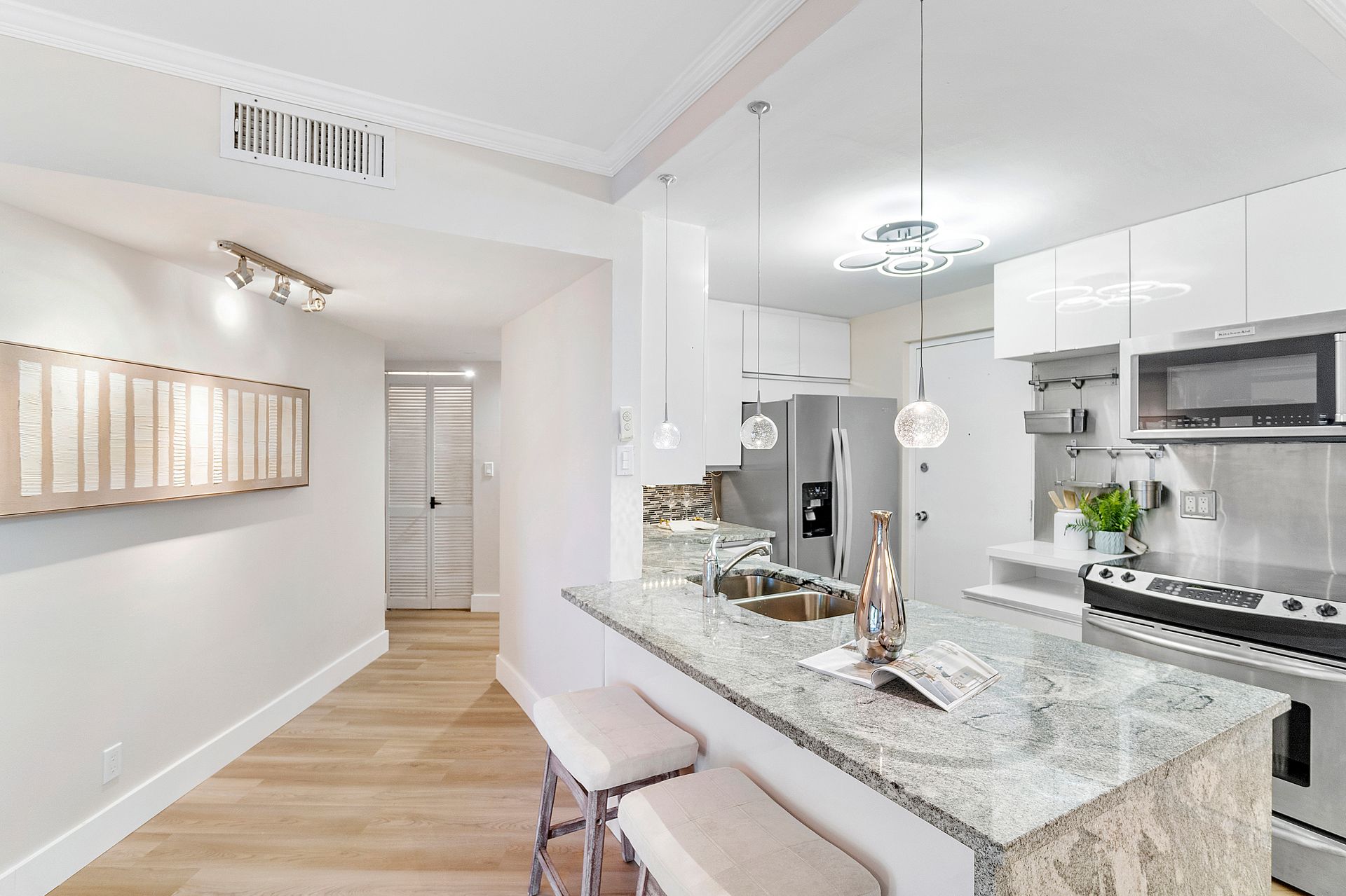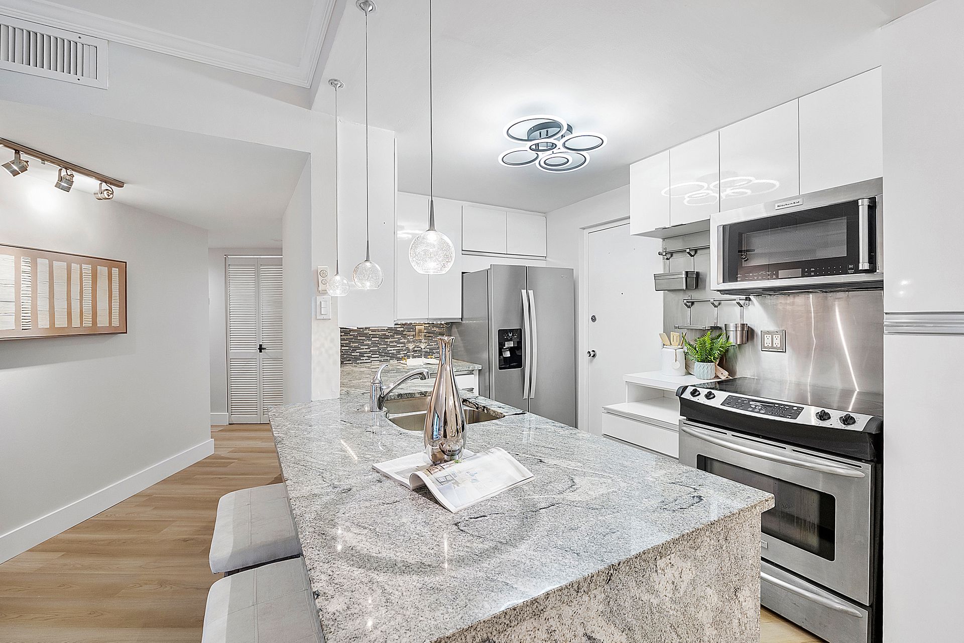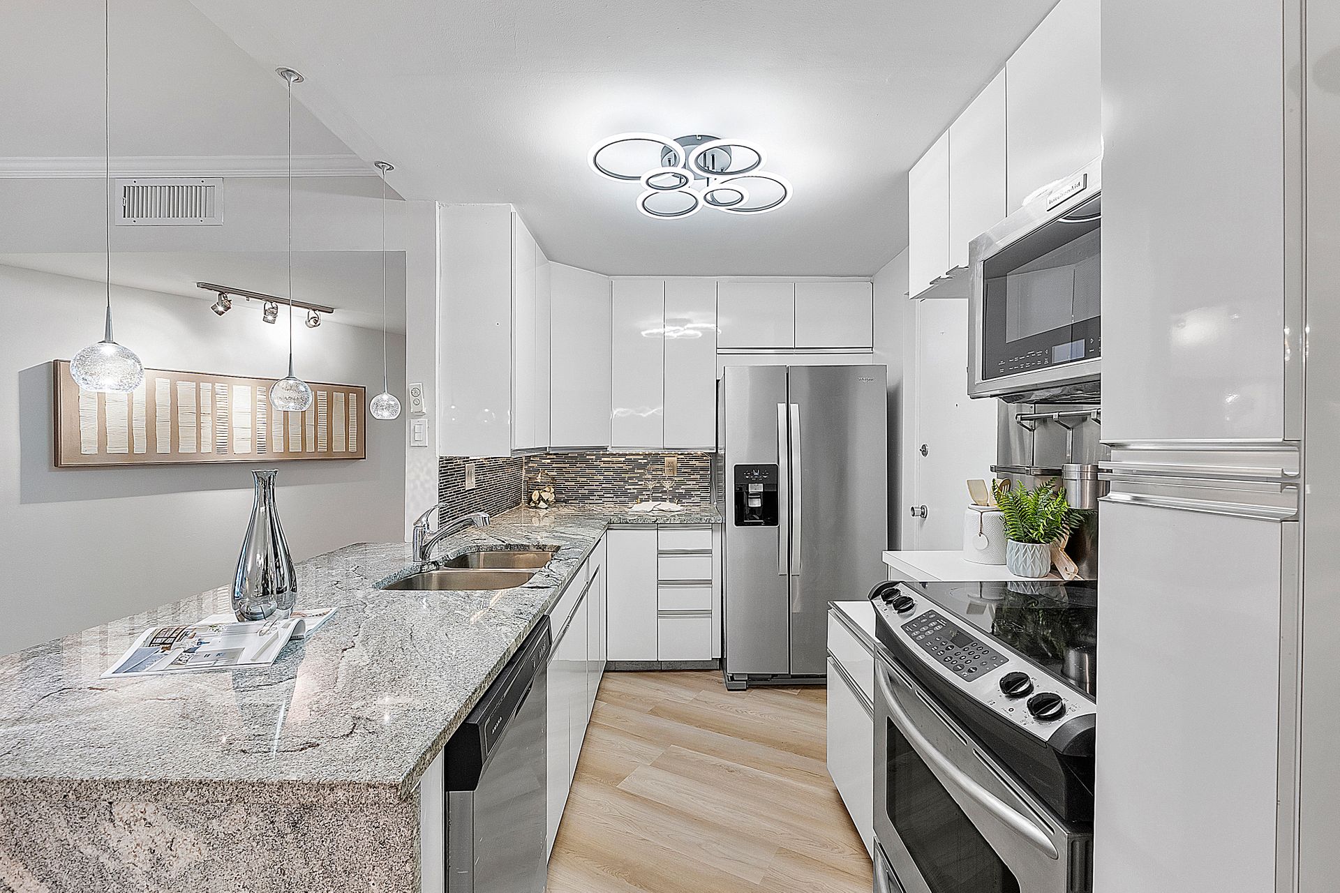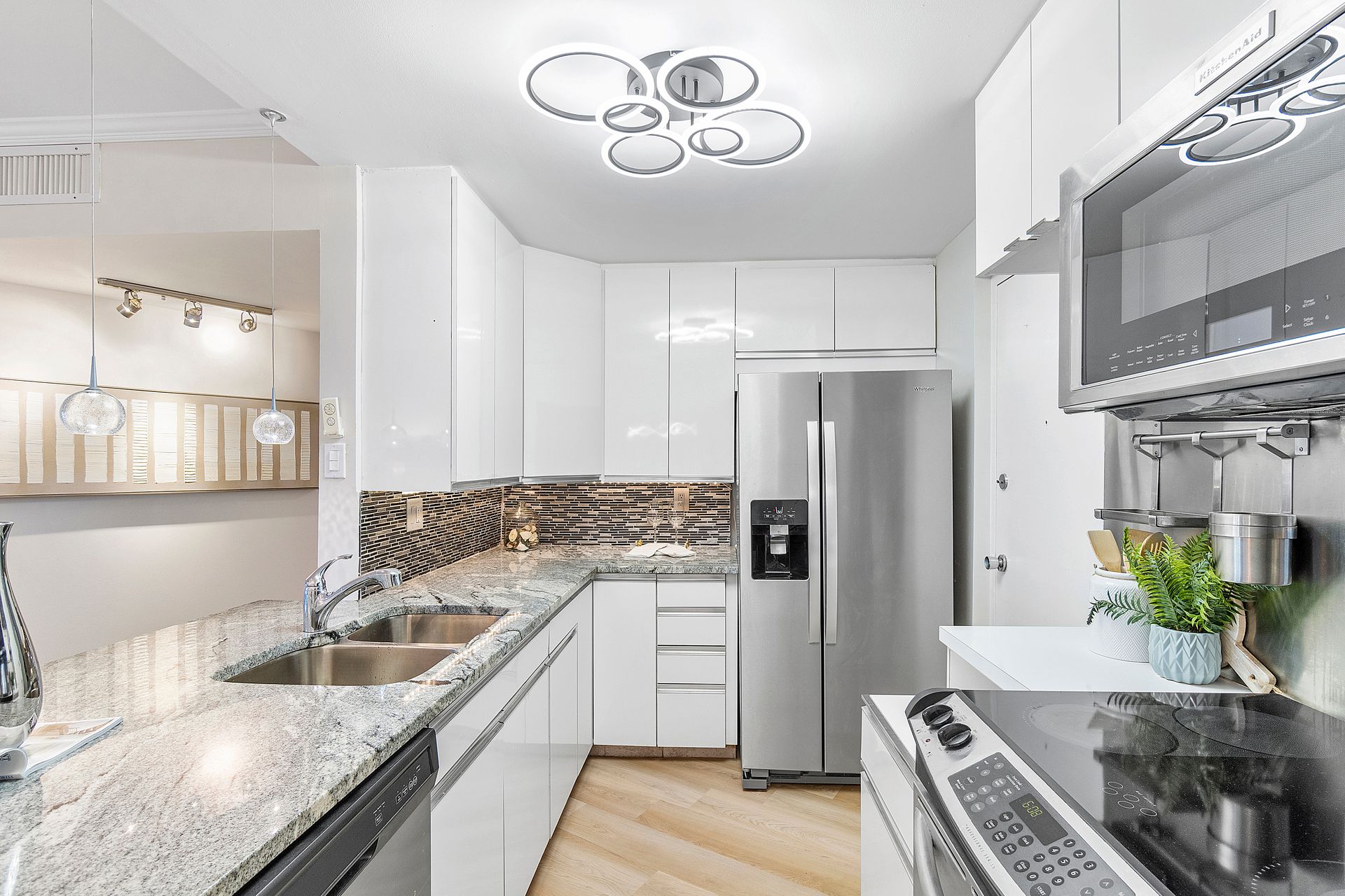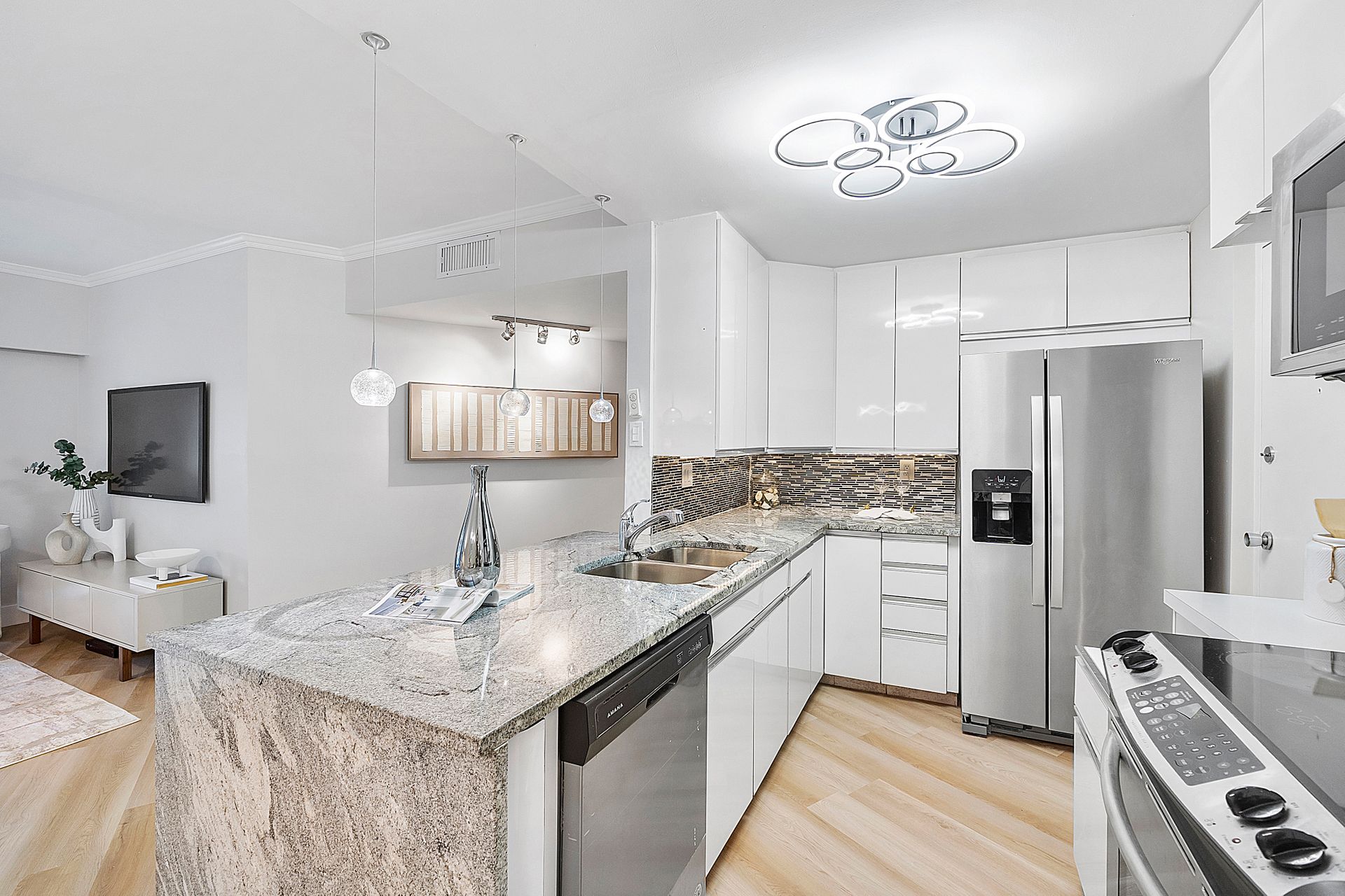The stylish open-concept kitchen boasts custom cabinetry, sleek granite countertops, and high-end appliances, while luxurious laminate flooring flows seamlessly throughout the unit. Freshly painted with a modern, elegant aesthetic, this home is move-in ready.