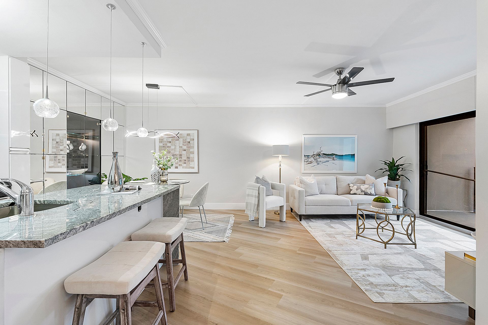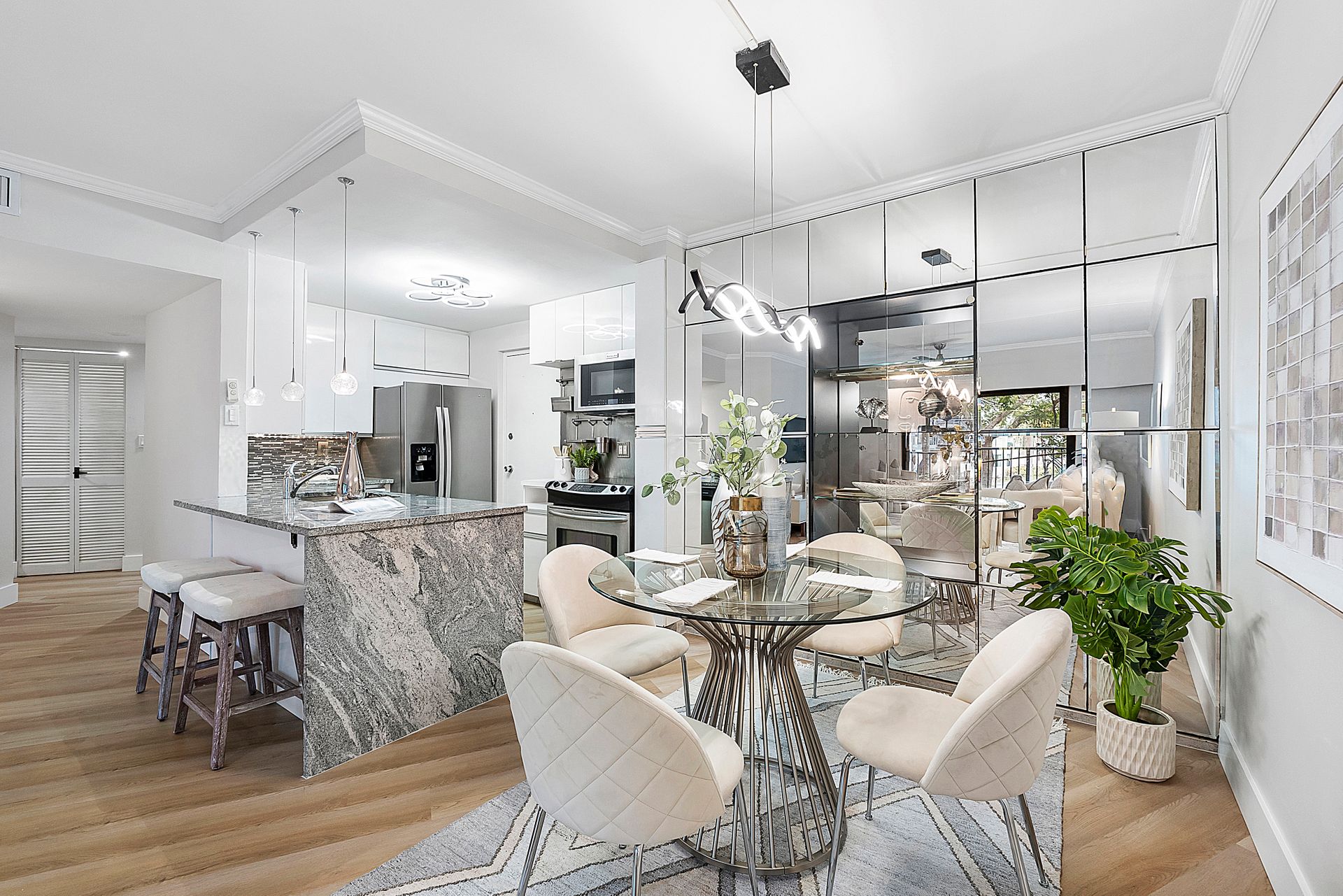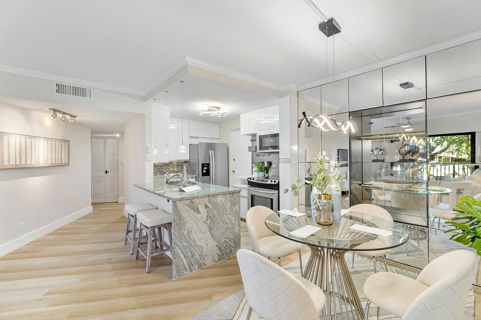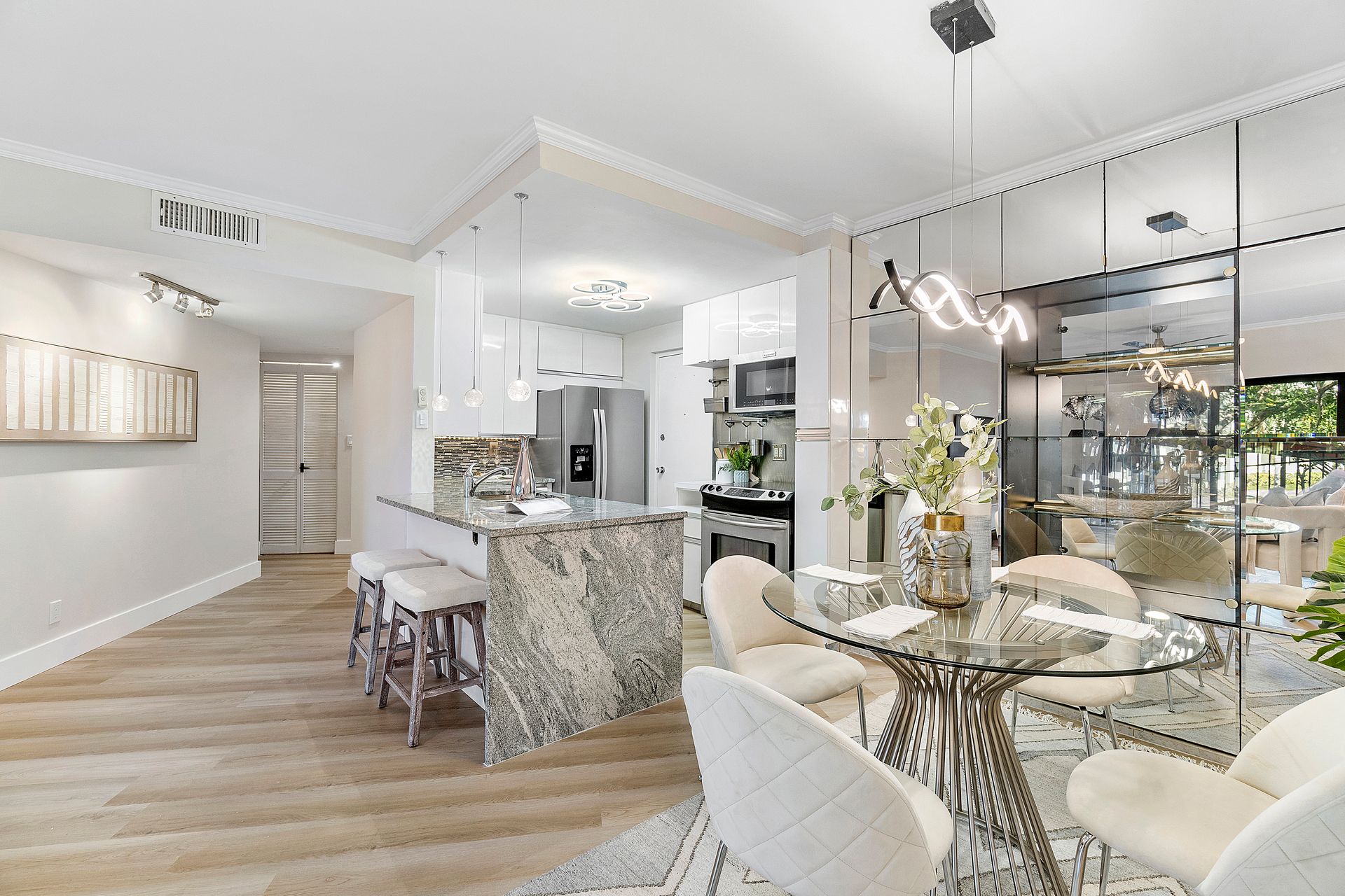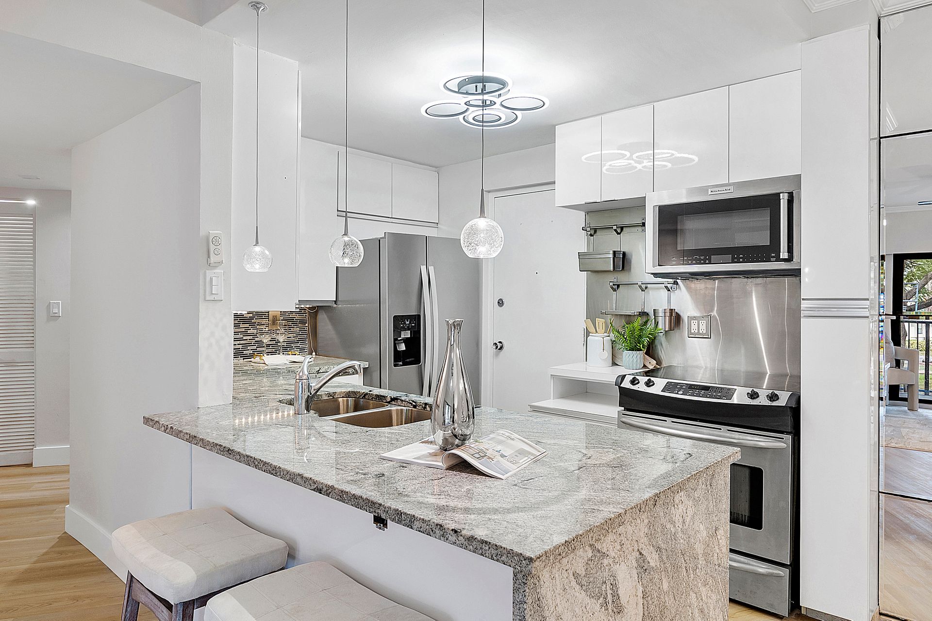 The stylish open-concept kitchen boasts custom cabinetry, sleek granite countertops, and high-end appliances, while luxurious laminate flooring flows seamlessly throughout the unit. Freshly painted with a modern, elegant aesthetic, this home is move-in ready.